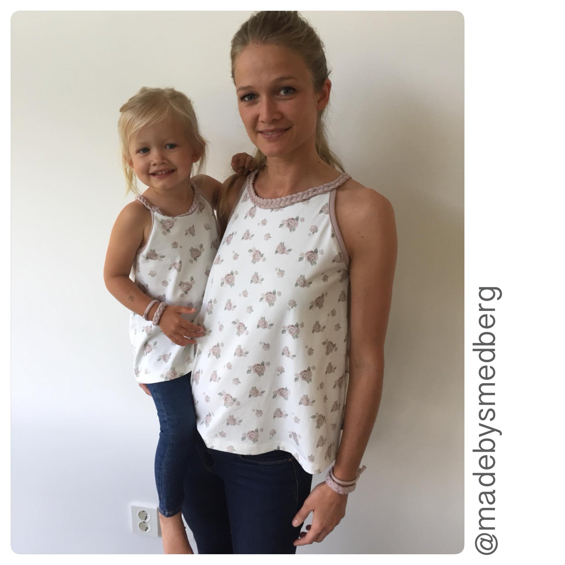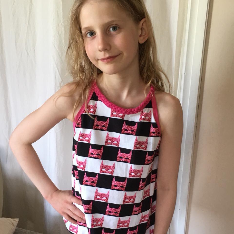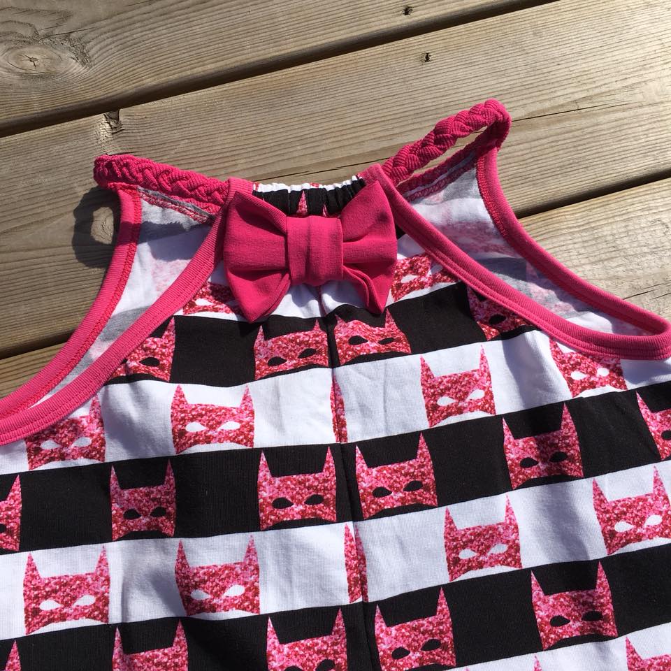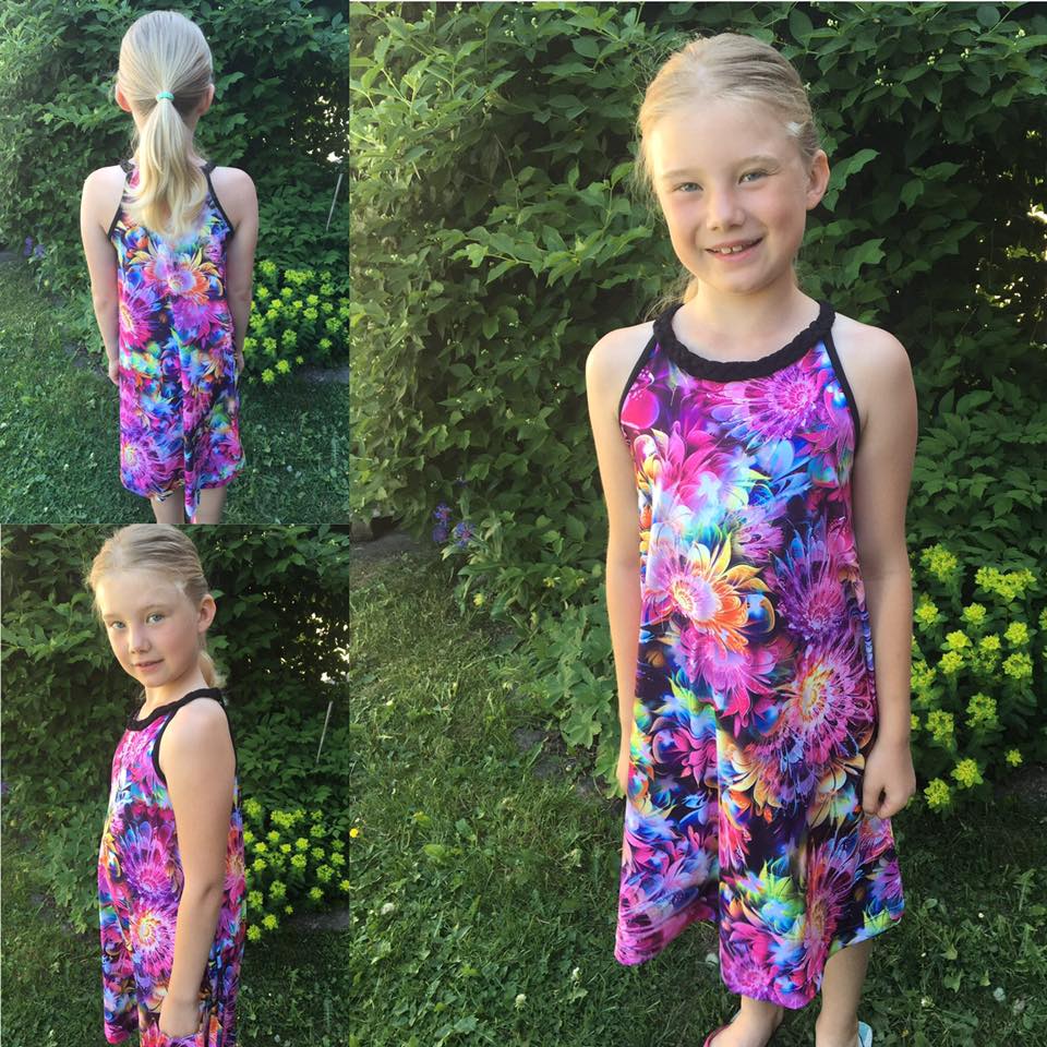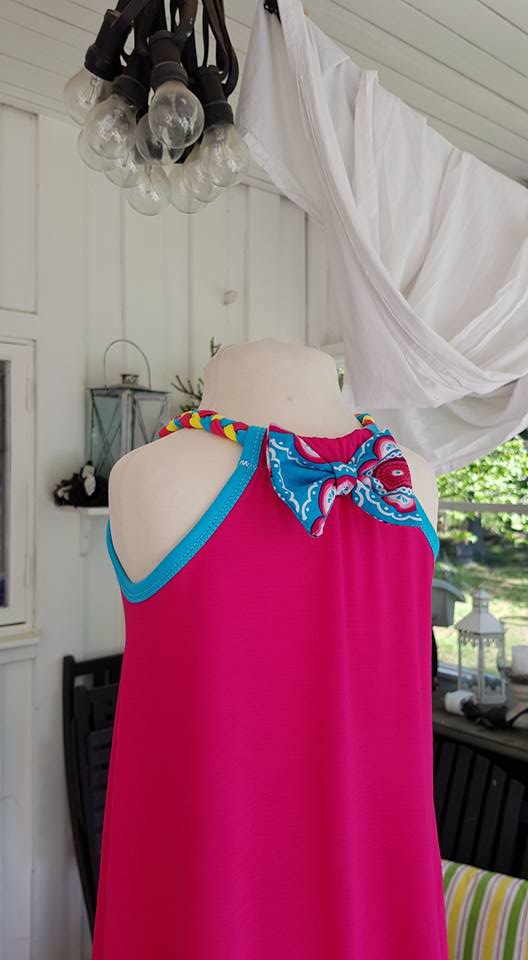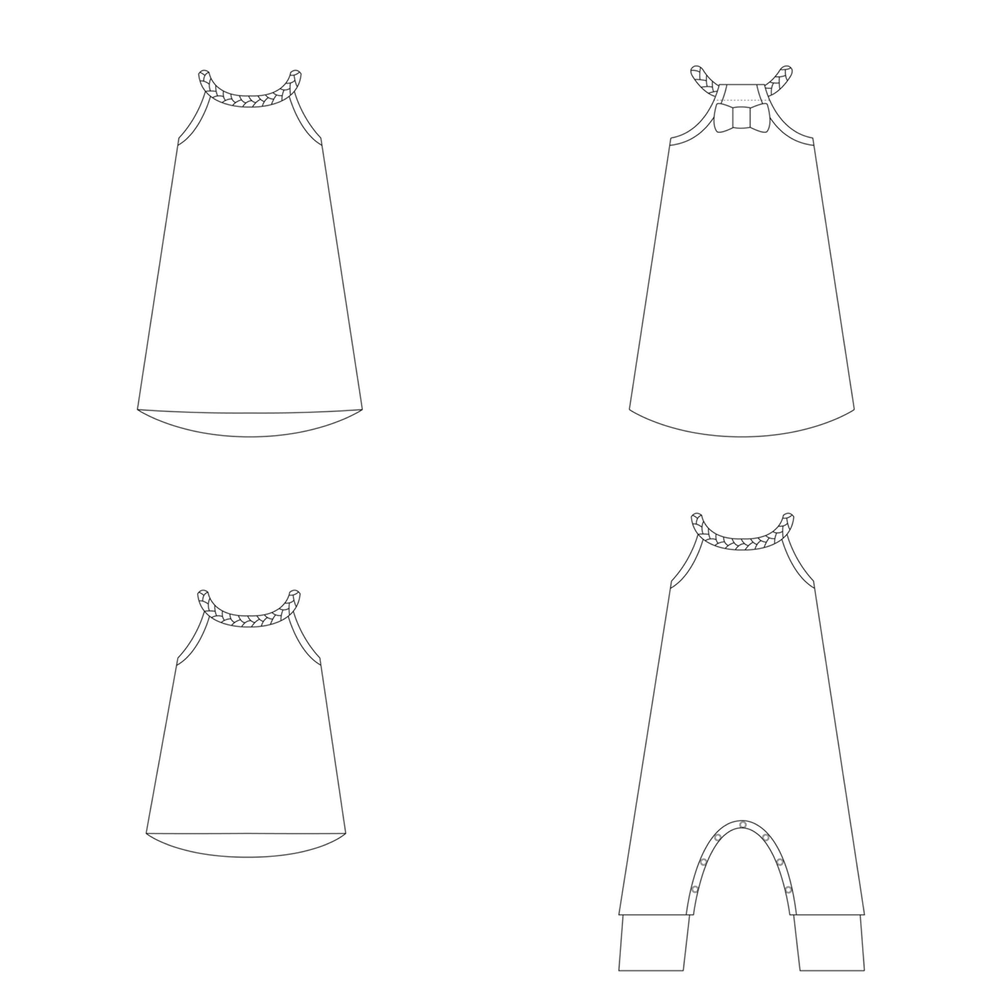 Barely Boho är ett A-linjeformat linne/klänning som har bakstycke med rundad längre nederkant, charmiga flätade axelband, brottarrygg och en söt rosett på bakstycket. Upp till strl 122 går det även att sy den som jumpsuit i haremsbyxmodell. Jumpsuiten sys med grenöppning för enkel av- och påklädning men vill man sy den med öppning i axeln istället kan man fläta ett längre axelband som sys fast i framstyckets överkant, träs genom bakstyckets kanal och fixeras och sedan knyts uppe på den ena axeln.