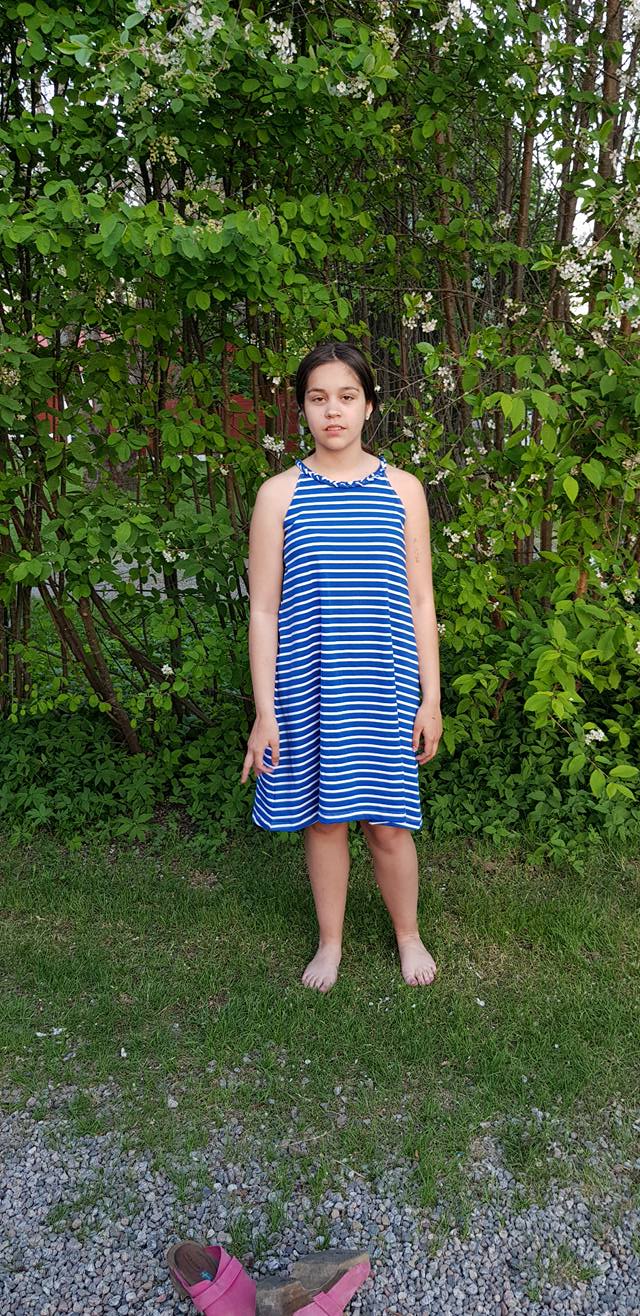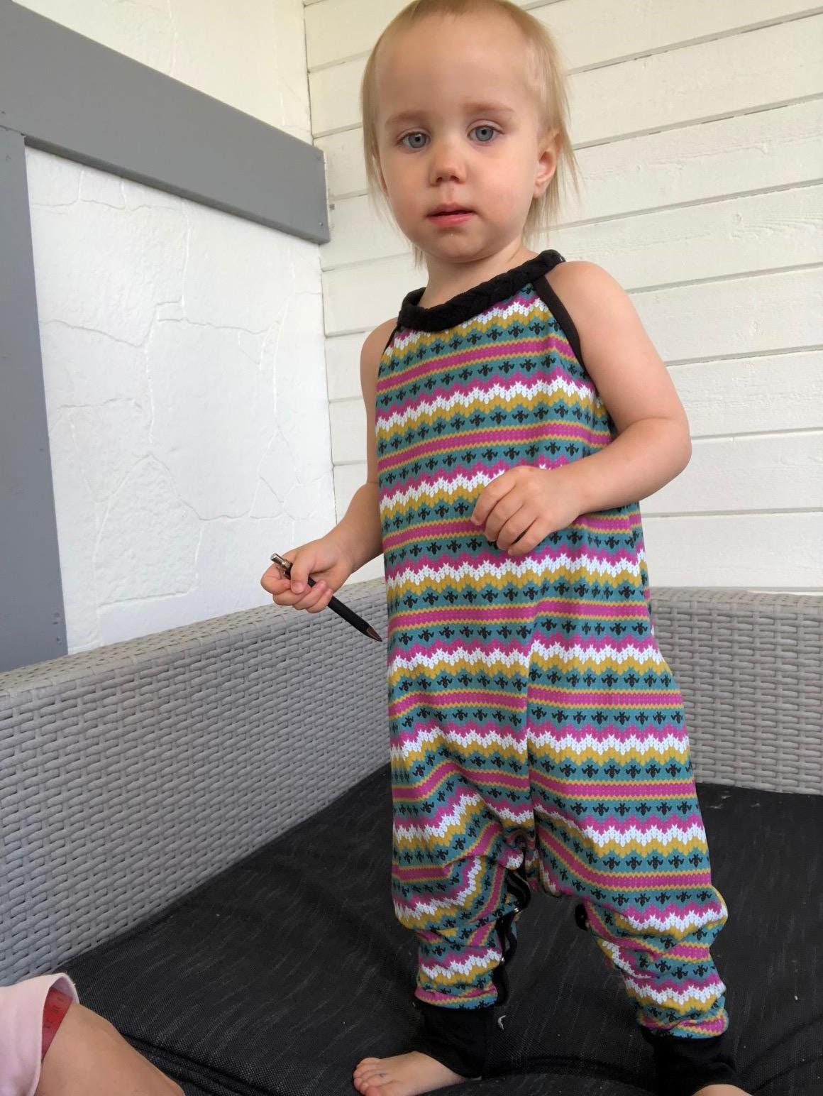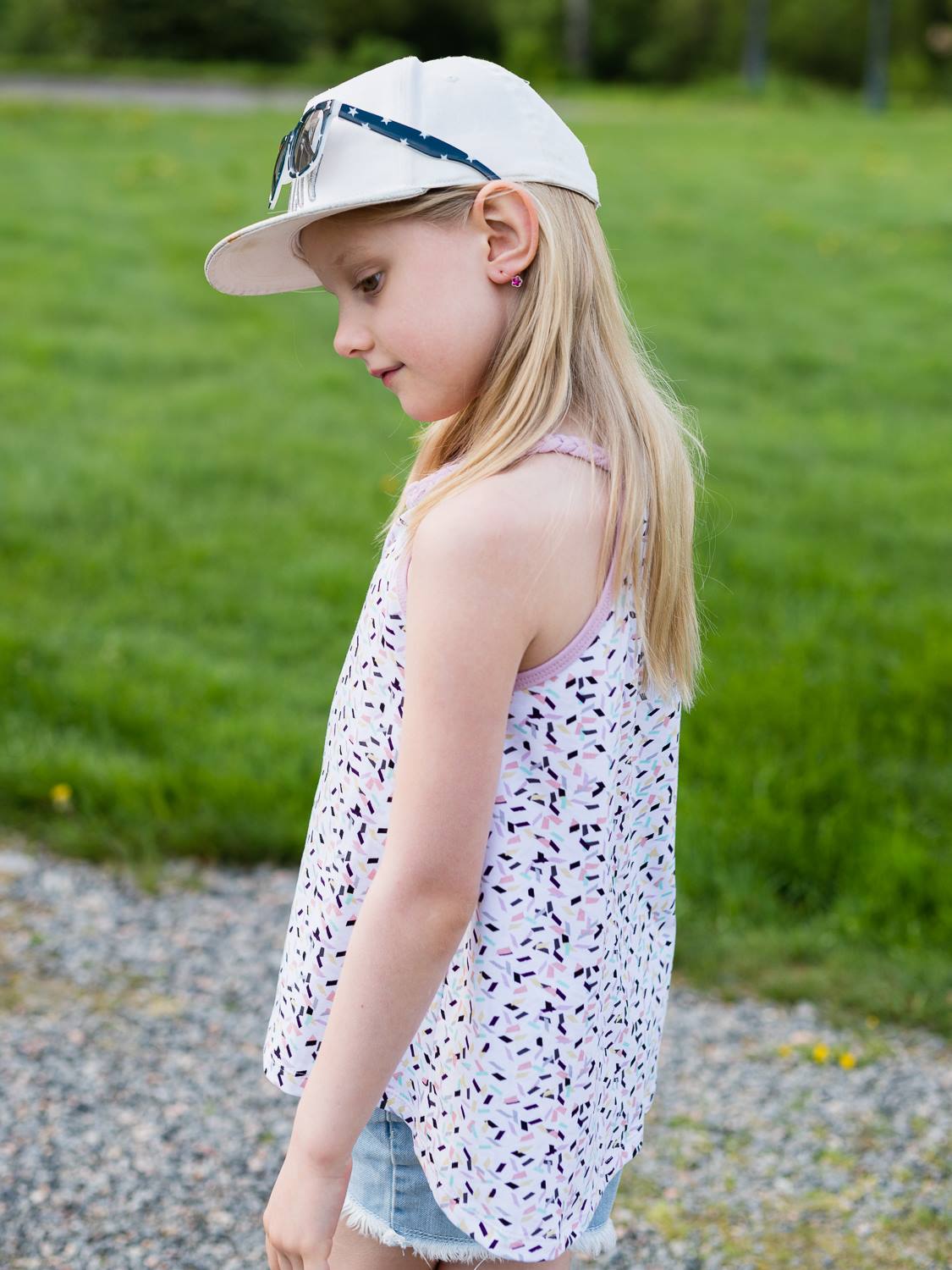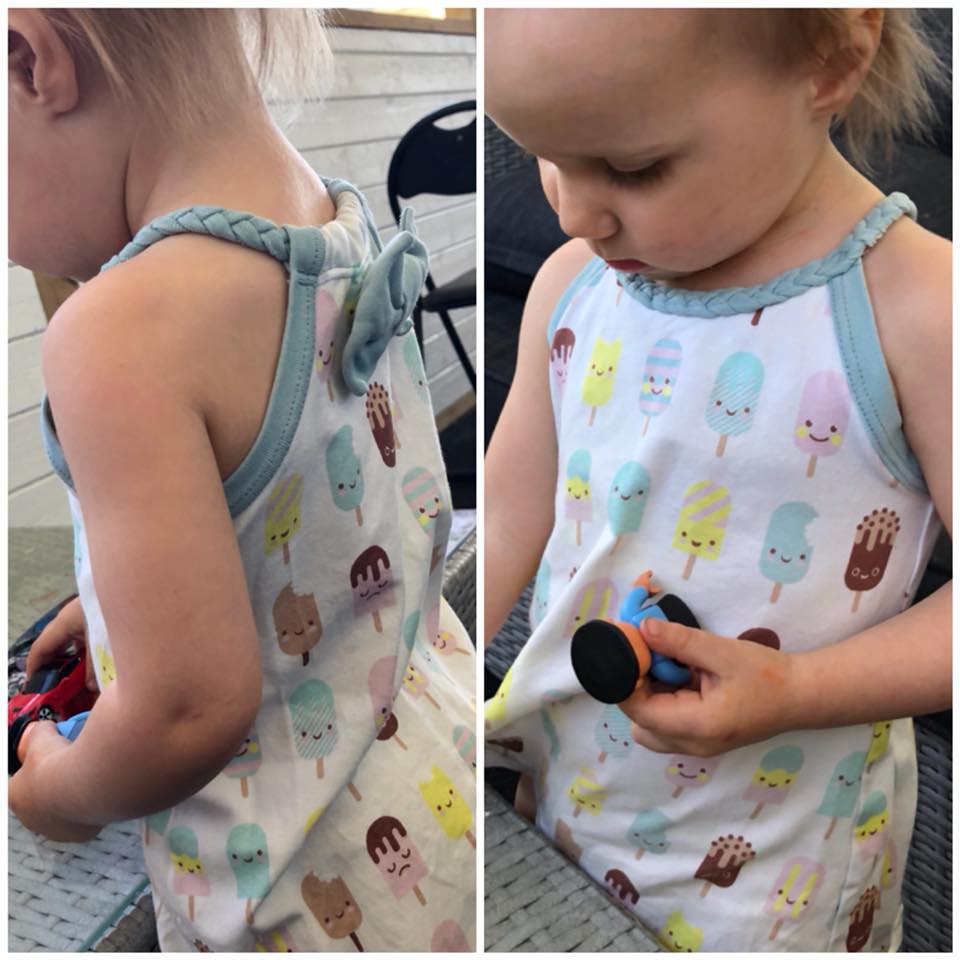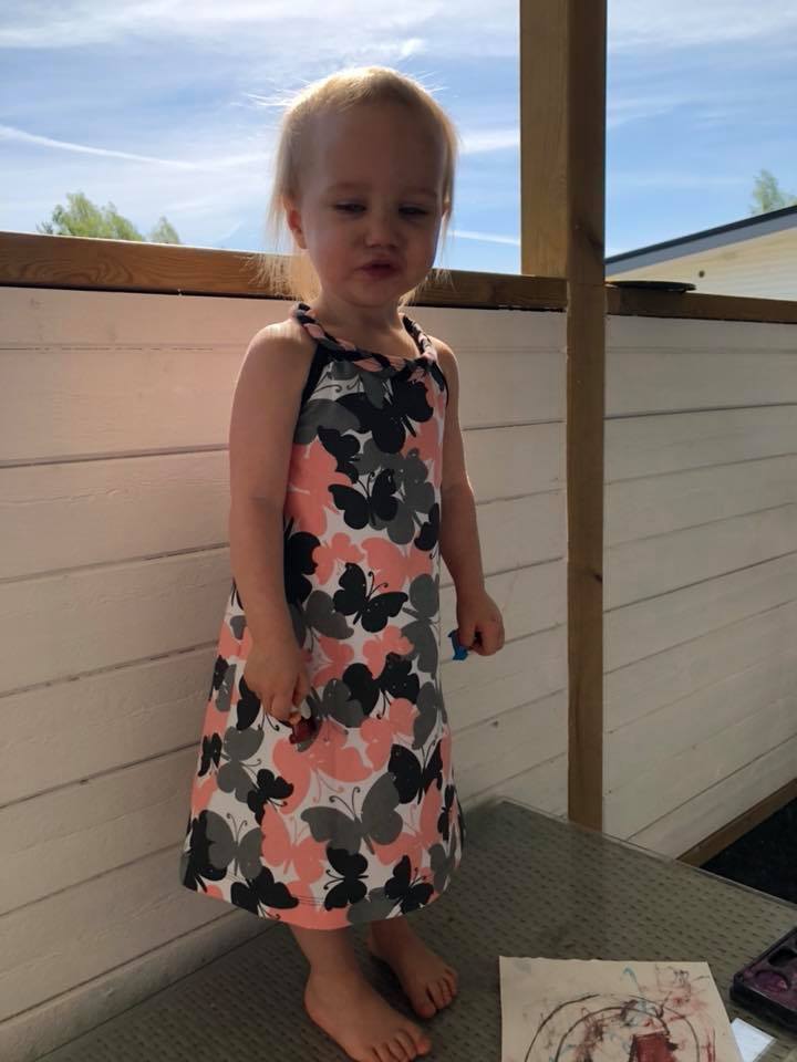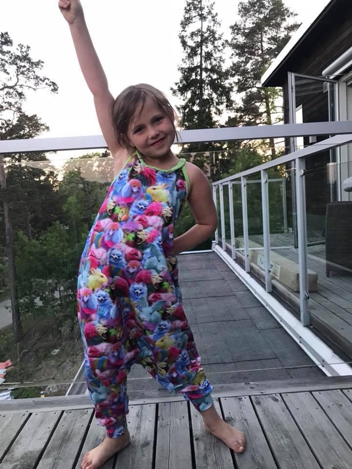 Barely Boho är ett A-linjeformat linne/klänning som har bakstycke med rundad längre nederkant, charmiga flätade axelband, brottarrygg och en söt rosett på bakstycket. Upp till strl 122 går det även att sy den som jumpsuit i haremsbyxmodell. Jumpsuiten sys med grenöppning för enkel av- och påklädning men vill man sy den med öppning i axeln istället kan man fläta ett längre axelband som sys fast i framstyckets överkant, träs genom bakstyckets kanal och fixeras och sedan knyts uppe på den ena axeln.