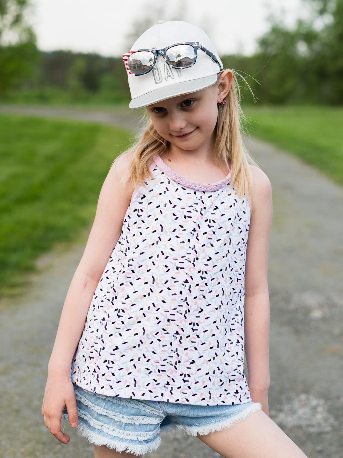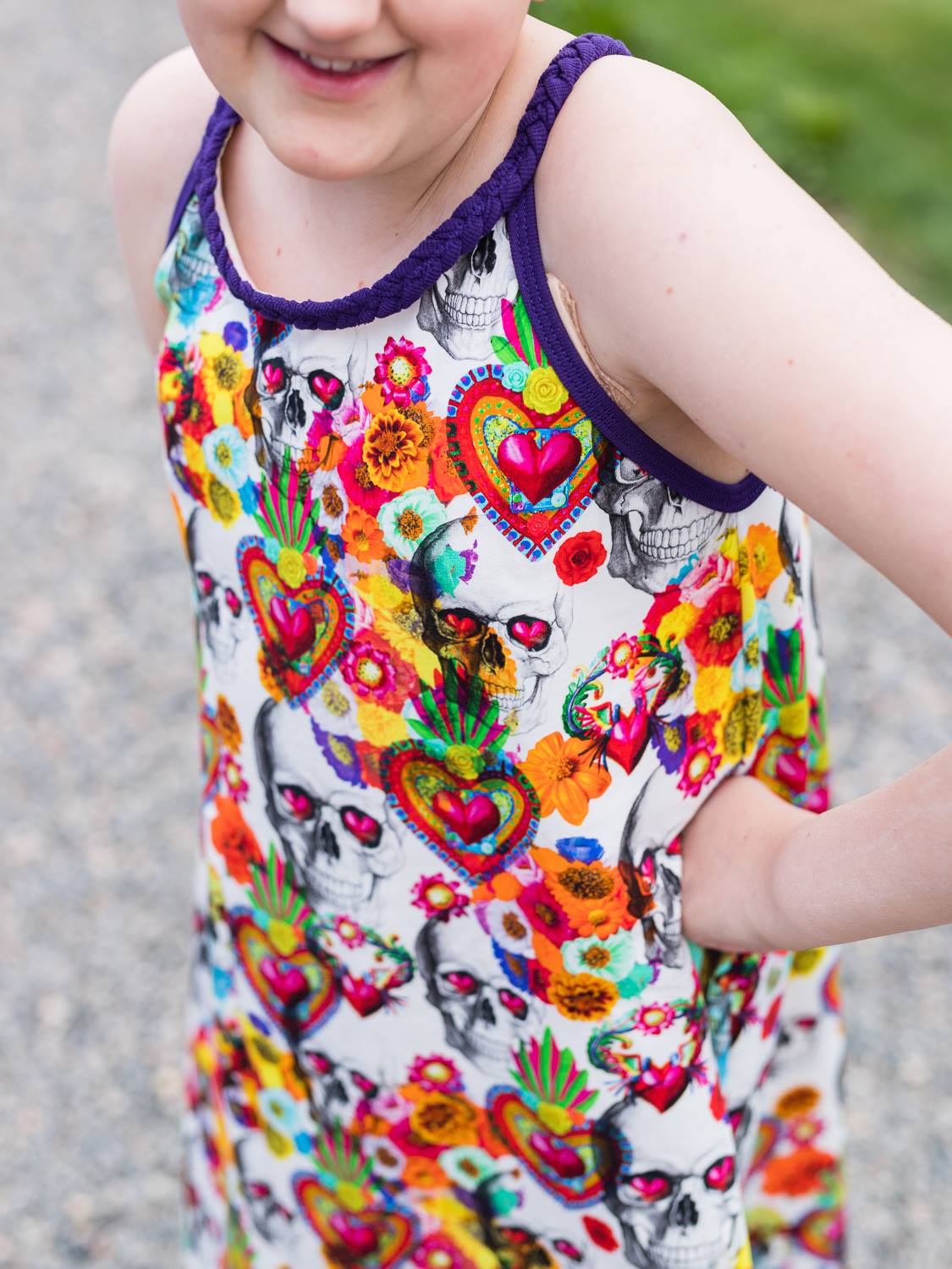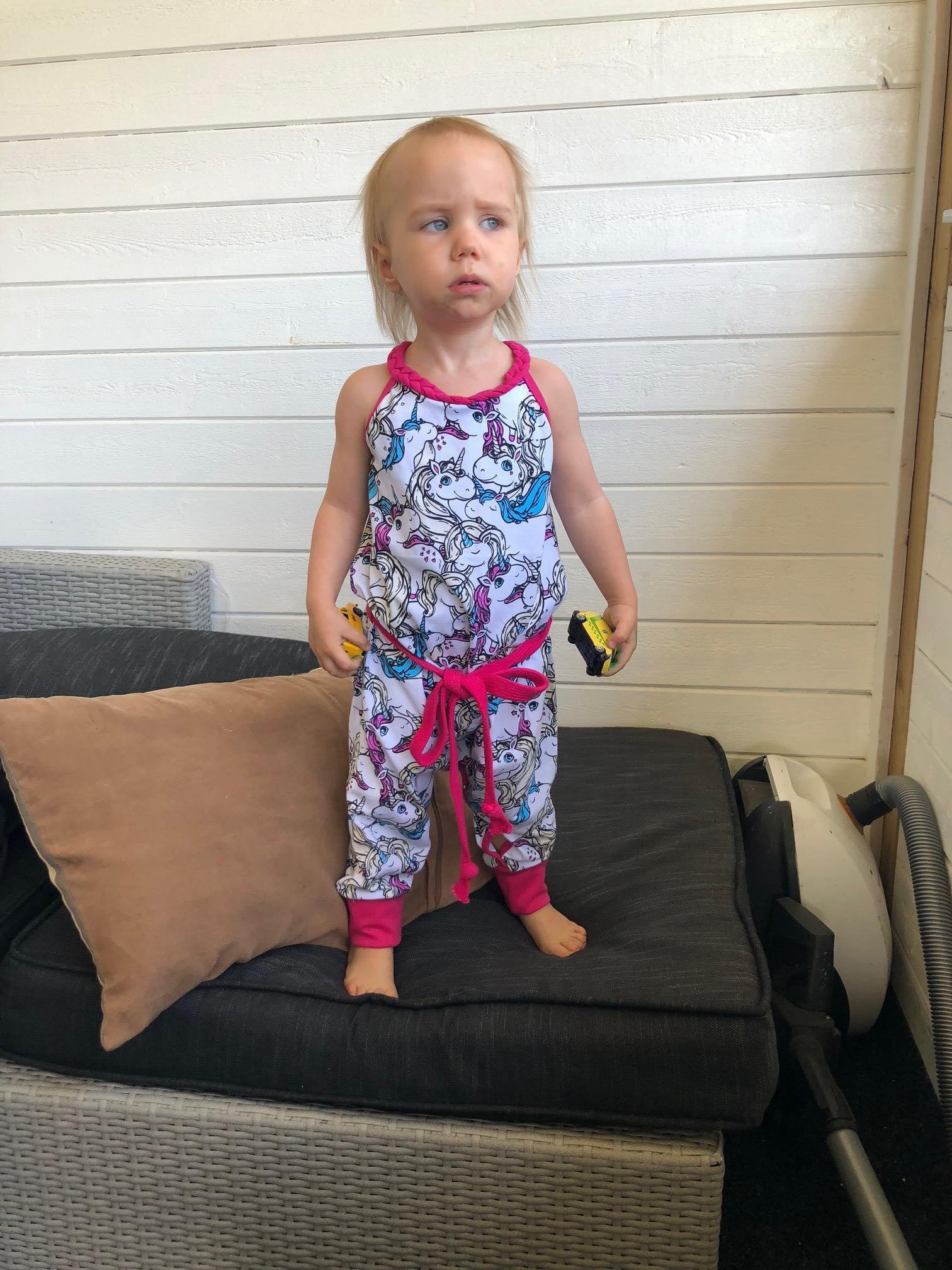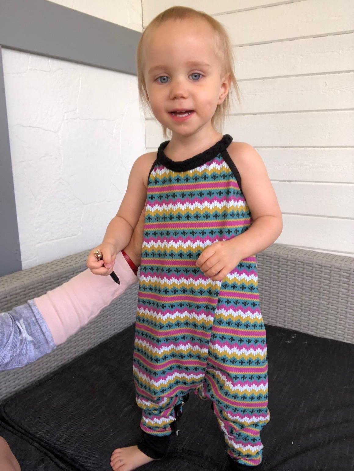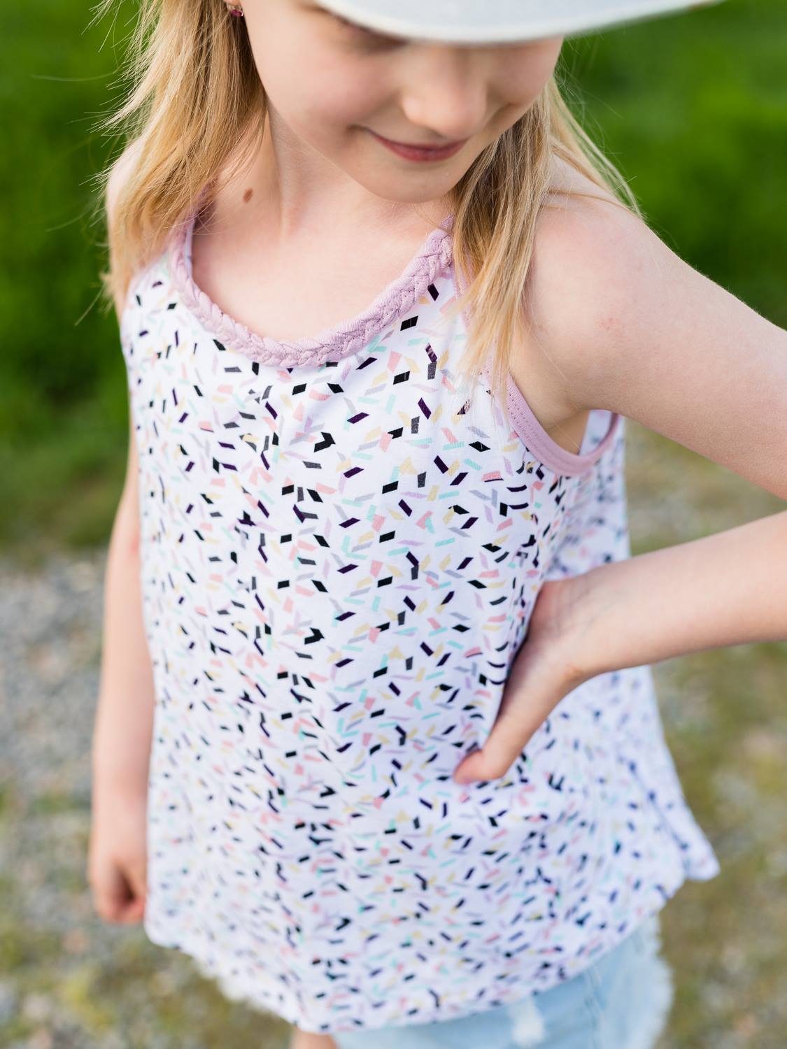 Barely Boho är ett A-linjeformat linne/klänning som har bakstycke med rundad längre nederkant, charmiga flätade axelband, brottarrygg och en söt rosett på bakstycket. Upp till strl 122 går det även att sy den som jumpsuit i haremsbyxmodell. Jumpsuiten sys med grenöppning för enkel av- och påklädning men vill man sy den med öppning i axeln istället kan man fläta ett längre axelband som sys fast i framstyckets överkant, träs genom bakstyckets kanal och fixeras och sedan knyts uppe på den ena axeln.
