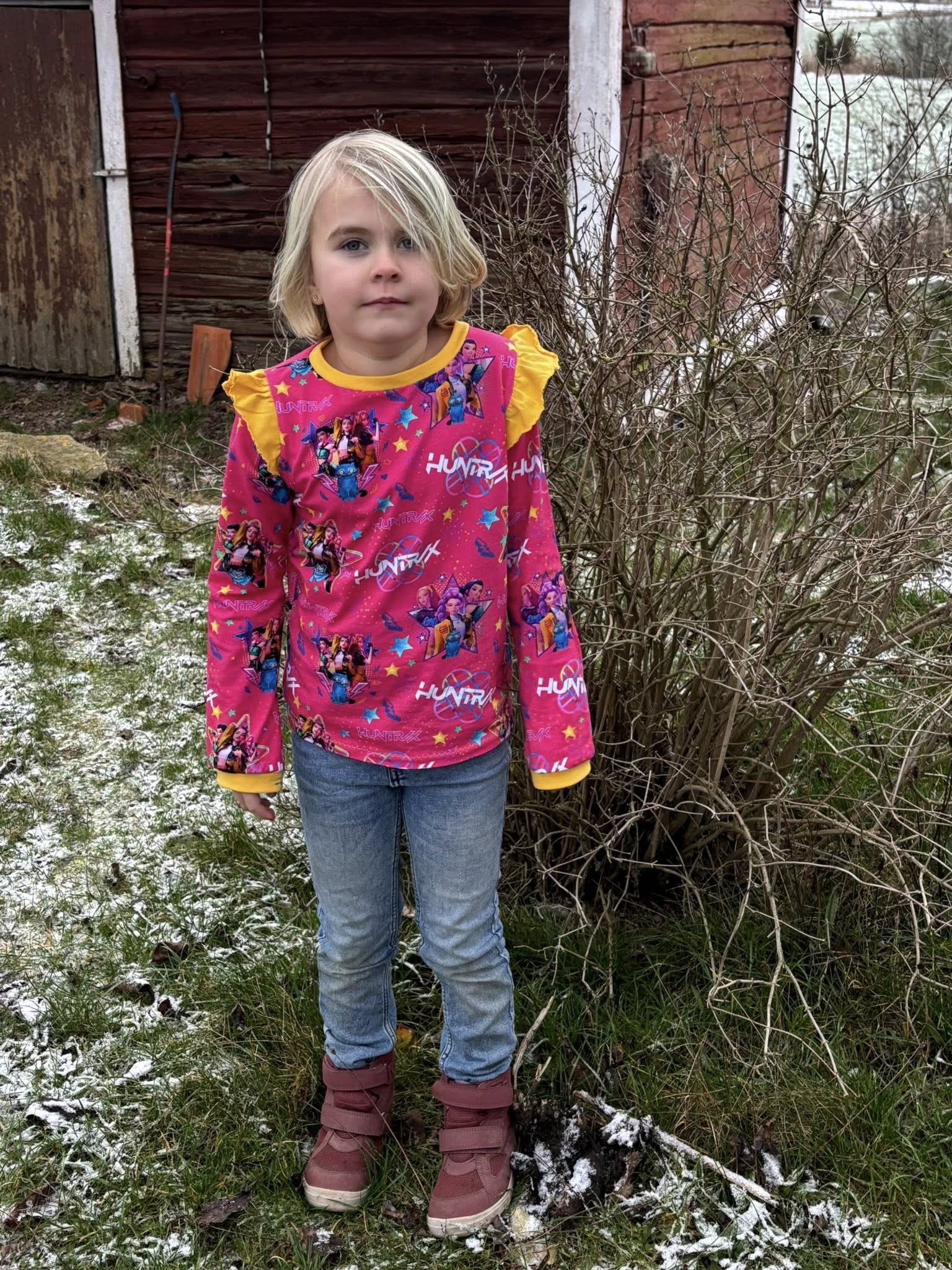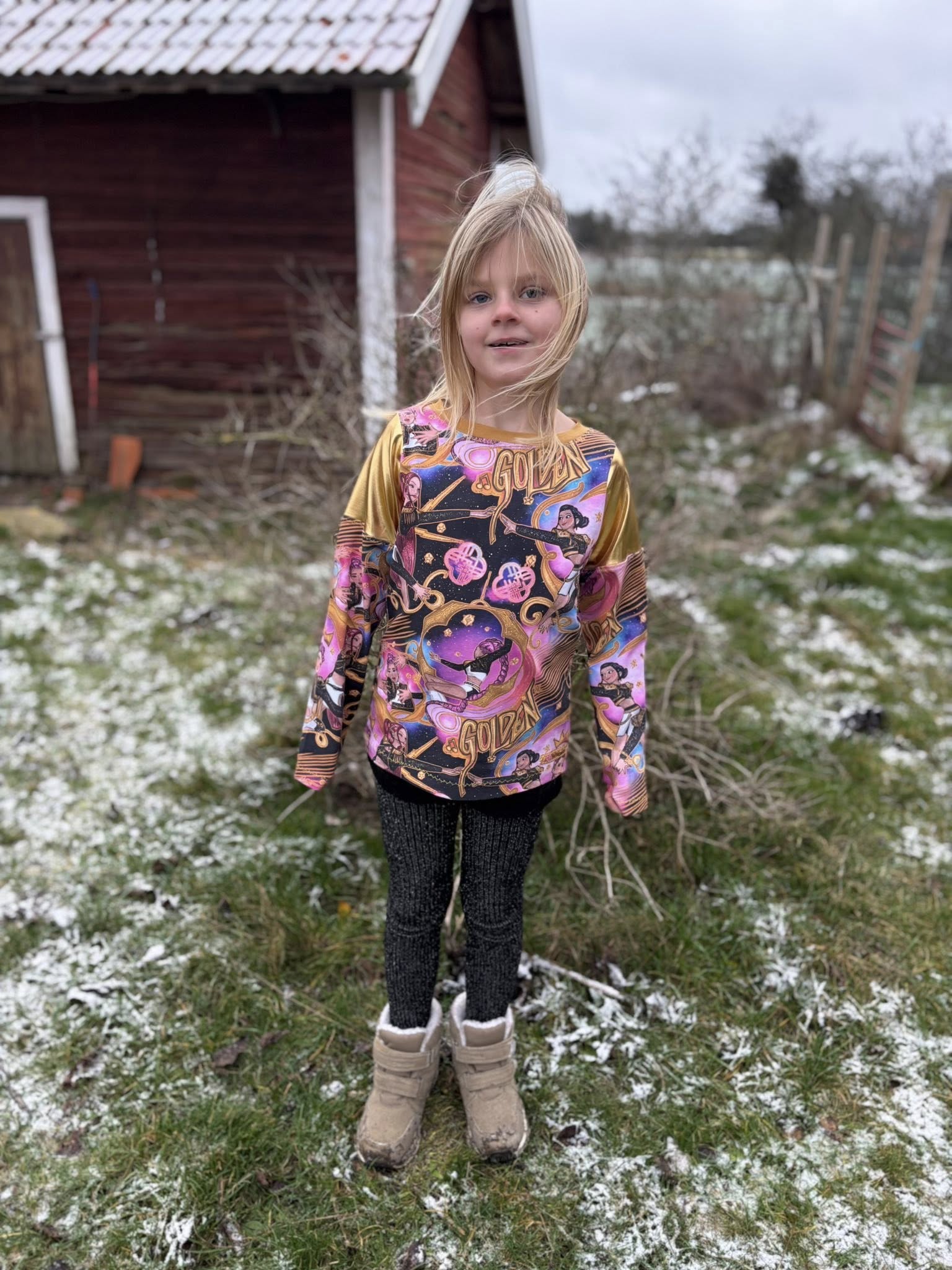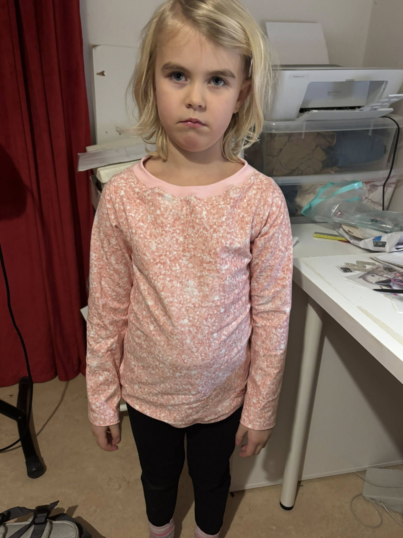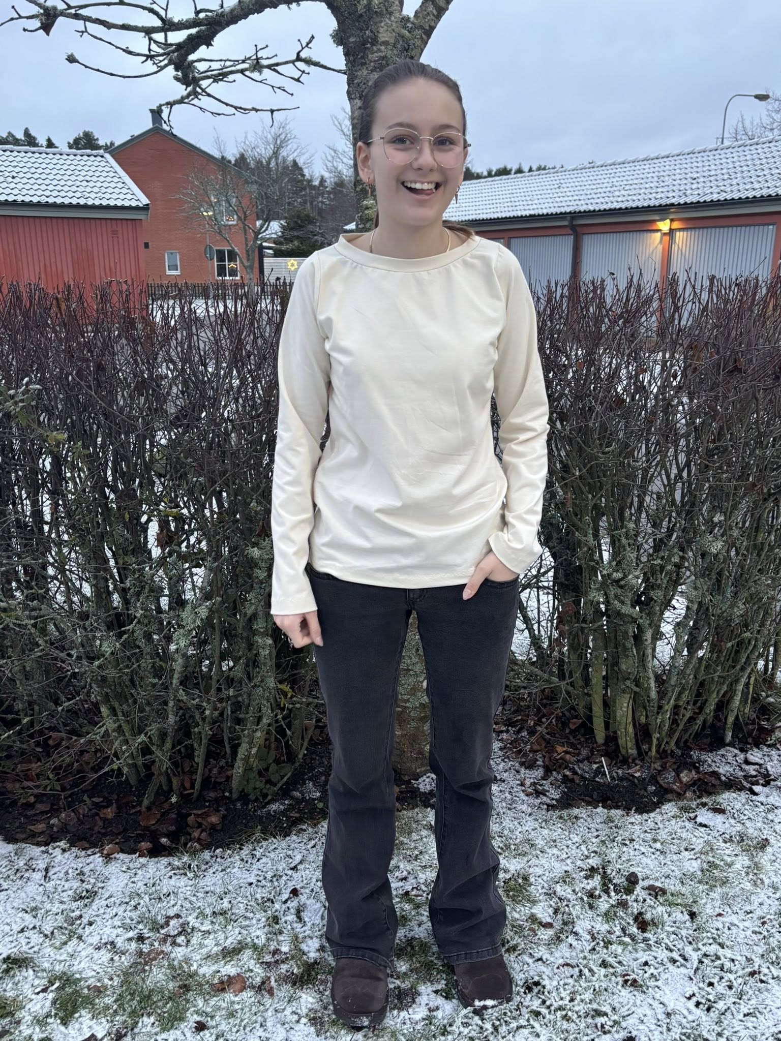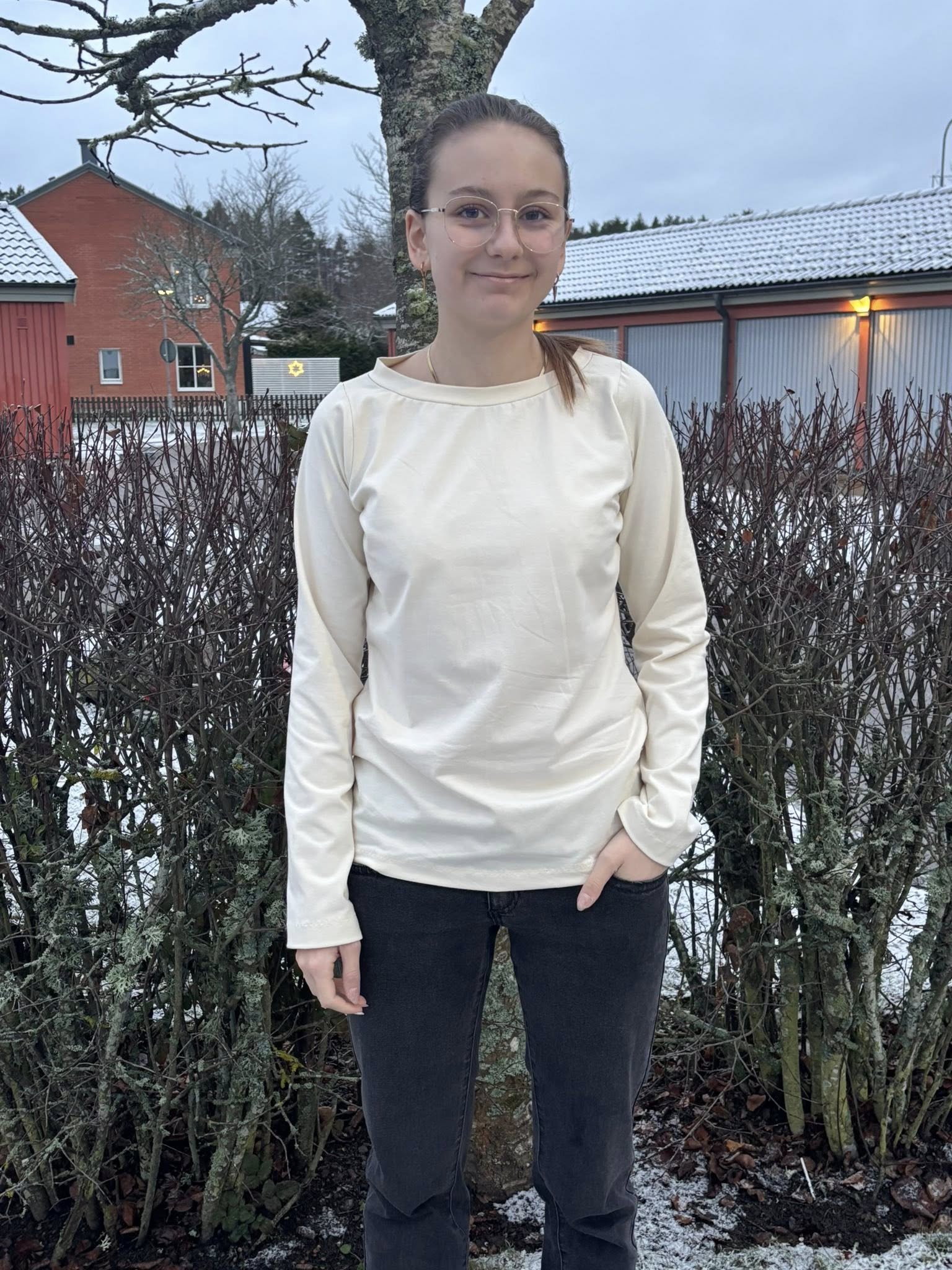 Material och tillklippning: Denna modell är tänkt att sys i jersey/trikå med antingen jersey eller mudd i halsringningen. Denna topp blir även söt att rullfålla i ärmslut och nederkant.