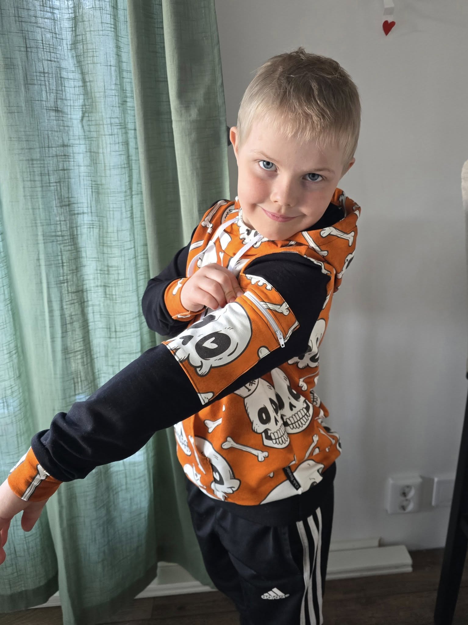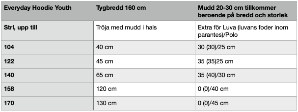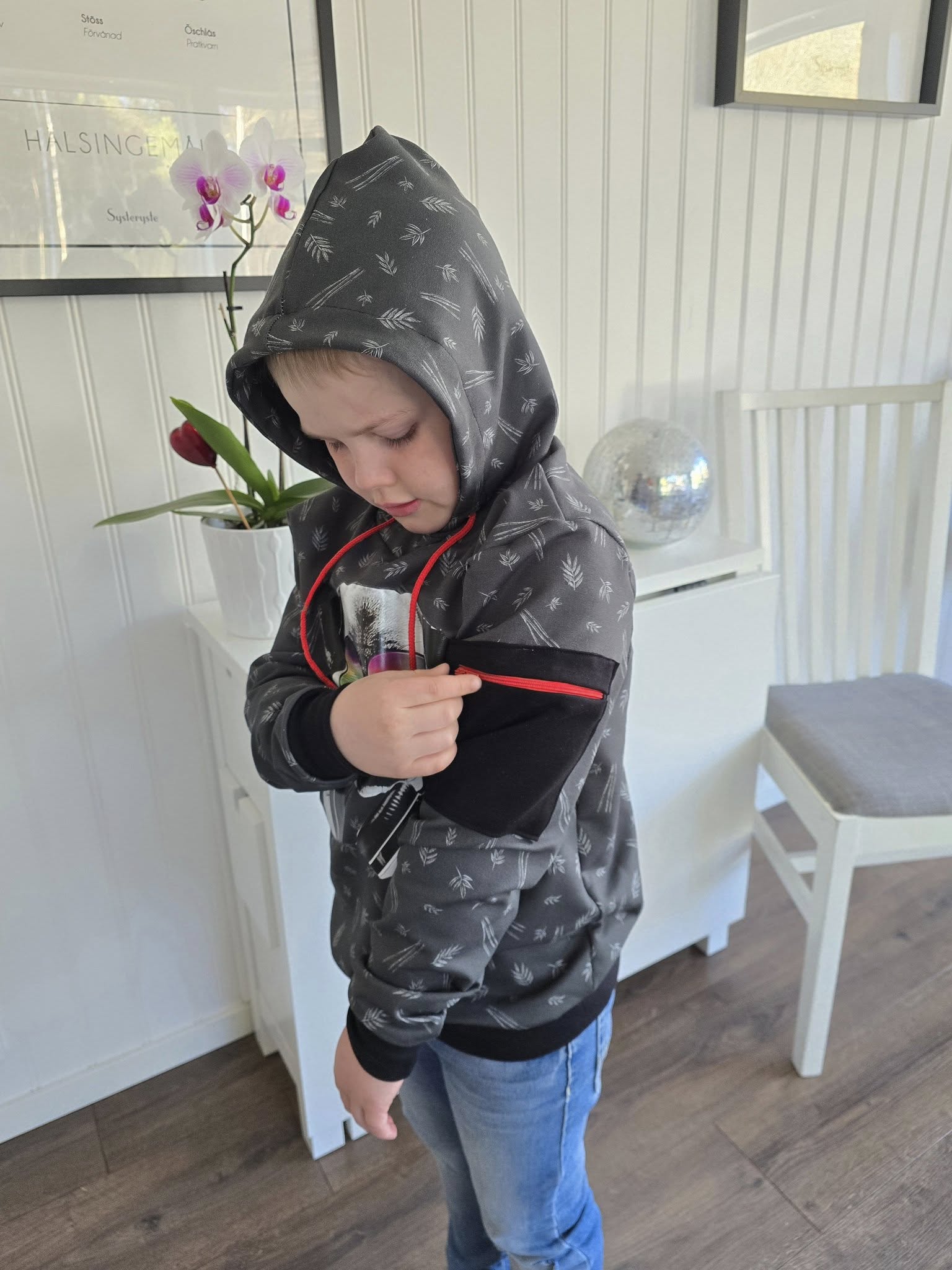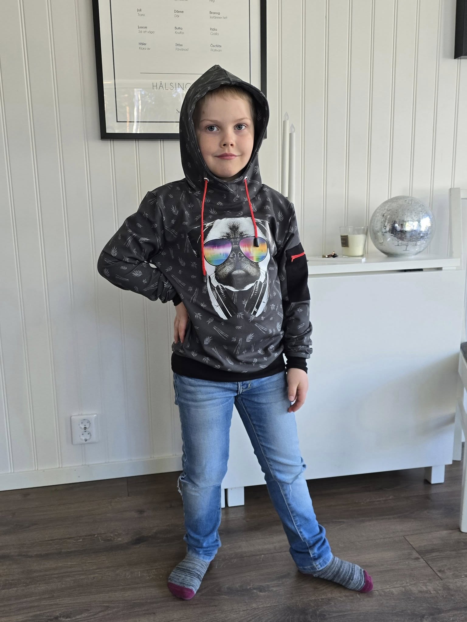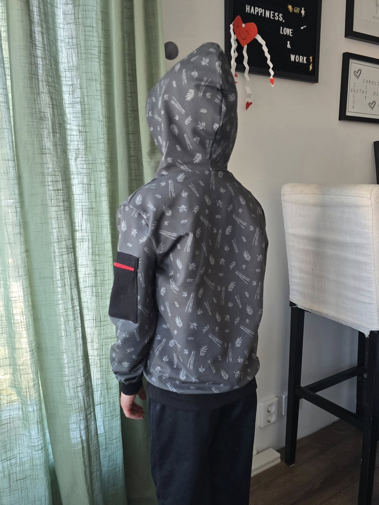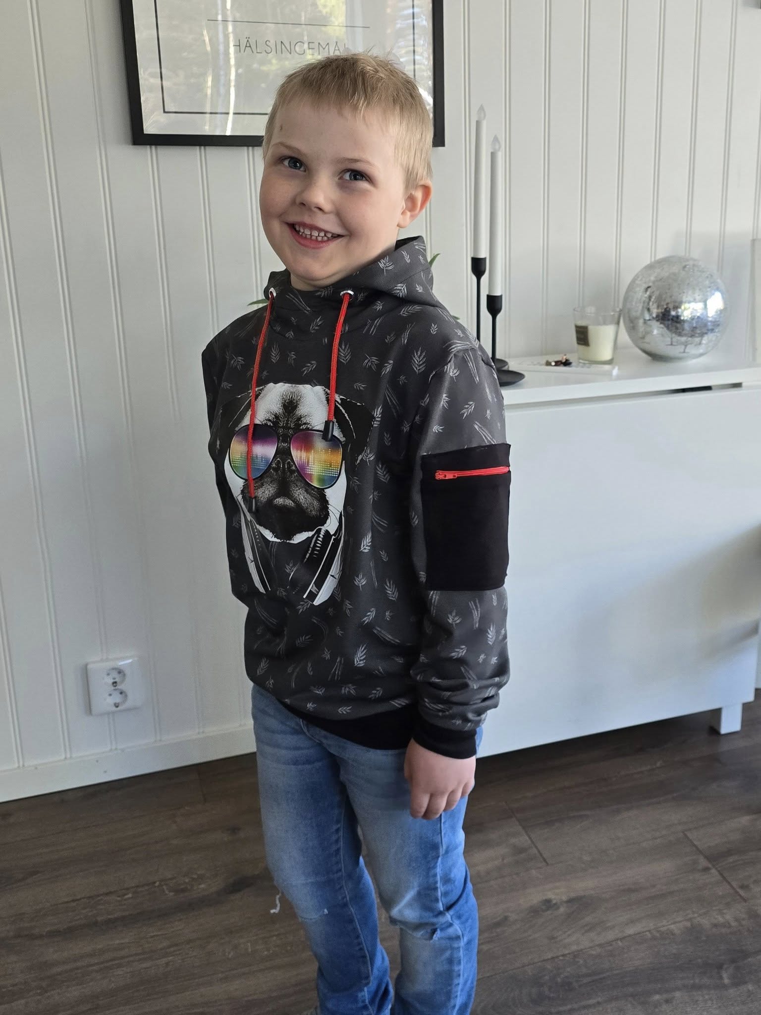 Material och tillklippning: Denna modell är ritad för jogging/french terry med mudd i ärmslut och nederkant (samt ev. halsringning). Huvan fodras med jogg eller trikå. Valfria detaljer kräver blixtlås för ärmfickan samt öljetter och hoodiesnodd till huvan.
