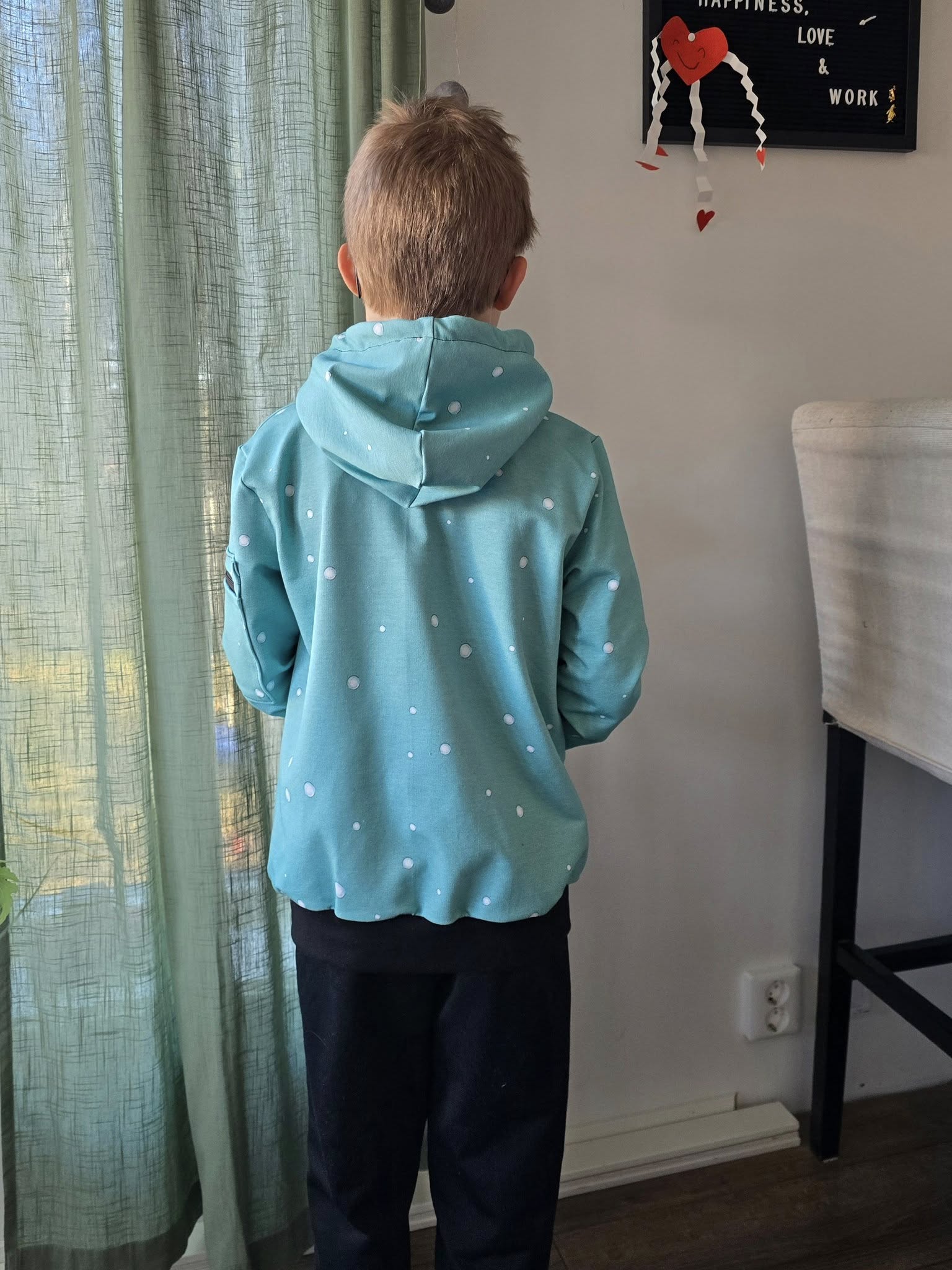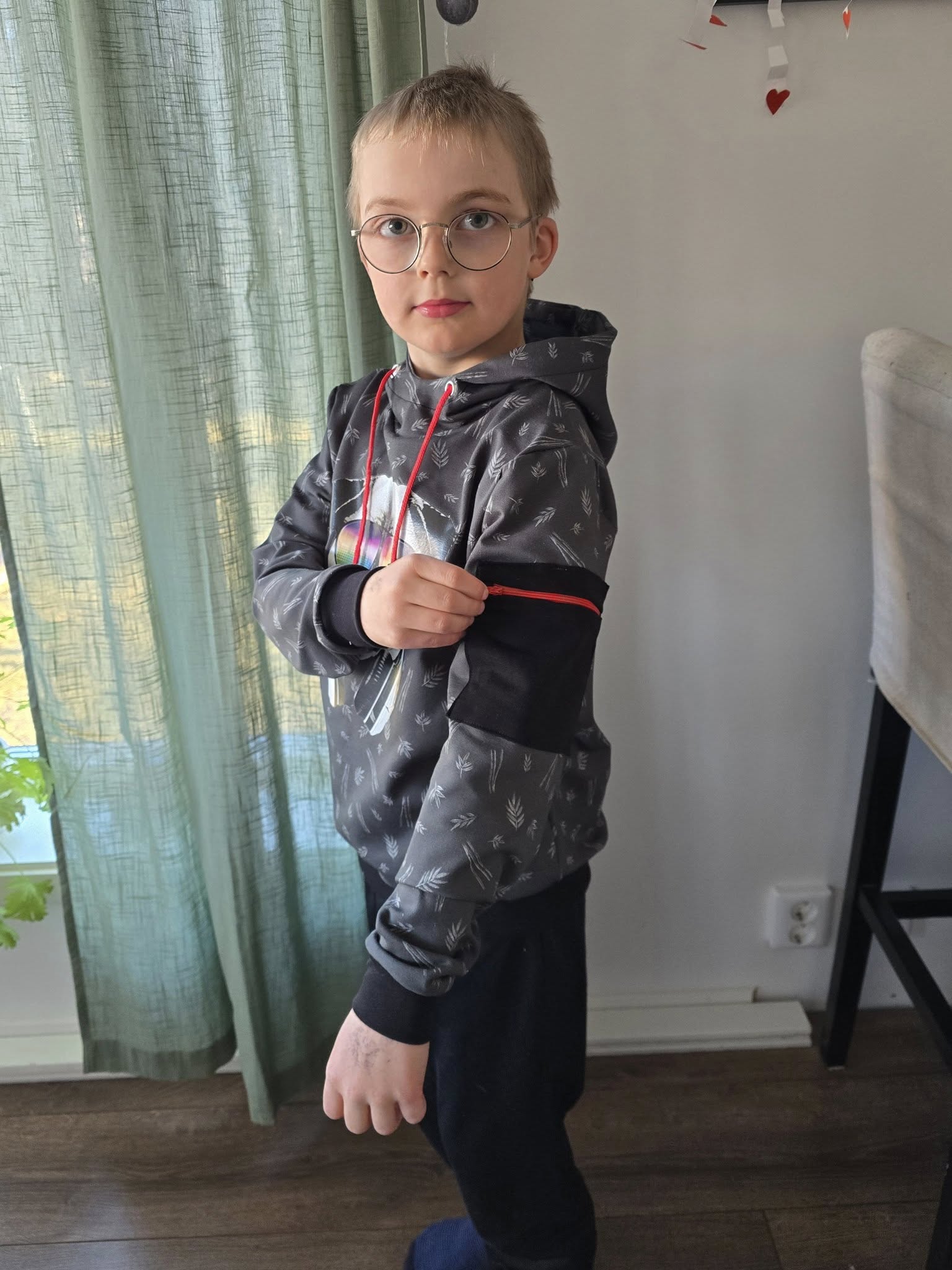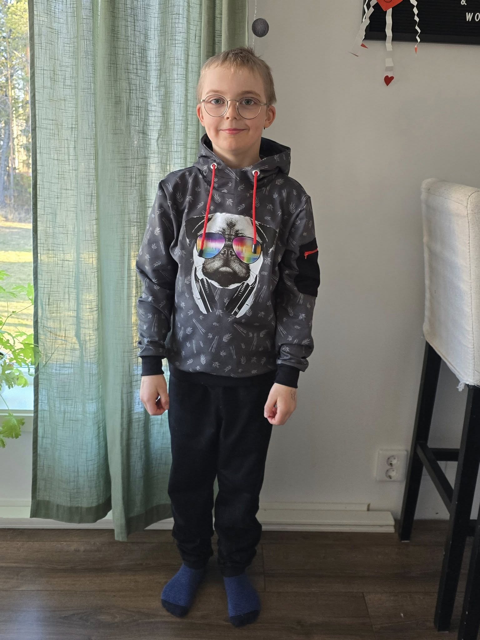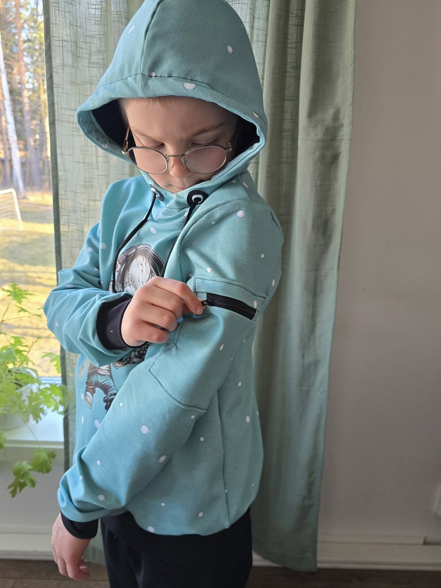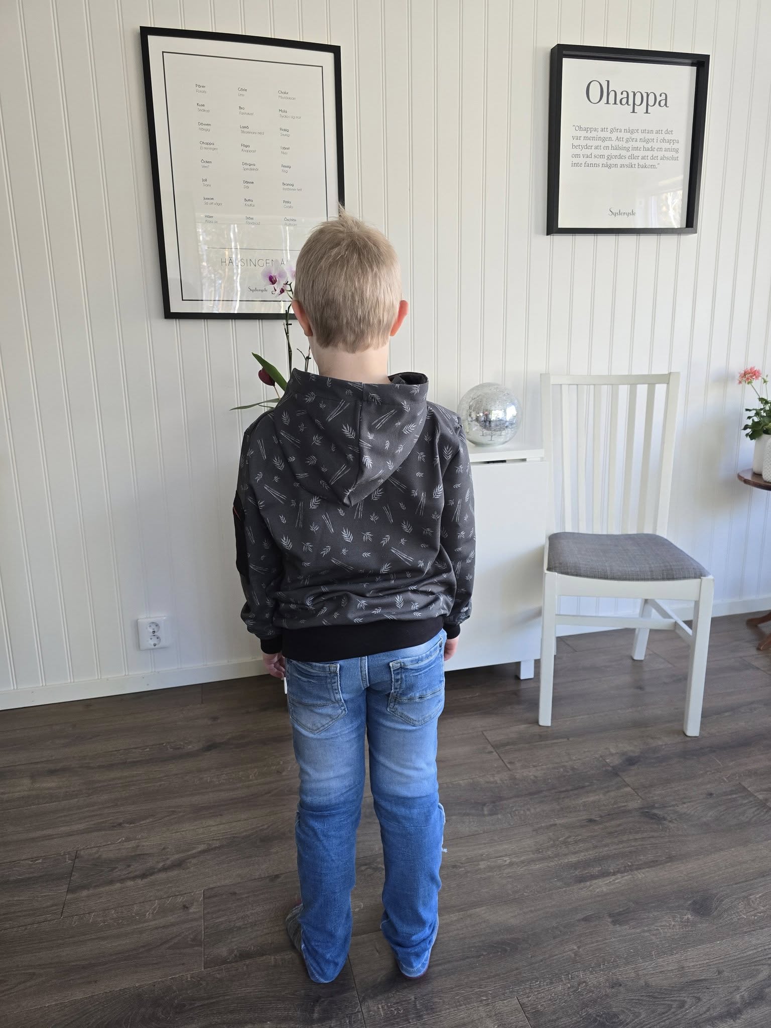 Material och tillklippning: Denna modell är ritad för jogging/french terry med mudd i ärmslut och nederkant (samt ev. halsringning). Huvan fodras med jogg eller trikå. Valfria detaljer kräver blixtlås för ärmfickan samt öljetter och hoodiesnodd till huvan.