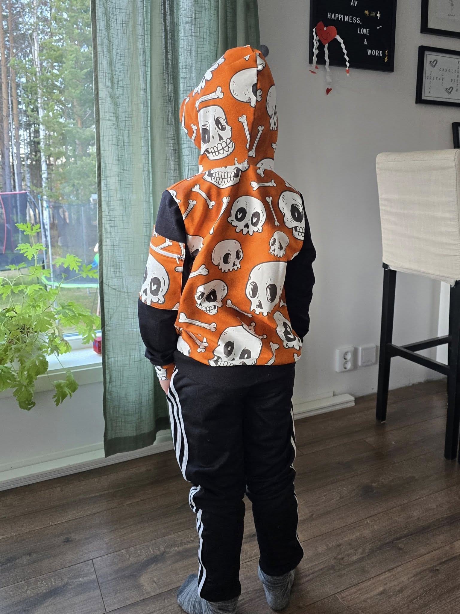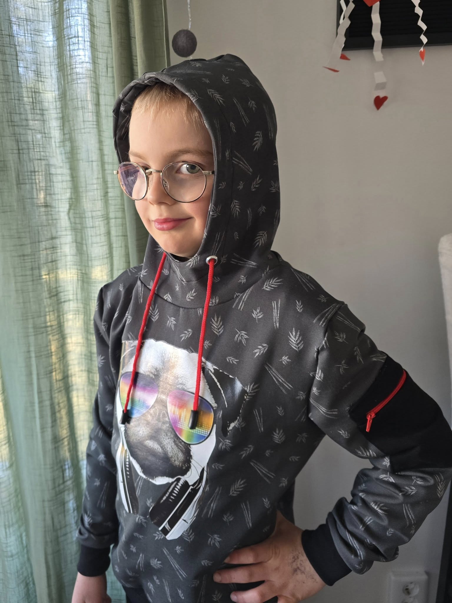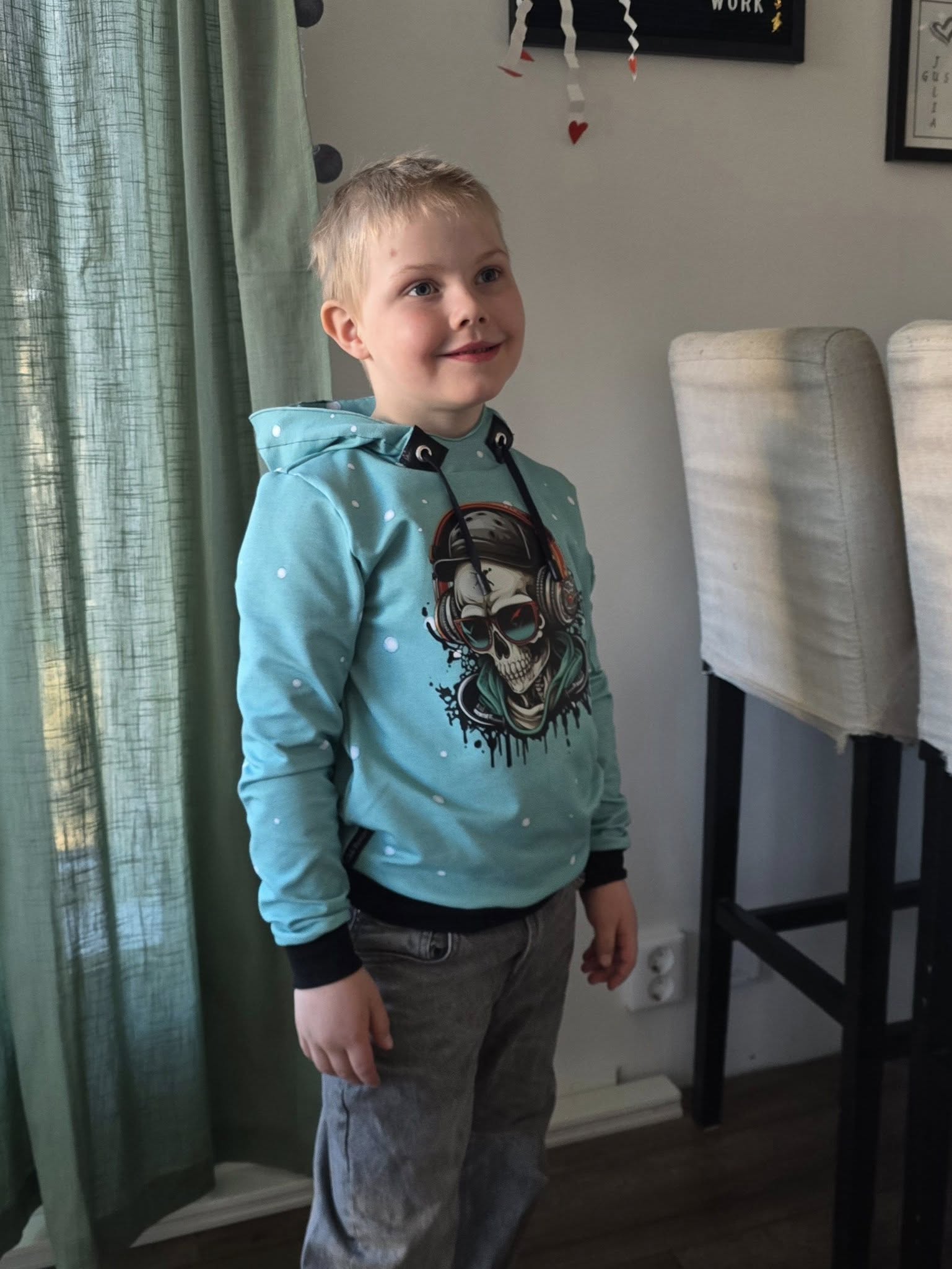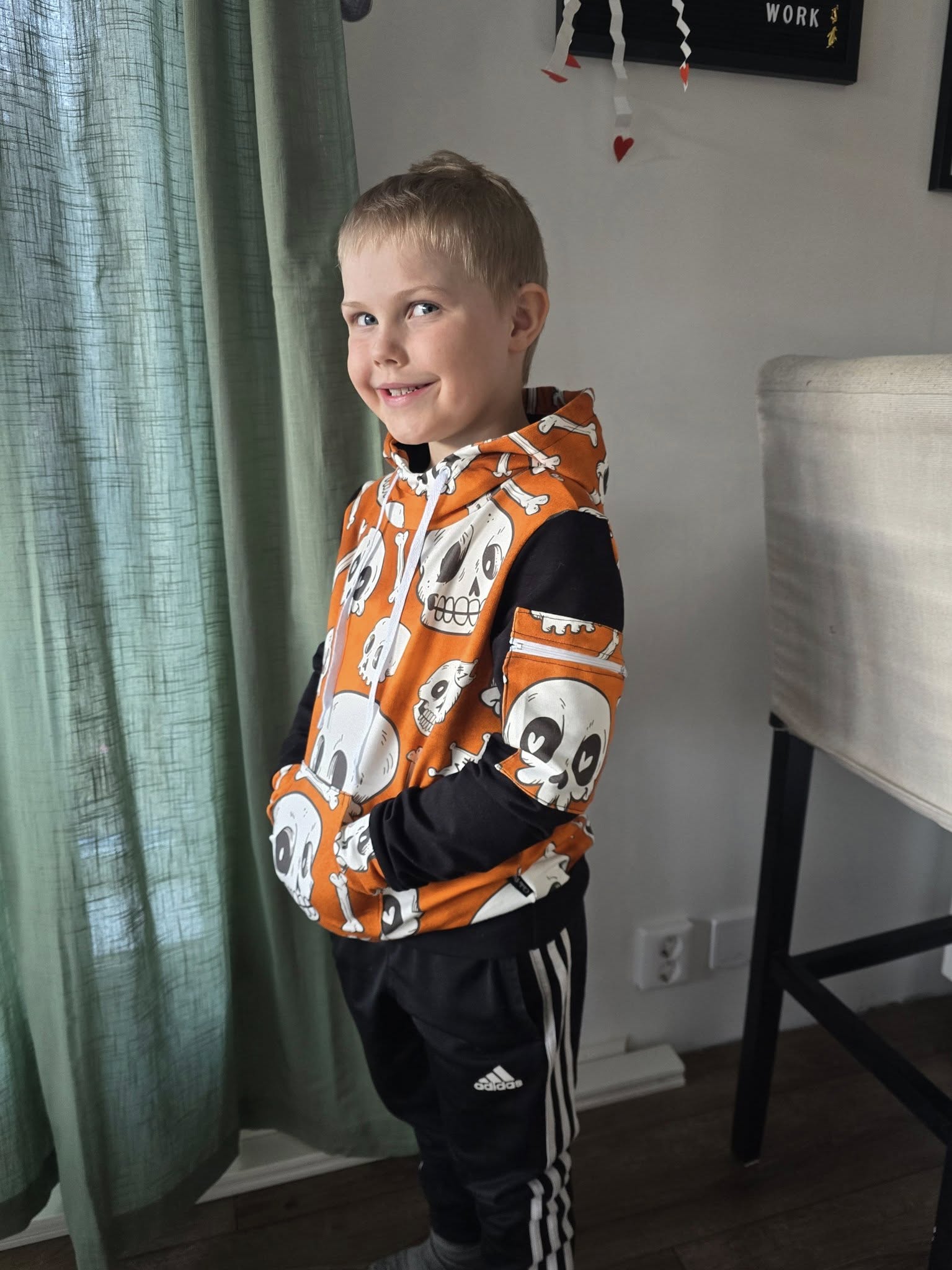 Material och tillklippning: Denna modell är ritad för jogging/french terry med mudd i ärmslut och nederkant (samt ev. halsringning). Huvan fodras med jogg eller trikå. Valfria detaljer kräver blixtlås för ärmfickan samt öljetter och hoodiesnodd till huvan.