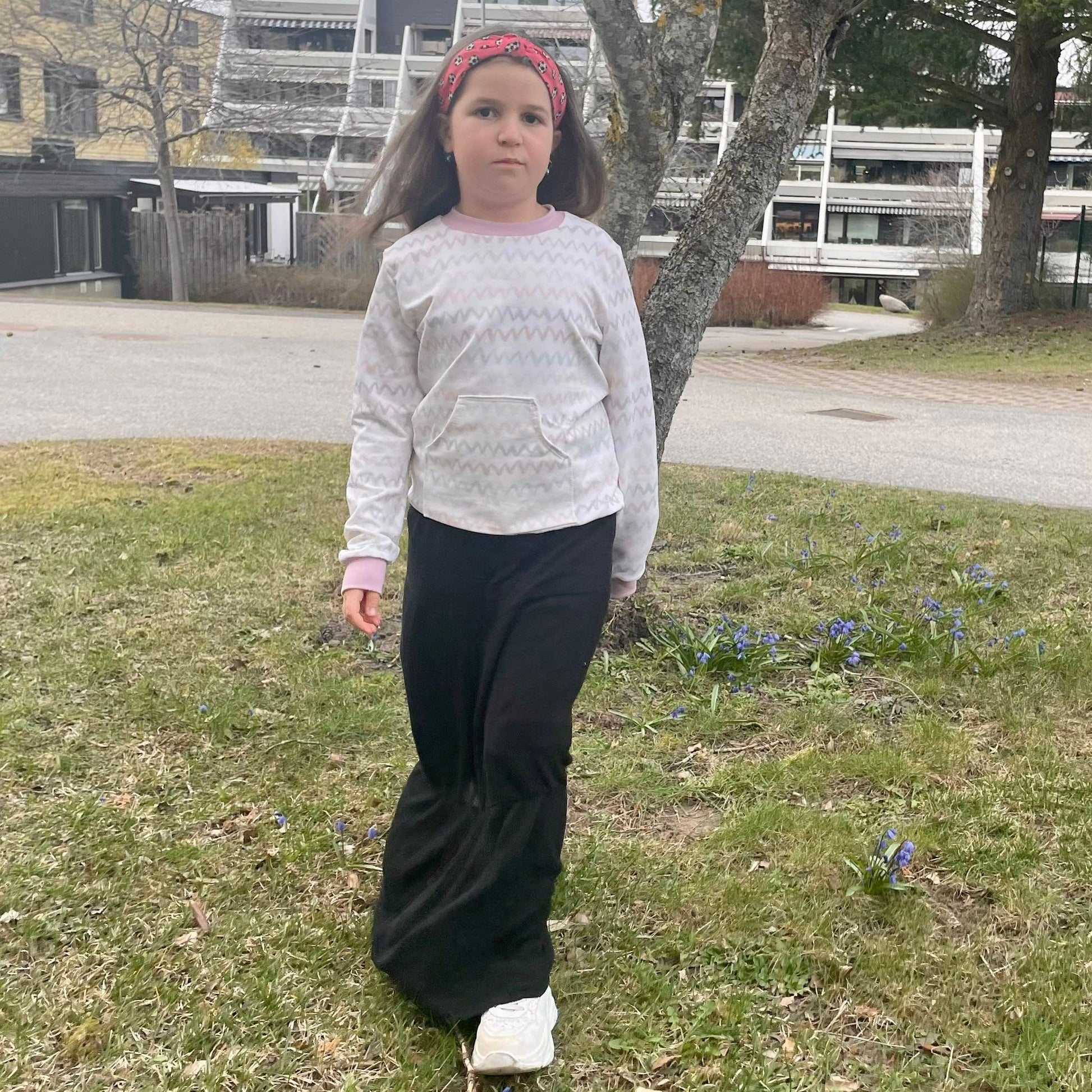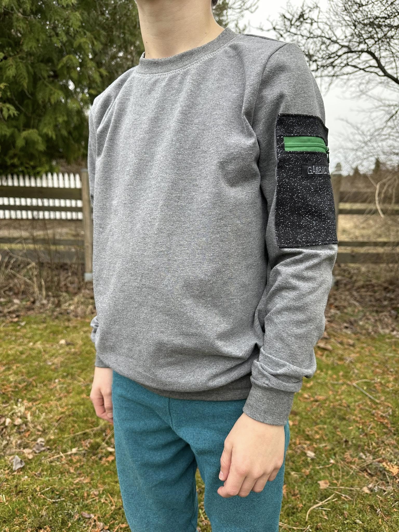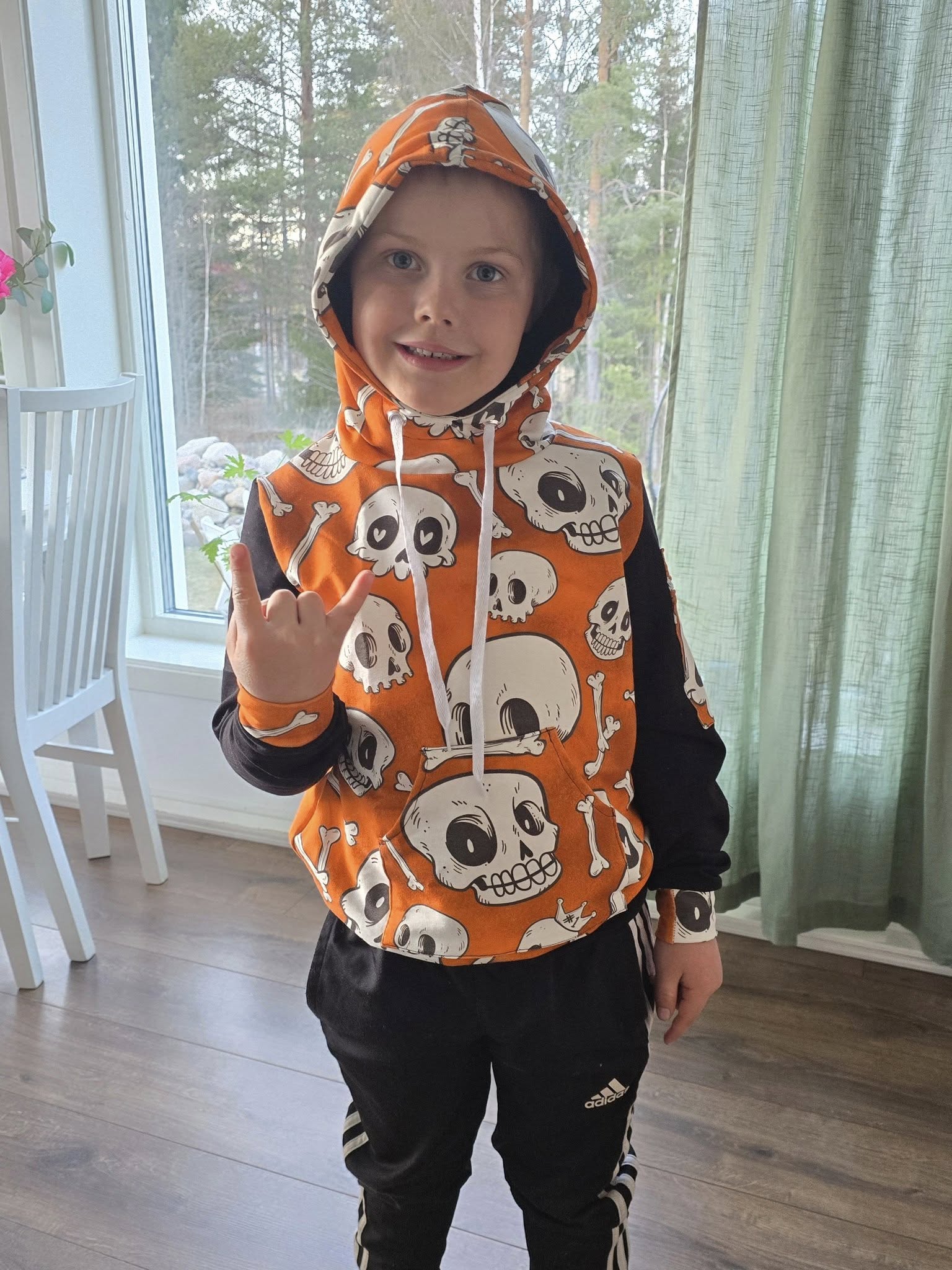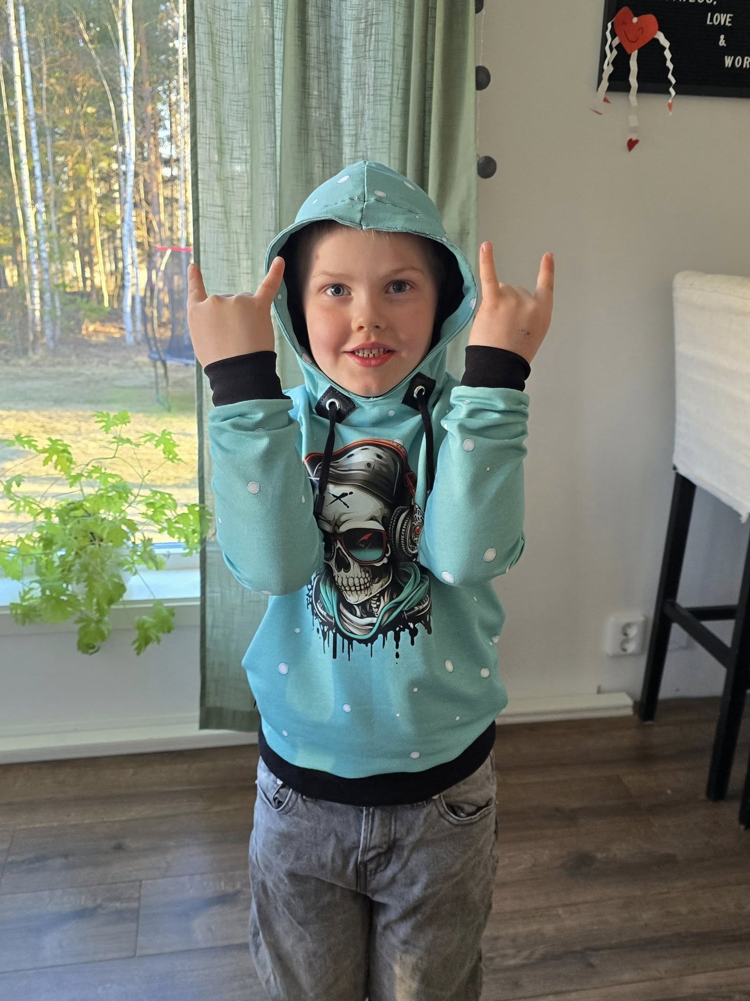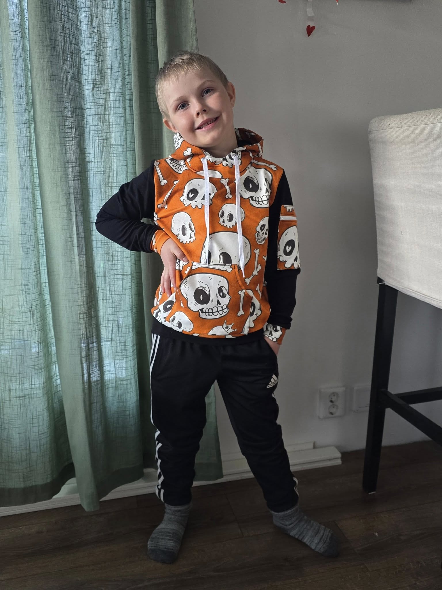 Material och tillklippning: Denna modell är ritad för jogging/french terry med mudd i ärmslut och nederkant (samt ev. halsringning). Huvan fodras med jogg eller trikå. Valfria detaljer kräver blixtlås för ärmfickan samt öljetter och hoodiesnodd till huvan.