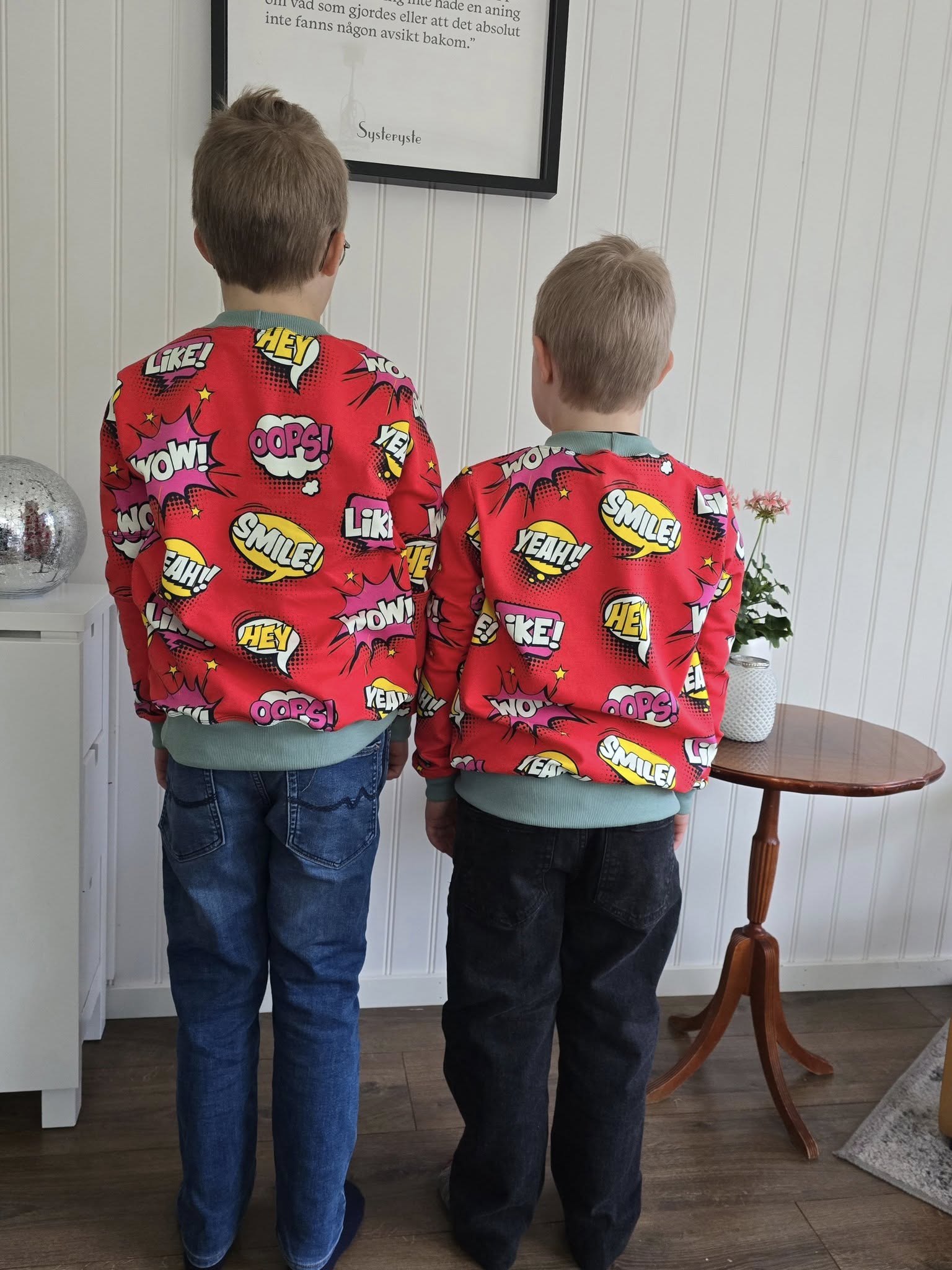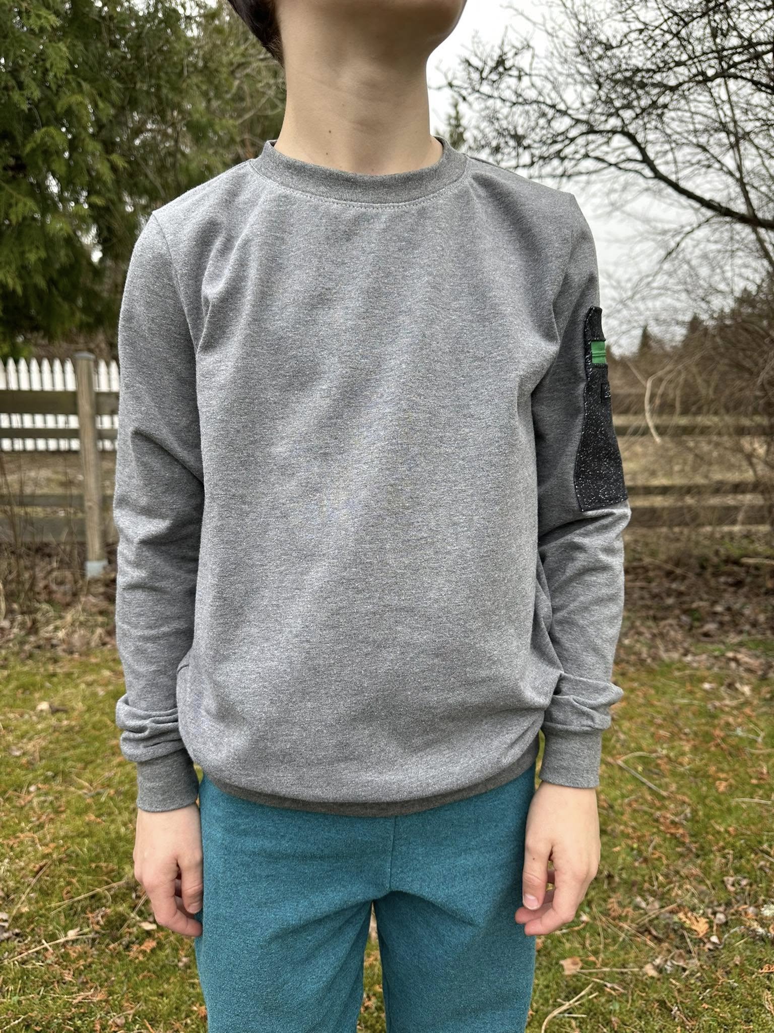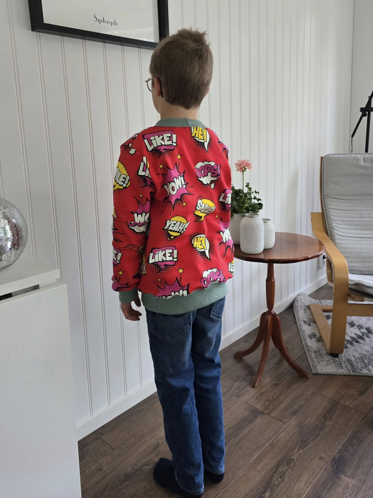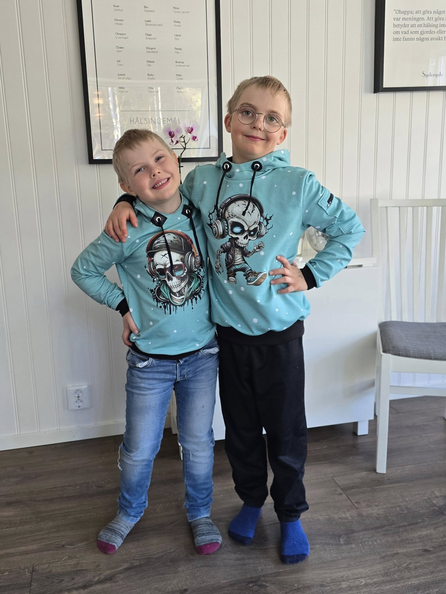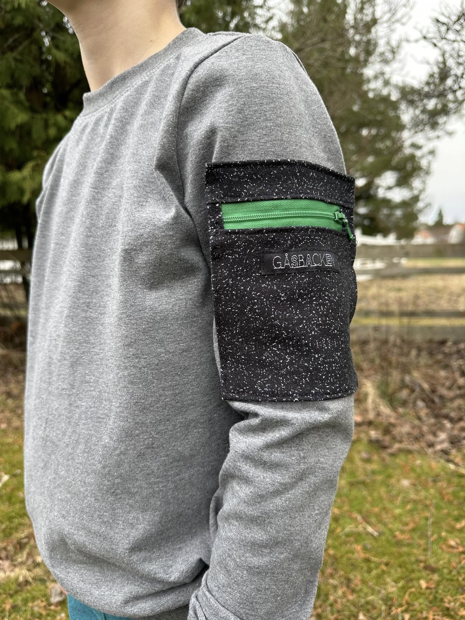 Material och tillklippning: Denna modell är ritad för jogging/french terry med mudd i ärmslut och nederkant (samt ev. halsringning). Huvan fodras med jogg eller trikå. Valfria detaljer kräver blixtlås för ärmfickan samt öljetter och hoodiesnodd till huvan.