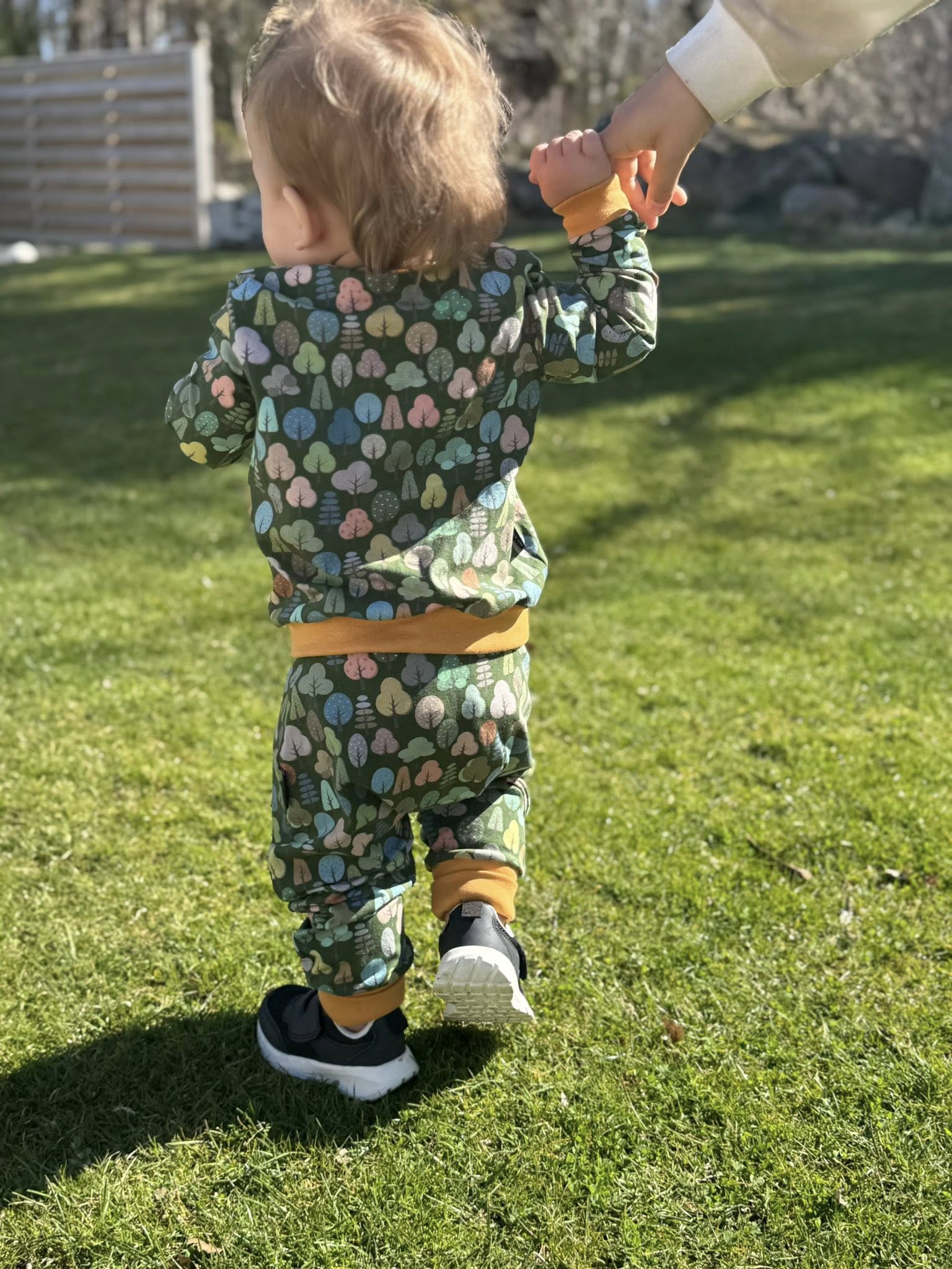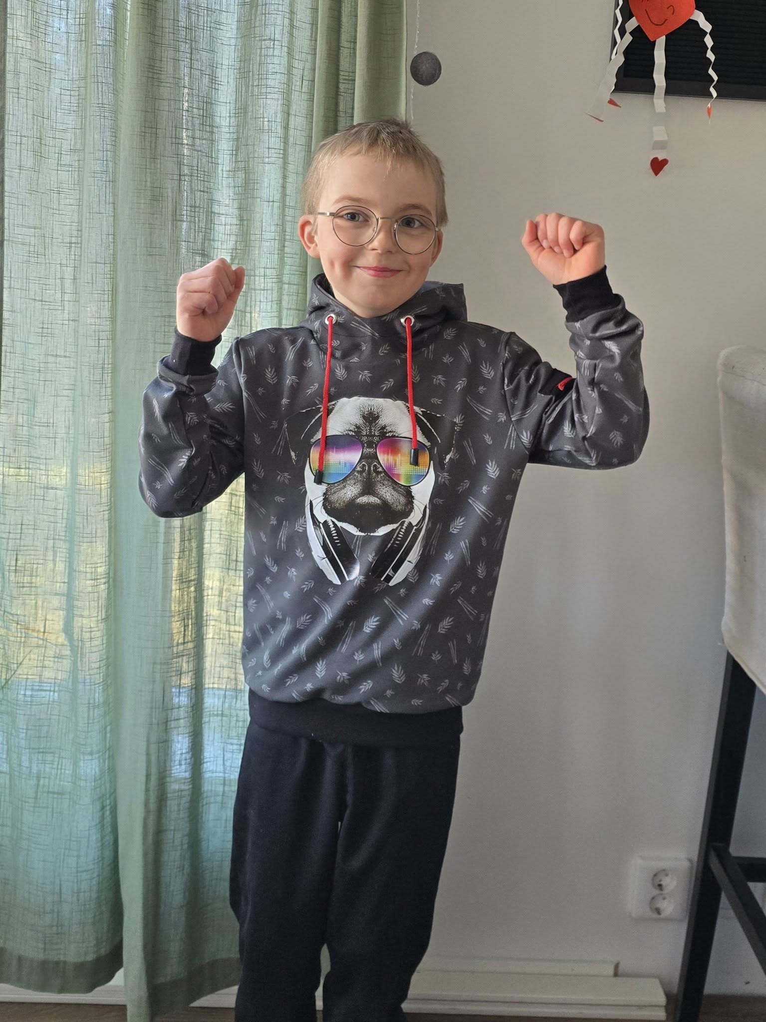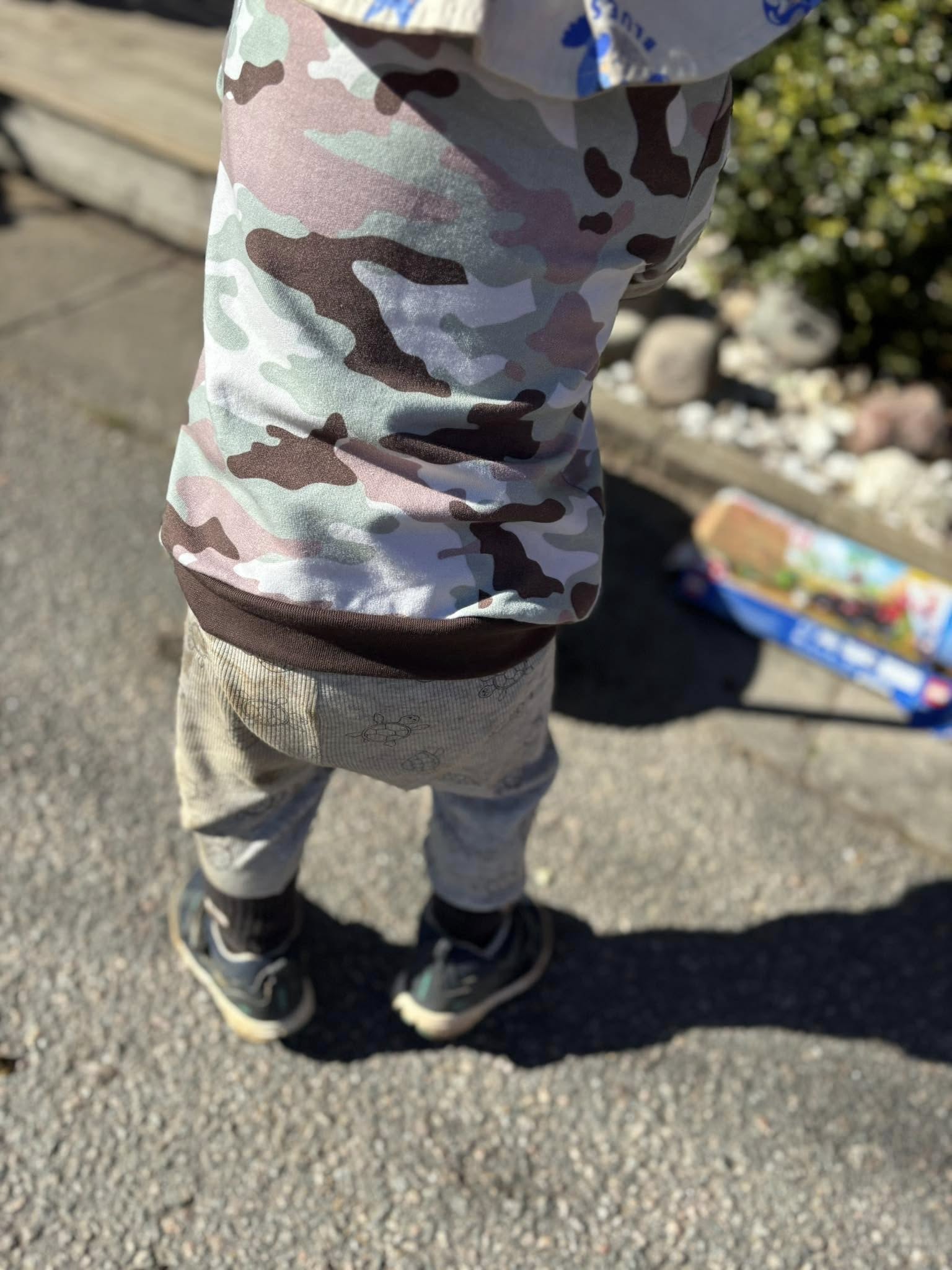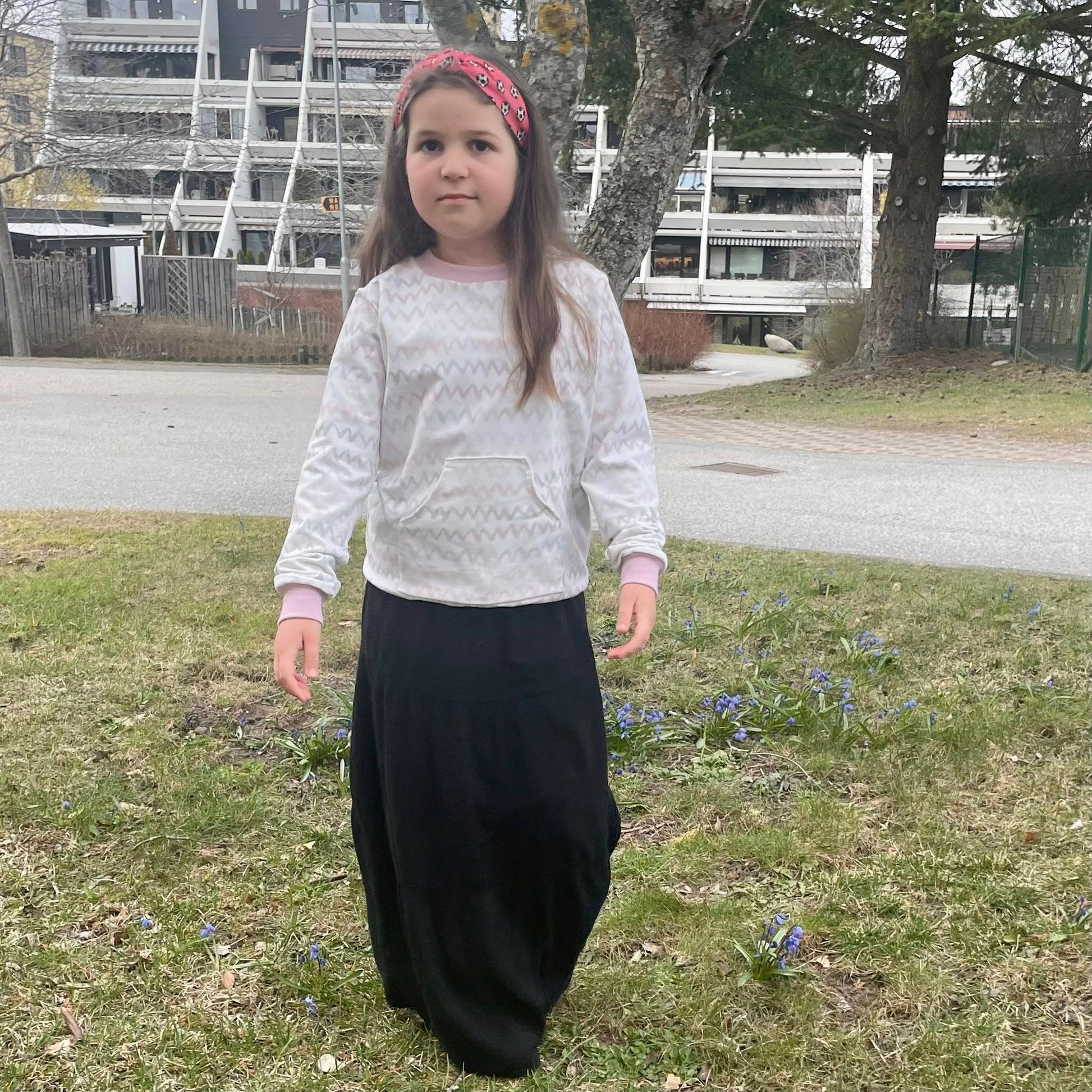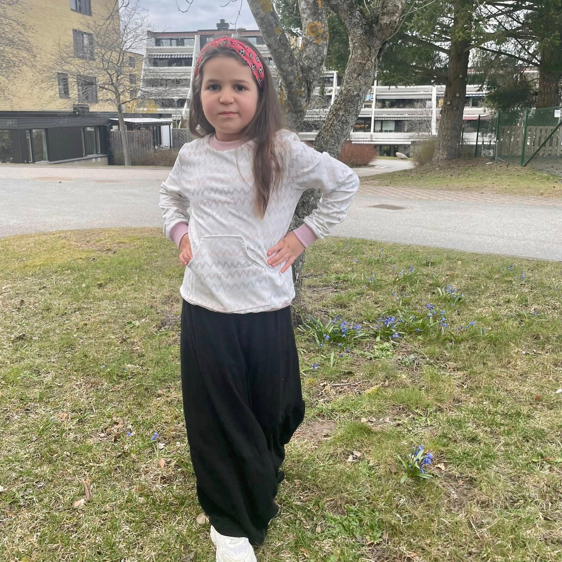 Material och tillklippning: Denna modell är ritad för jogging/french terry med mudd i ärmslut och nederkant (samt ev. halsringning). Huvan fodras med jogg eller trikå. Valfria detaljer kräver blixtlås för ärmfickan samt öljetter och hoodiesnodd till huvan.