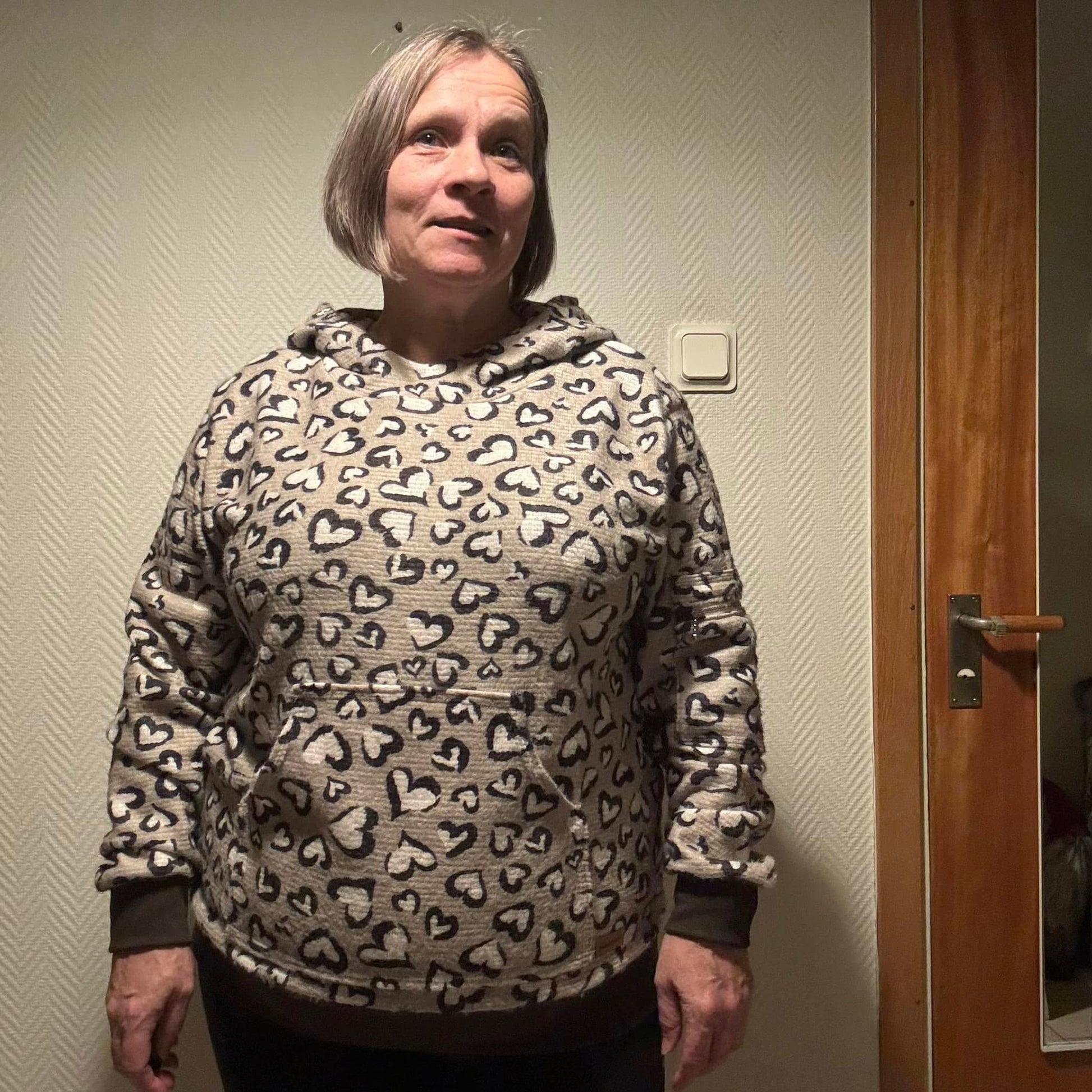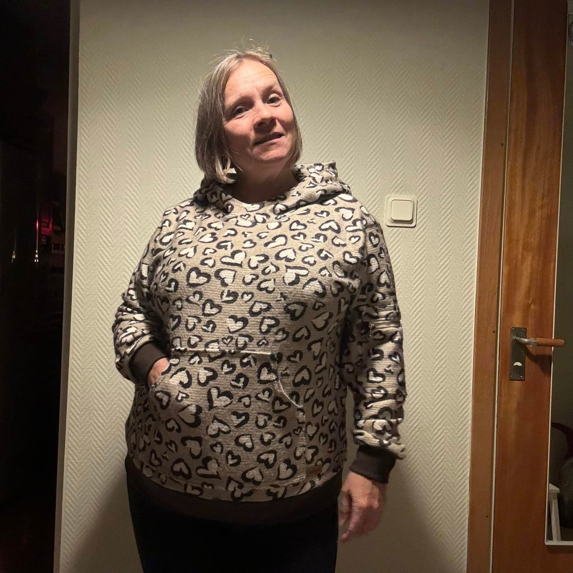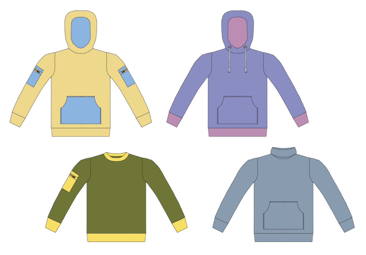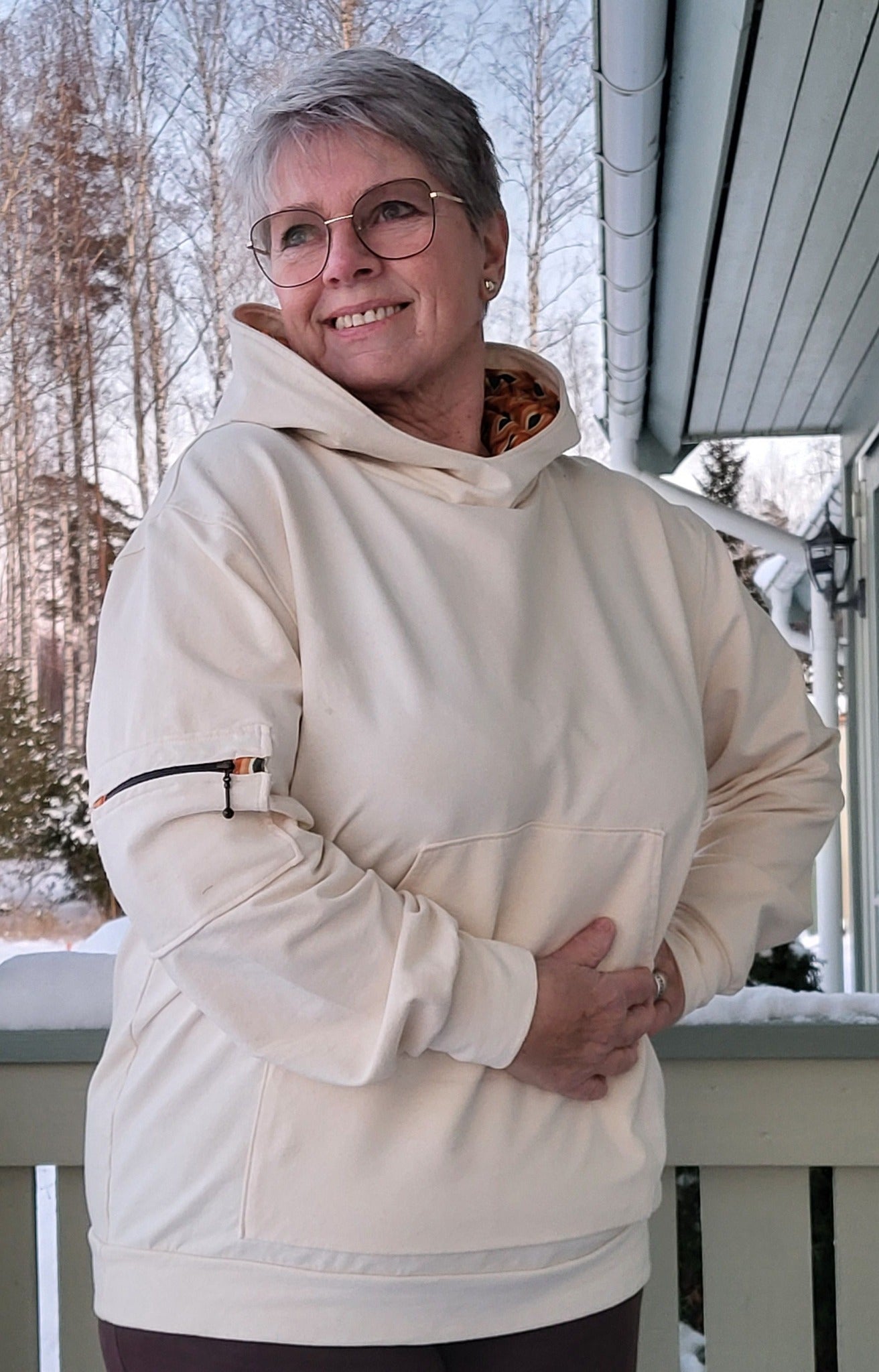 Material och tillklippning: Denna modell är ritad för jogging/french terry med mudd i ärmslut och nederkant (samt ev. halsringning). Huvan fodras med jogg eller trikå. Valfria detaljer kräver blixtlås för ärmfickan samt öljetter och hoodiesnodd till huvan. För att passa både dam och herr kommer denna tröja i två längder.