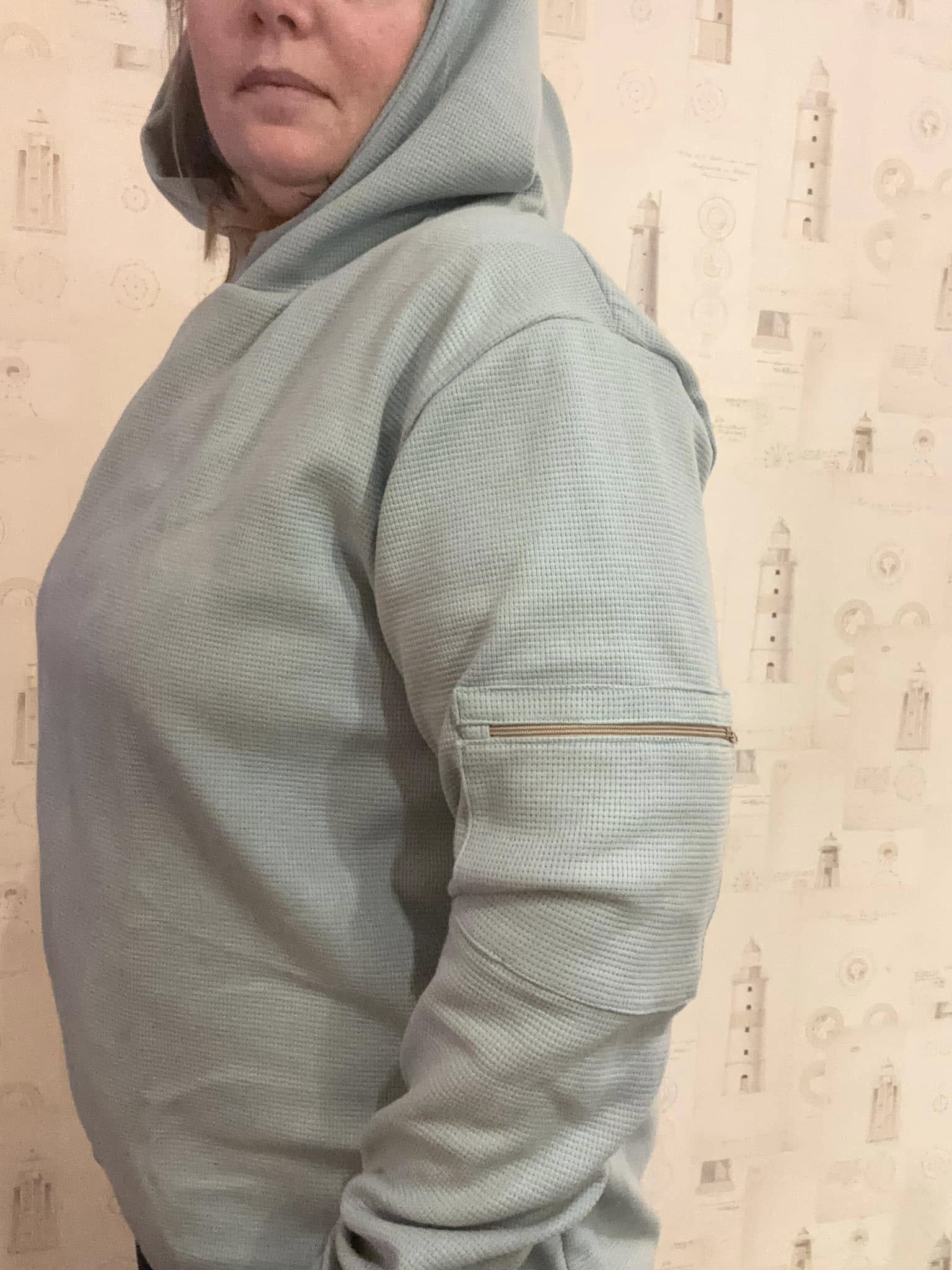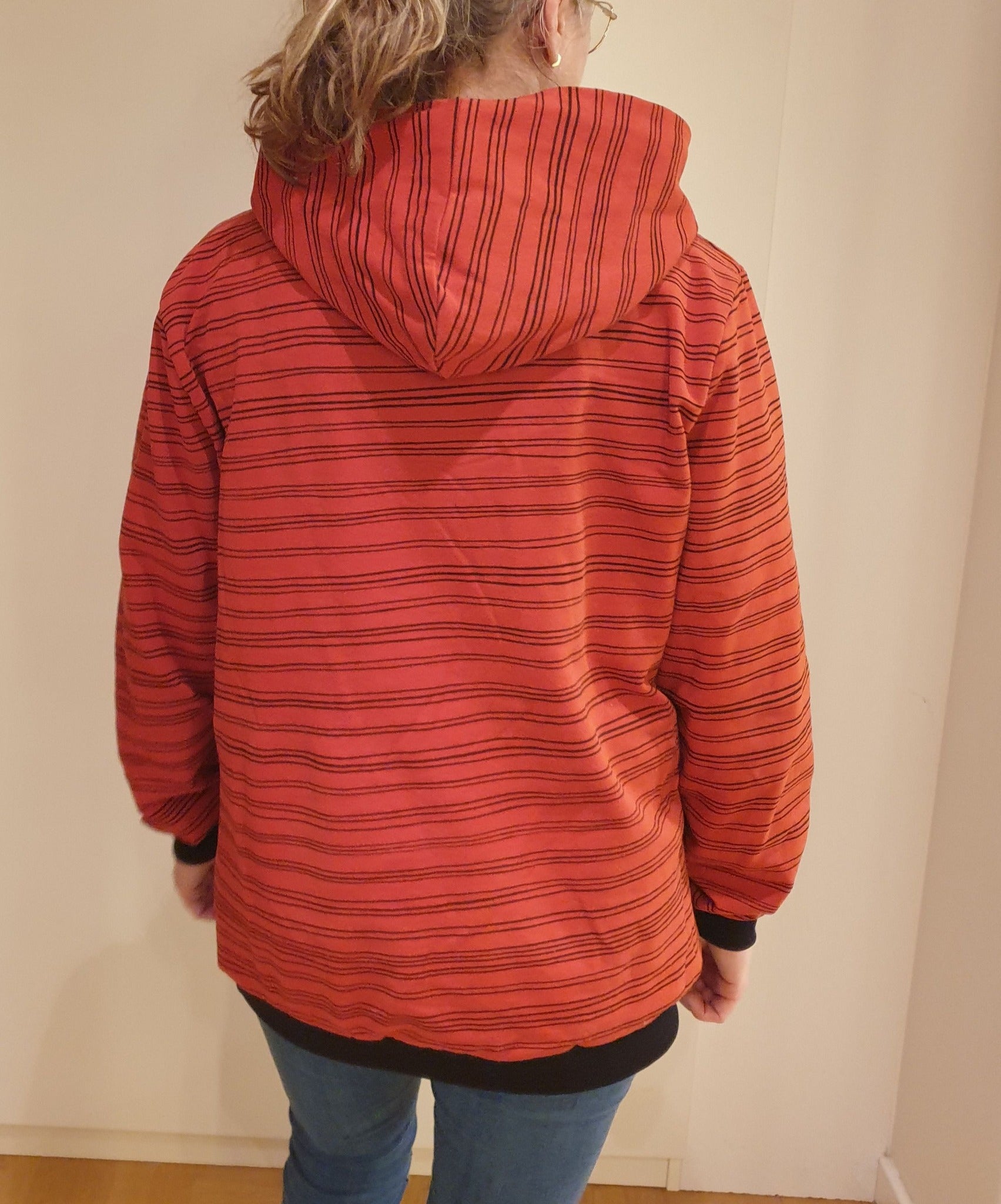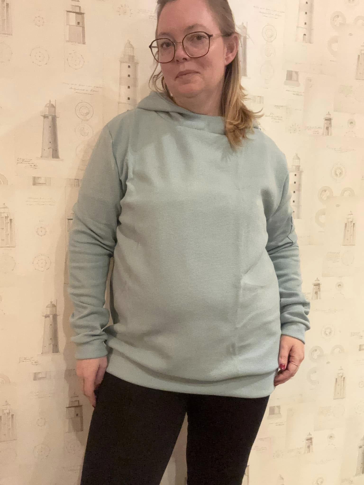 Material och tillklippning: Denna modell är ritad för jogging/french terry med mudd i ärmslut och nederkant (samt ev. halsringning). Huvan fodras med jogg eller trikå. Valfria detaljer kräver blixtlås för ärmfickan samt öljetter och hoodiesnodd till huvan. För att passa både dam och herr kommer denna tröja i två längder.