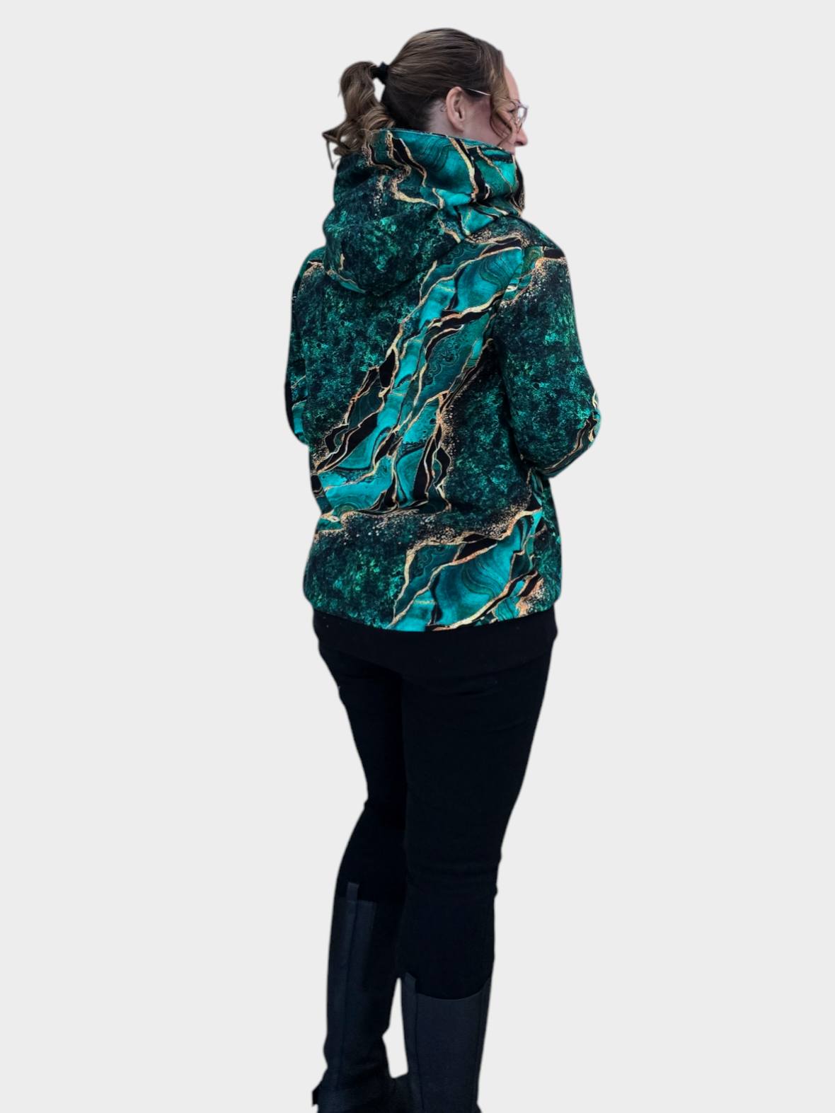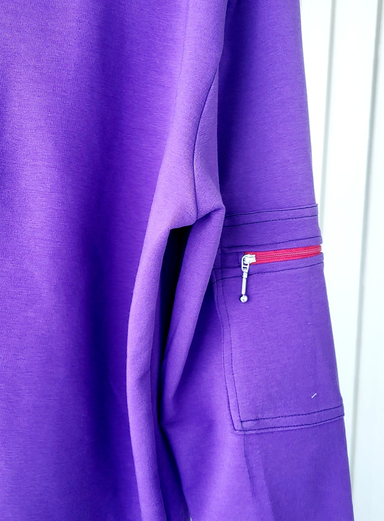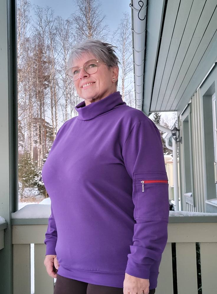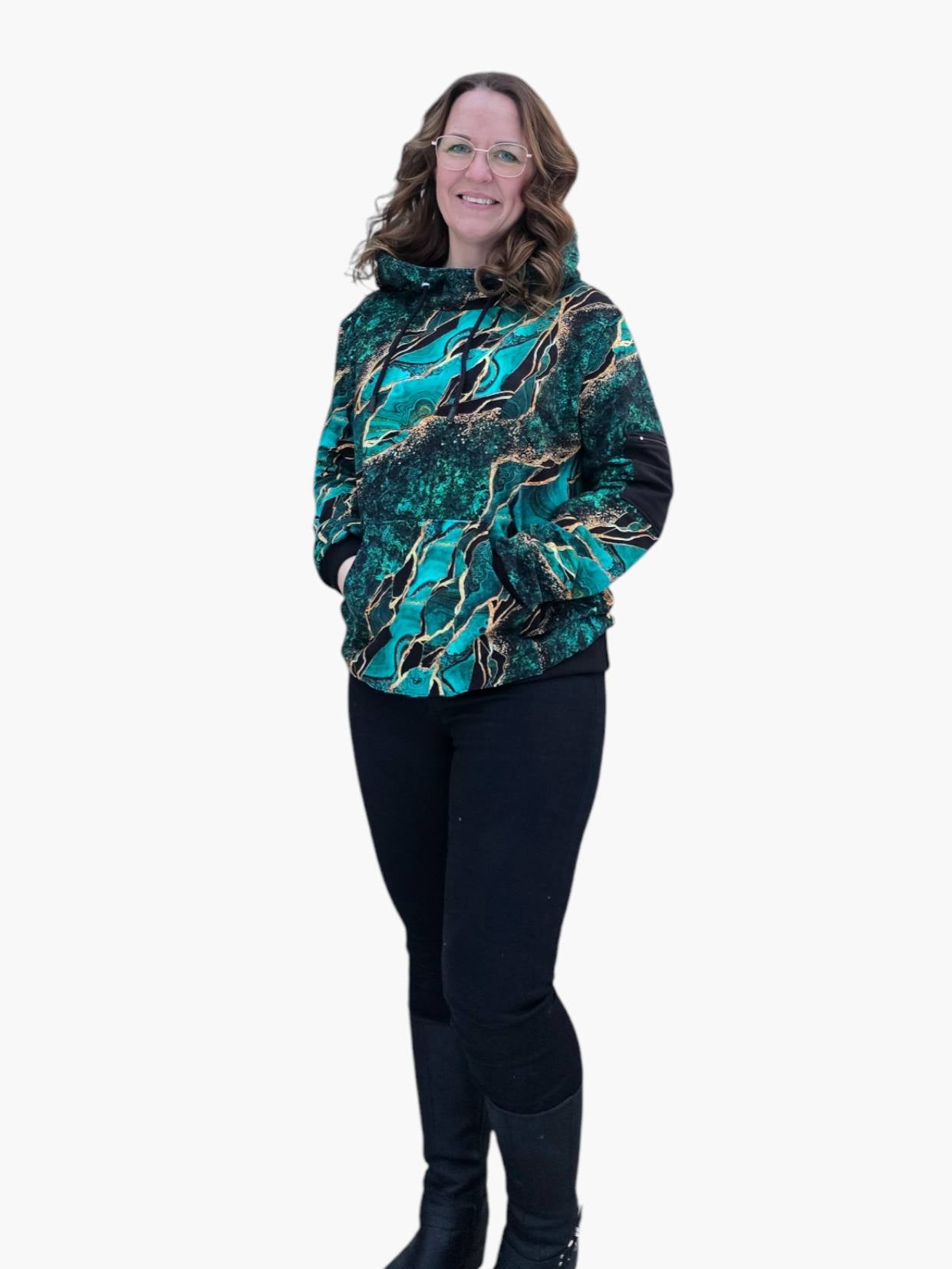 Material och tillklippning: Denna modell är ritad för jogging/french terry med mudd i ärmslut och nederkant (samt ev. halsringning). Huvan fodras med jogg eller trikå. Valfria detaljer kräver blixtlås för ärmfickan samt öljetter och hoodiesnodd till huvan. För att passa både dam och herr kommer denna tröja i två längder.