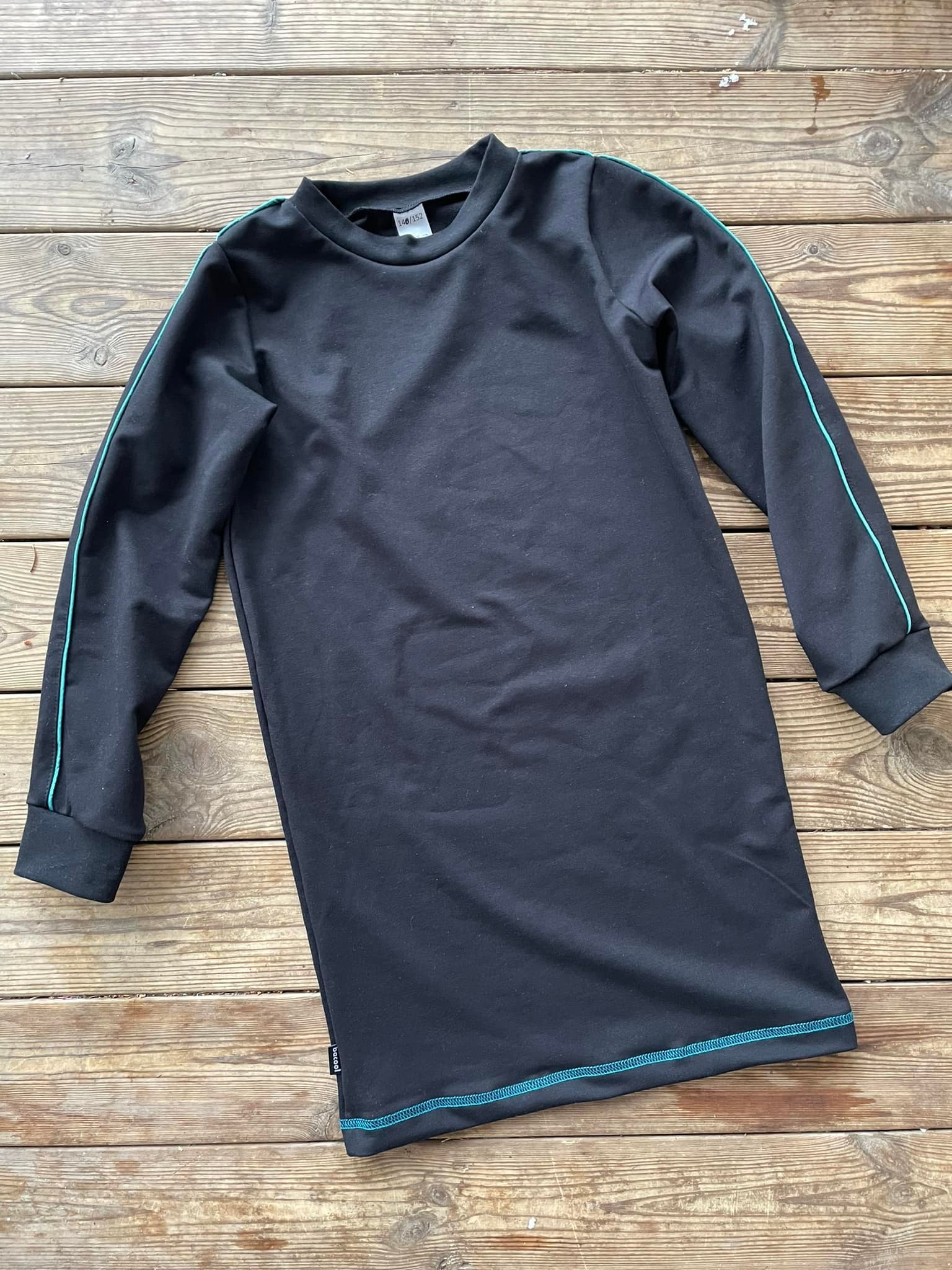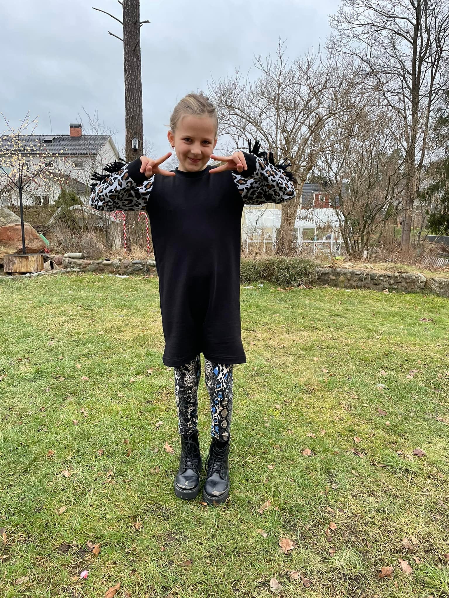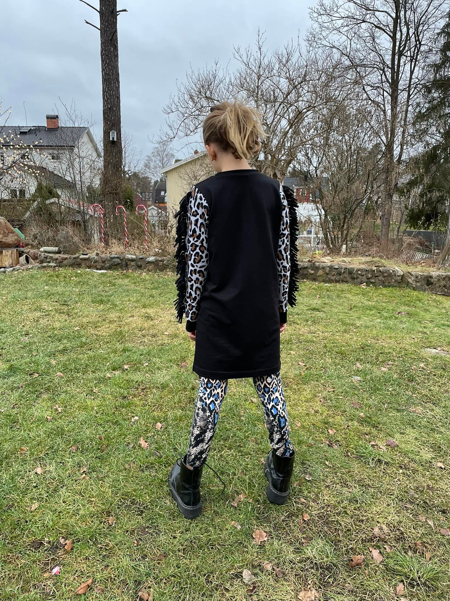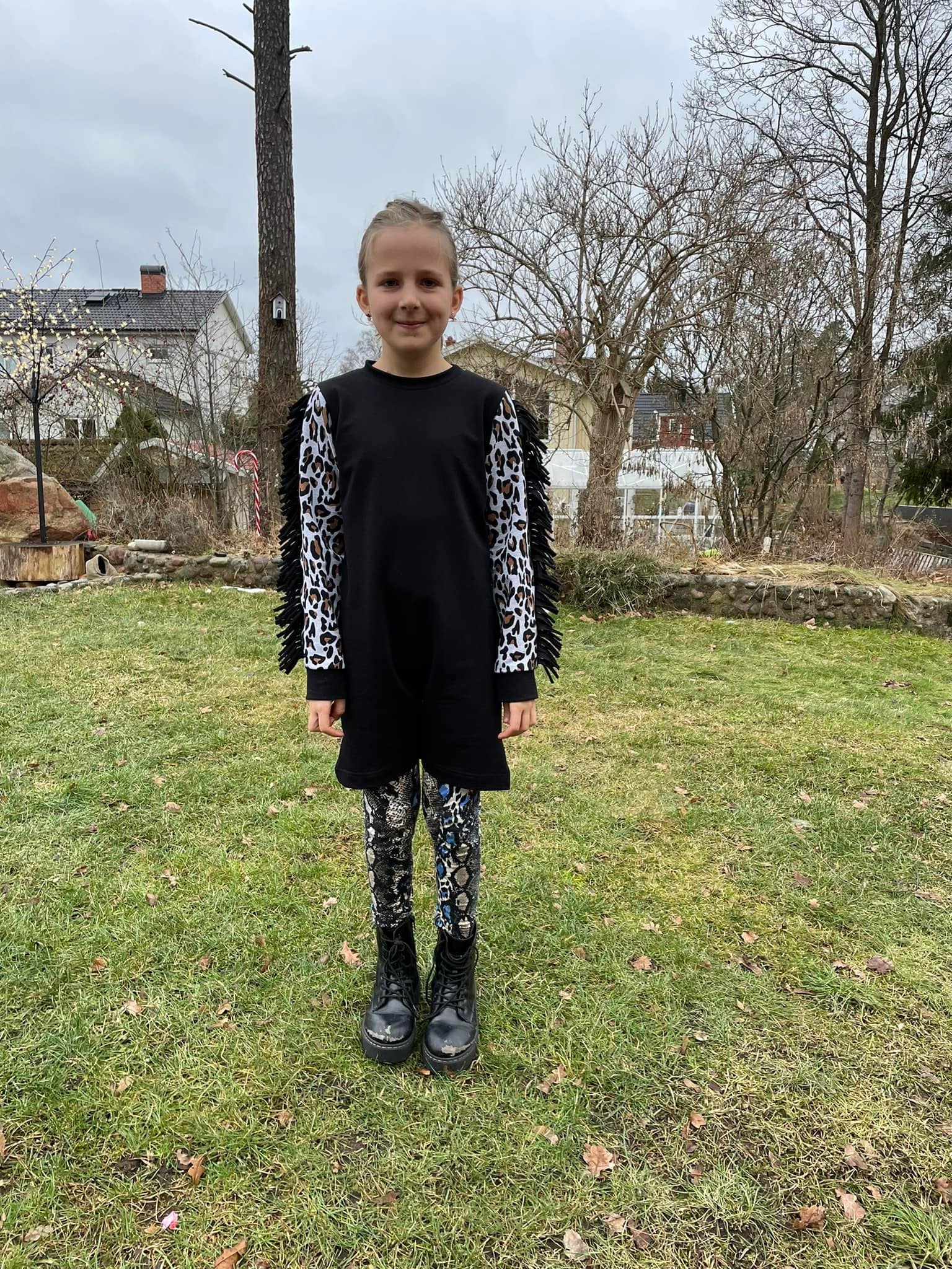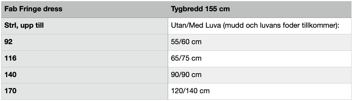 Fab Fringe Dress är en lekvänlig och tuff klänning/tunika med en rolig (valfri) detalj i form av fransar, passpoal eller annat roligt band på ärmens ovansida. Midjan har en lös resårkanal för extra form. För extra variation: Skippa resåren i midjan och sy modellen som en lång rak sweatshirt istället. Halsringningen kan sys med mudd eller med en luva.