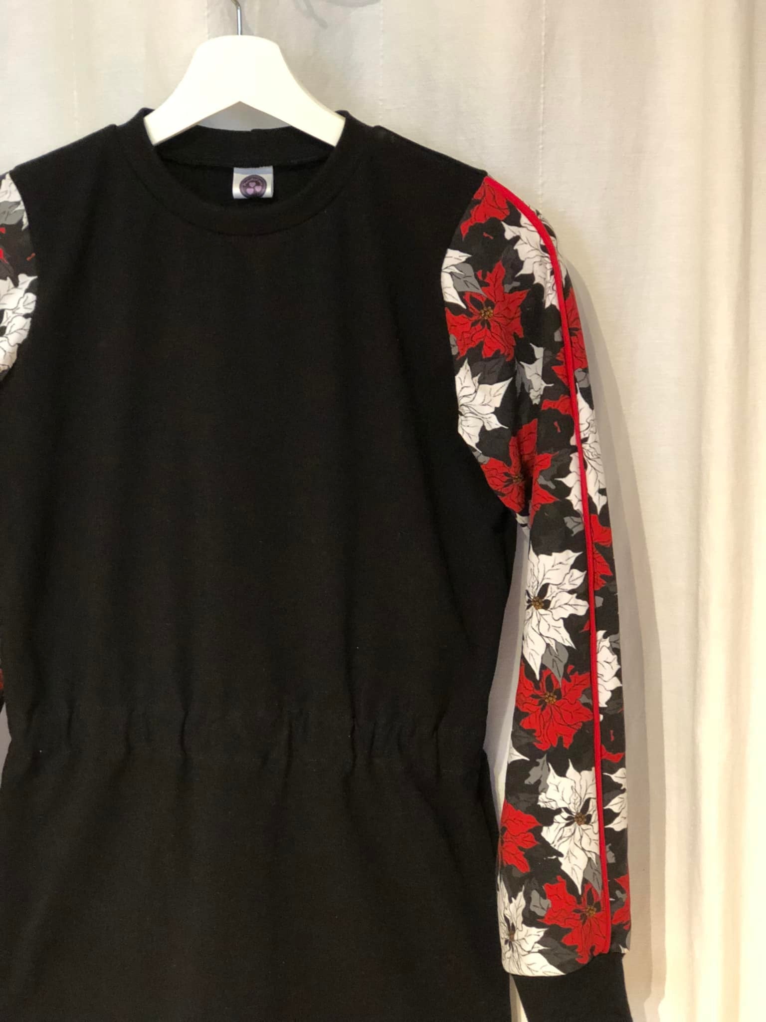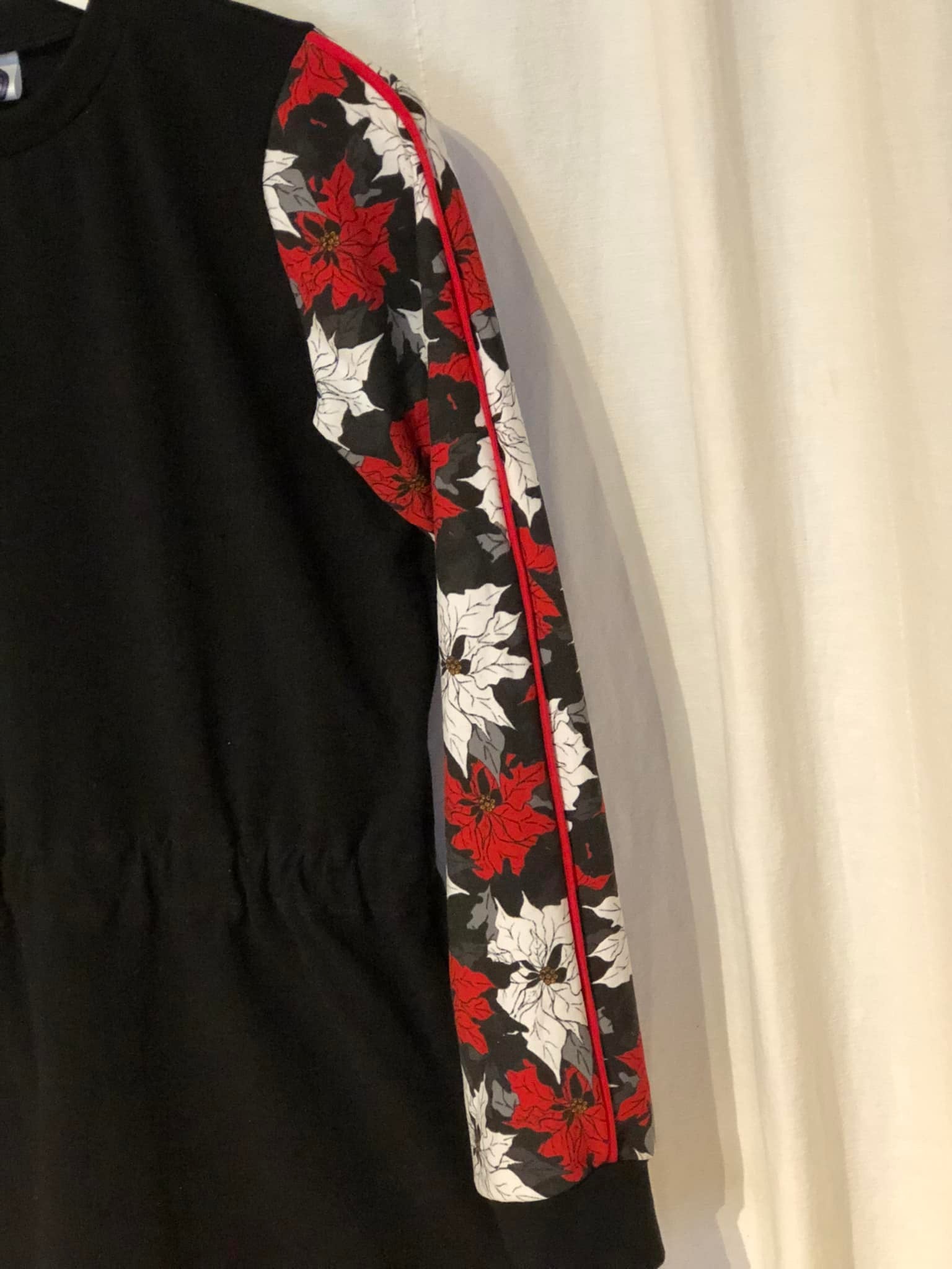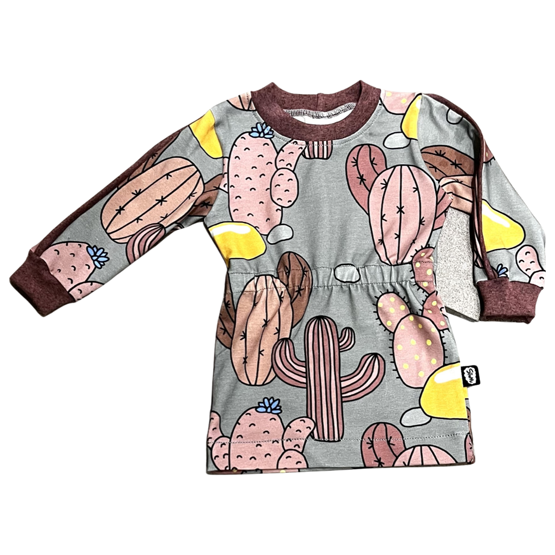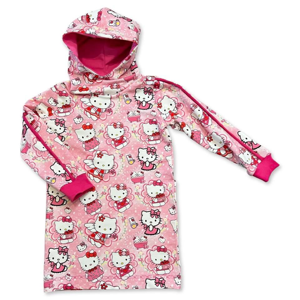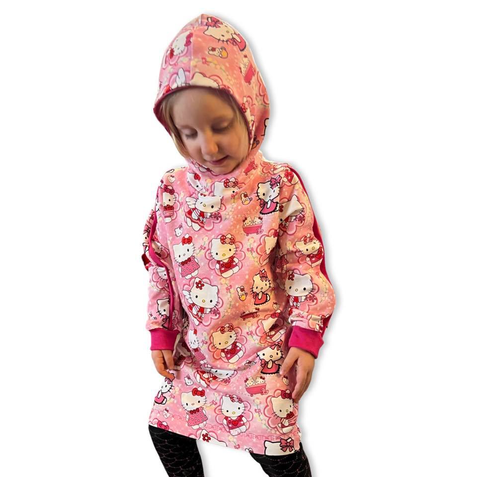 Fab Fringe Dress är en lekvänlig och tuff klänning/tunika med en rolig (valfri) detalj i form av fransar, passpoal eller annat roligt band på ärmens ovansida. Midjan har en lös resårkanal för extra form. För extra variation: Skippa resåren i midjan och sy modellen som en lång rak sweatshirt istället. Halsringningen kan sys med mudd eller med en luva.