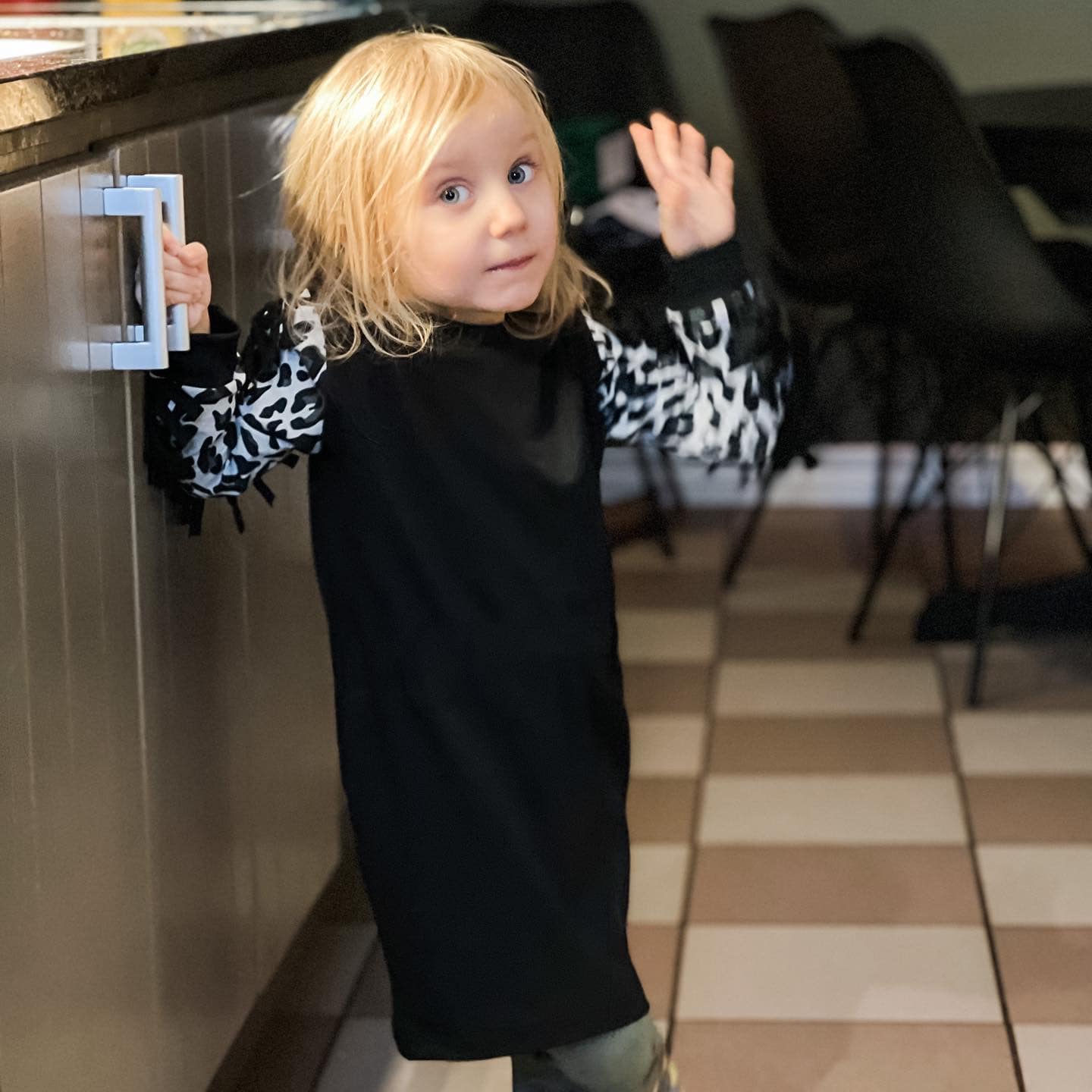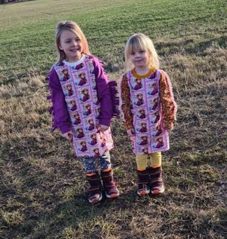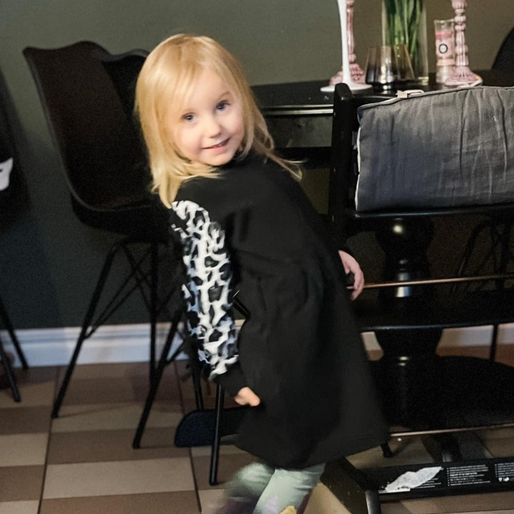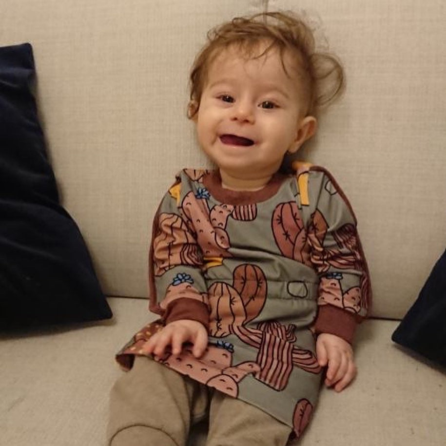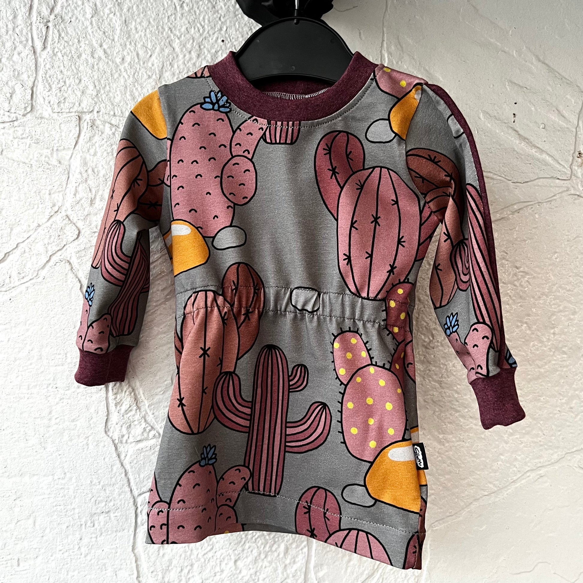 Fab Fringe Dress är en lekvänlig och tuff klänning/tunika med en rolig (valfri) detalj i form av fransar, passpoal eller annat roligt band på ärmens ovansida. Midjan har en lös resårkanal för extra form. För extra variation: Skippa resåren i midjan och sy modellen som en lång rak sweatshirt istället. Halsringningen kan sys med mudd eller med en luva.