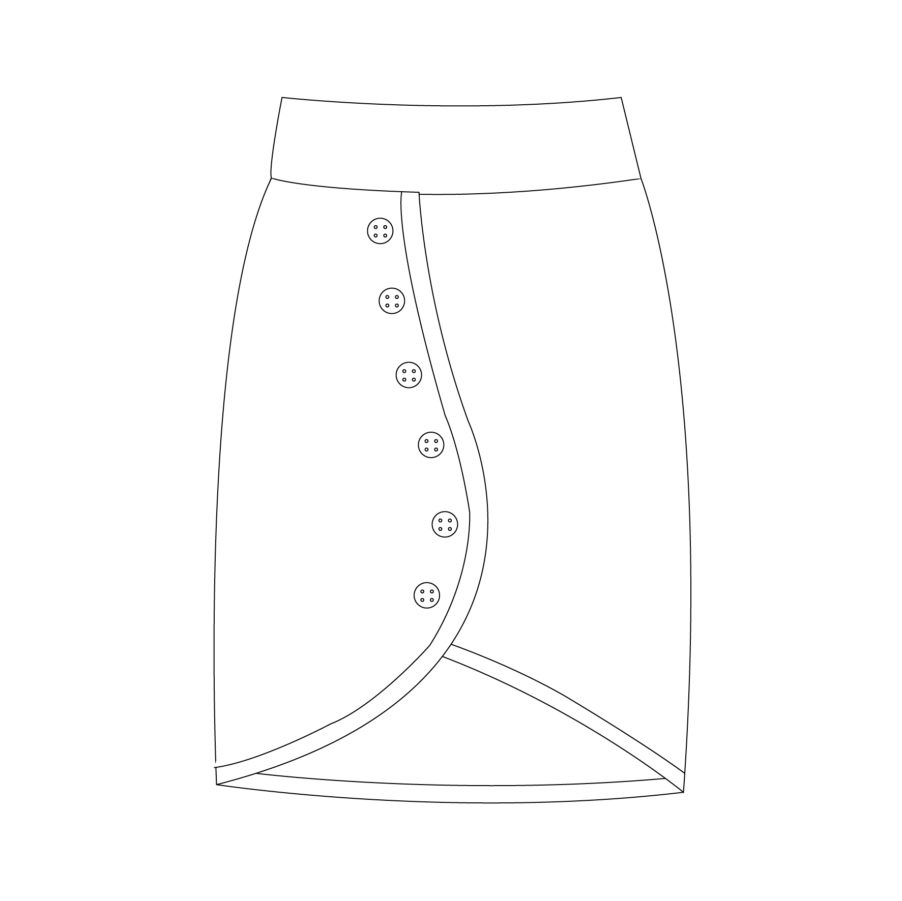 Flirt skirt är en pennkjol med spännande formade framstycken med omlott-look och insnitt på bakstycket för bästa passform. Den kan sys med eller utan volang och rosett nedtill vilket gör att den kan varieras från vardagsfin till festlig. En snygg variation är att sy fast stora knappar längs med vågformen fram, se modellskiss bland produktbilderna.