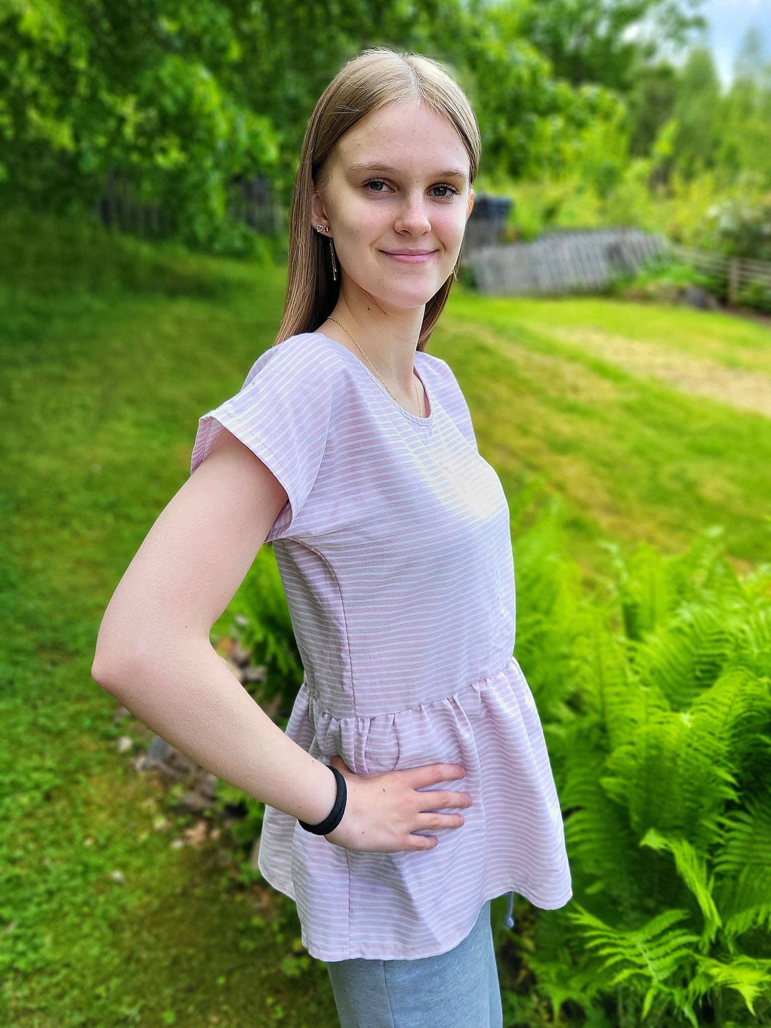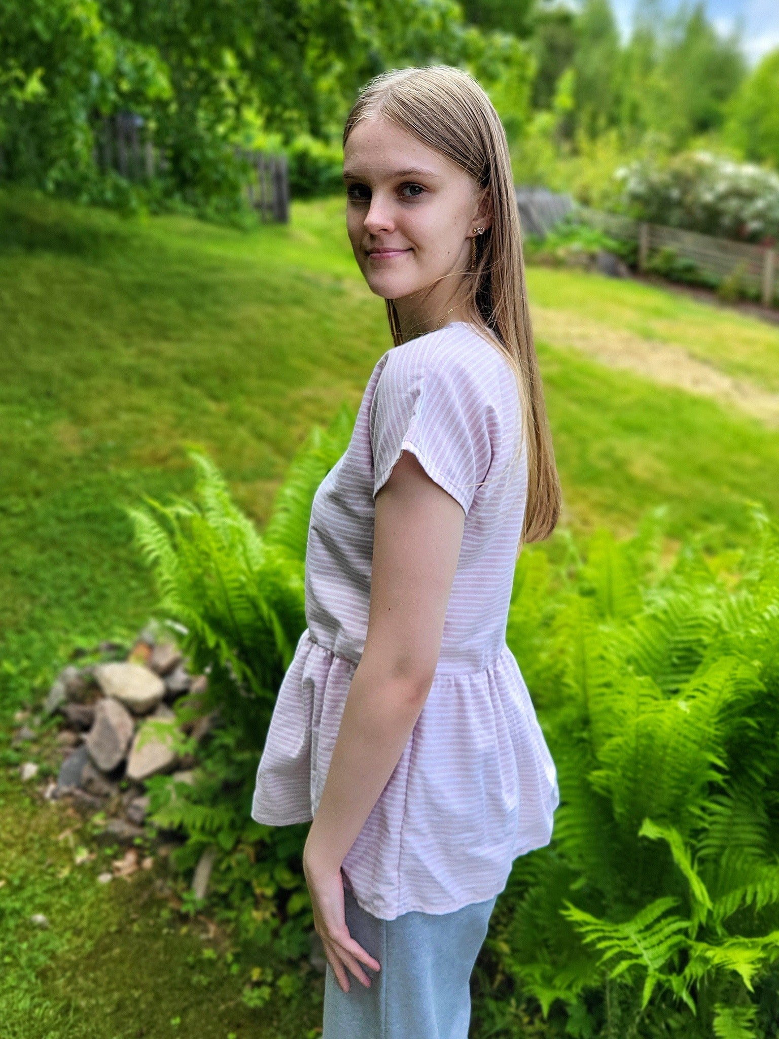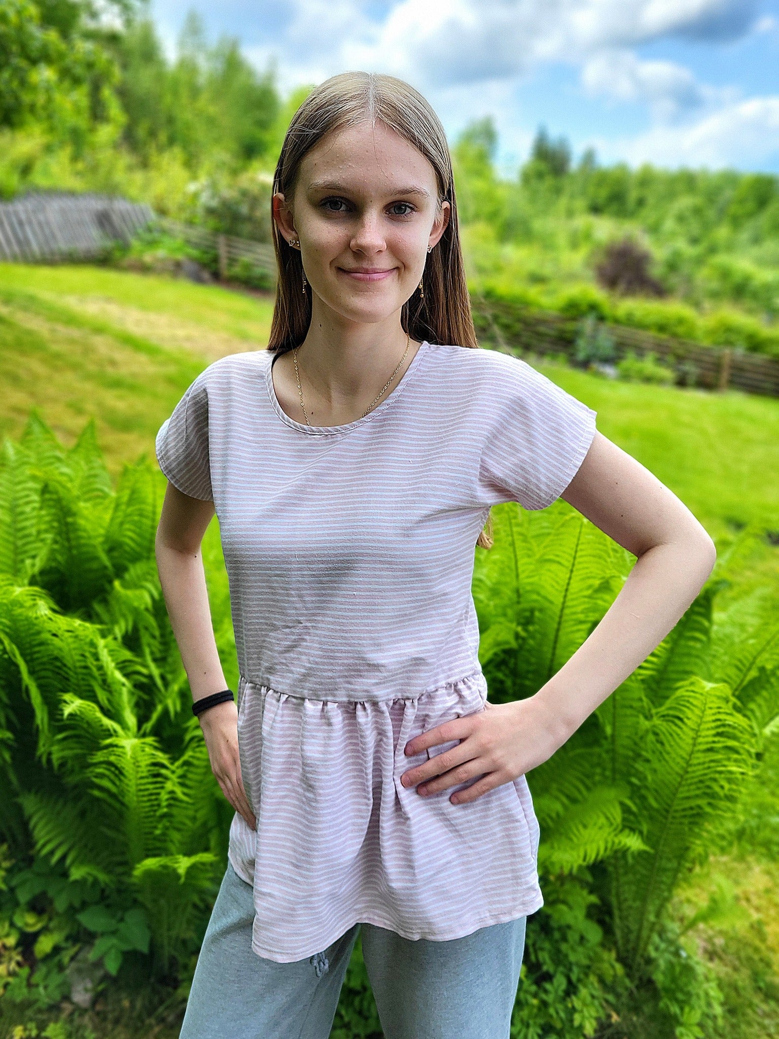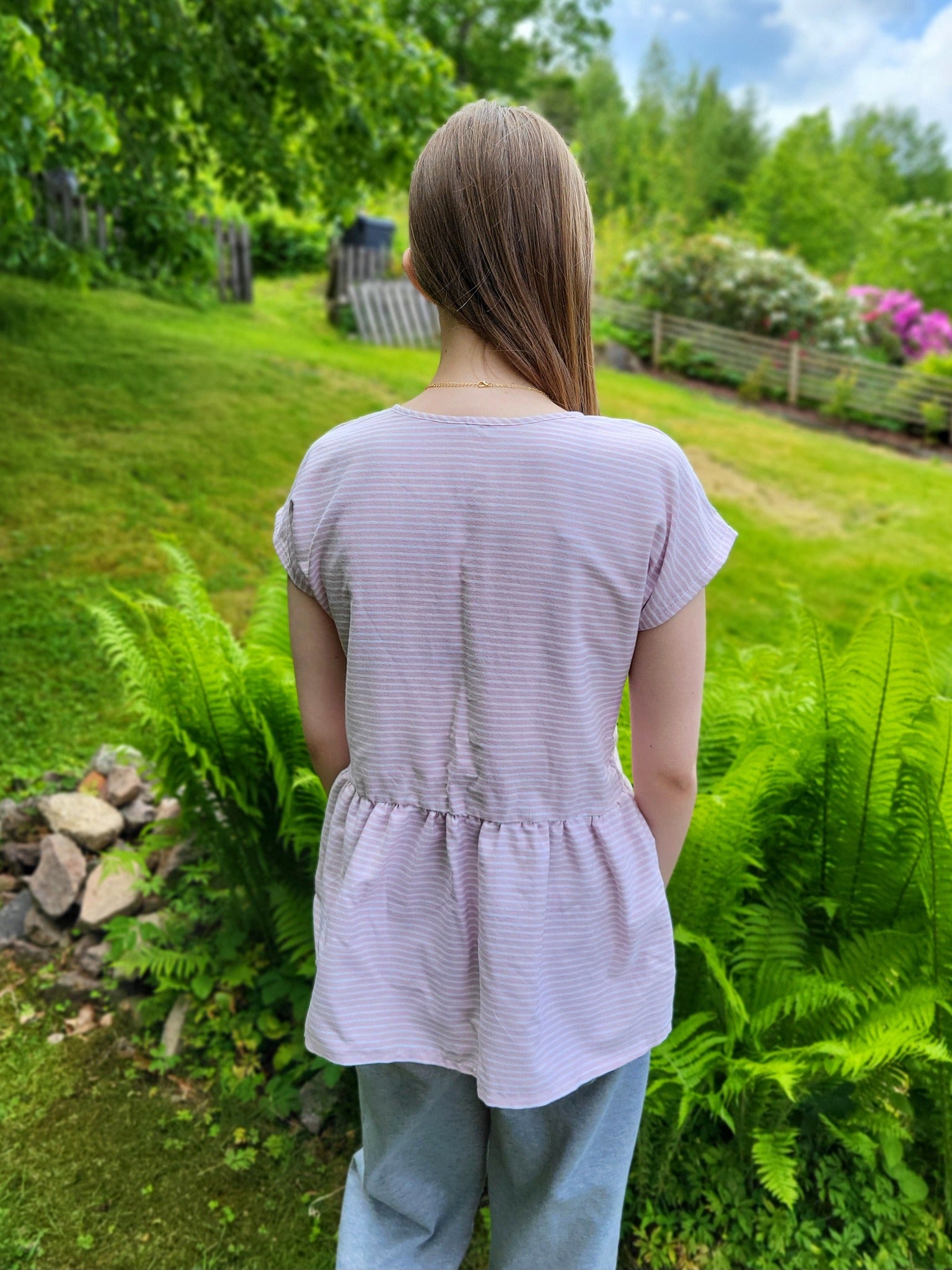 Material och tillklippning: Denna modell kan sys i vävda eller stickade tyger, finast blir den i tunnare tyg med lite fall, exempelvis mjuka (pås)lakan, viscose, tunnare (vanlig) jersey eller linne.