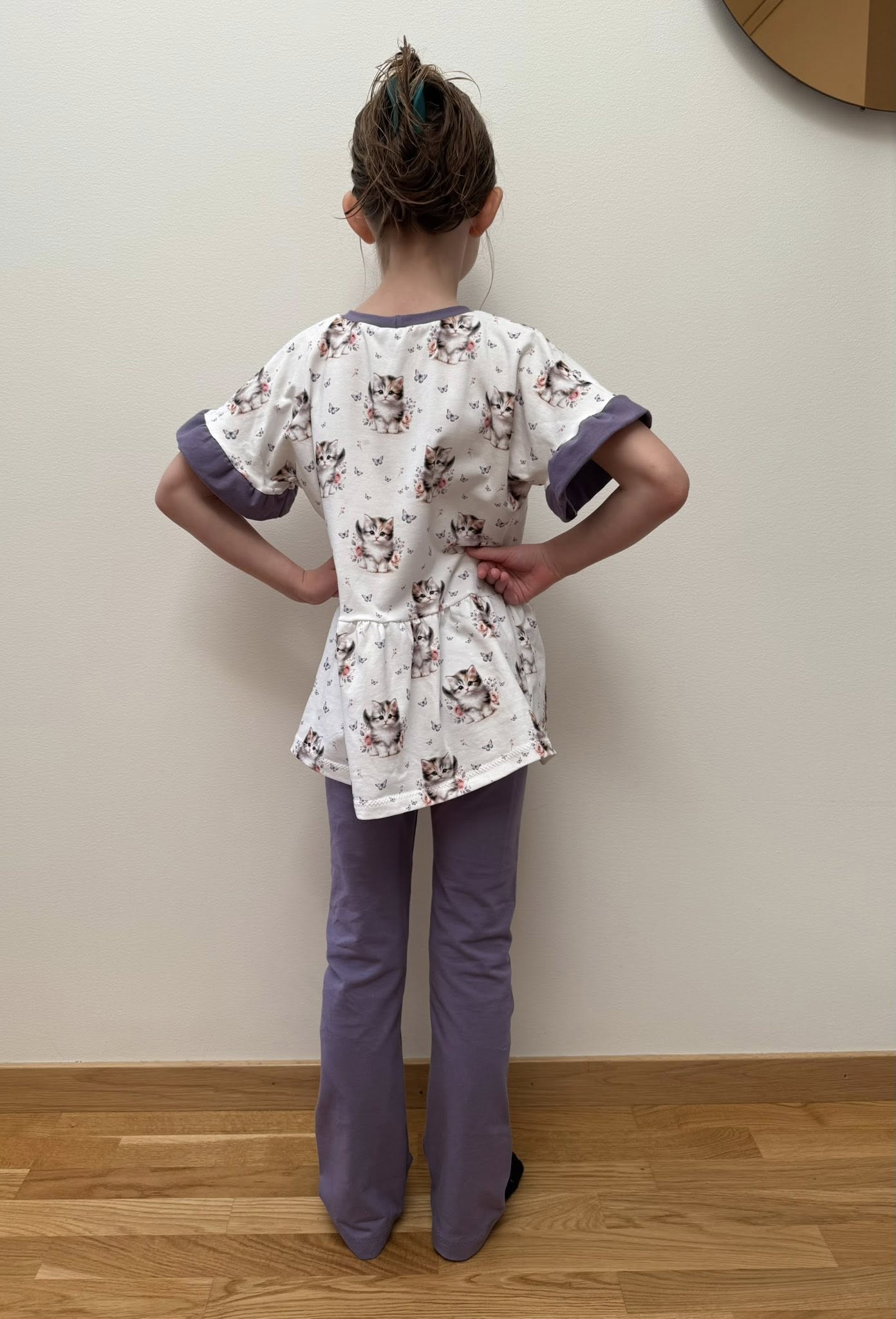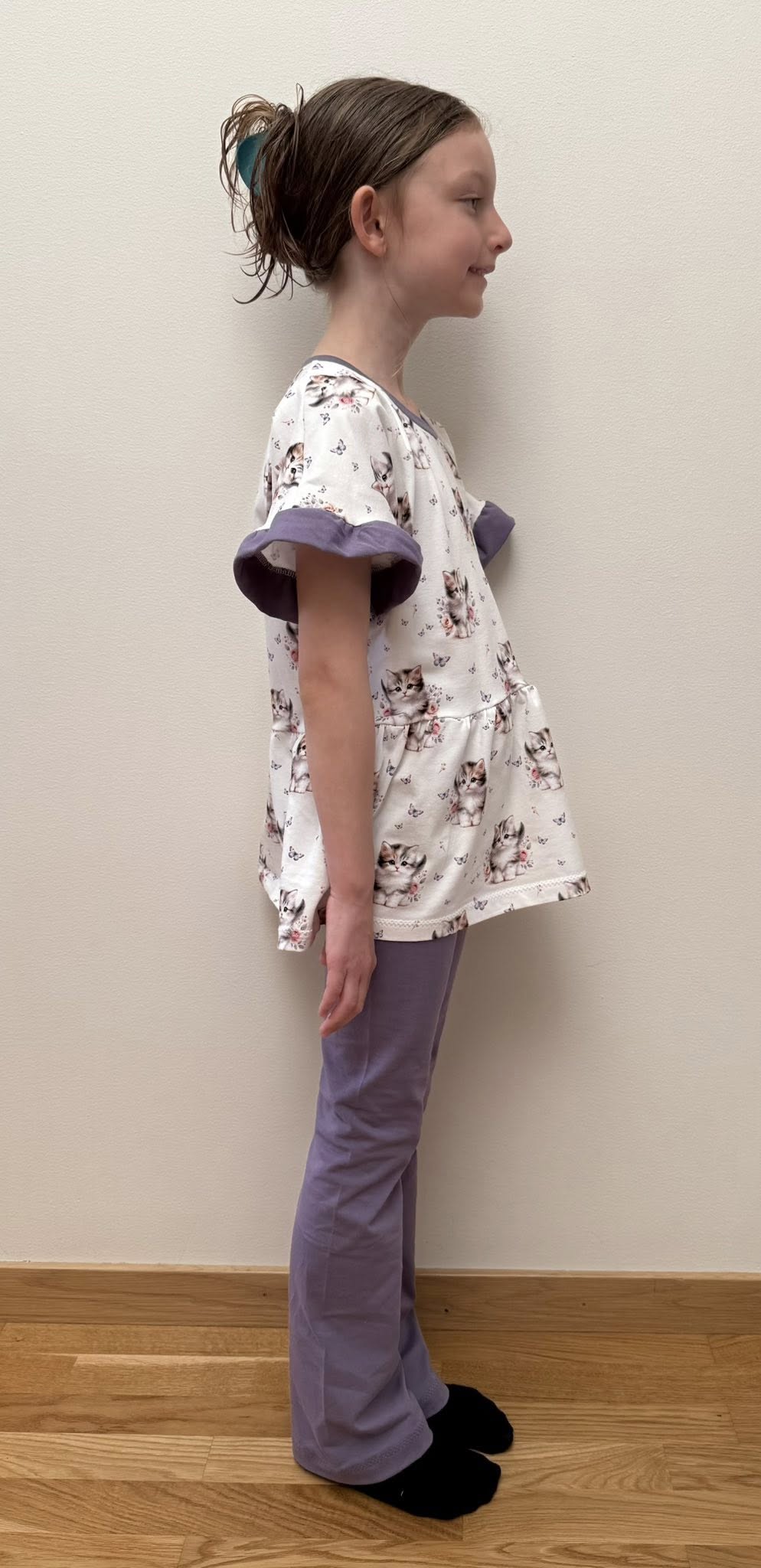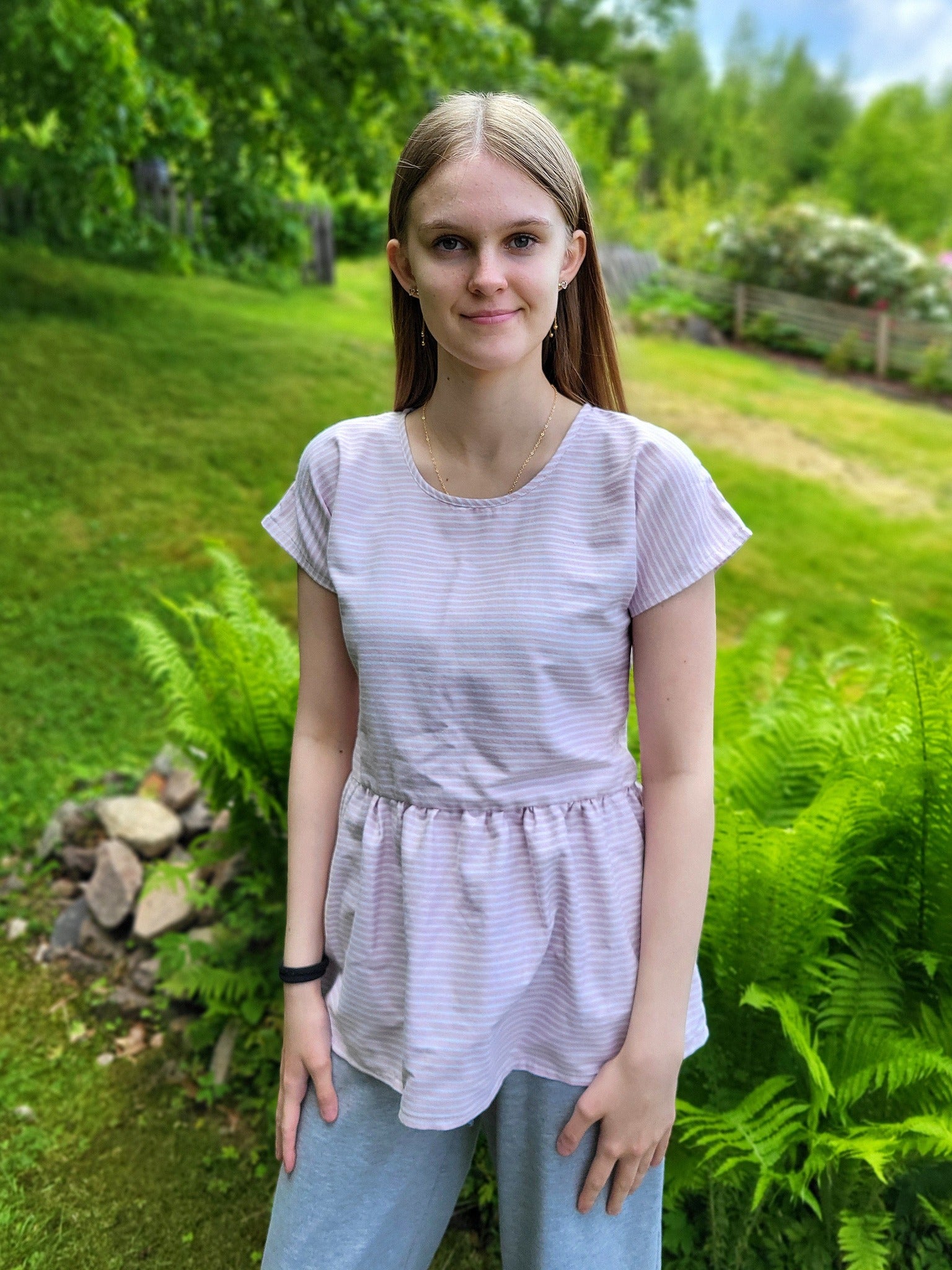 Material och tillklippning: Denna modell kan sys i vävda eller stickade tyger, finast blir den i tunnare tyg med lite fall, exempelvis mjuka (pås)lakan, viscose, tunnare (vanlig) jersey eller linne.