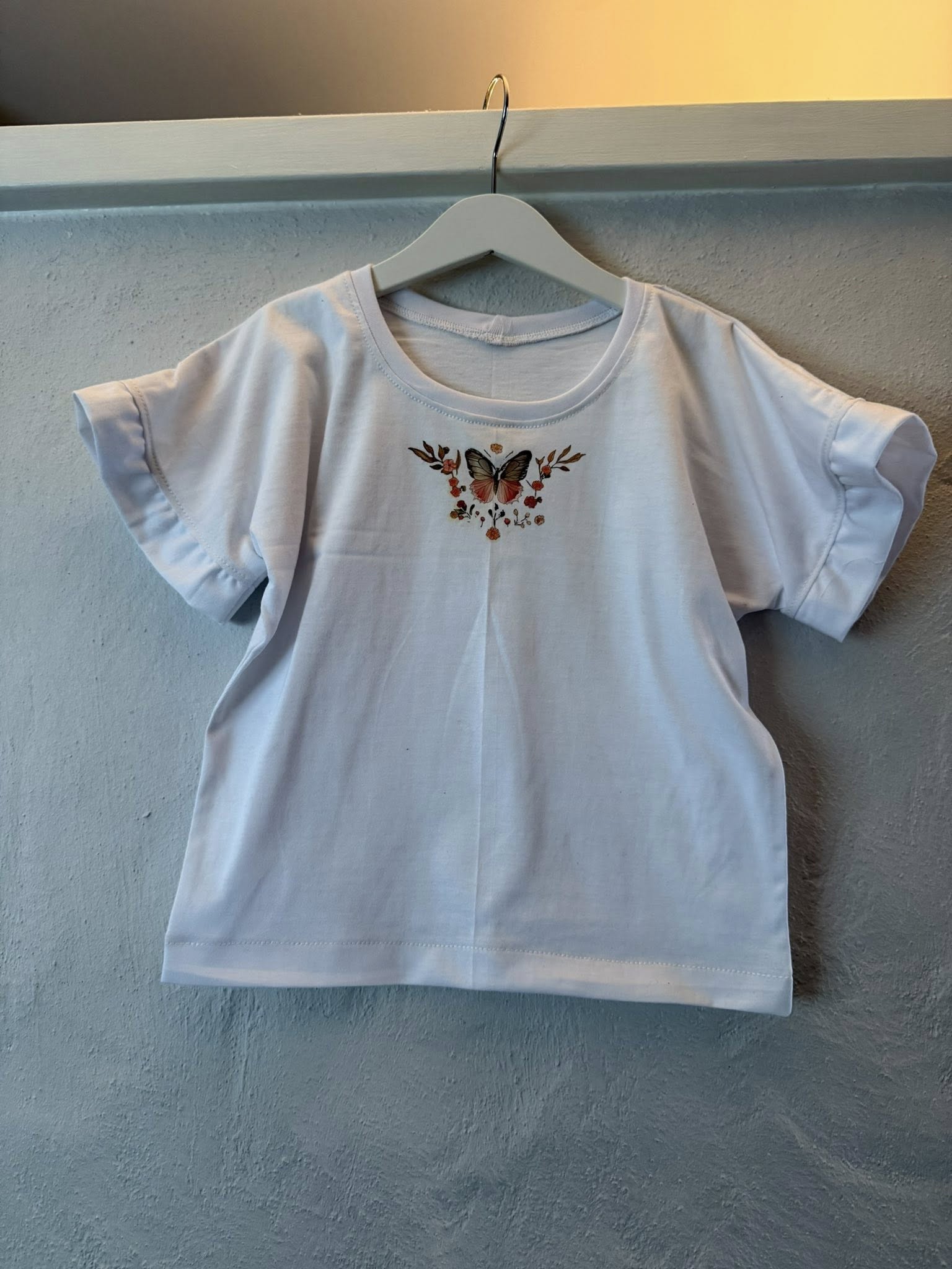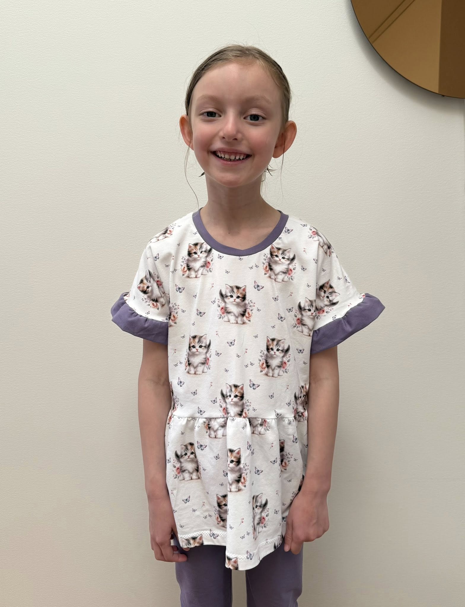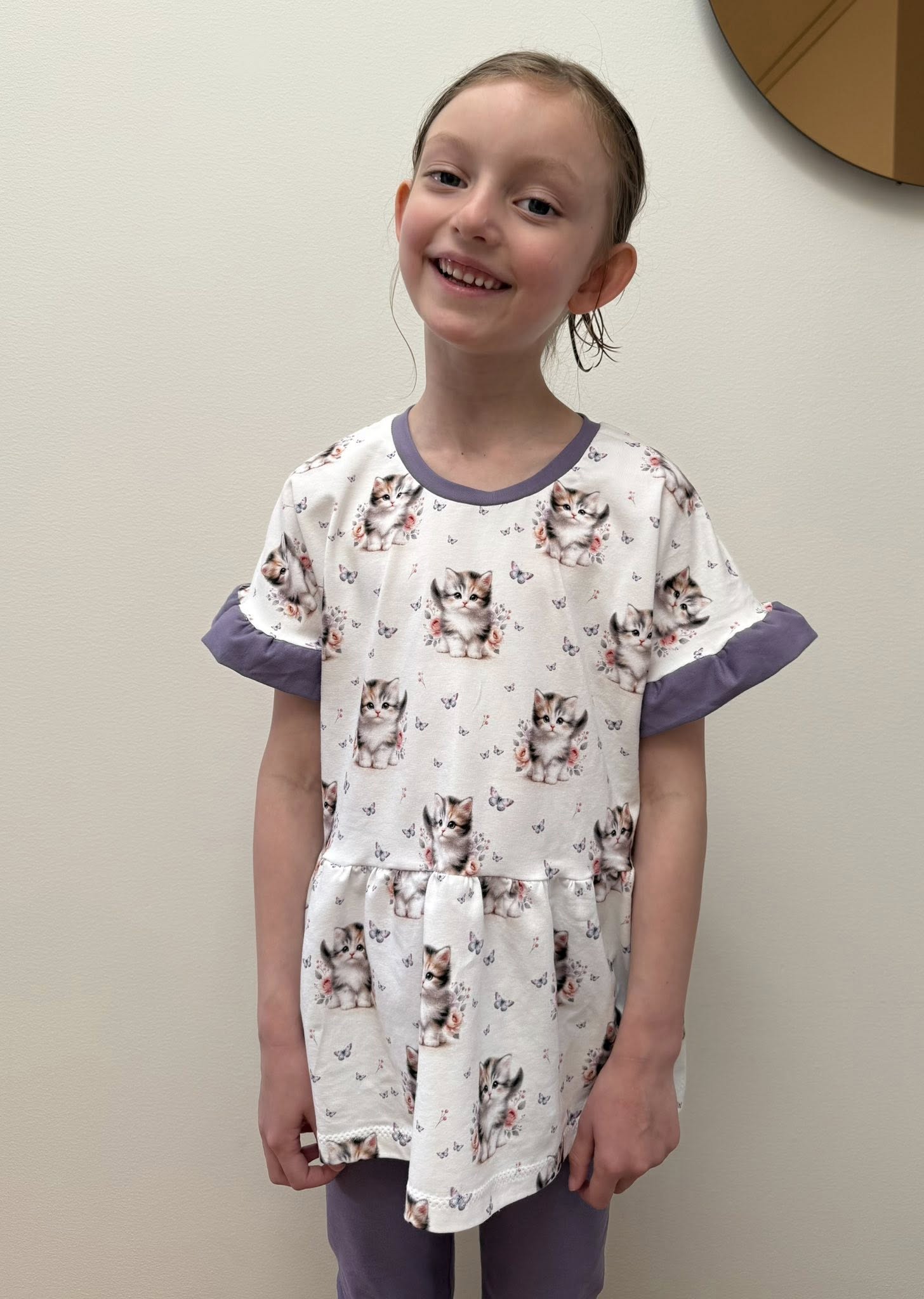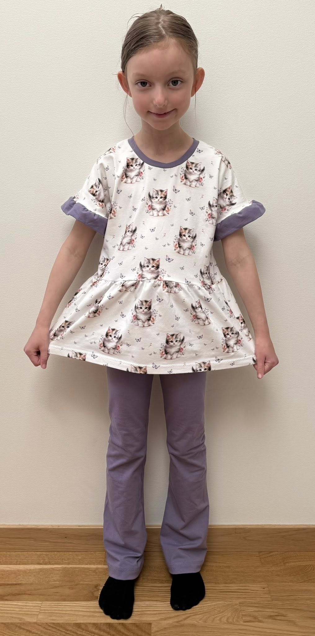 Material och tillklippning: Denna modell kan sys i vävda eller stickade tyger, finast blir den i tunnare tyg med lite fall, exempelvis mjuka (pås)lakan, viscose, tunnare (vanlig) jersey eller linne.
