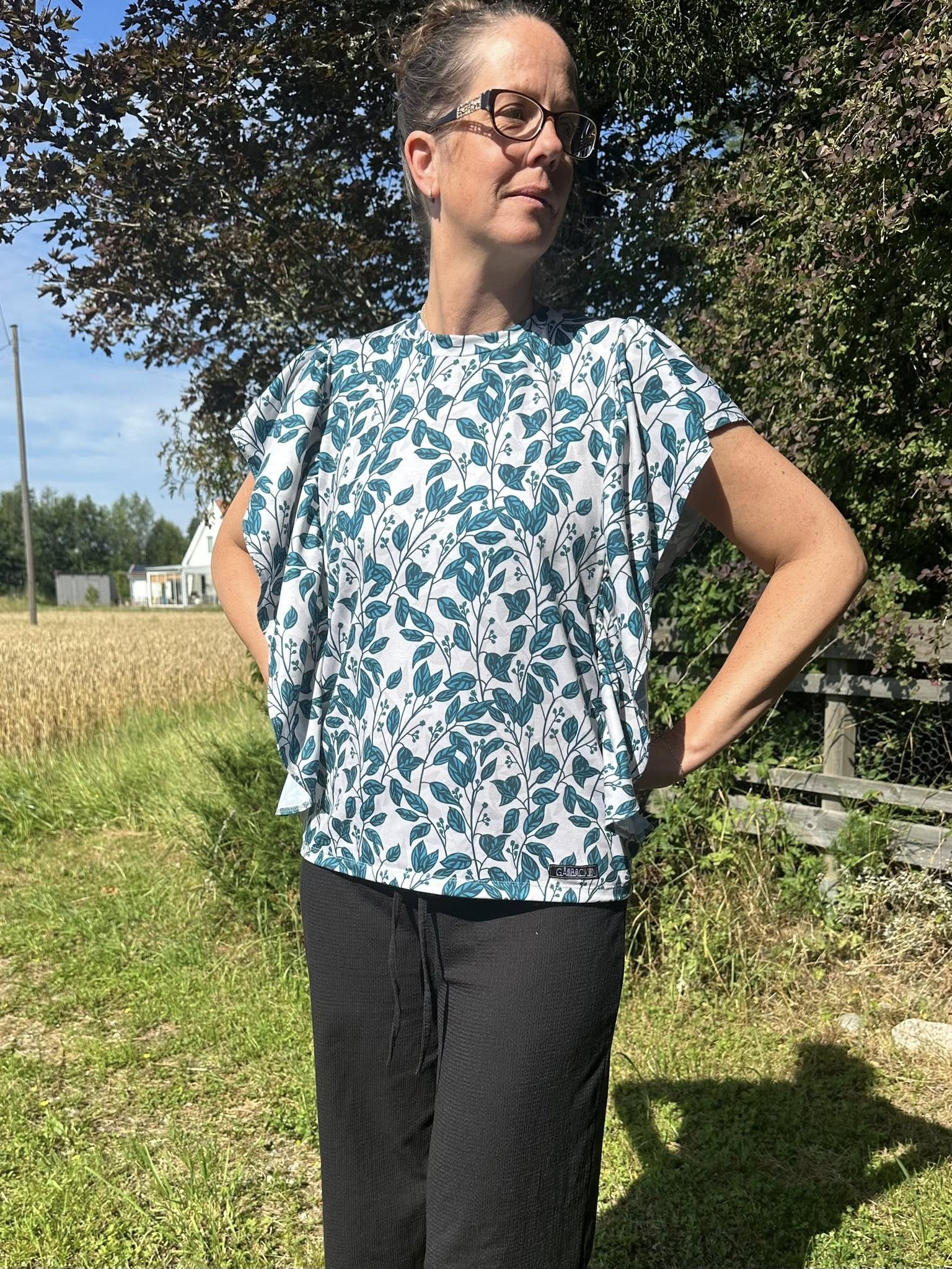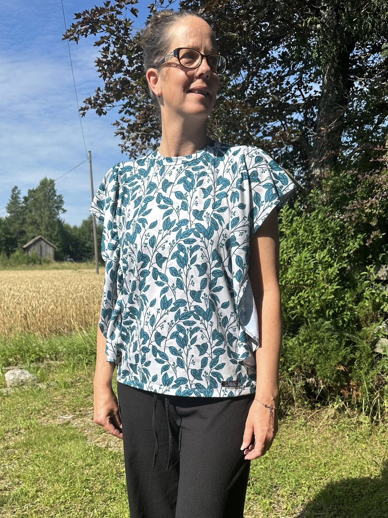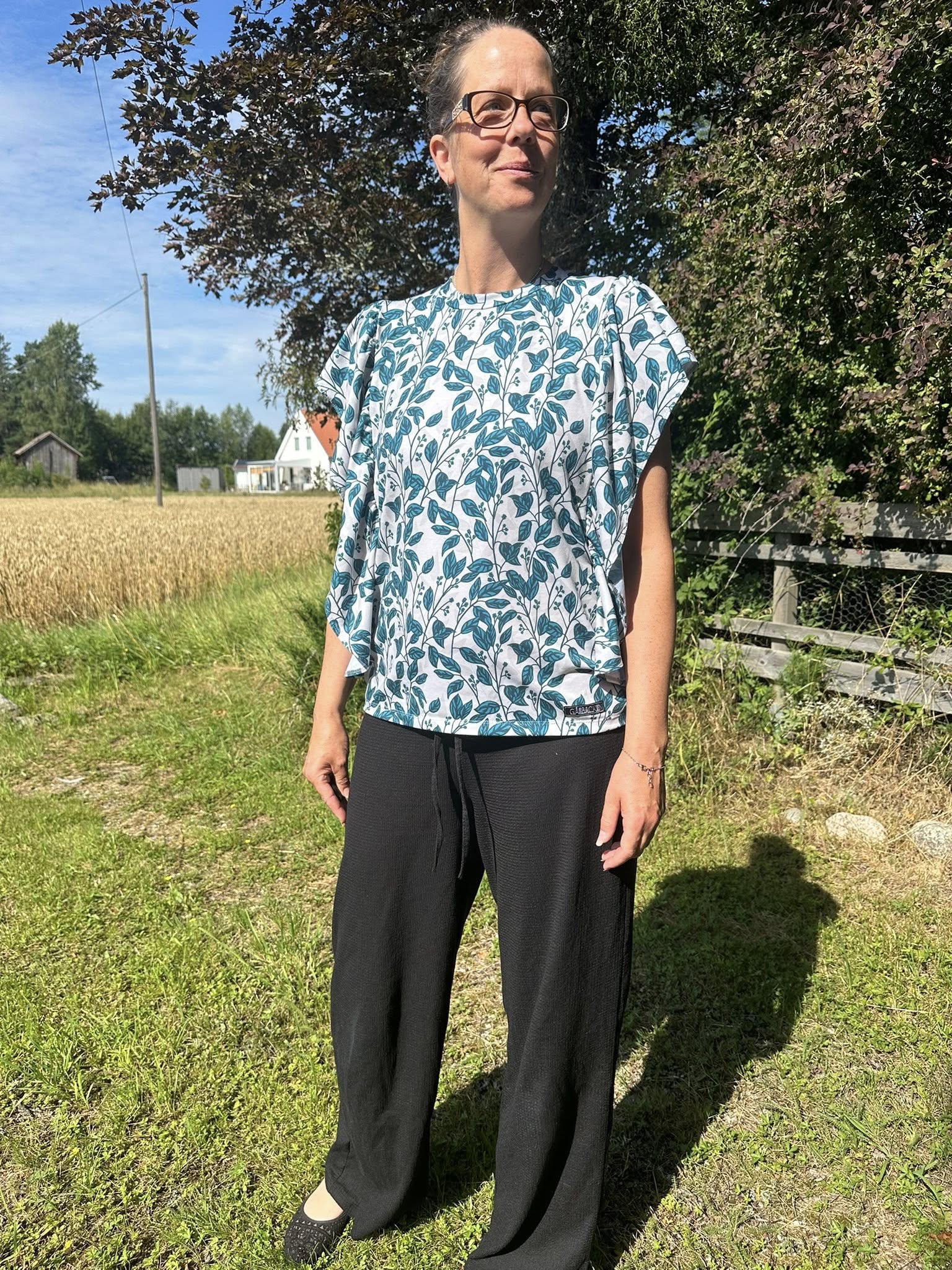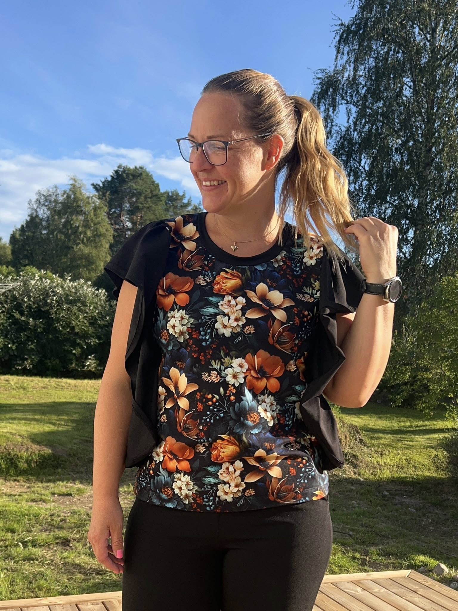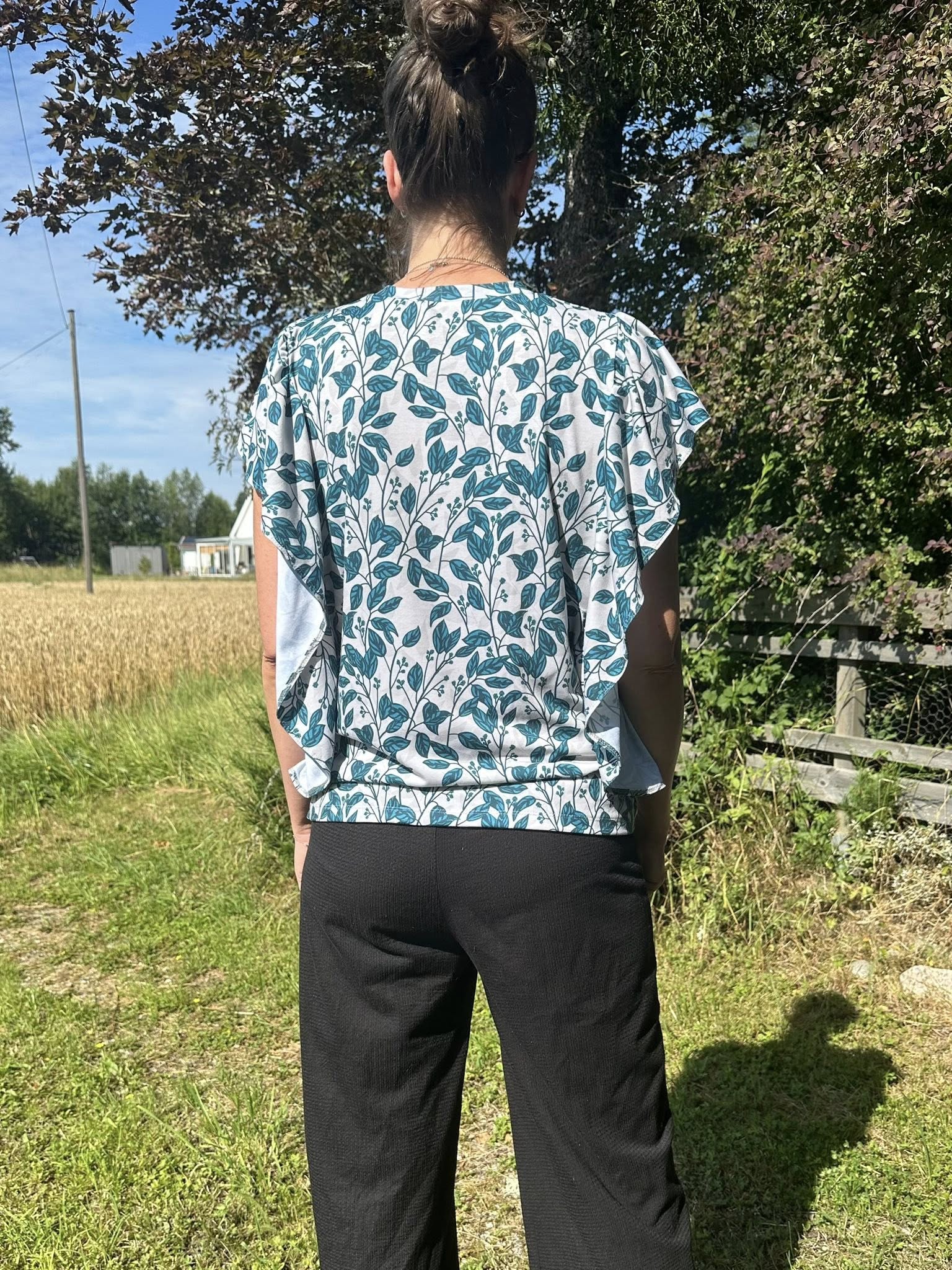 Material och tillklippning: Modellen är tänkt att sy i följsam trikå/jersey, viscosejersey, bambuviscose, apellajersey eller liknande material med stretch men inte alltför tunt samt en liten bit mudd till halsringningen. Vid sömnad utan volang tillkommer även kantband/mudd att kanta ärmhålet med.