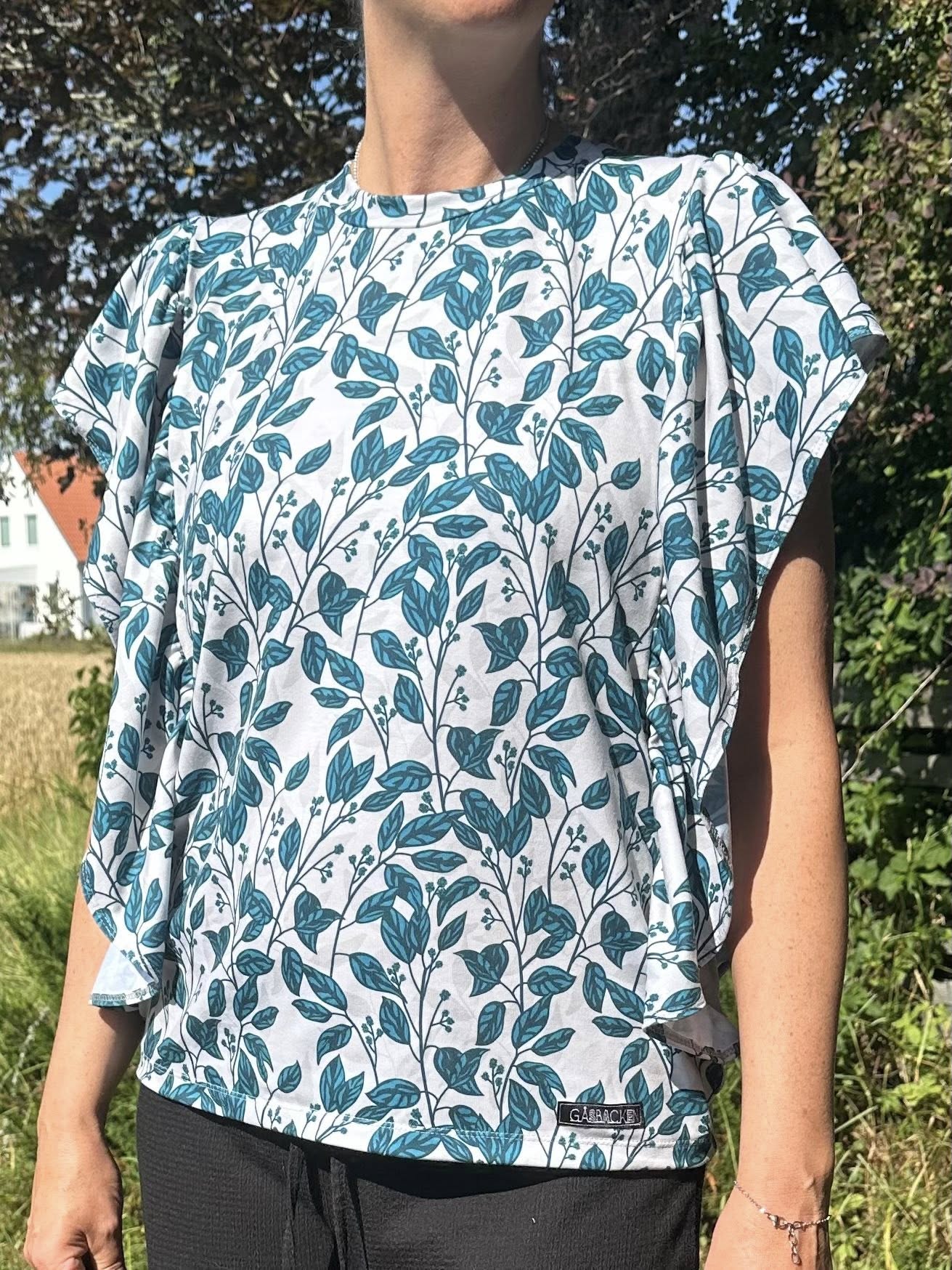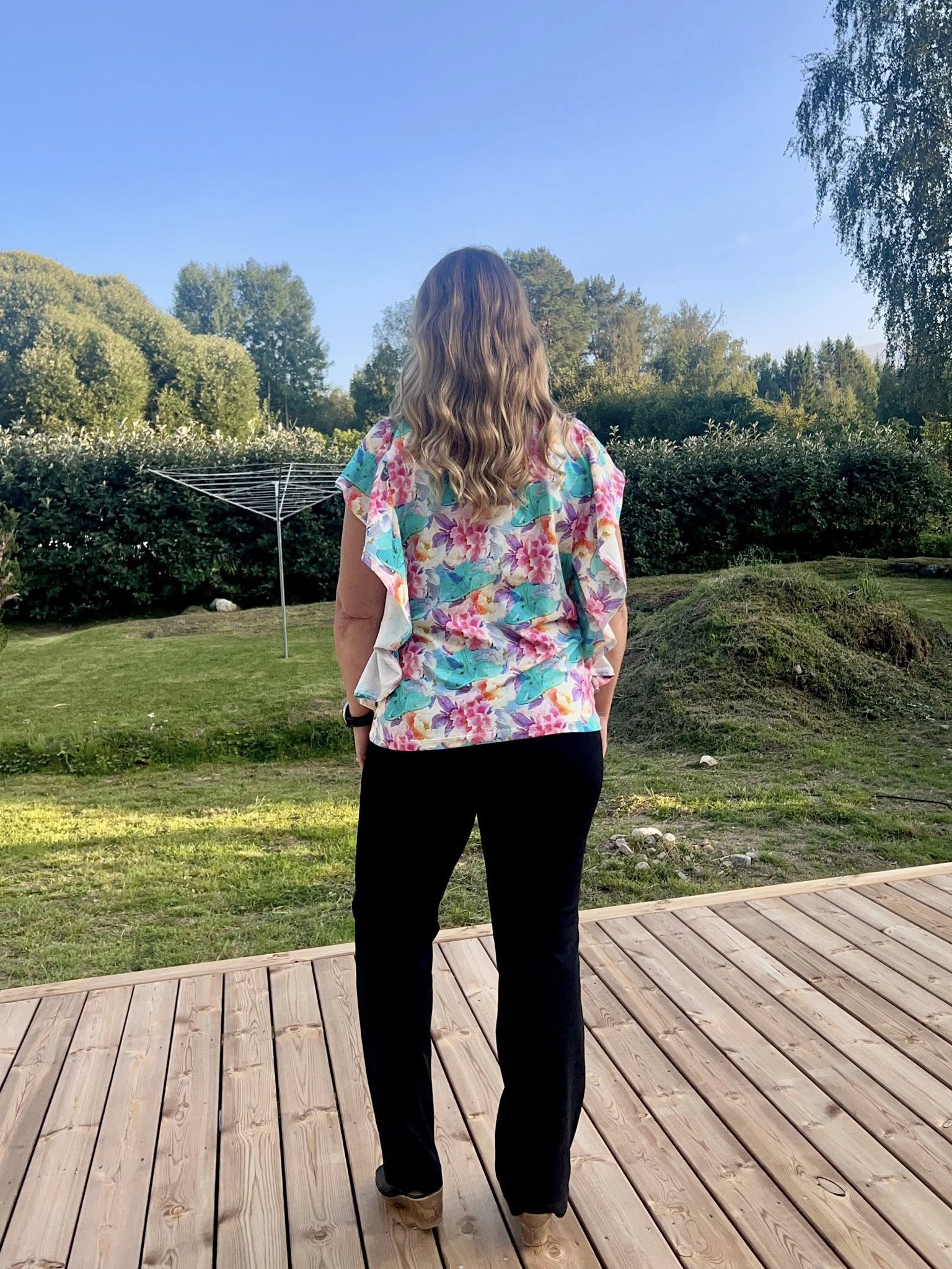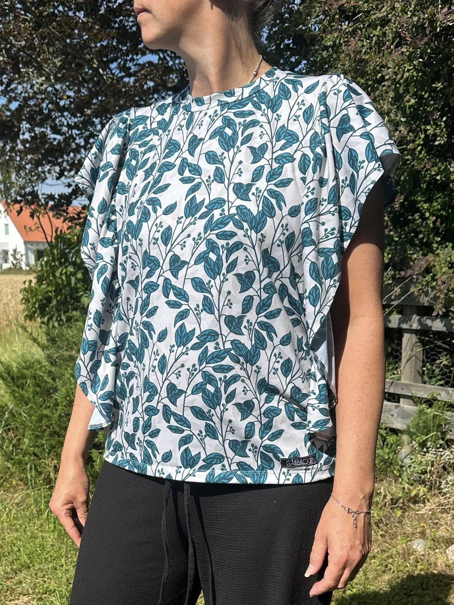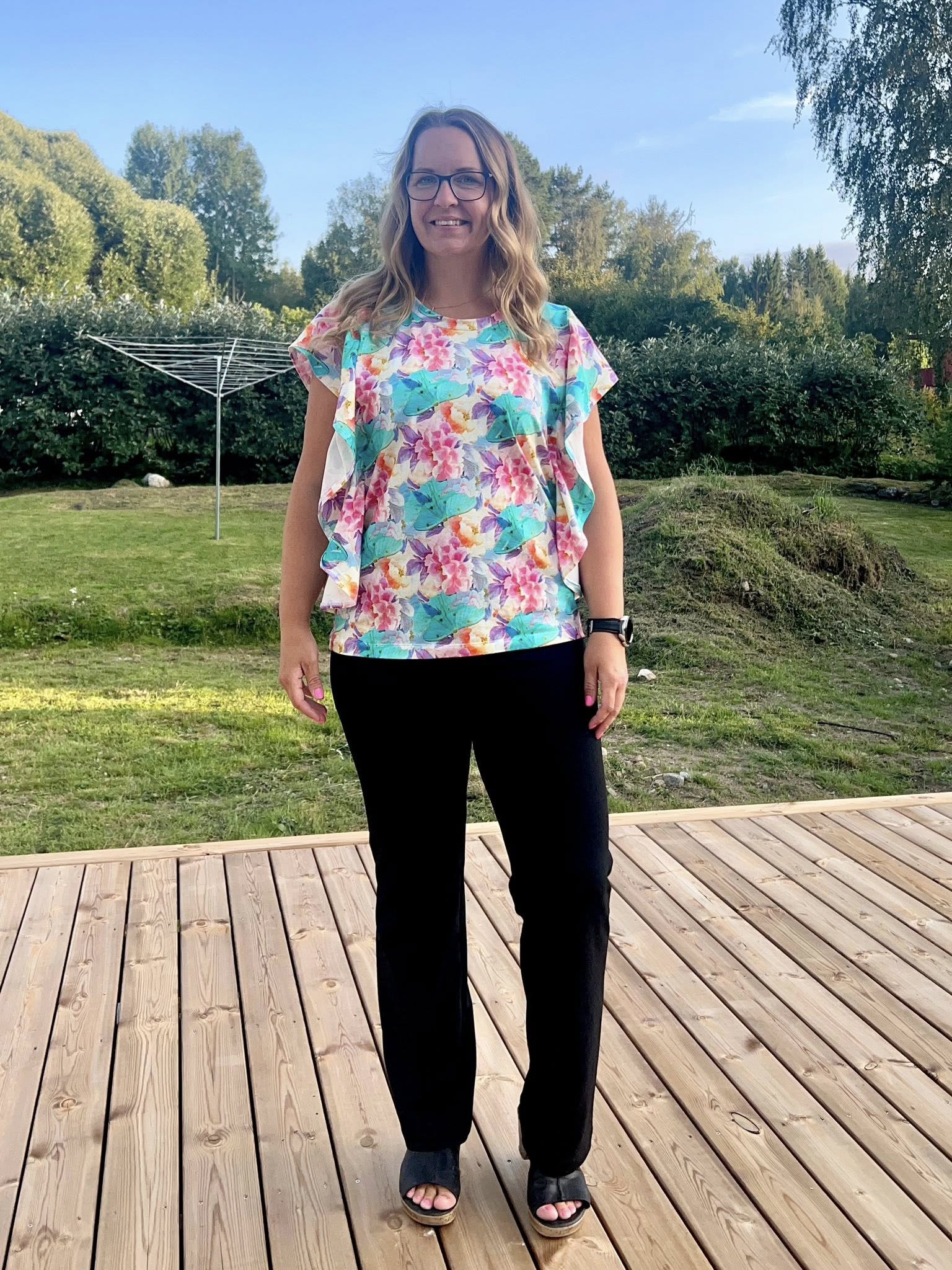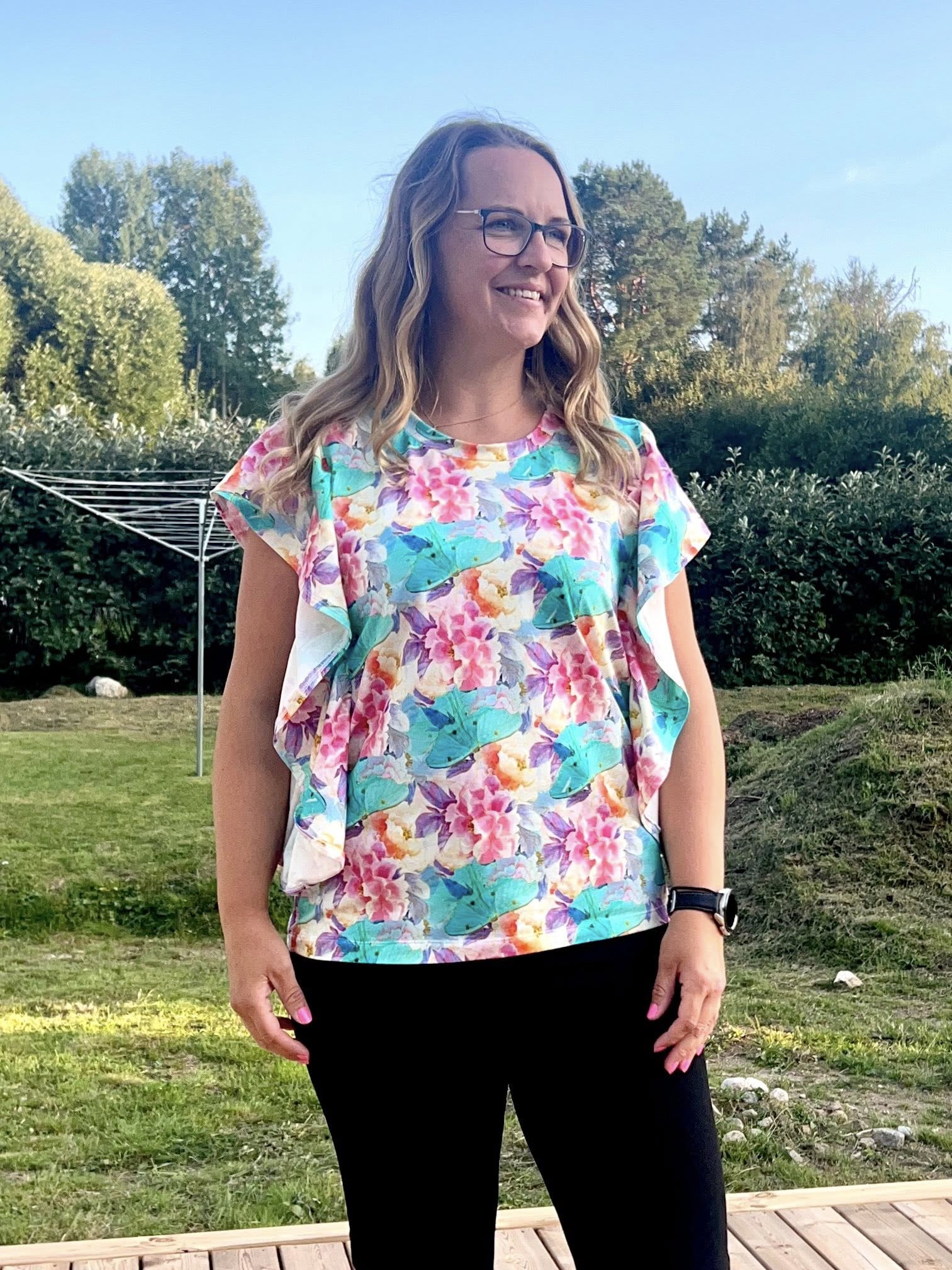 Material och tillklippning: Modellen är tänkt att sy i följsam trikå/jersey, viscosejersey, bambuviscose, apellajersey eller liknande material med stretch men inte alltför tunt samt en liten bit mudd till halsringningen. Vid sömnad utan volang tillkommer även kantband/mudd att kanta ärmhålet med.