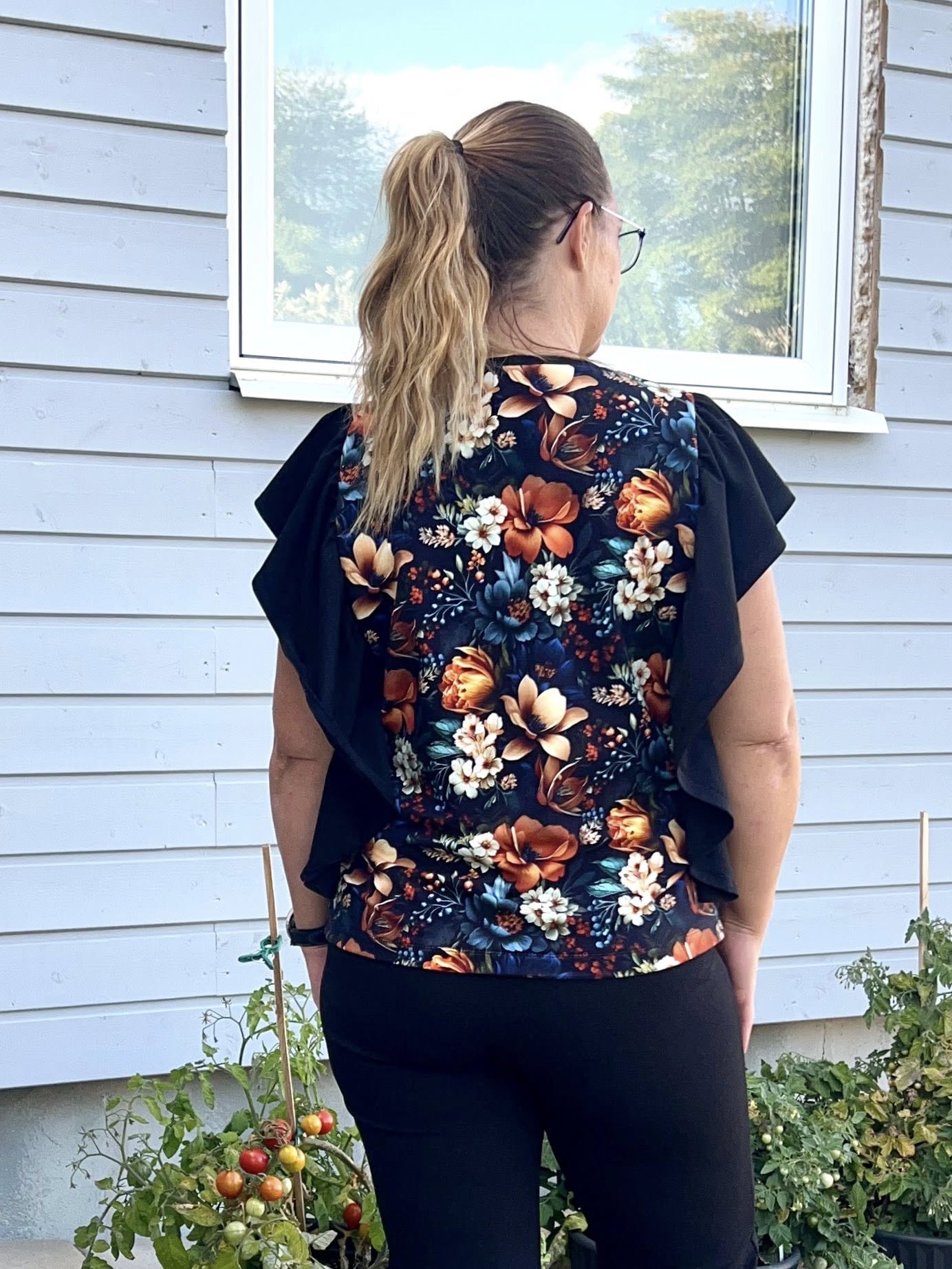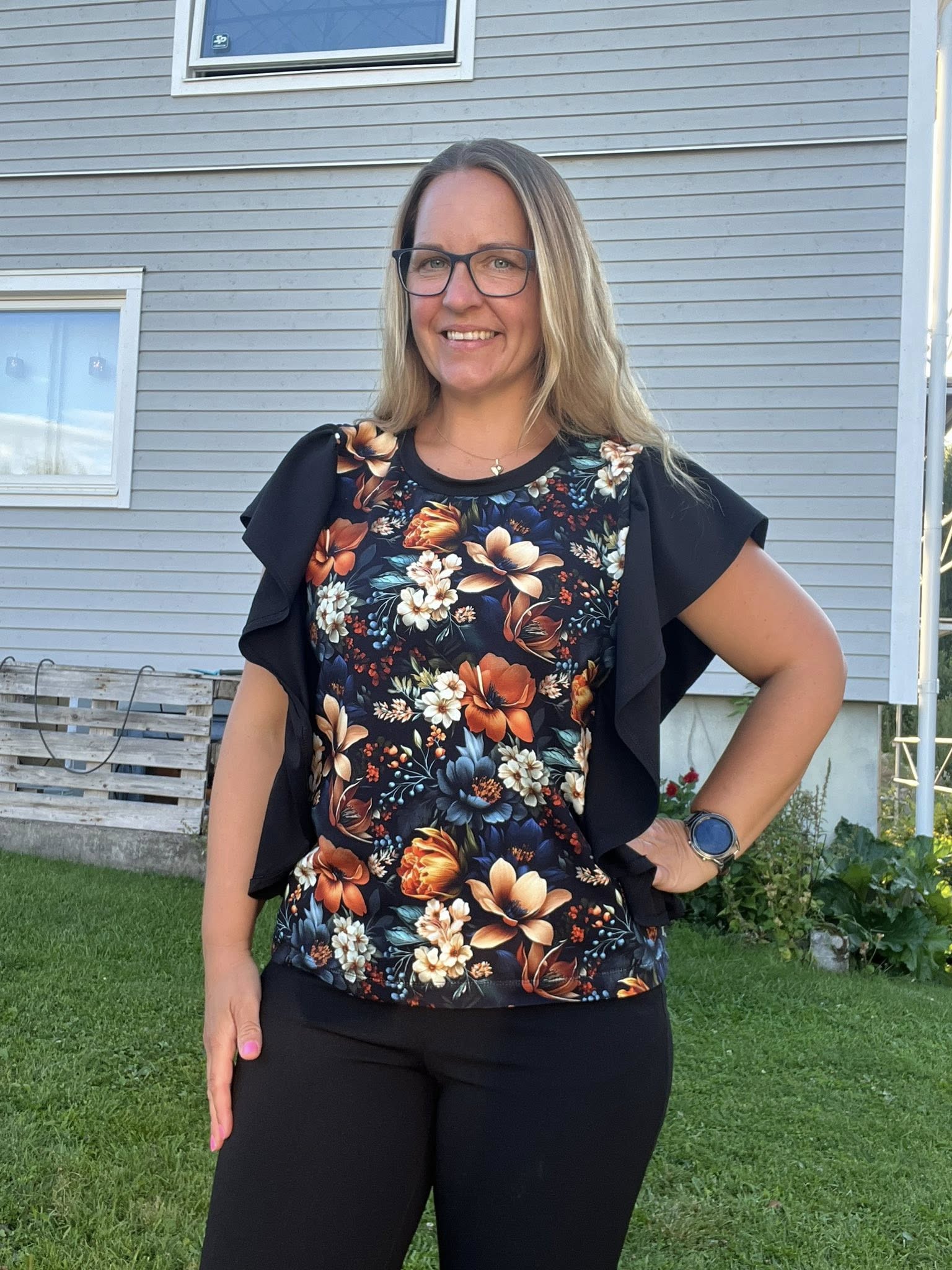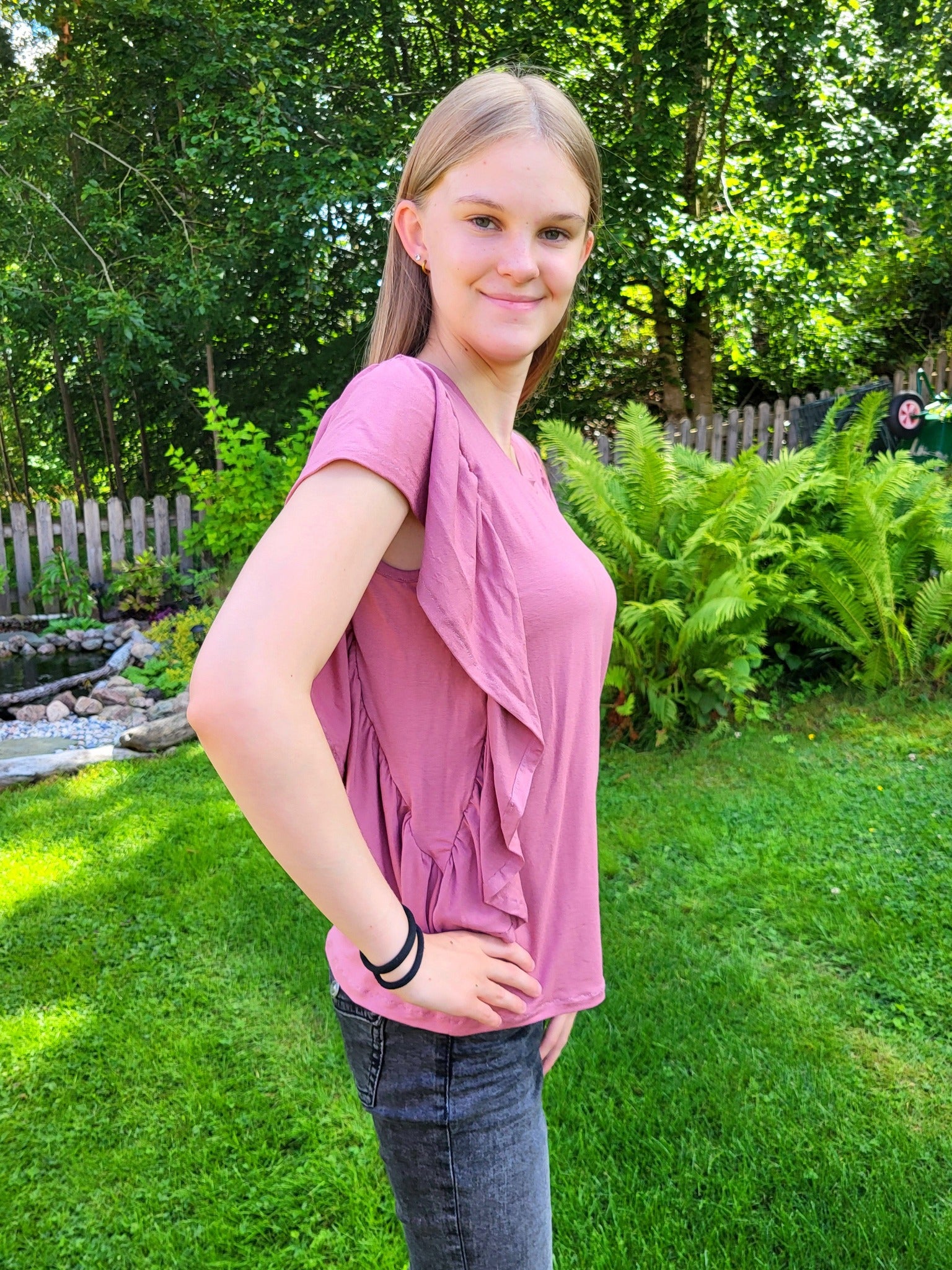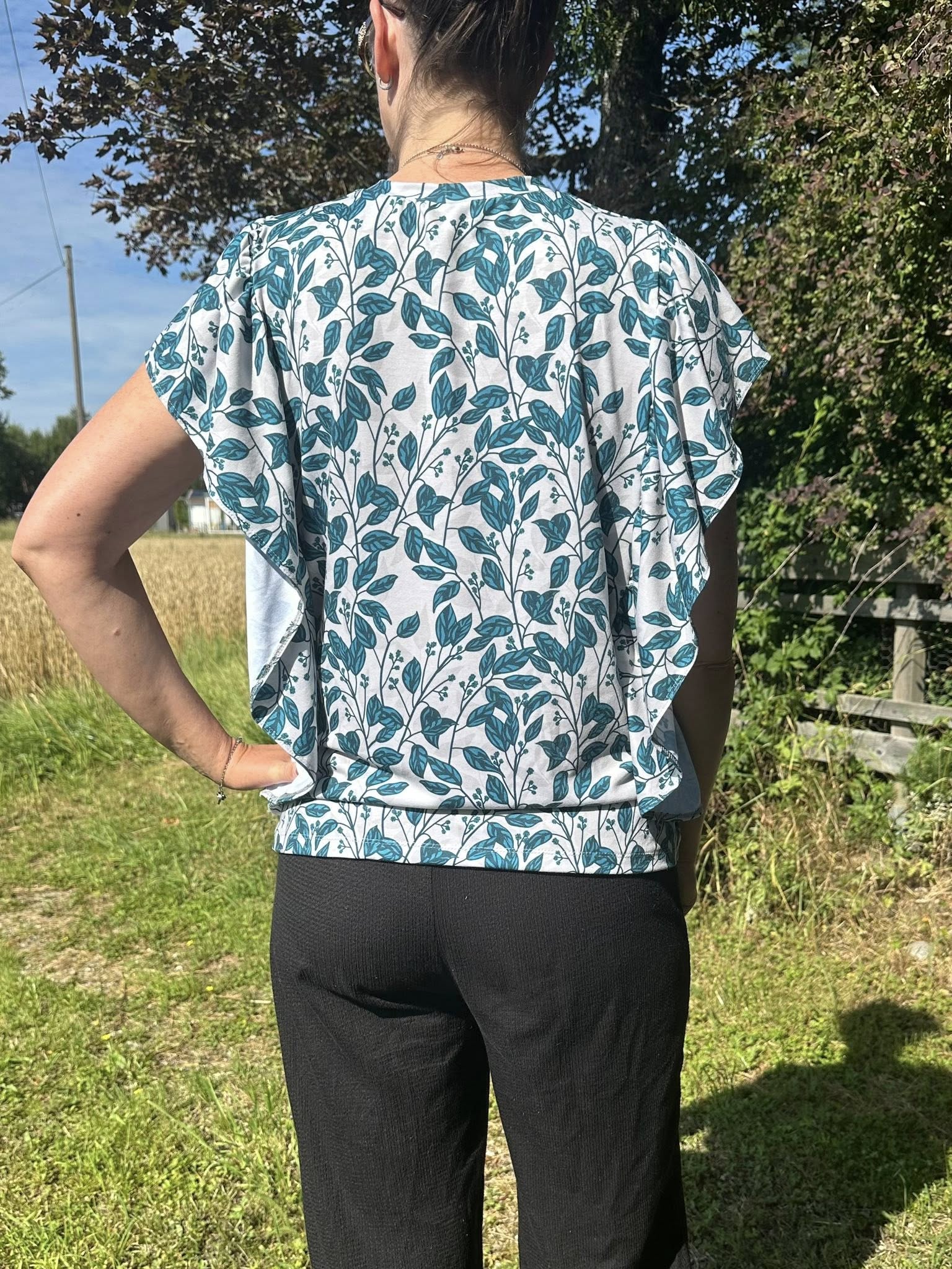 Material och tillklippning: Modellen är tänkt att sy i följsam trikå/jersey, viscosejersey, bambuviscose, apellajersey eller liknande material med stretch men inte alltför tunt samt en liten bit mudd till halsringningen. Vid sömnad utan volang tillkommer även kantband/mudd att kanta ärmhålet med.