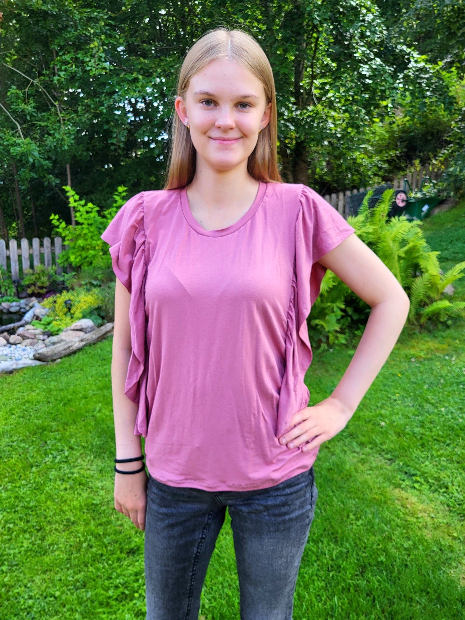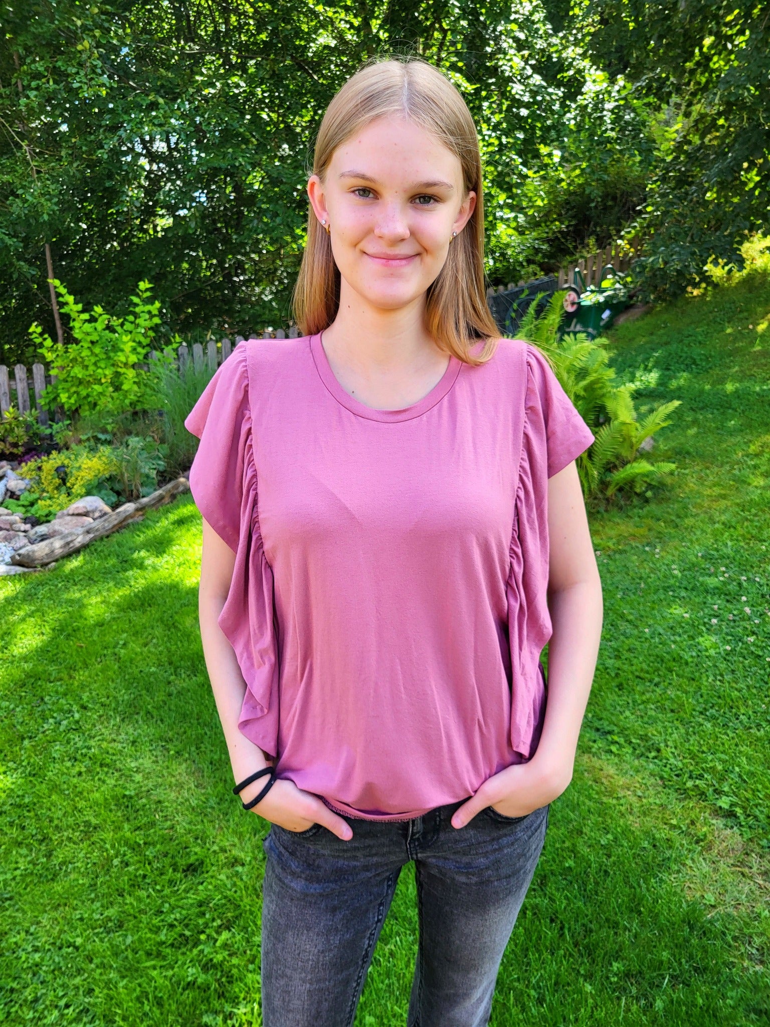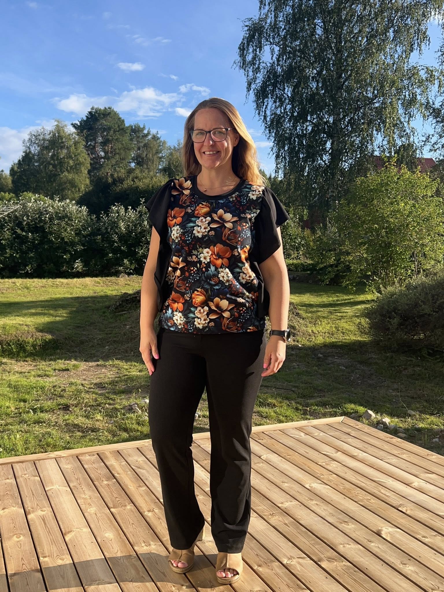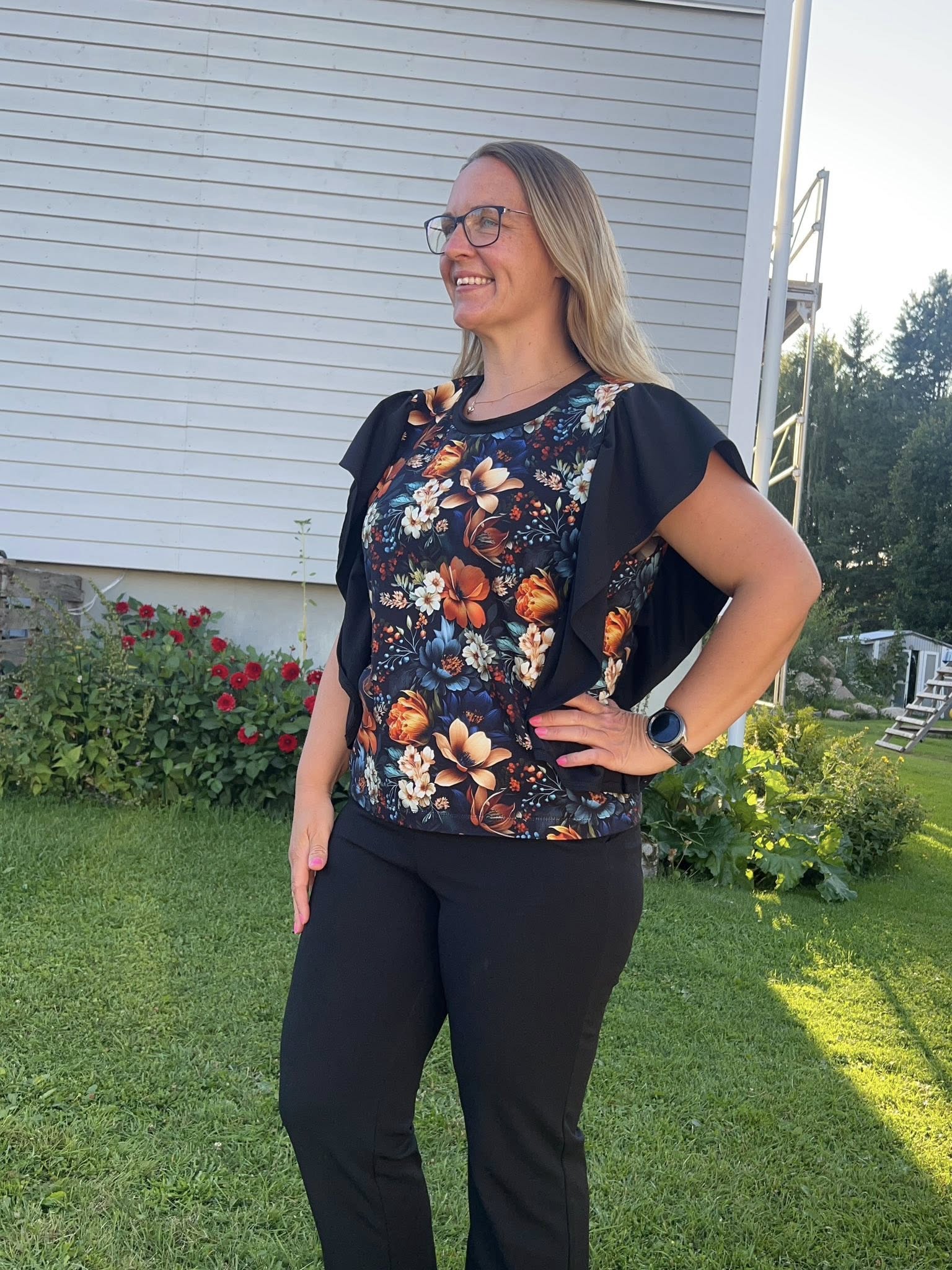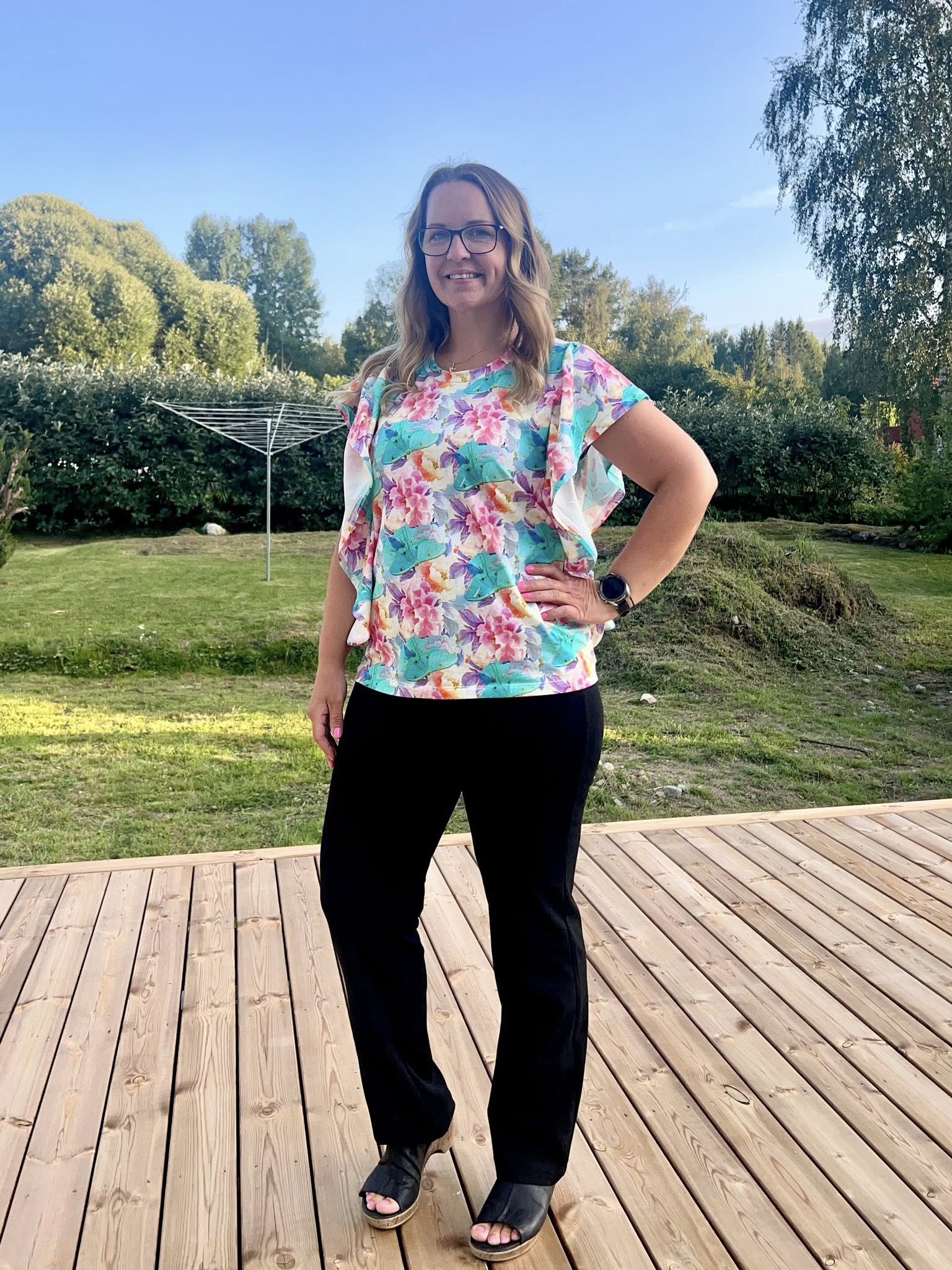 Material och tillklippning: Modellen är tänkt att sy i följsam trikå/jersey, viscosejersey, bambuviscose, apellajersey eller liknande material med stretch men inte alltför tunt samt en liten bit mudd till halsringningen. Vid sömnad utan volang tillkommer även kantband/mudd att kanta ärmhålet med.