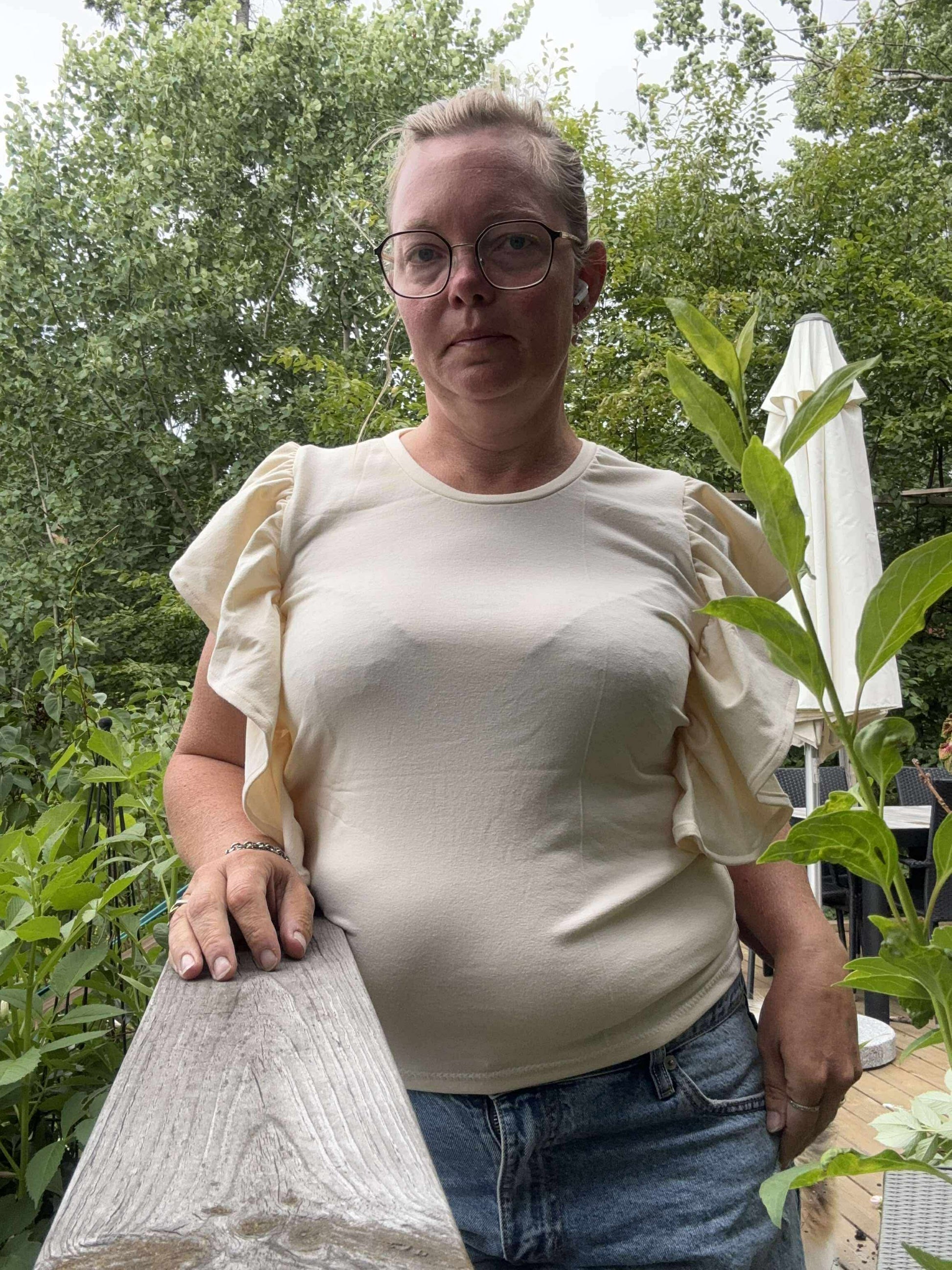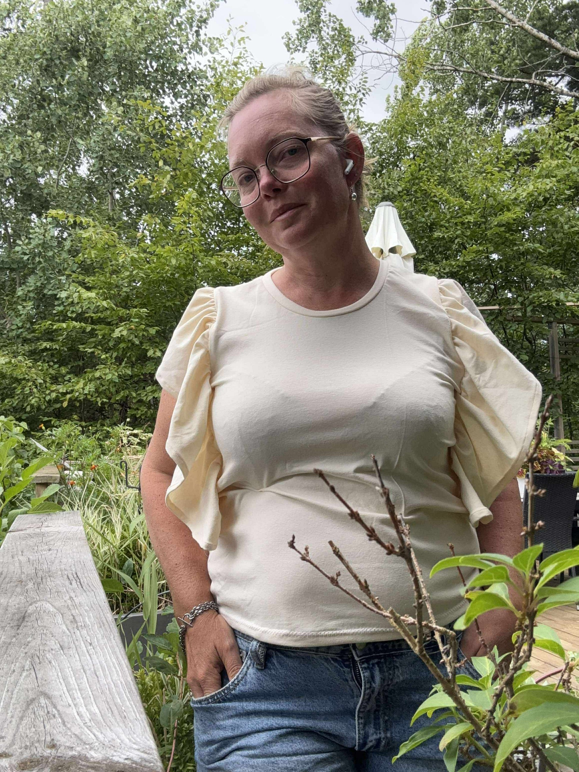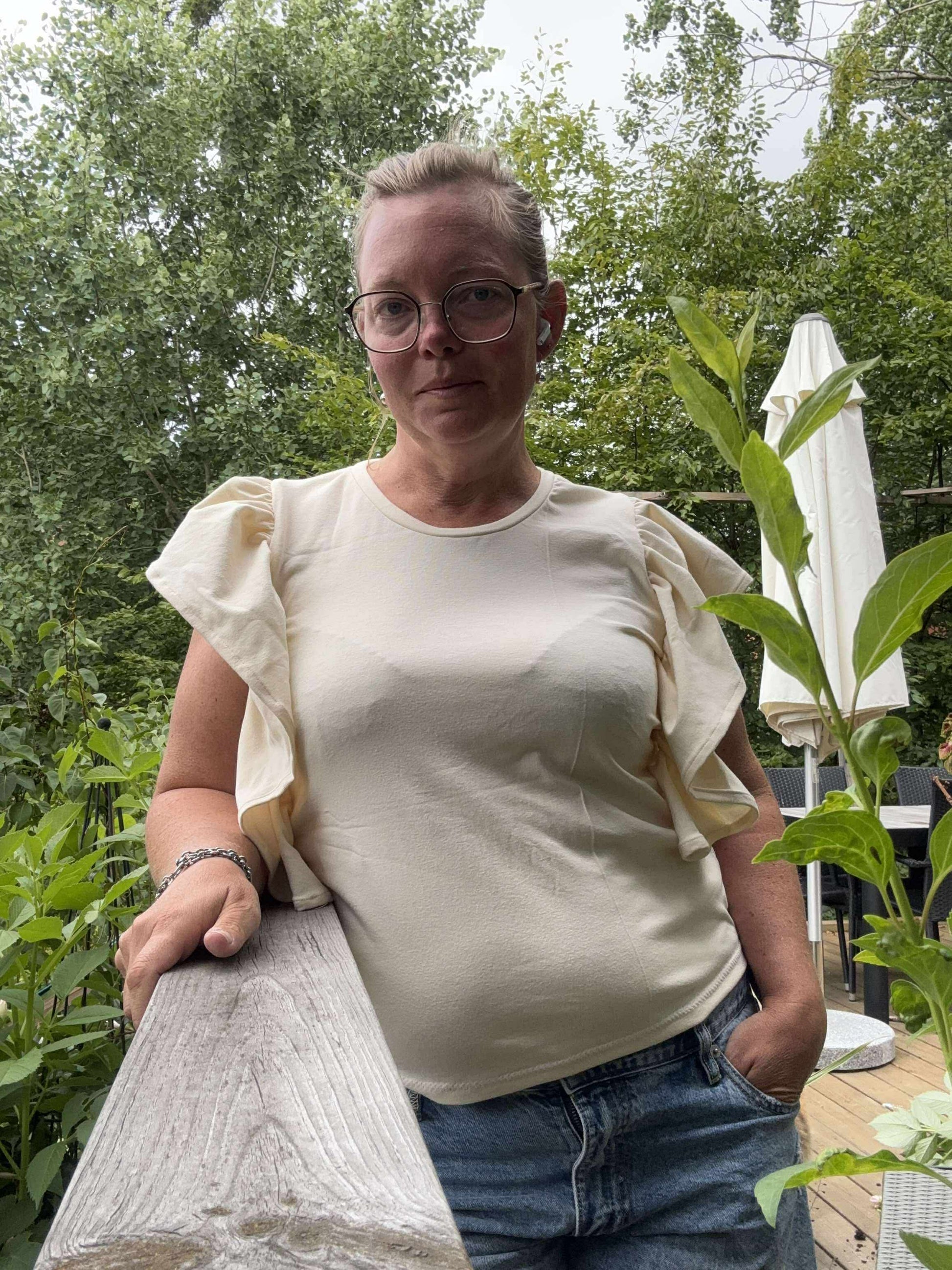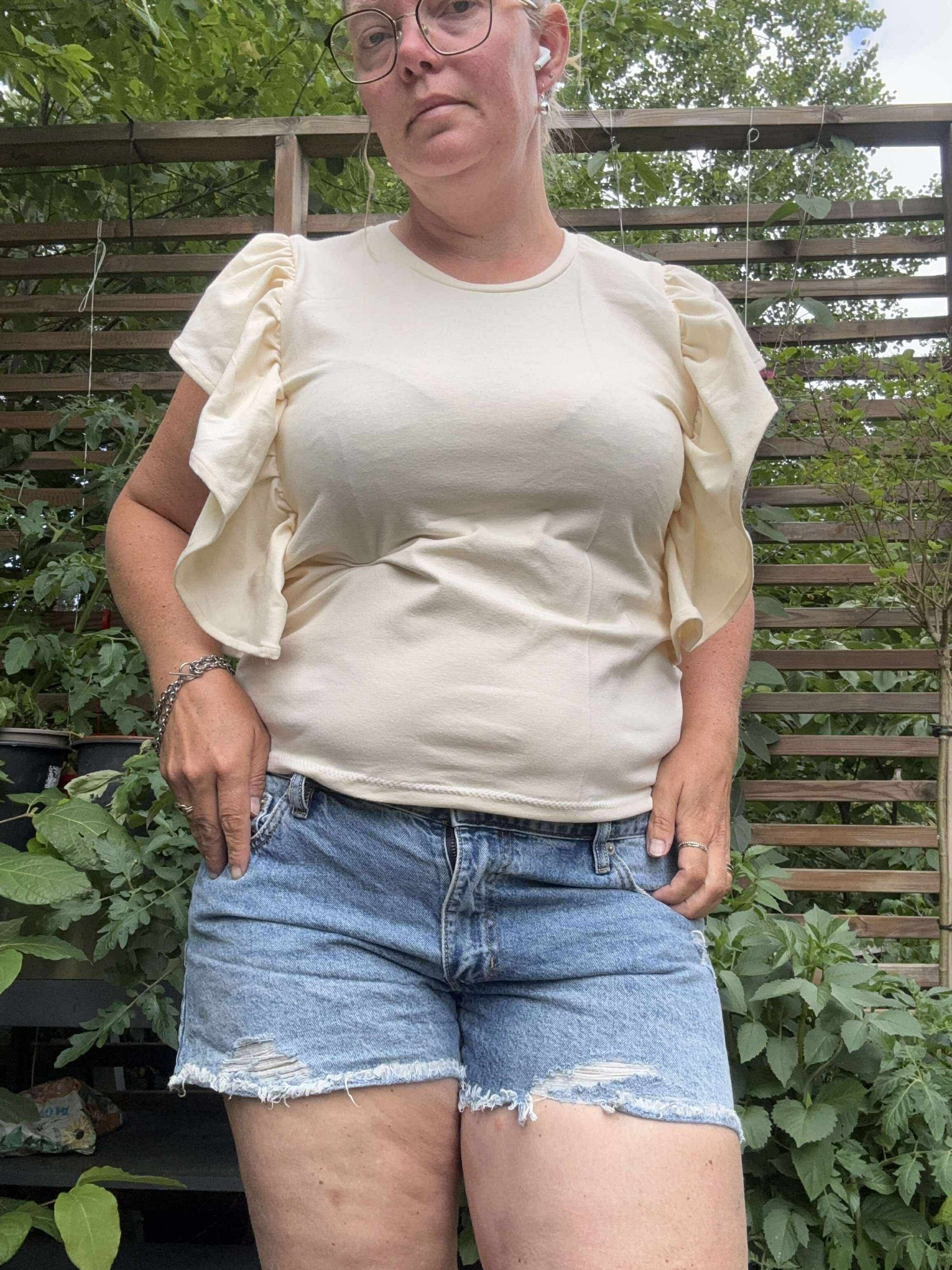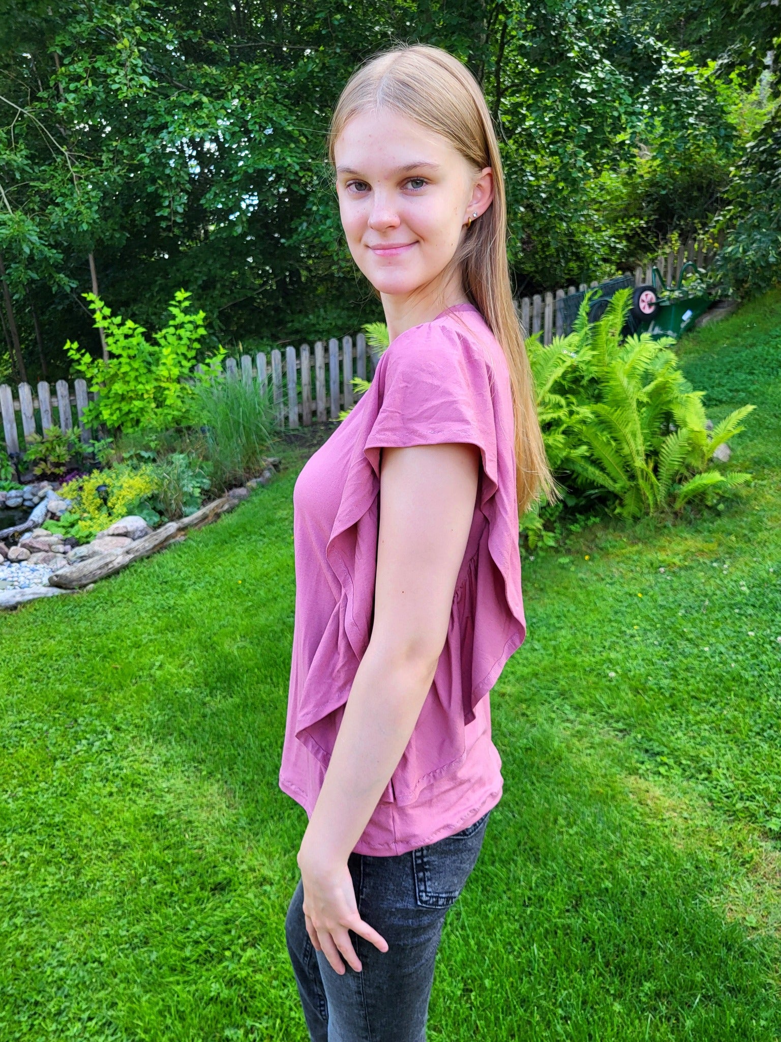 Material och tillklippning: Modellen är tänkt att sy i följsam trikå/jersey, viscosejersey, bambuviscose, apellajersey eller liknande material med stretch men inte alltför tunt samt en liten bit mudd till halsringningen. Vid sömnad utan volang tillkommer även kantband/mudd att kanta ärmhålet med.