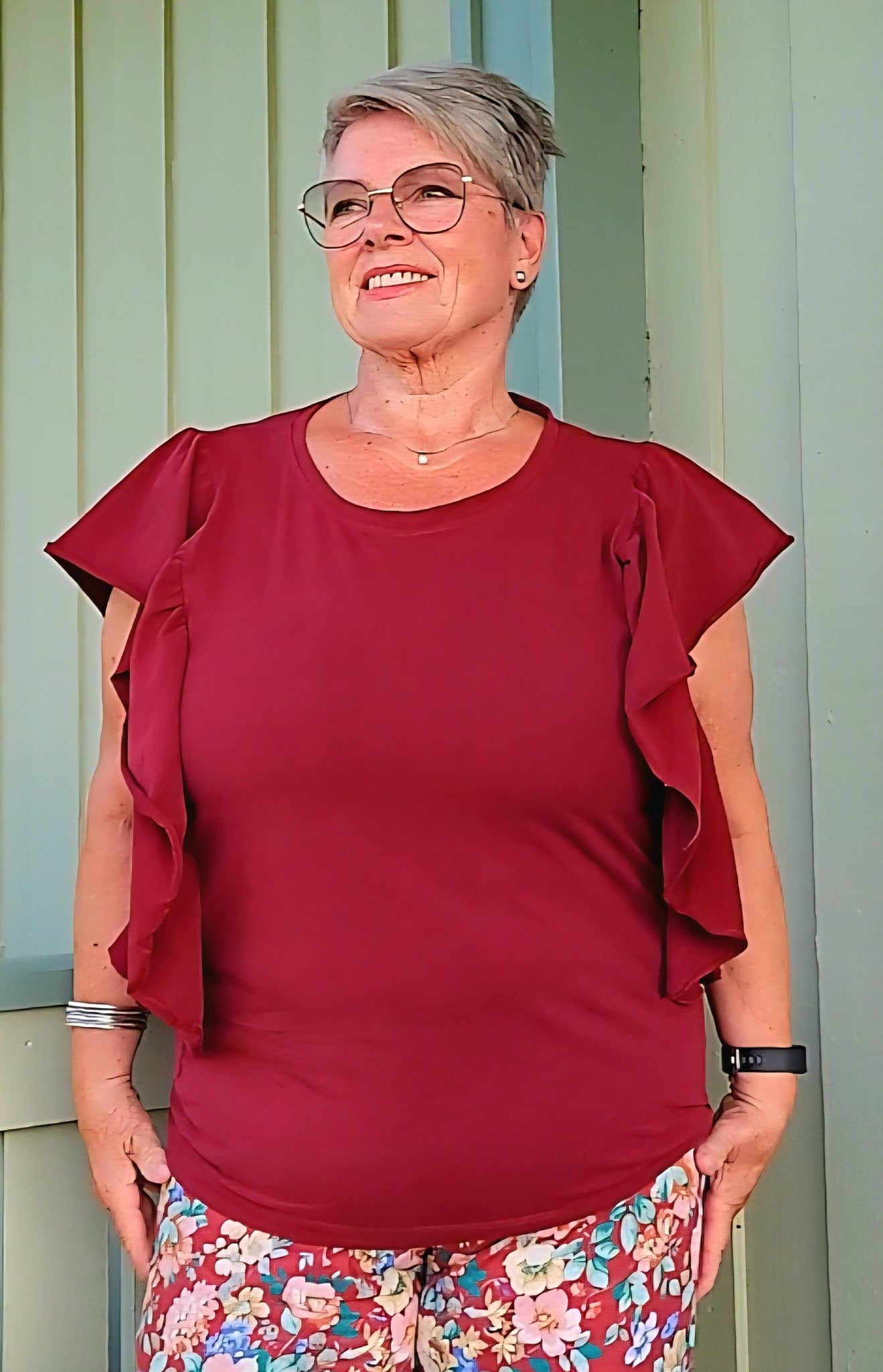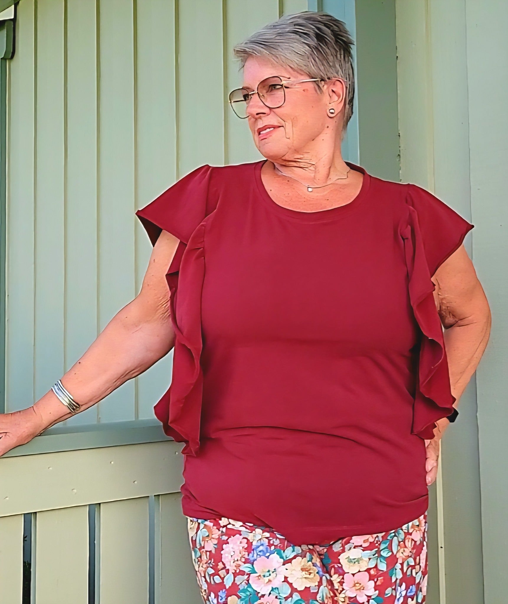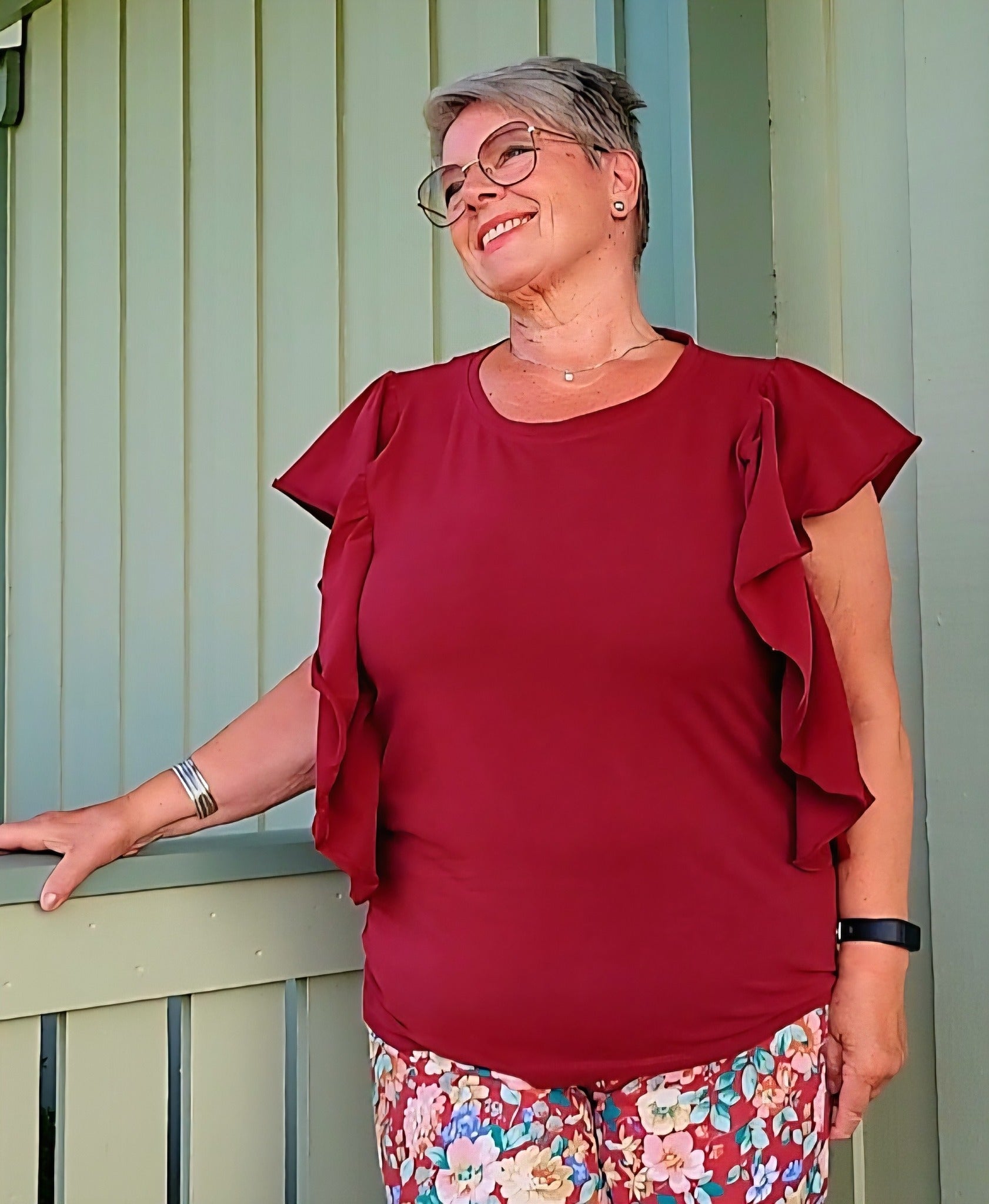 Frillie Top är en söt modell med generösa volanger som faller ner över axlarna och som sträcker sig ner till toppens sidosöm. Den kan även sys som en vanlig rak tank top utan volang vilket gör mönstret användbart för flera typer av projekt.