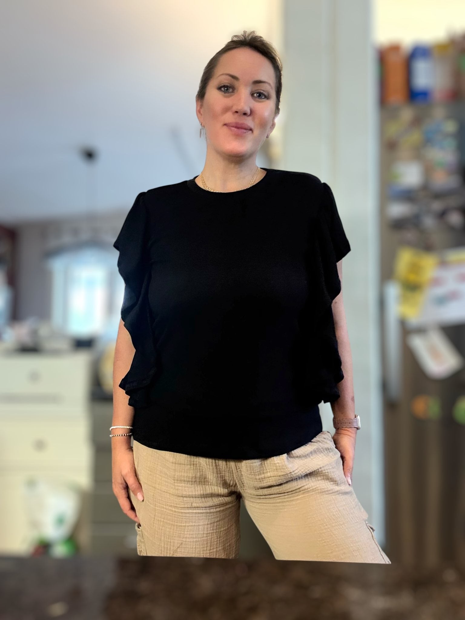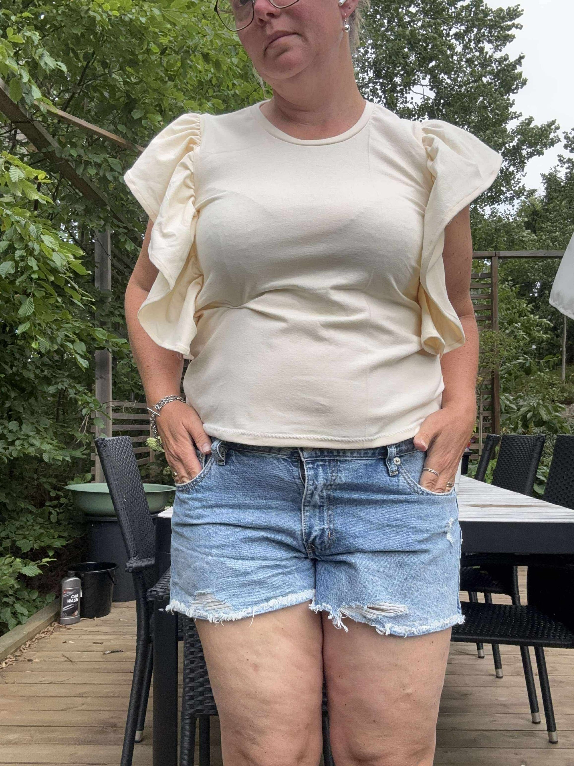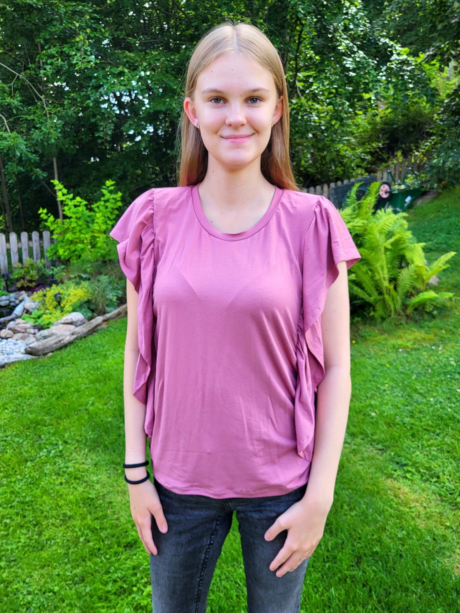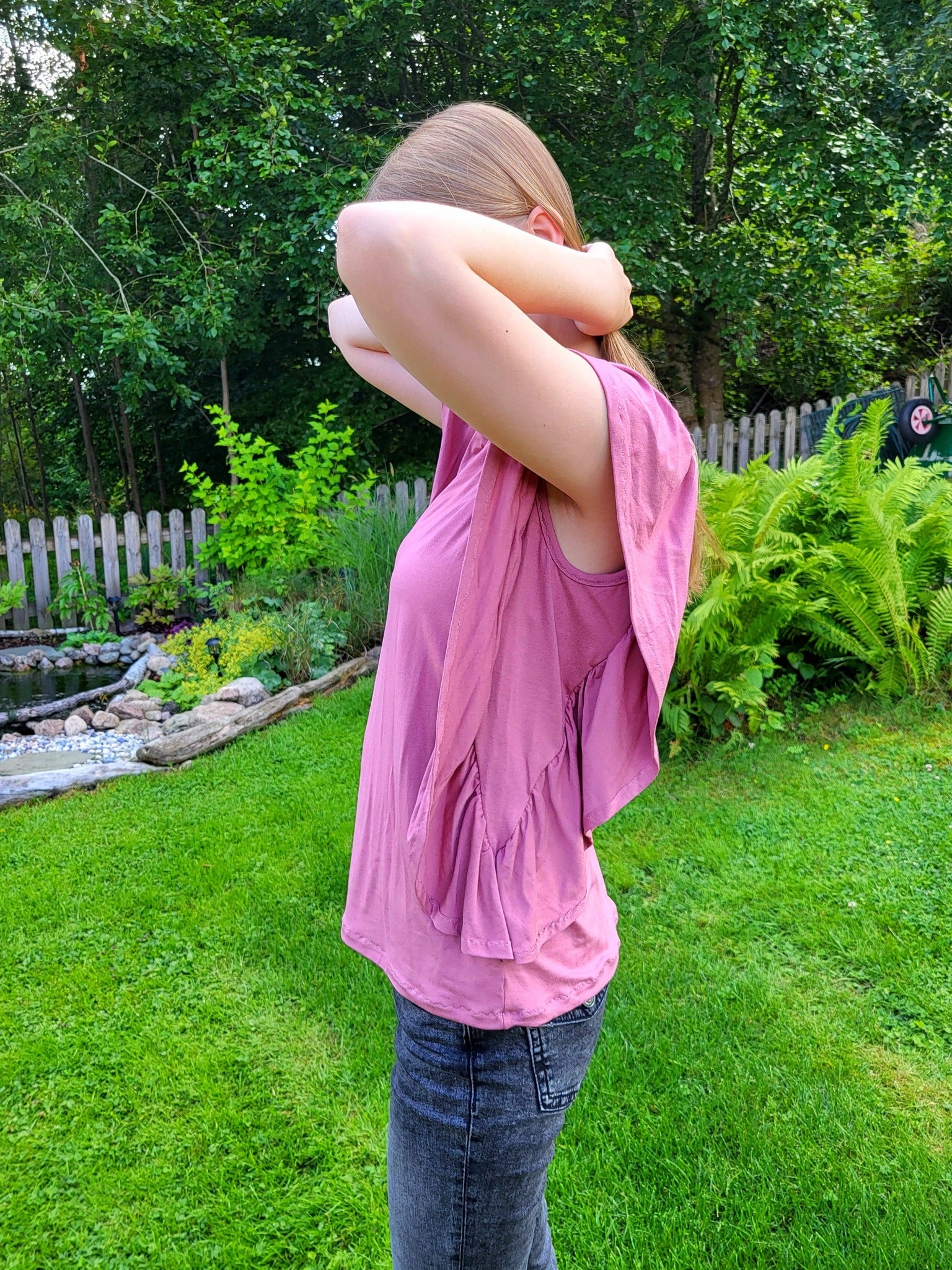 Frillie Top är en söt modell med generösa volanger som faller ner över axlarna och som sträcker sig ner till toppens sidosöm. Den kan även sys som en vanlig rak tank top utan volang vilket gör mönstret användbart för flera typer av projekt.