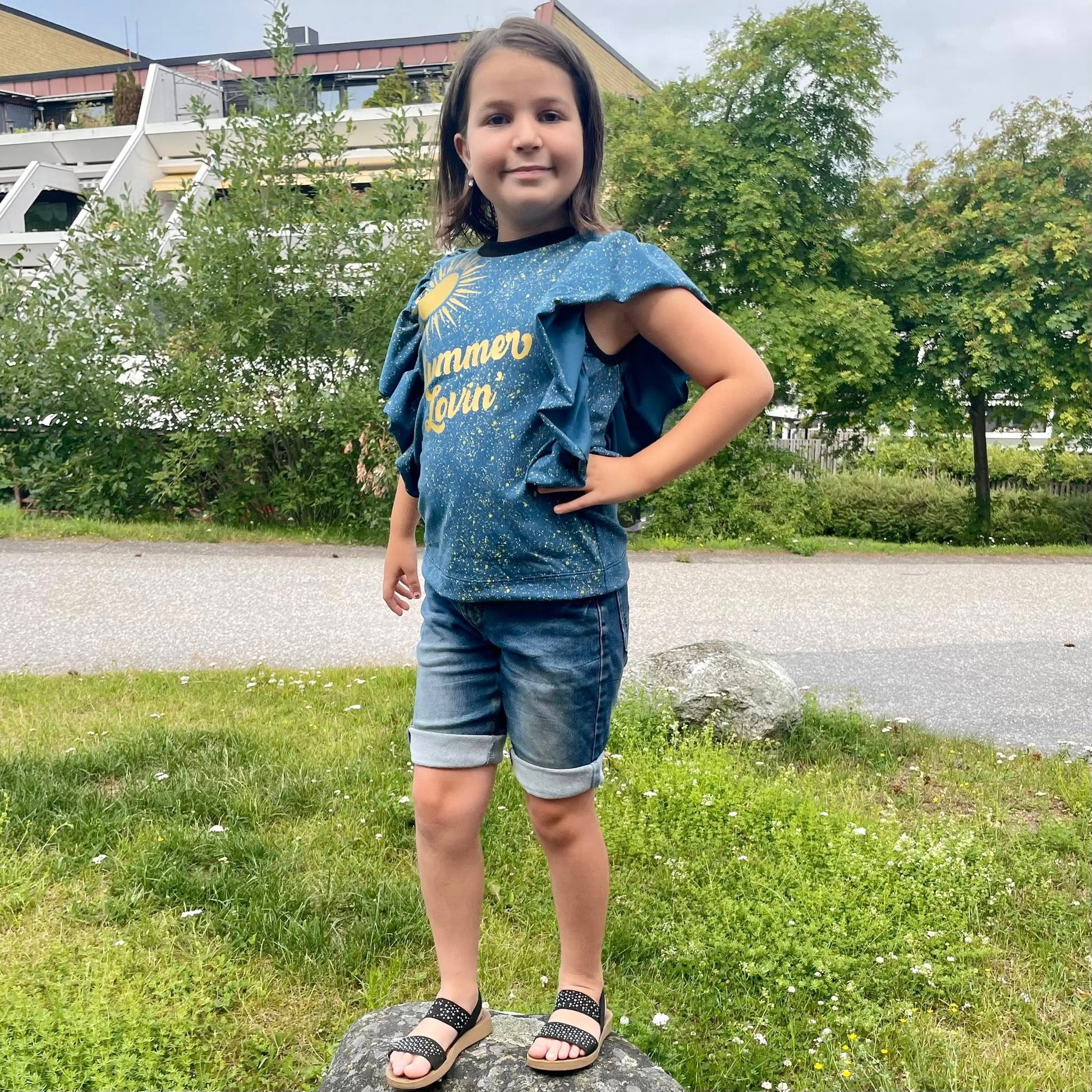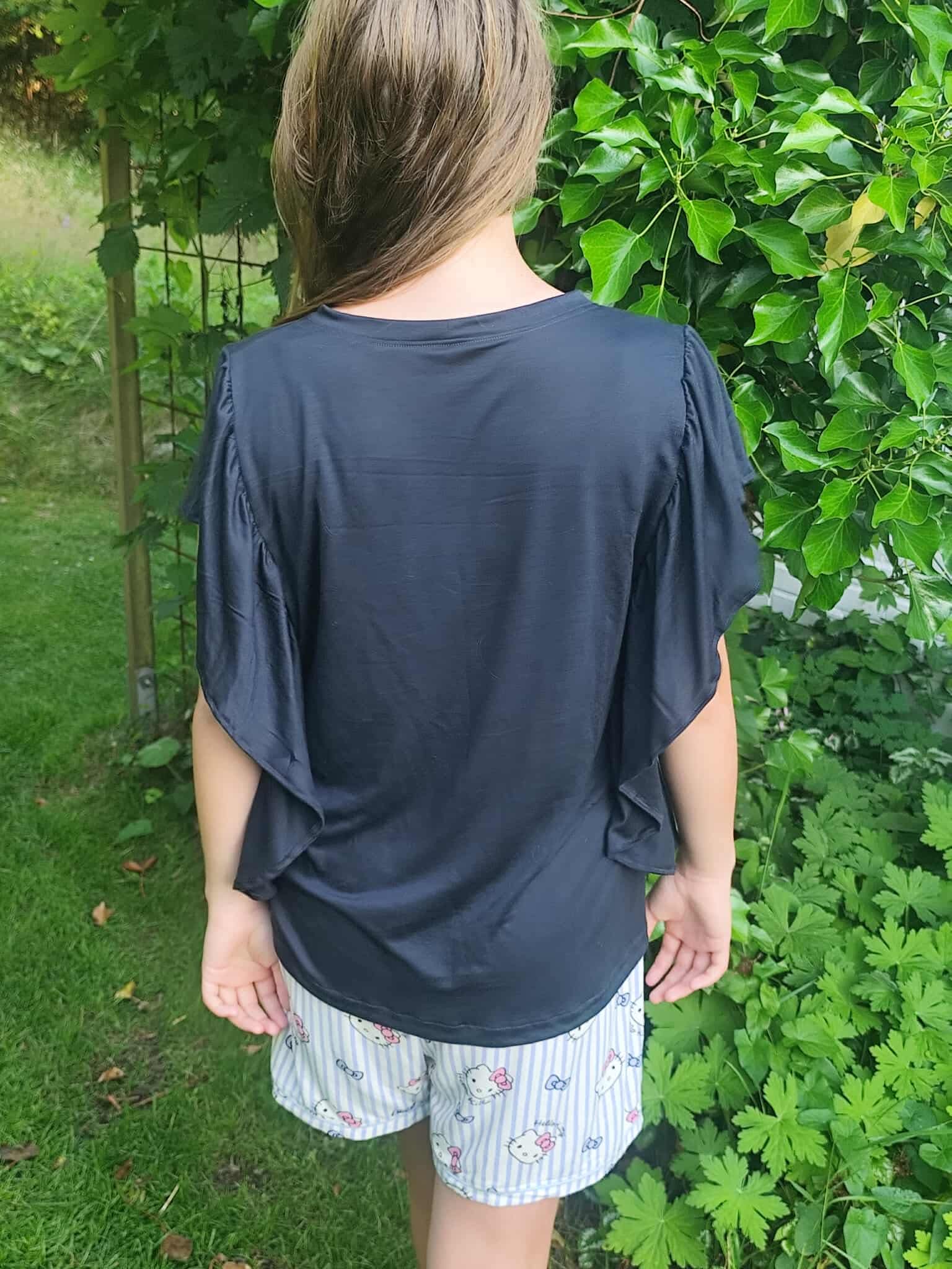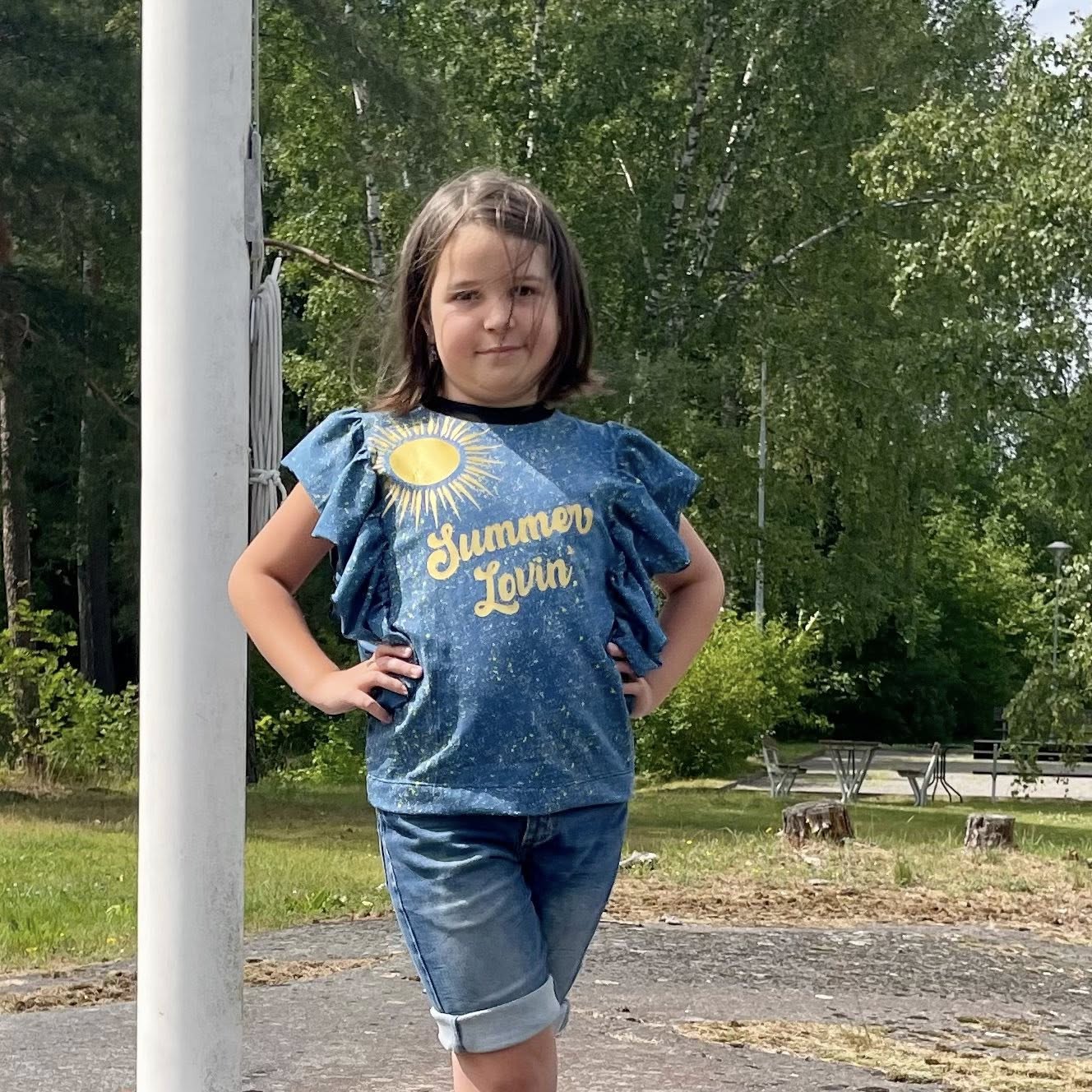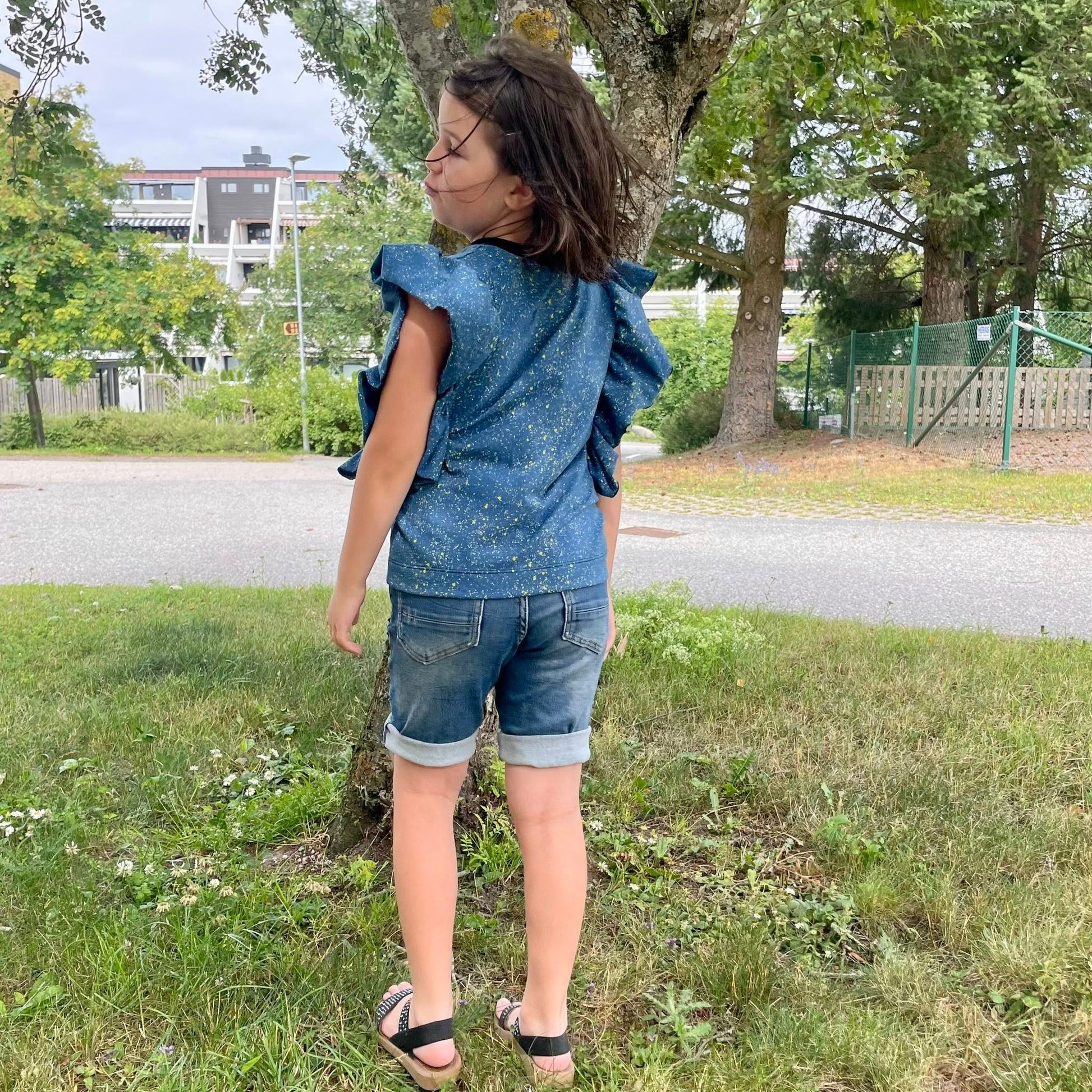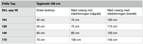 Material och tillklippning: Modellen är tänkt att sy i följsam trikå/jersey, viscosejersey, bambuviscose, apellajersey eller liknande material med stretch men inte alltför tunt samt en liten bit mudd till halsringningen. Vid sömnad utan volang tillkommer även kantband/mudd att kanta ärmhålet med.