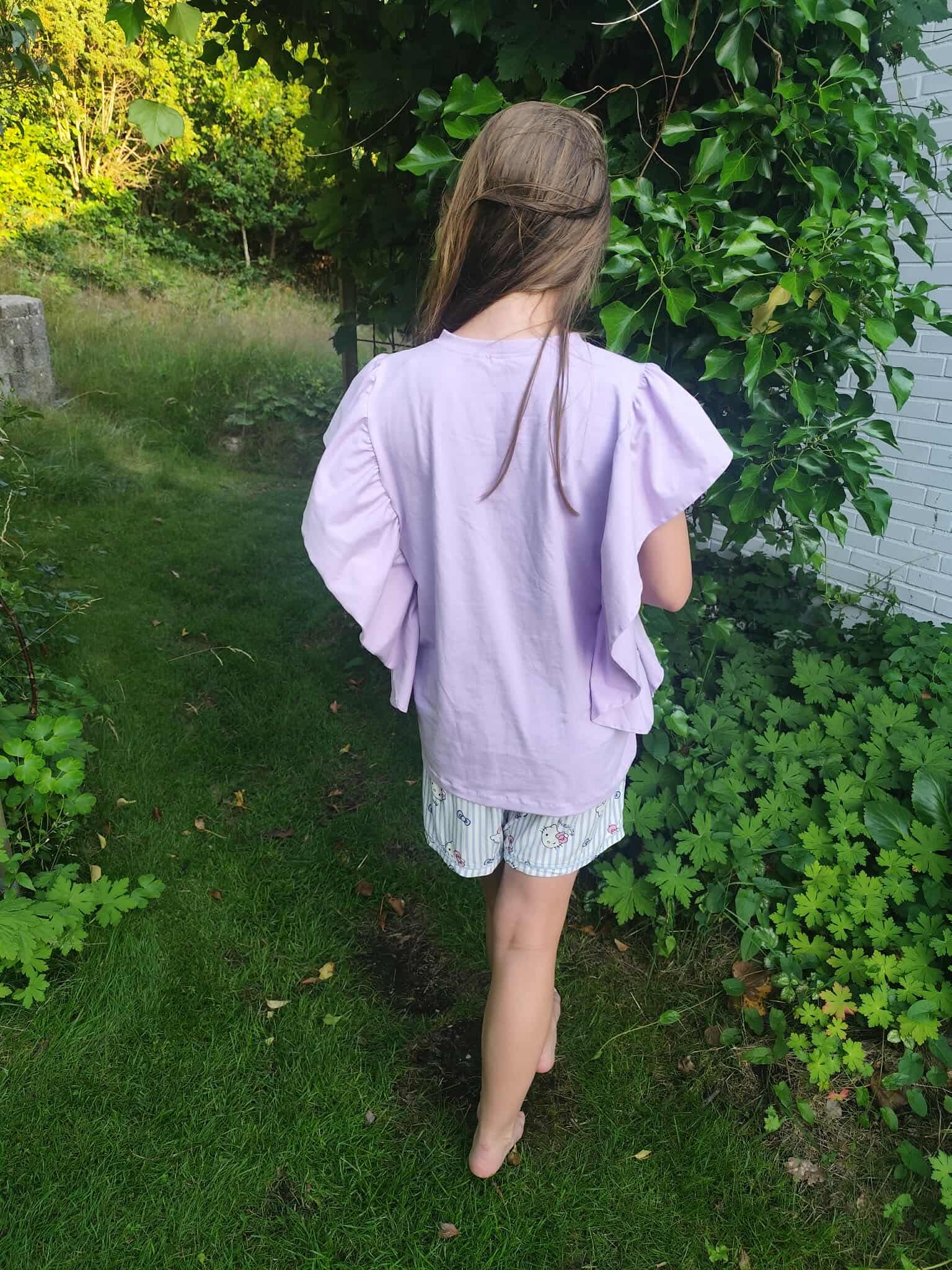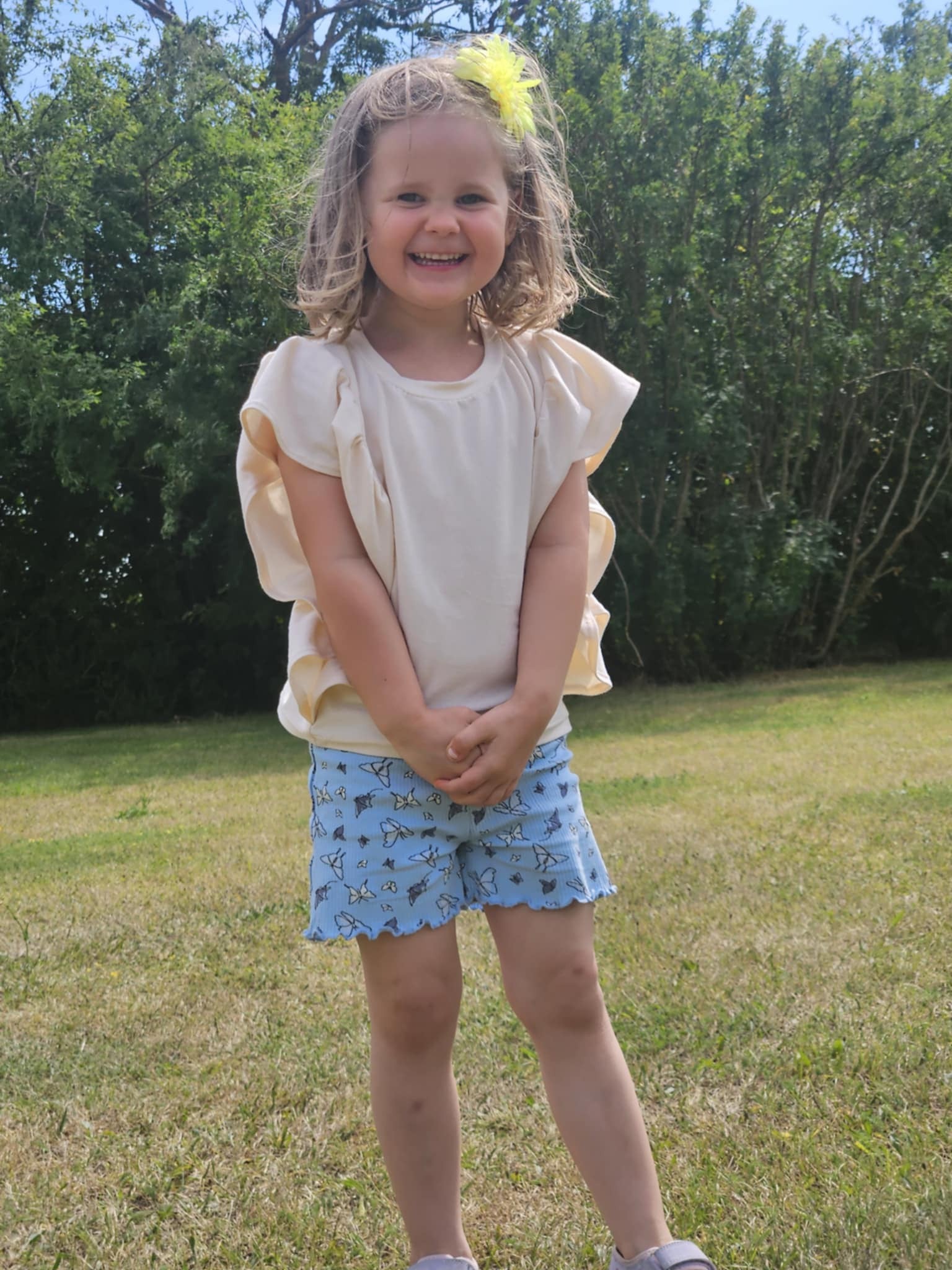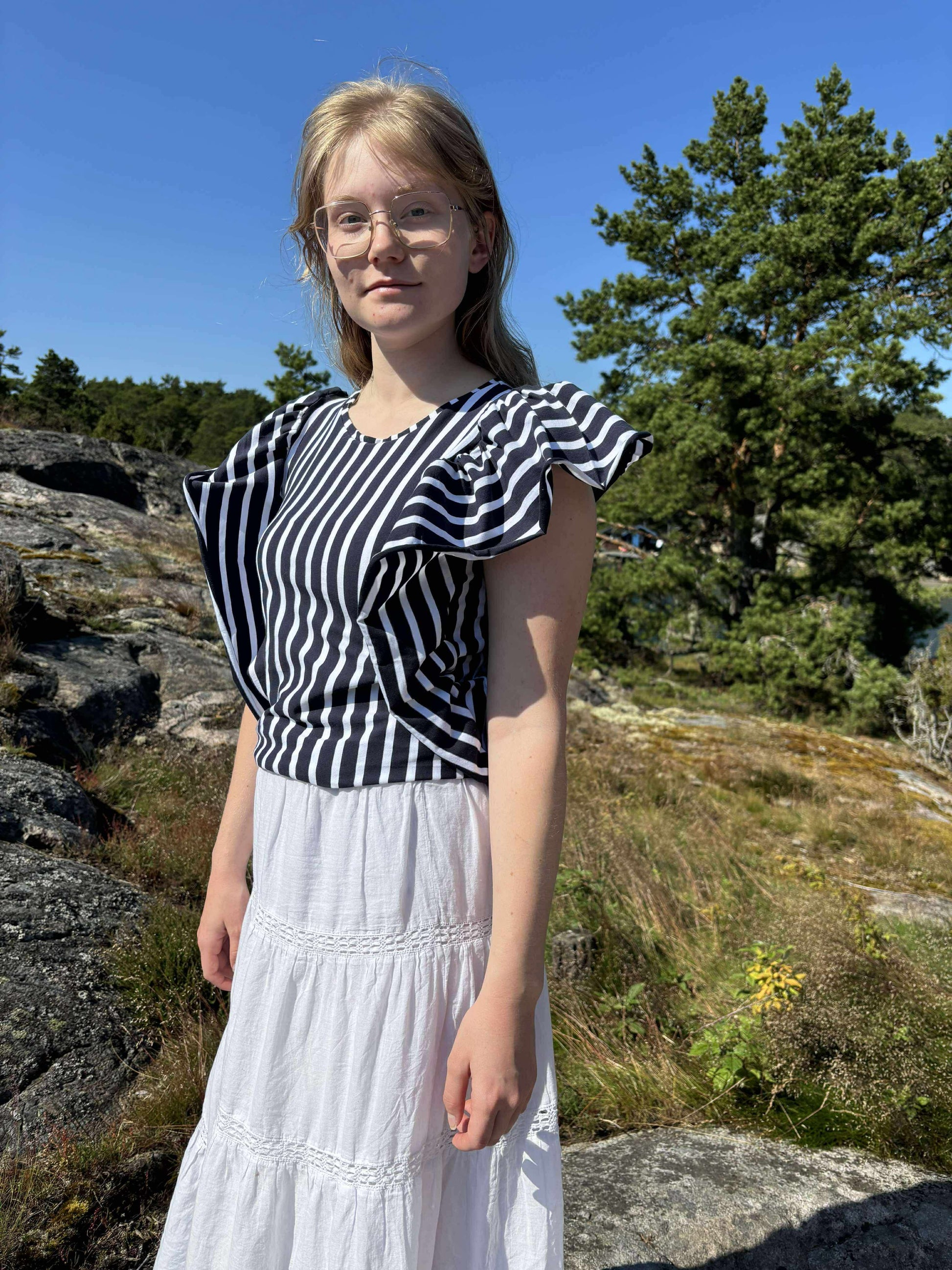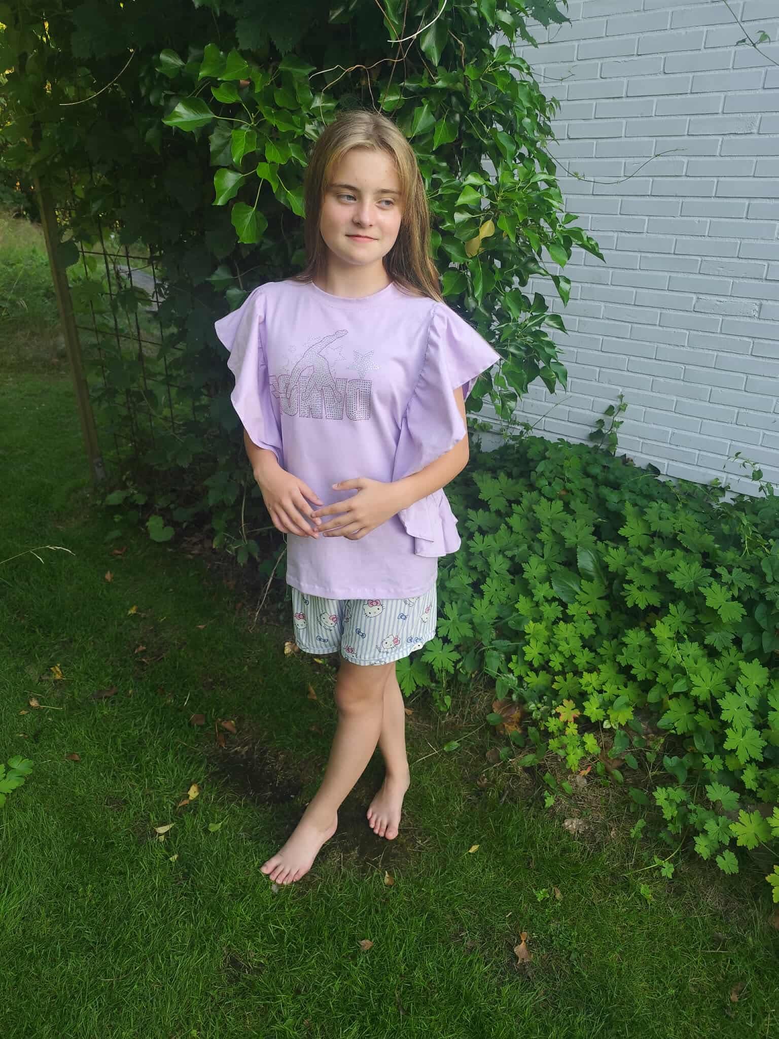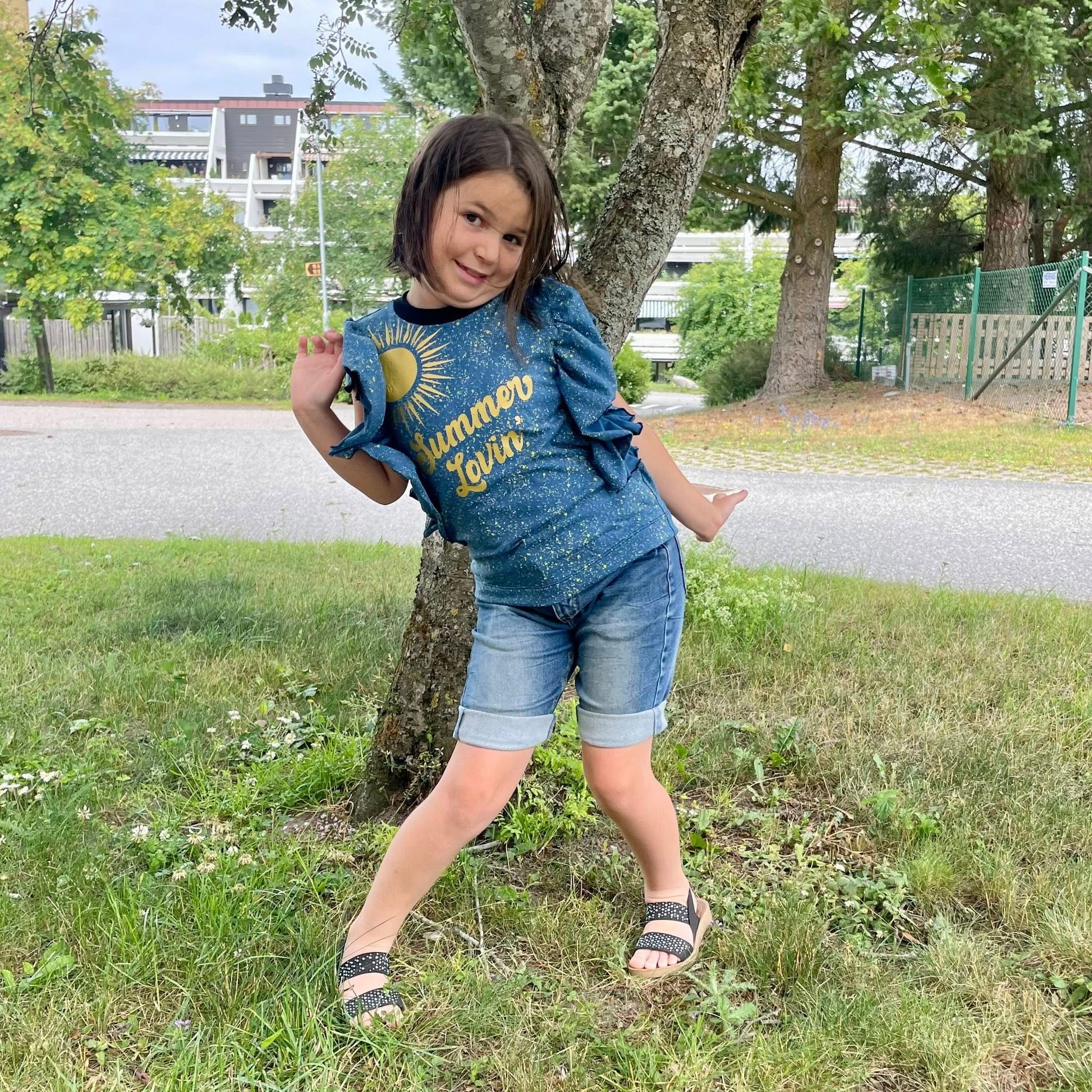 Material och tillklippning: Modellen är tänkt att sy i följsam trikå/jersey, viscosejersey, bambuviscose, apellajersey eller liknande material med stretch men inte alltför tunt samt en liten bit mudd till halsringningen. Vid sömnad utan volang tillkommer även kantband/mudd att kanta ärmhålet med.