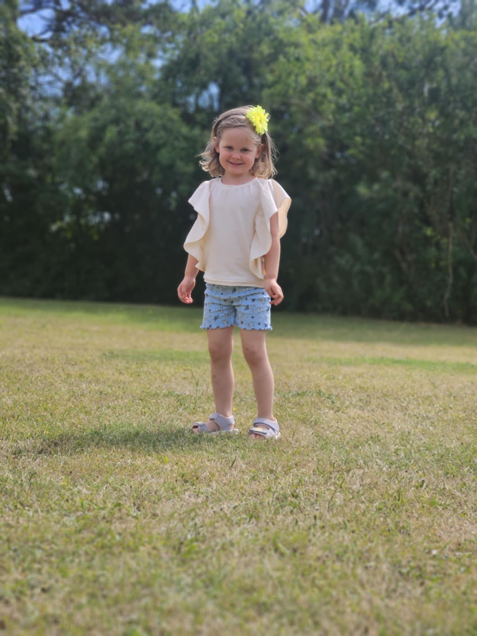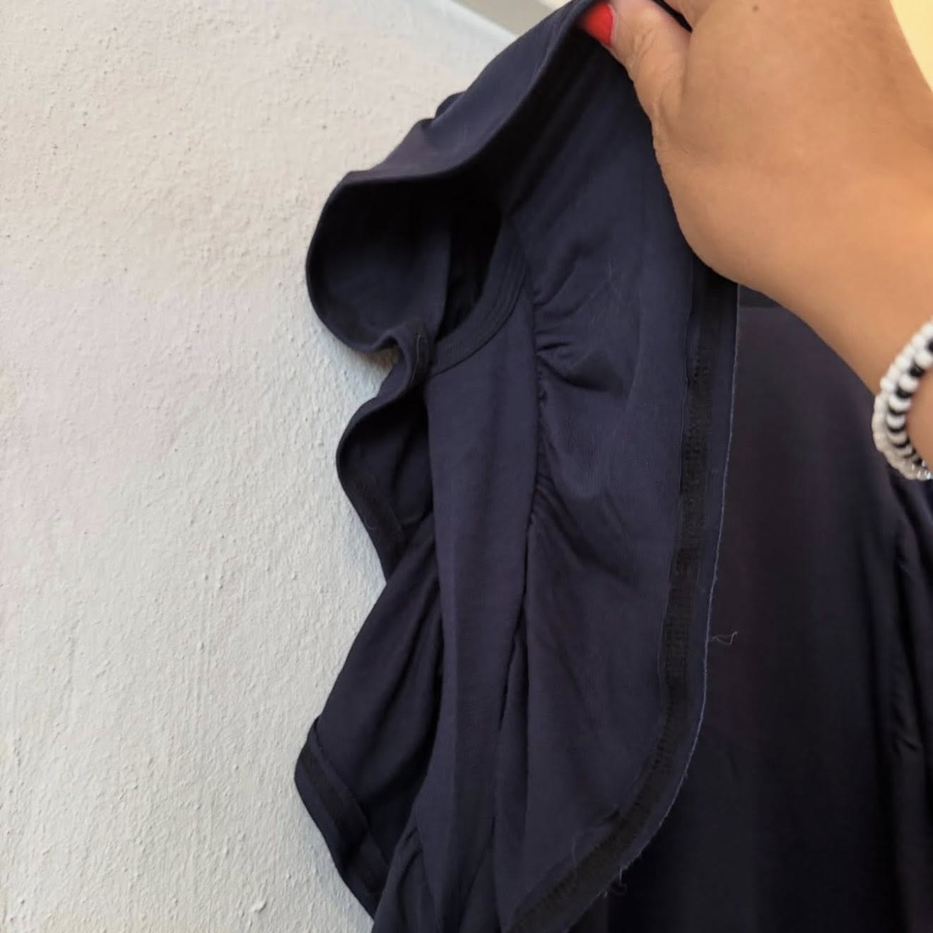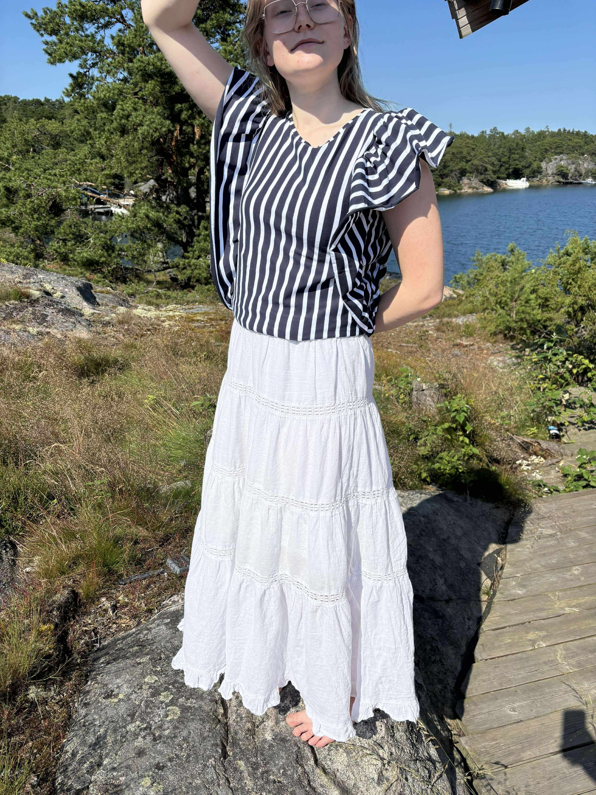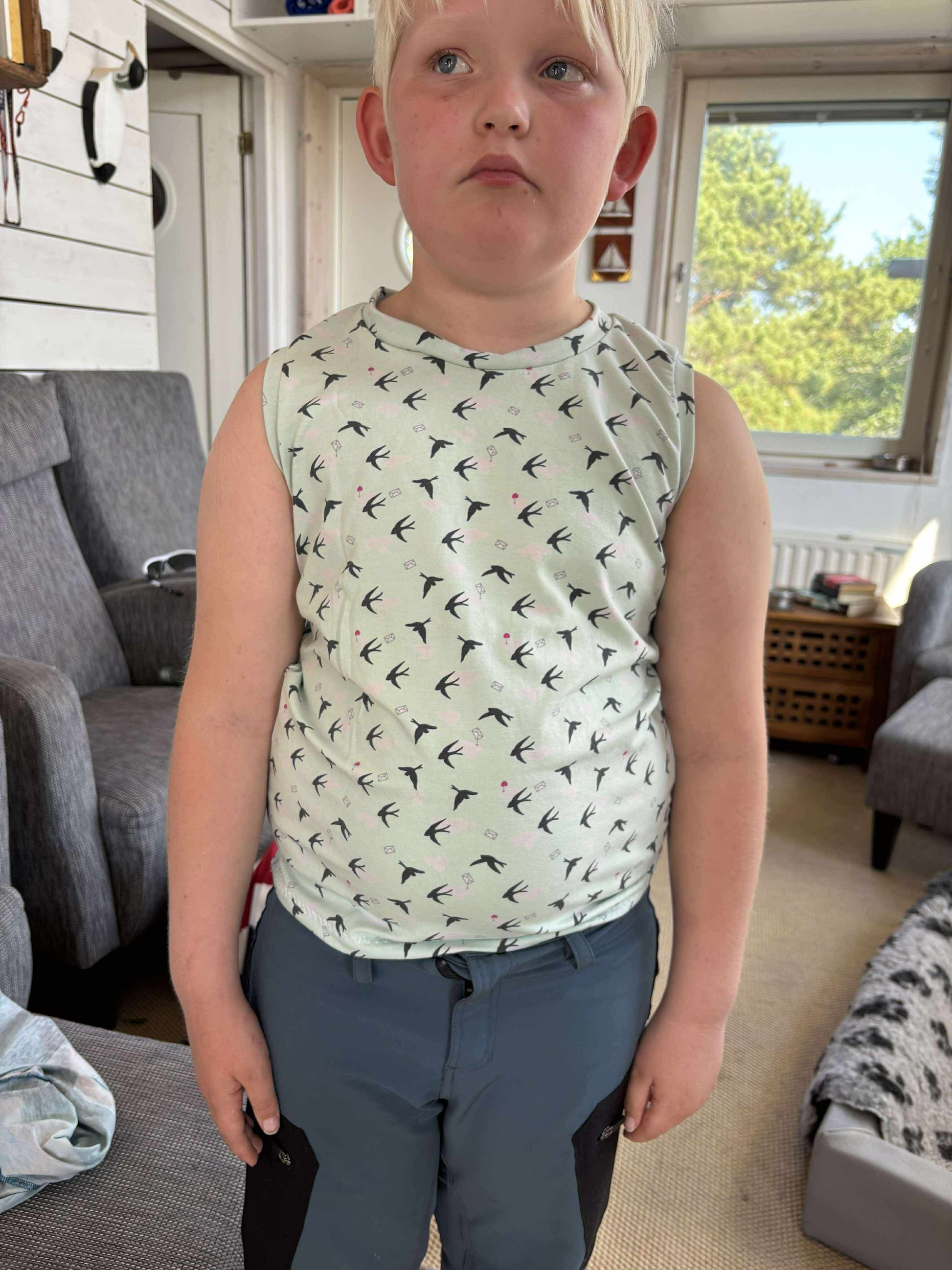 Material och tillklippning: Modellen är tänkt att sy i följsam trikå/jersey, viscosejersey, bambuviscose, apellajersey eller liknande material med stretch men inte alltför tunt samt en liten bit mudd till halsringningen. Vid sömnad utan volang tillkommer även kantband/mudd att kanta ärmhålet med.
