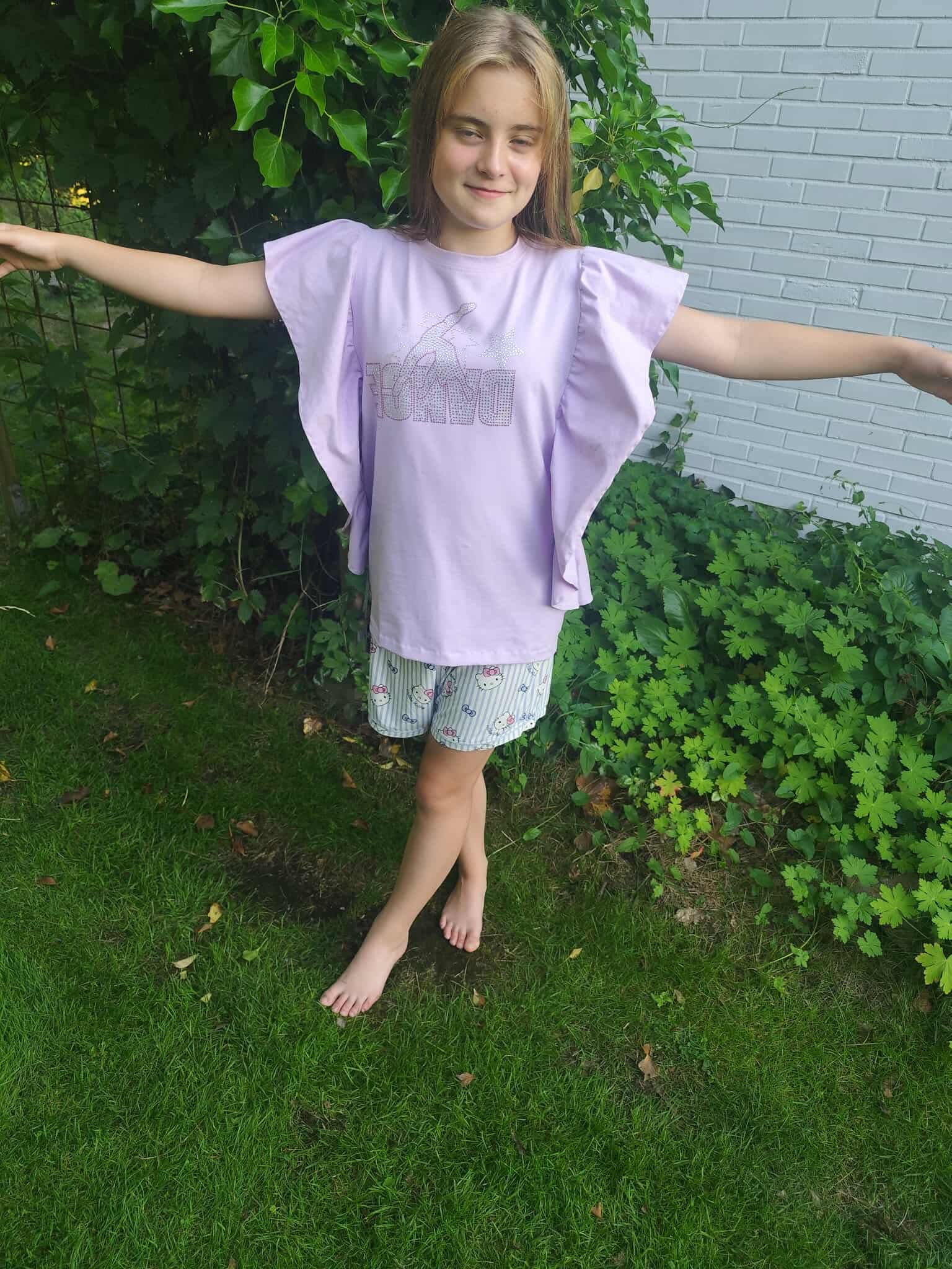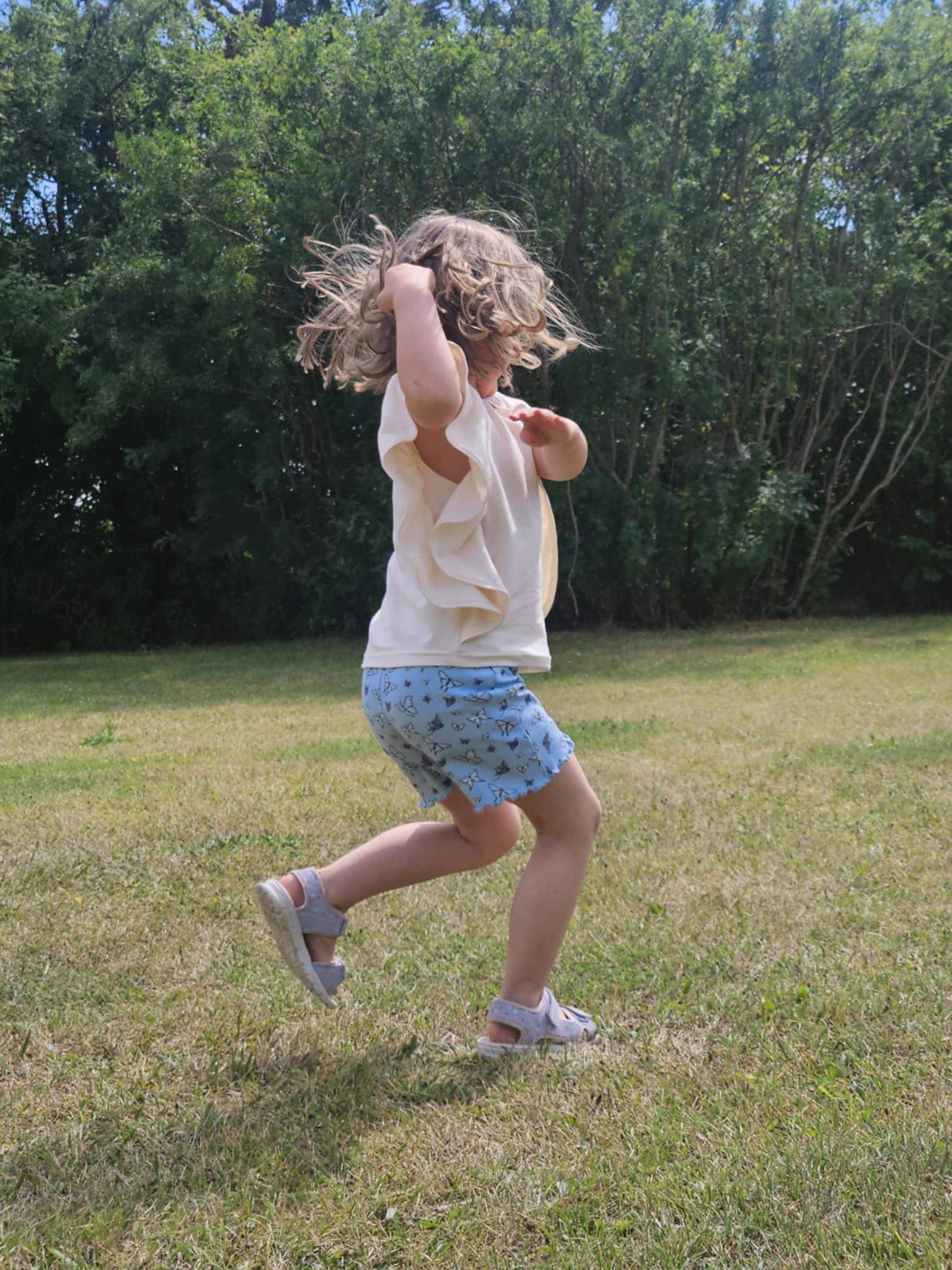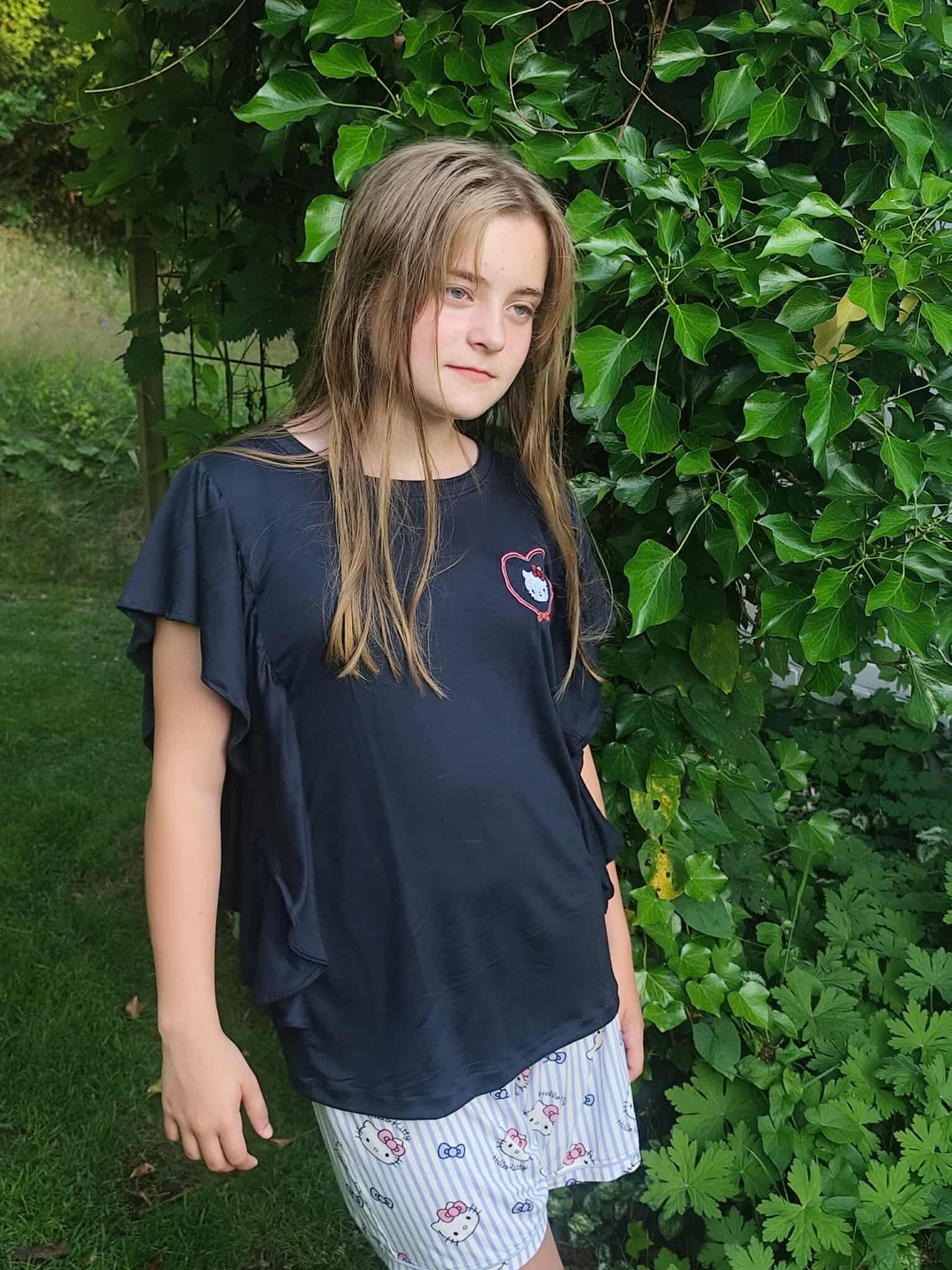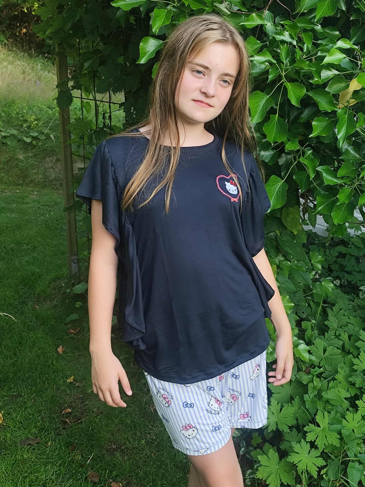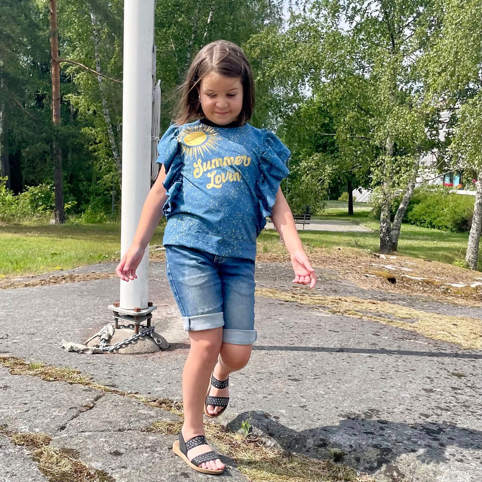 Material och tillklippning: Modellen är tänkt att sy i följsam trikå/jersey, viscosejersey, bambuviscose, apellajersey eller liknande material med stretch men inte alltför tunt samt en liten bit mudd till halsringningen. Vid sömnad utan volang tillkommer även kantband/mudd att kanta ärmhålet med.