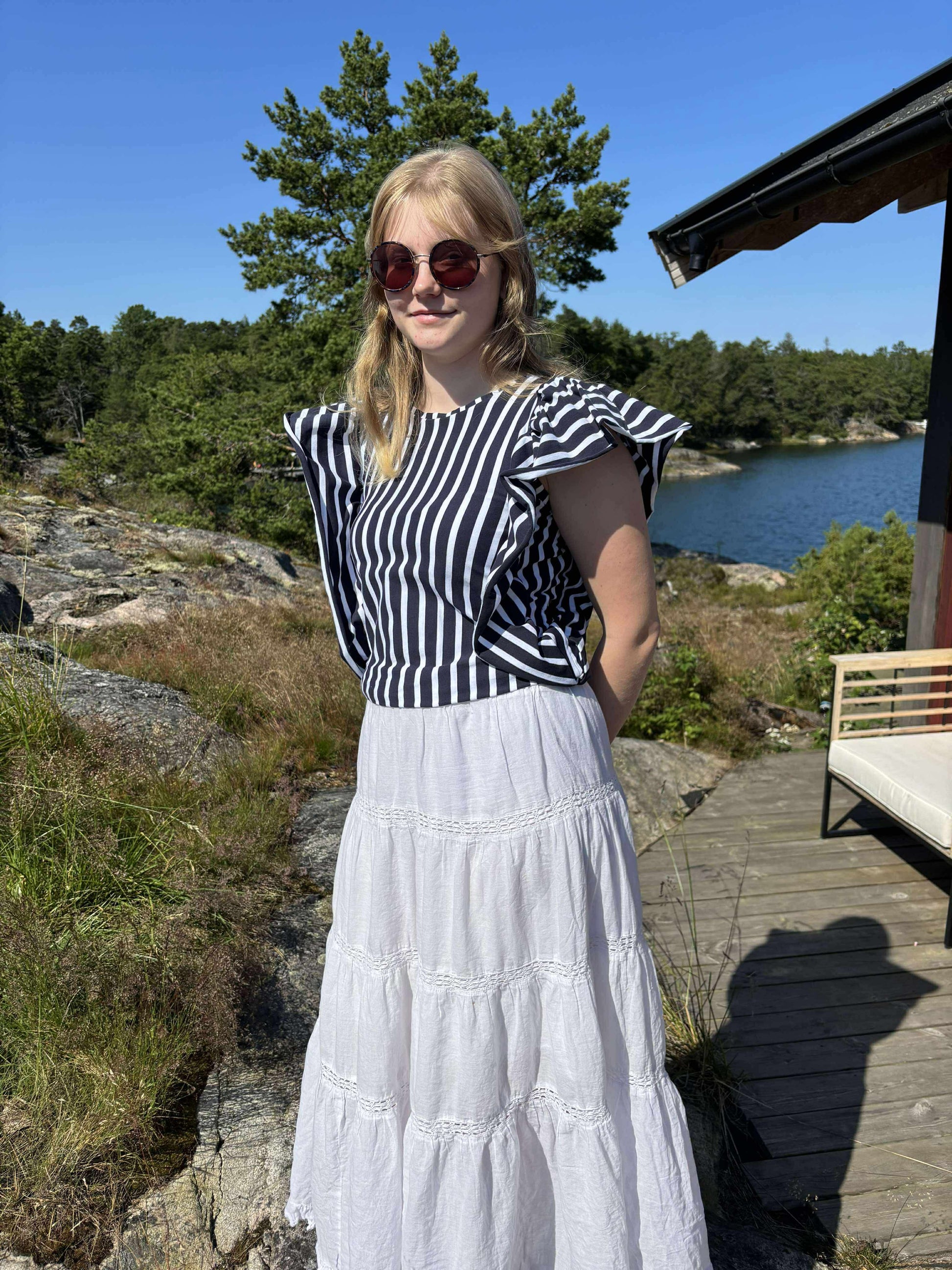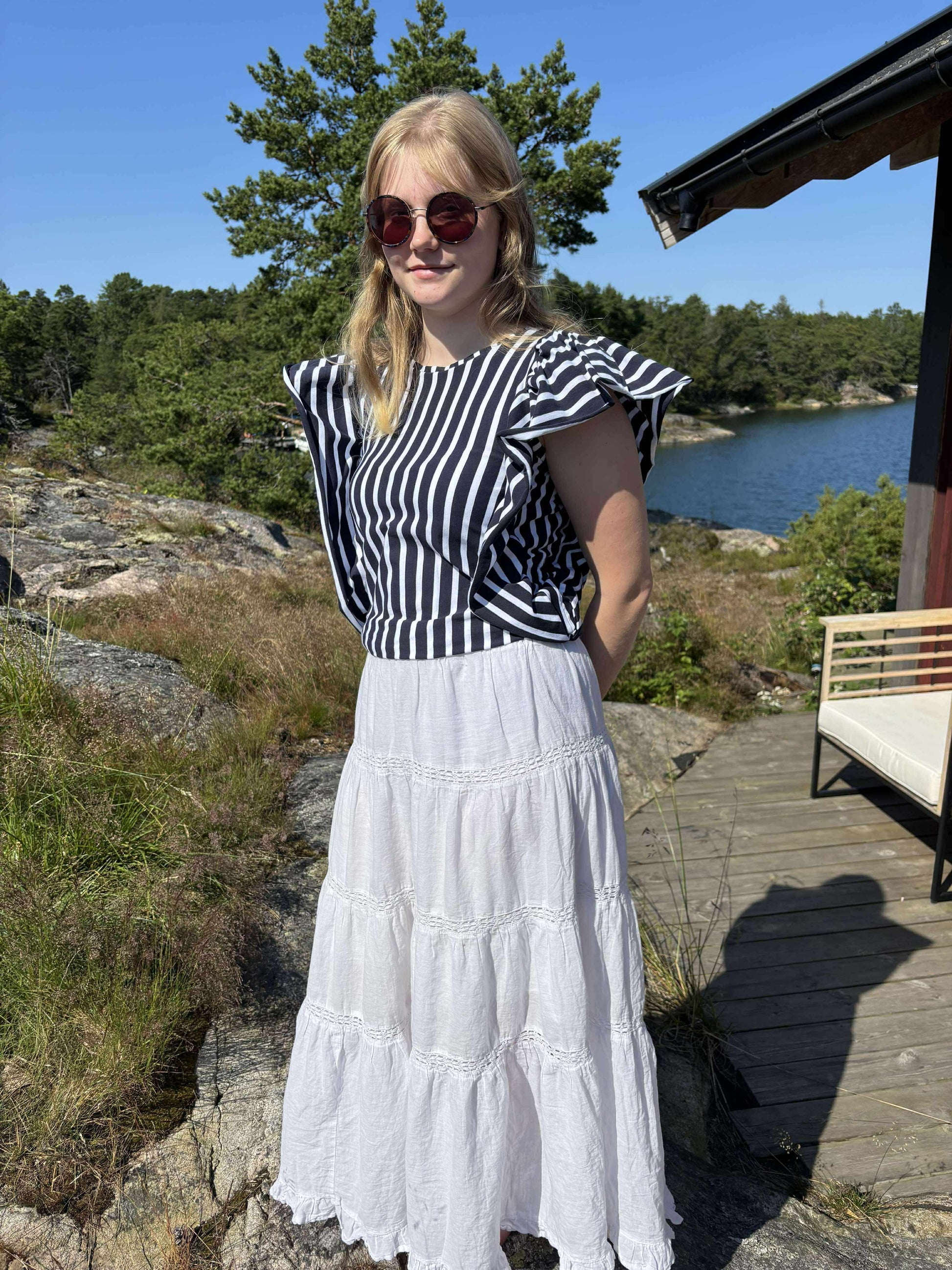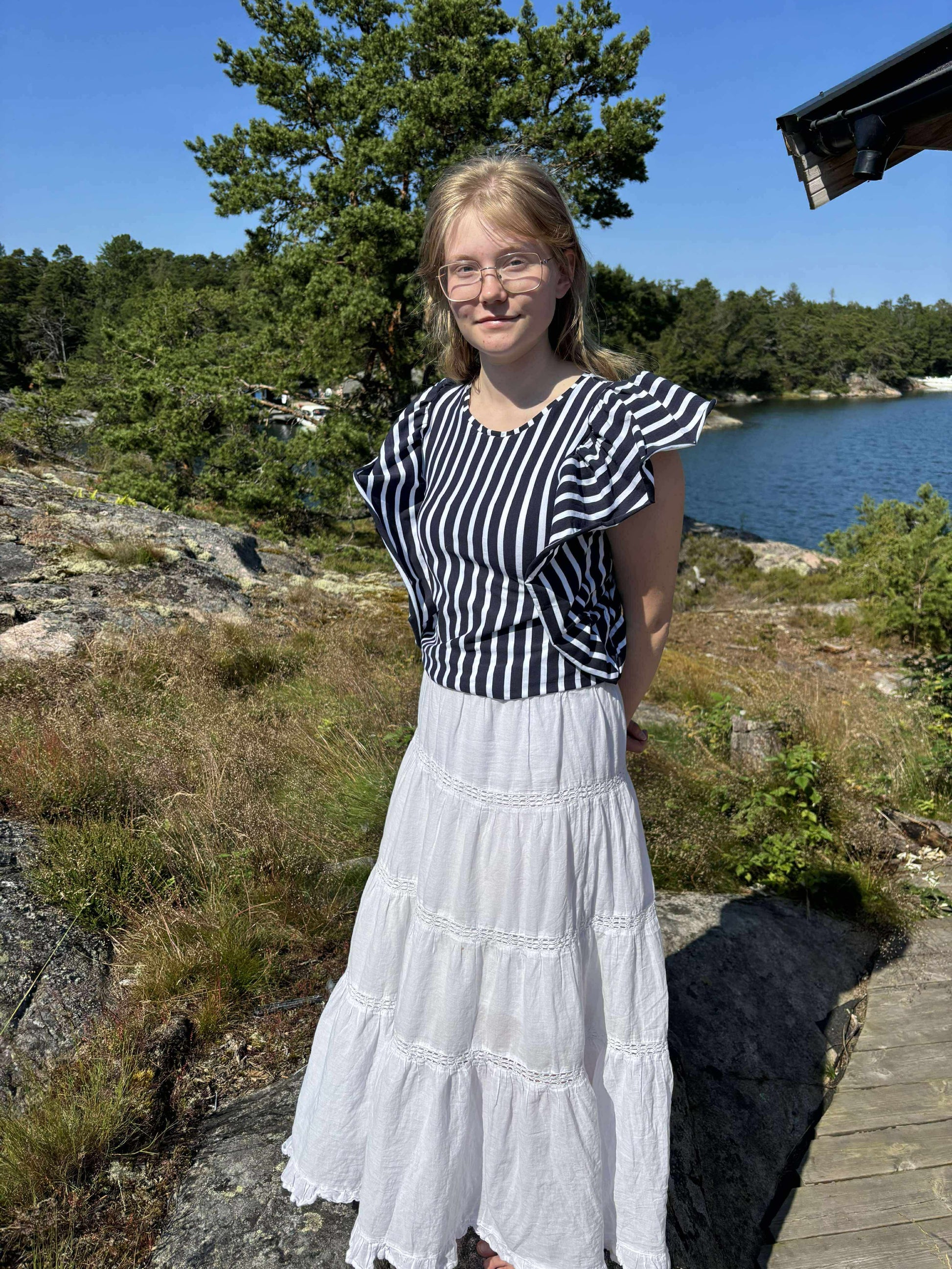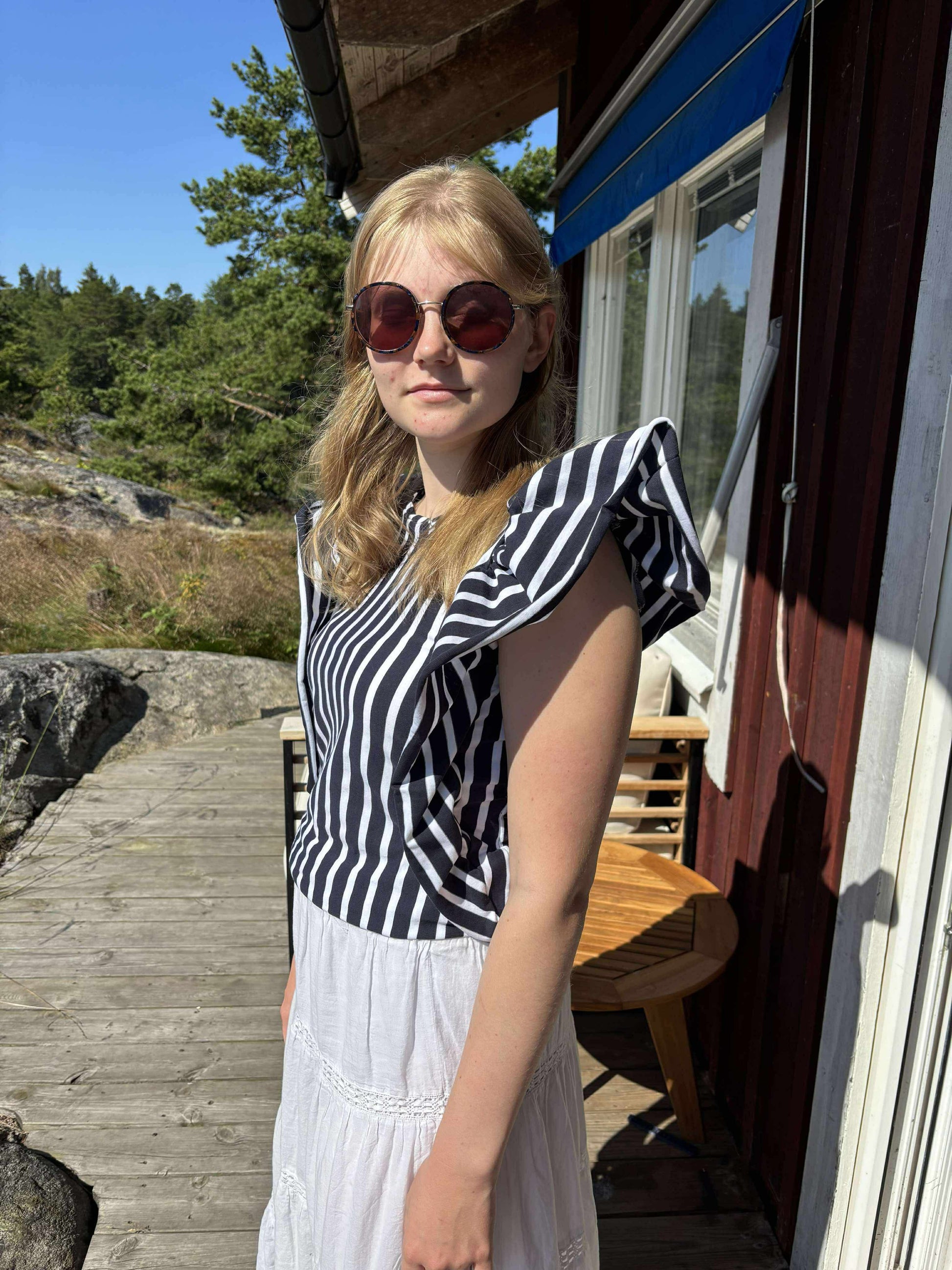 Material och tillklippning: Modellen är tänkt att sy i följsam trikå/jersey, viscosejersey, bambuviscose, apellajersey eller liknande material med stretch men inte alltför tunt samt en liten bit mudd till halsringningen. Vid sömnad utan volang tillkommer även kantband/mudd att kanta ärmhålet med.