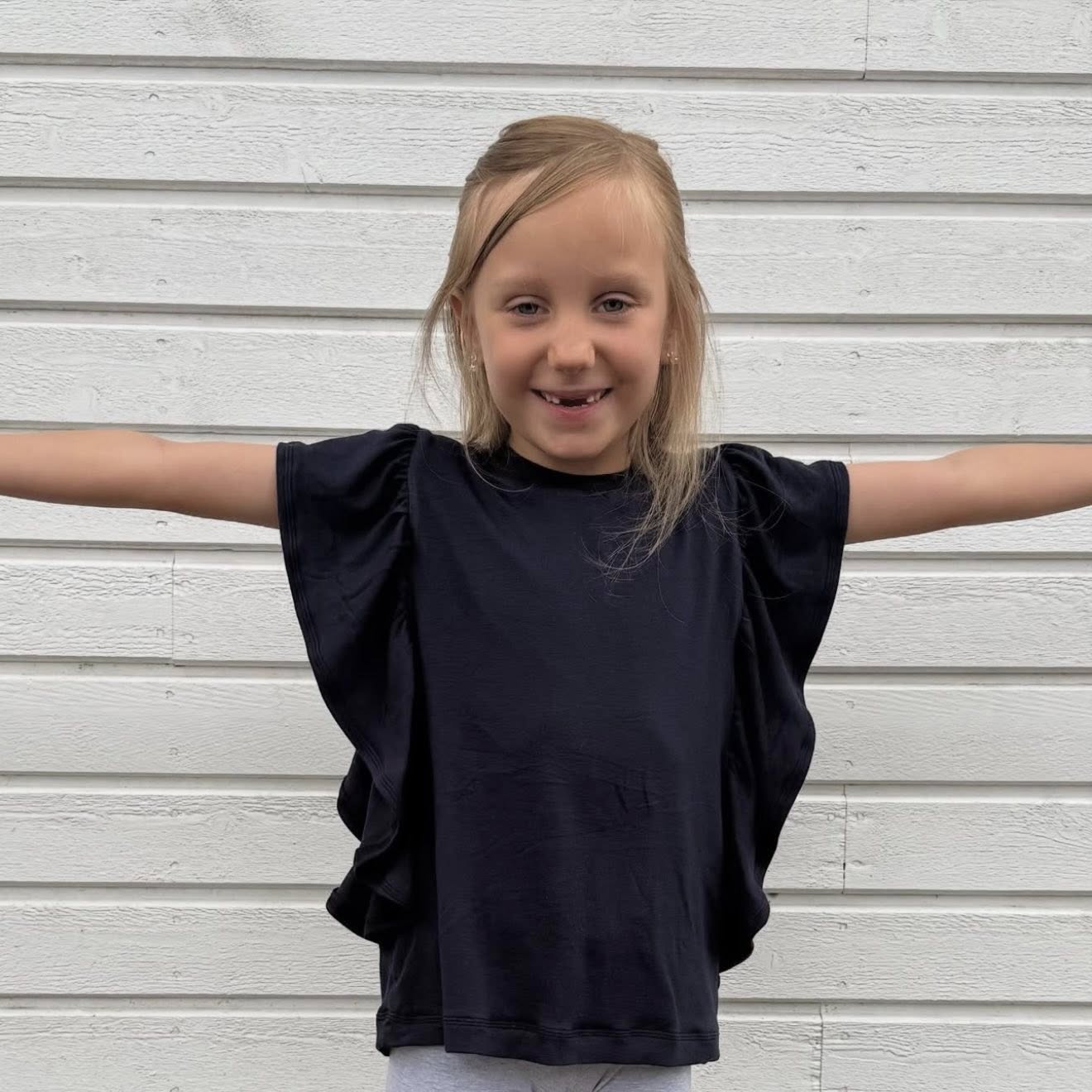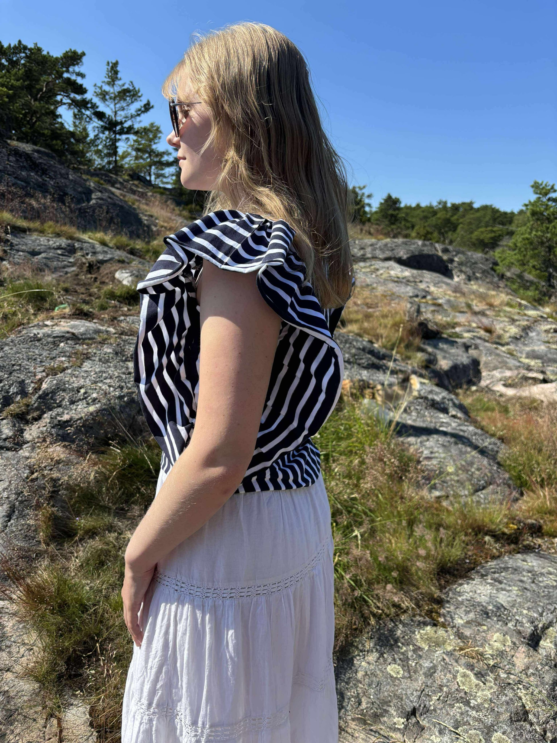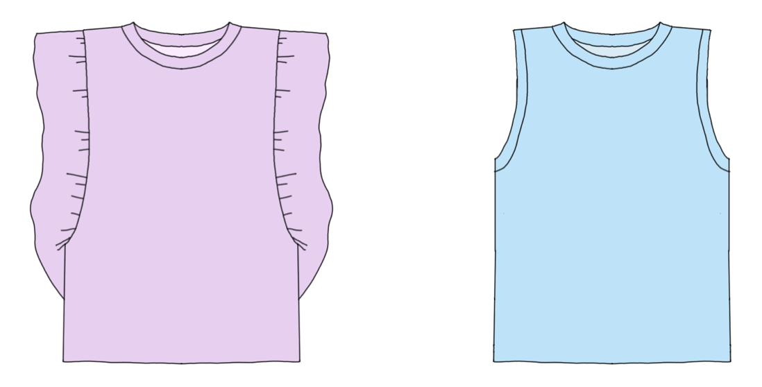 Frillie Top är en söt modell med generösa volanger som faller ner över axlarna och som sträcker sig ner till toppens sidosöm. Den kan även sys som en vanlig rak tank top utan volang vilket gör mönstret användbart för flera typer av projekt.