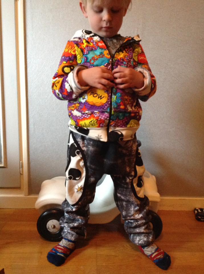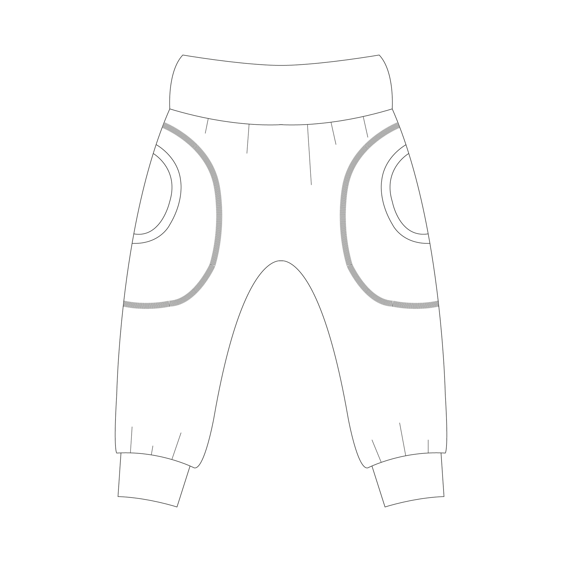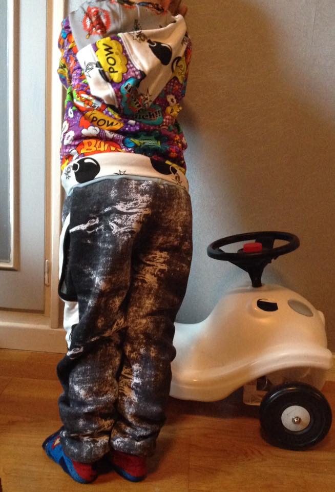Juggling Joggers är en en aning vidare mysbyxa med helt framstycke och delat bakstycke för bättre passform. Med resår i midjan och snörning om så önskas. Kan sys med eller utan fickor.