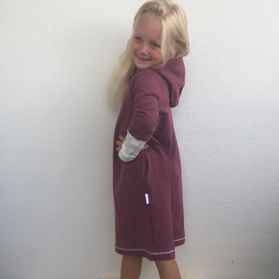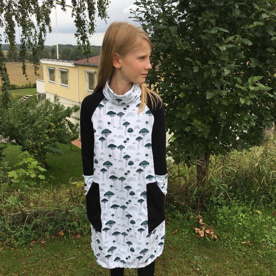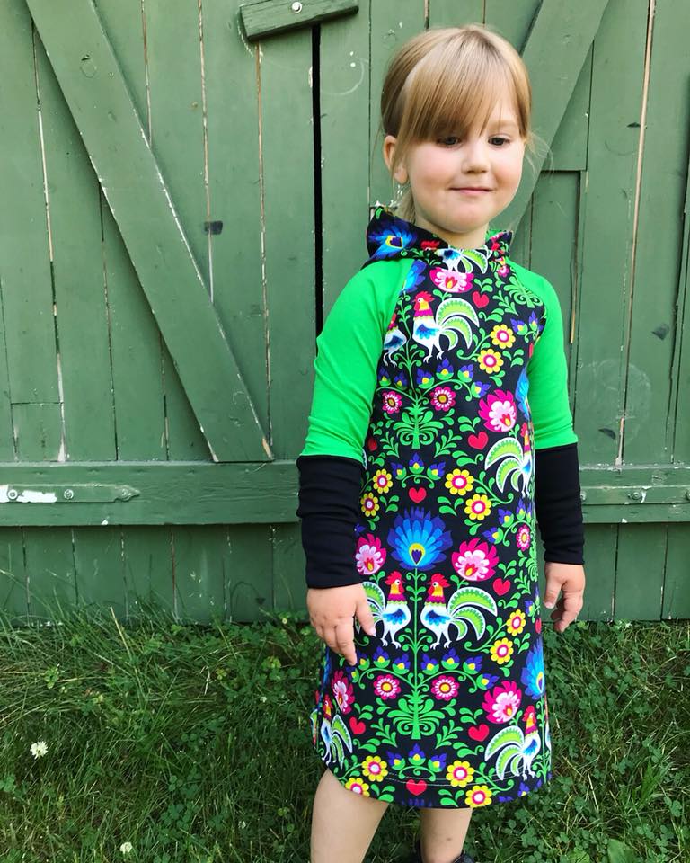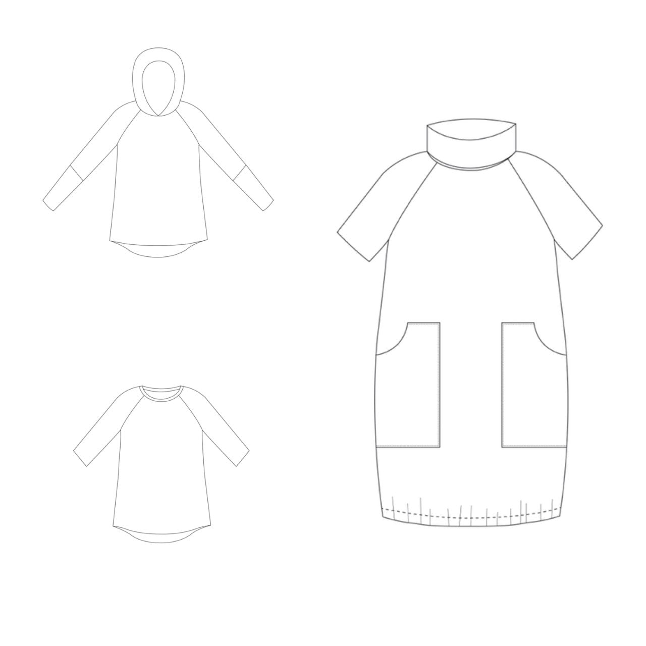 Little League är en tröja/klänning med raglanärm som kan sys med mängder av variationer; Halsringningen kan man välja att kanta, pryda med luva eller med polokrage. Ärmarna kan sys korta, 3/4-långa eller 3/4 tillsammans med långa muddar, ärmen blir då hellång. Tröjlängden sys med svängd nederkant på bakstycket, och antingen rak eller svängd nederkant fram. Klänningen är knälång och kan användas a-linjeformad med fåll nedtill eller med en resårkanal med smal resår för lite ballongeffekt. På klänningen finns även möjlighet att sy fickor i en snygg och stilren utanpåmodell.