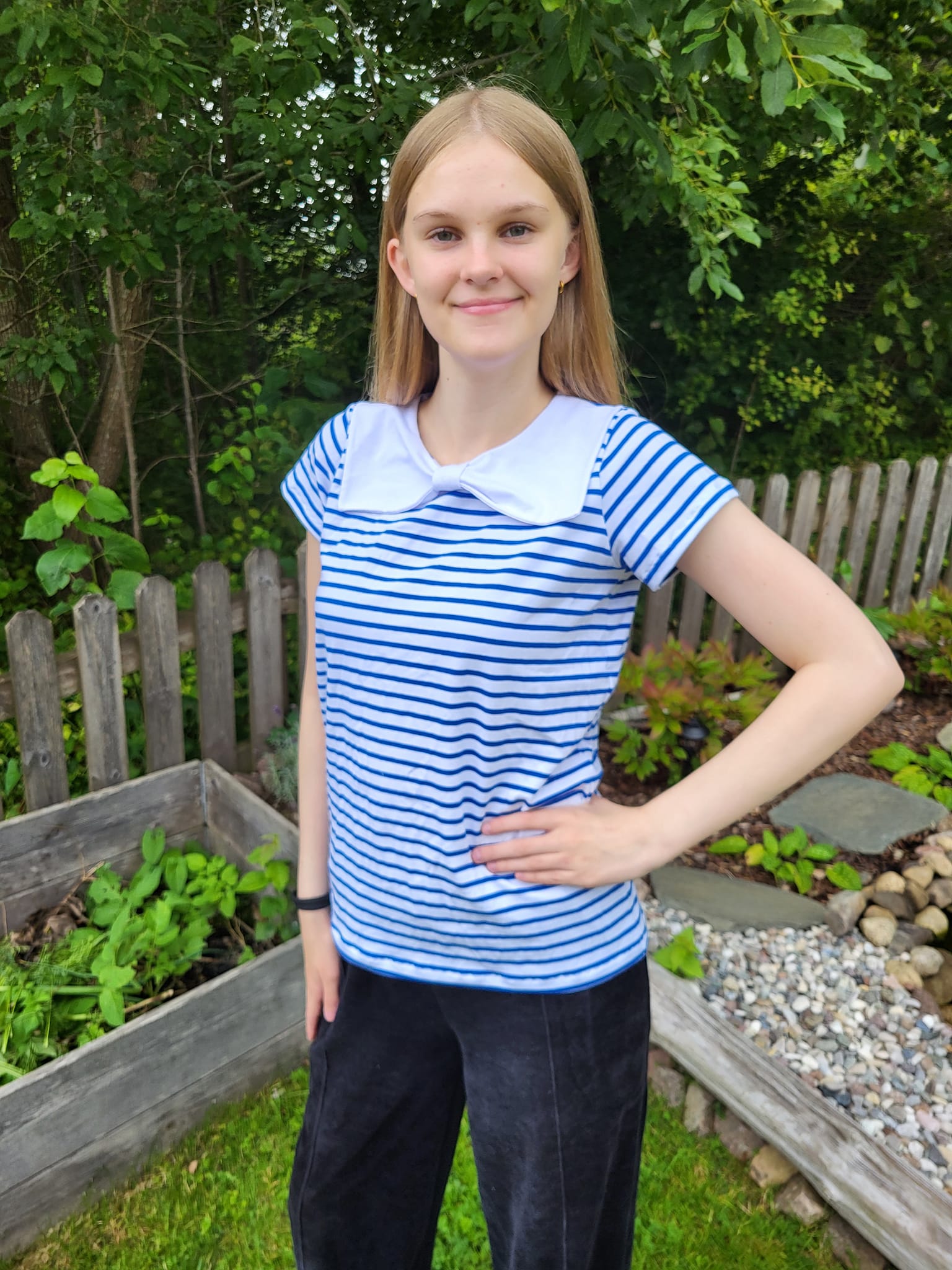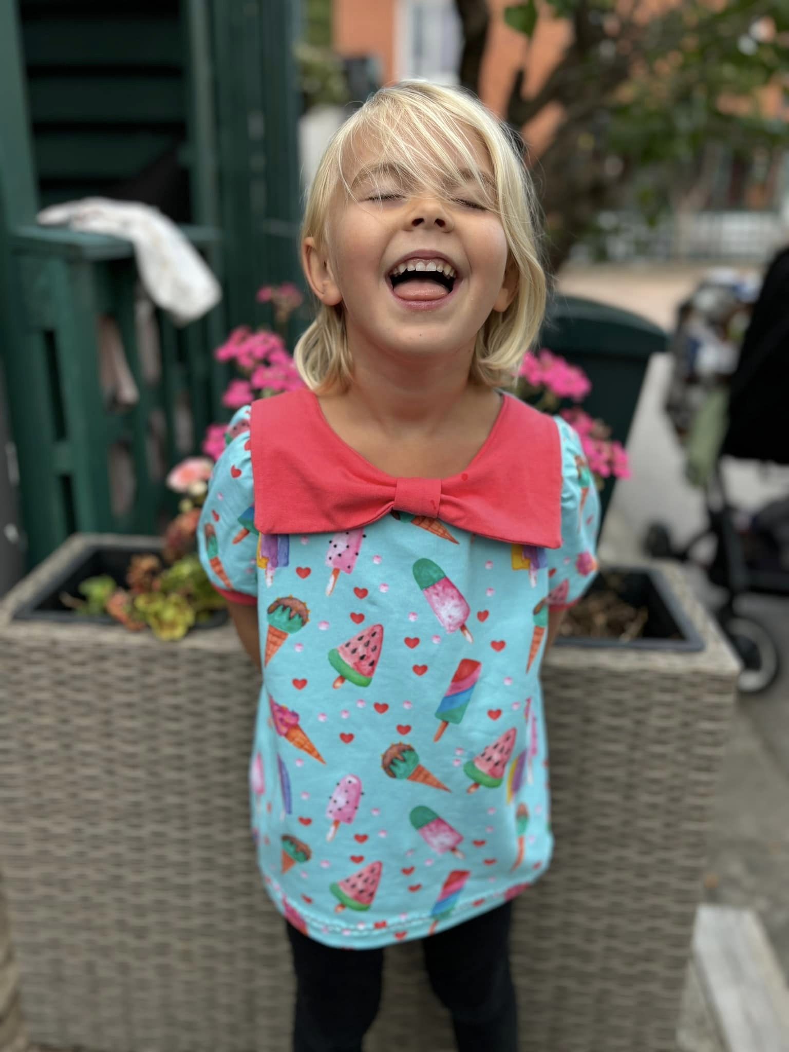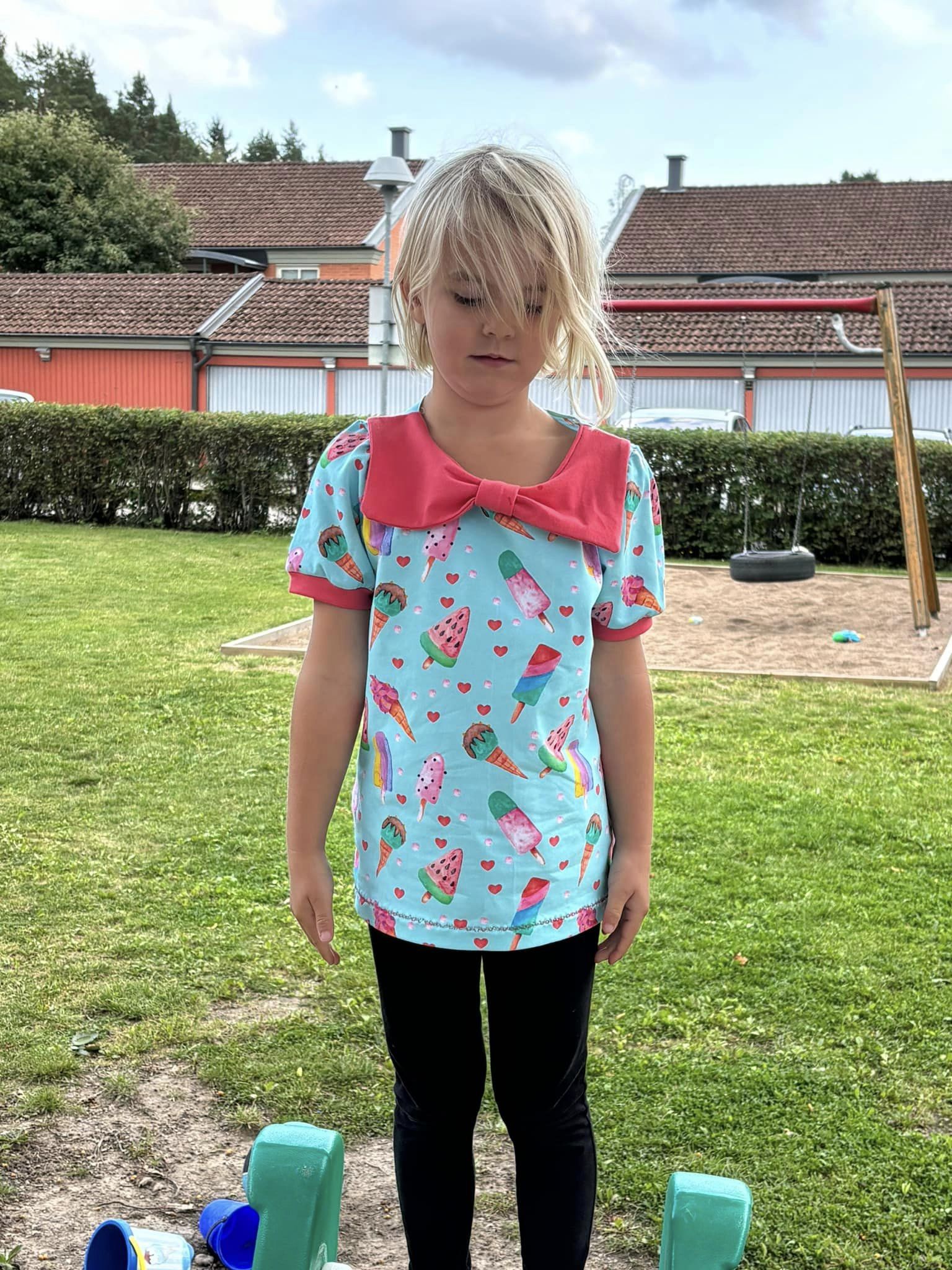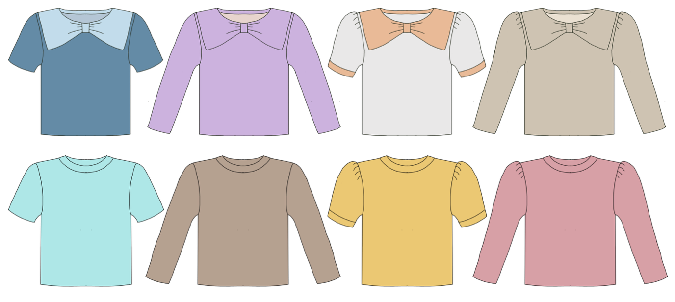 Little Sailor är en supersöt topp som kan sys både med en piffig krage/ok som liknar en rosett eller med halsmudd, vilket gör modellen till ett ypperligt allroundmönster. Båda varianterna kan sys med både lång och kort vanlig ärm och puffärm och har en rak passform.