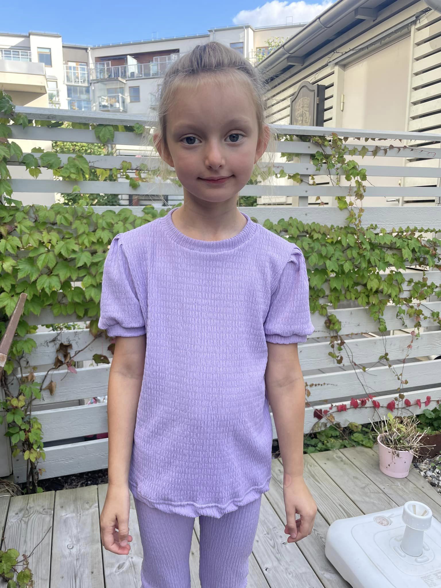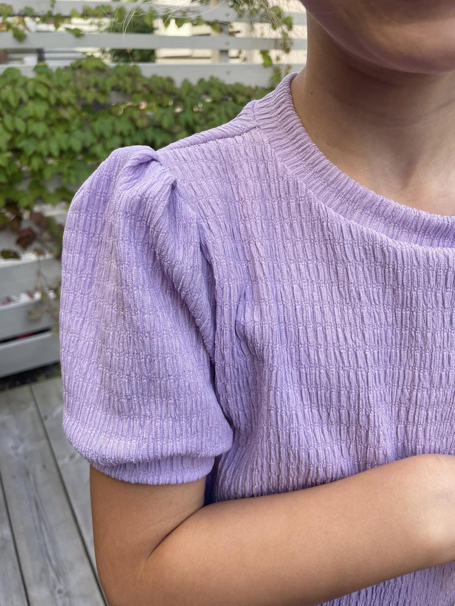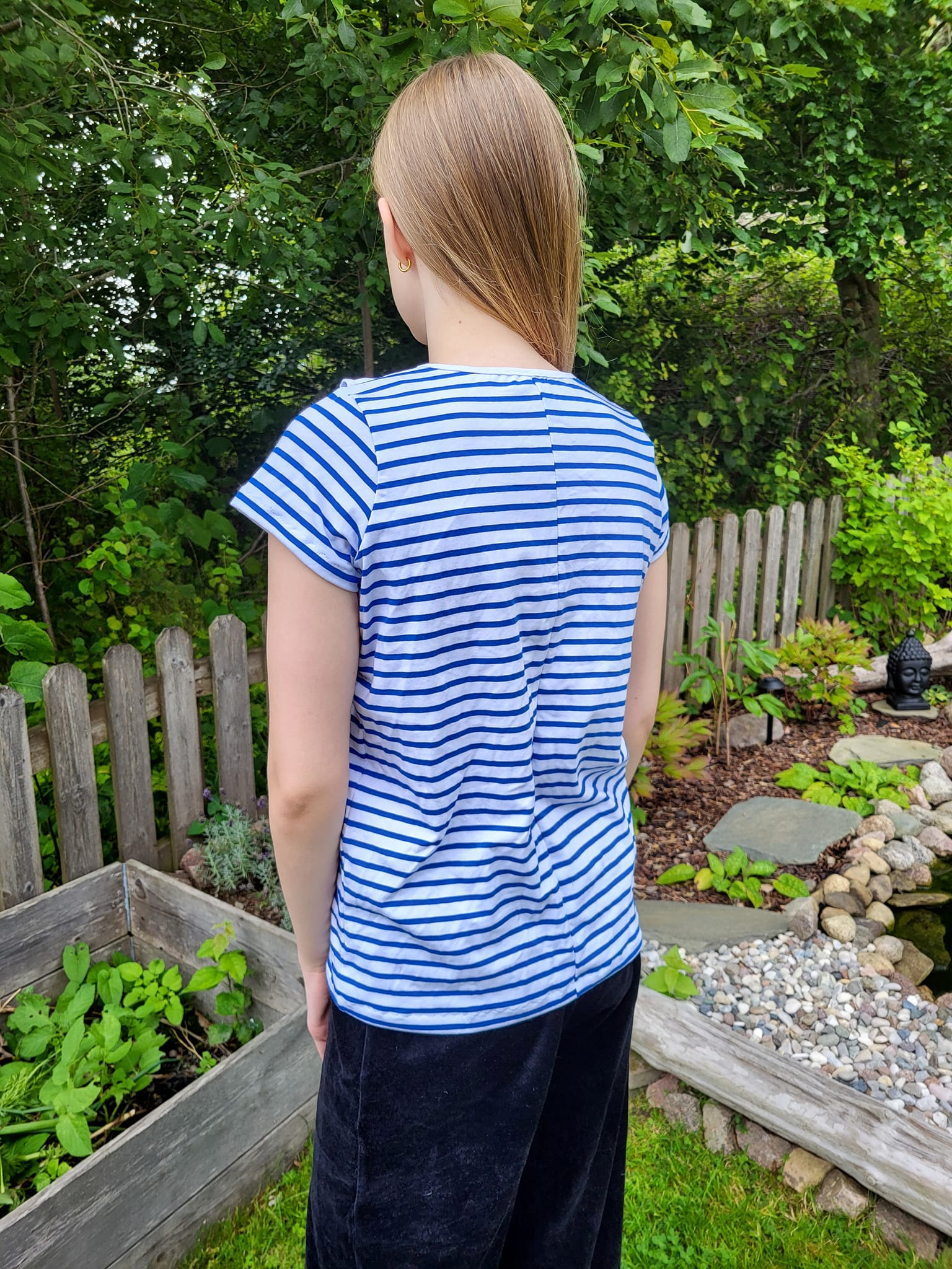 Material och tillklippning: Denna topp/tshirt sys i trikå/jersey. Syr man med halsmudd så tillkommer en liten bit muddväv.