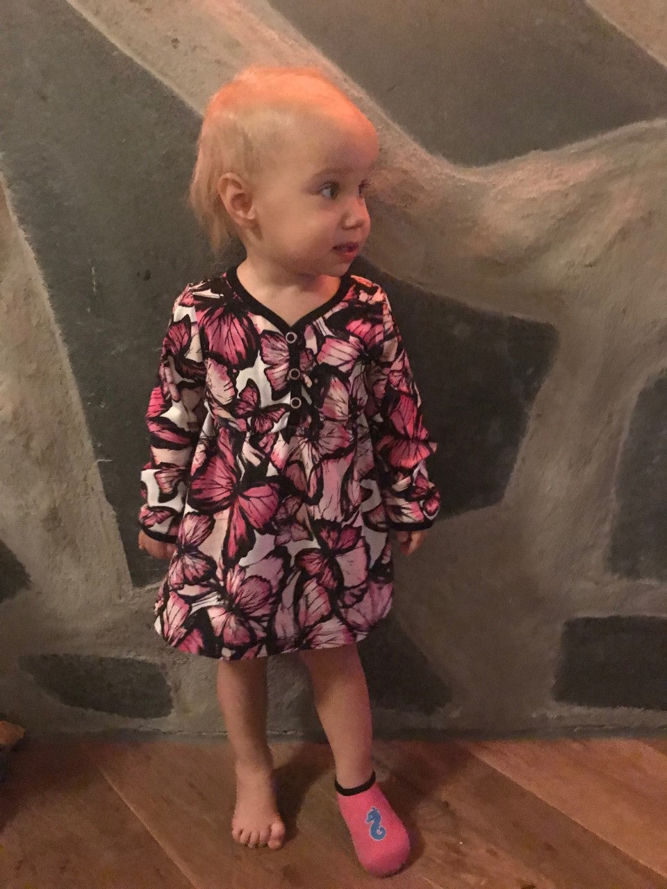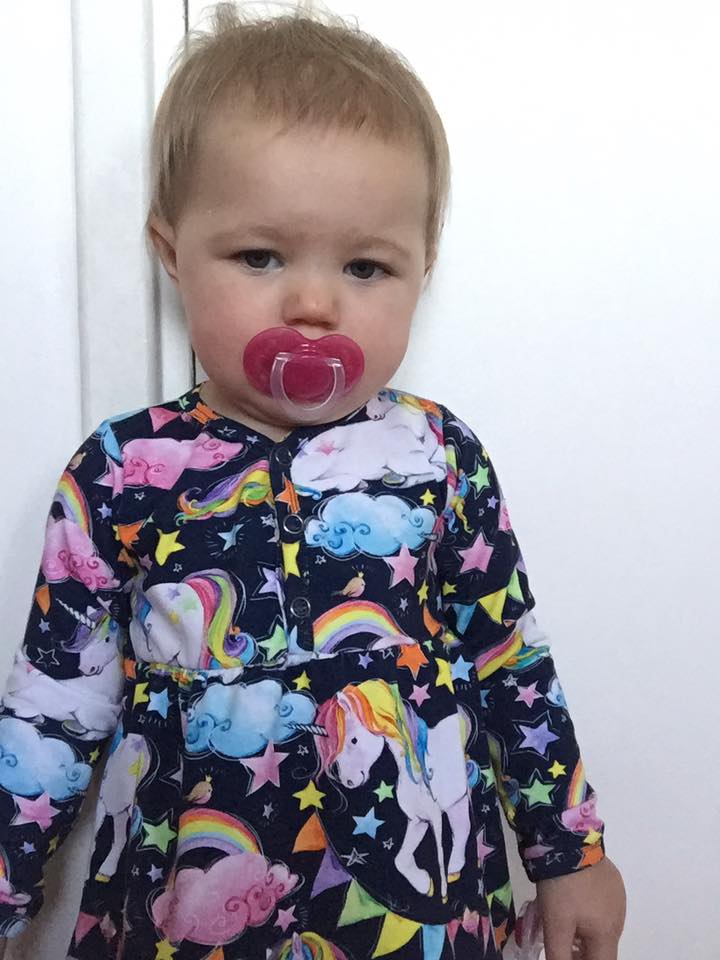 Material: Modellen är tänkt att sys i jersey, men har även sytts i tunnare jogging med framgång, då kan man dock eventuellt behöva gå upp en storlek beroende på hur mycket det stretch det är i den. Utöver tyg tillkommer eventuellt mudd/interlock till kantning, tryckknappar till farfarsknäppningen fram, och smalt resåband (ca 5 mm) till skärningen mellan liv och kjol.