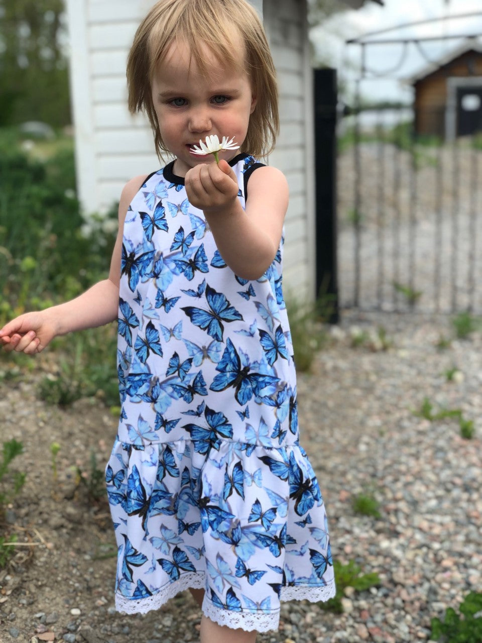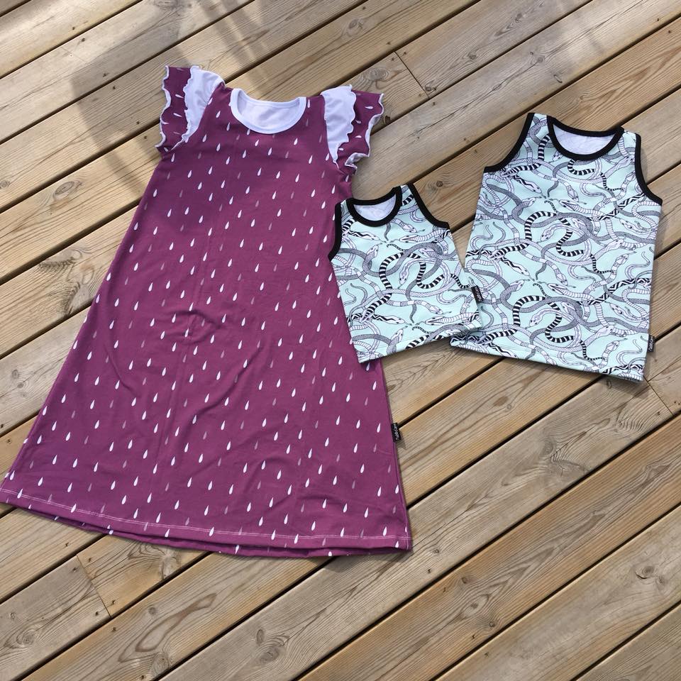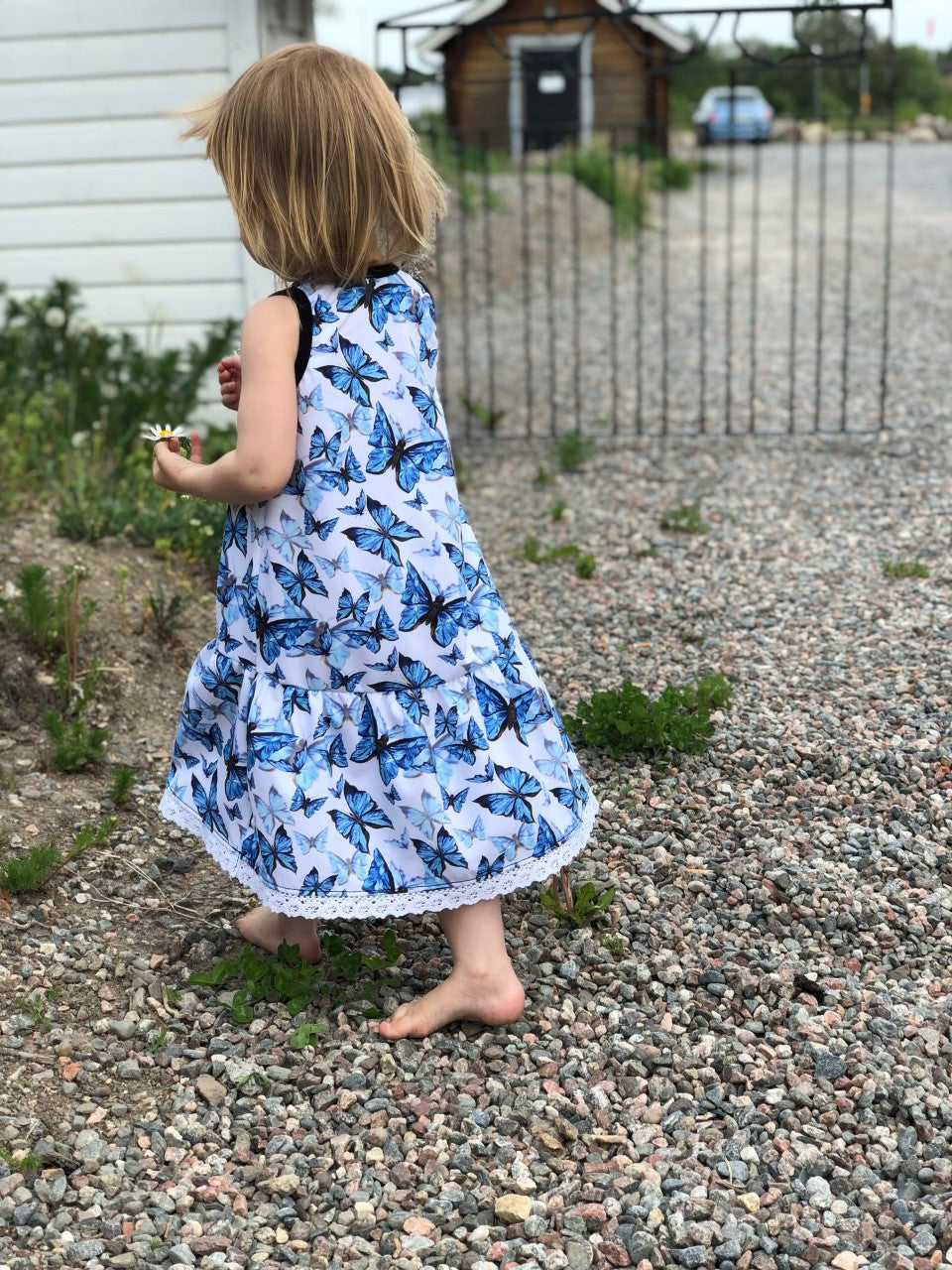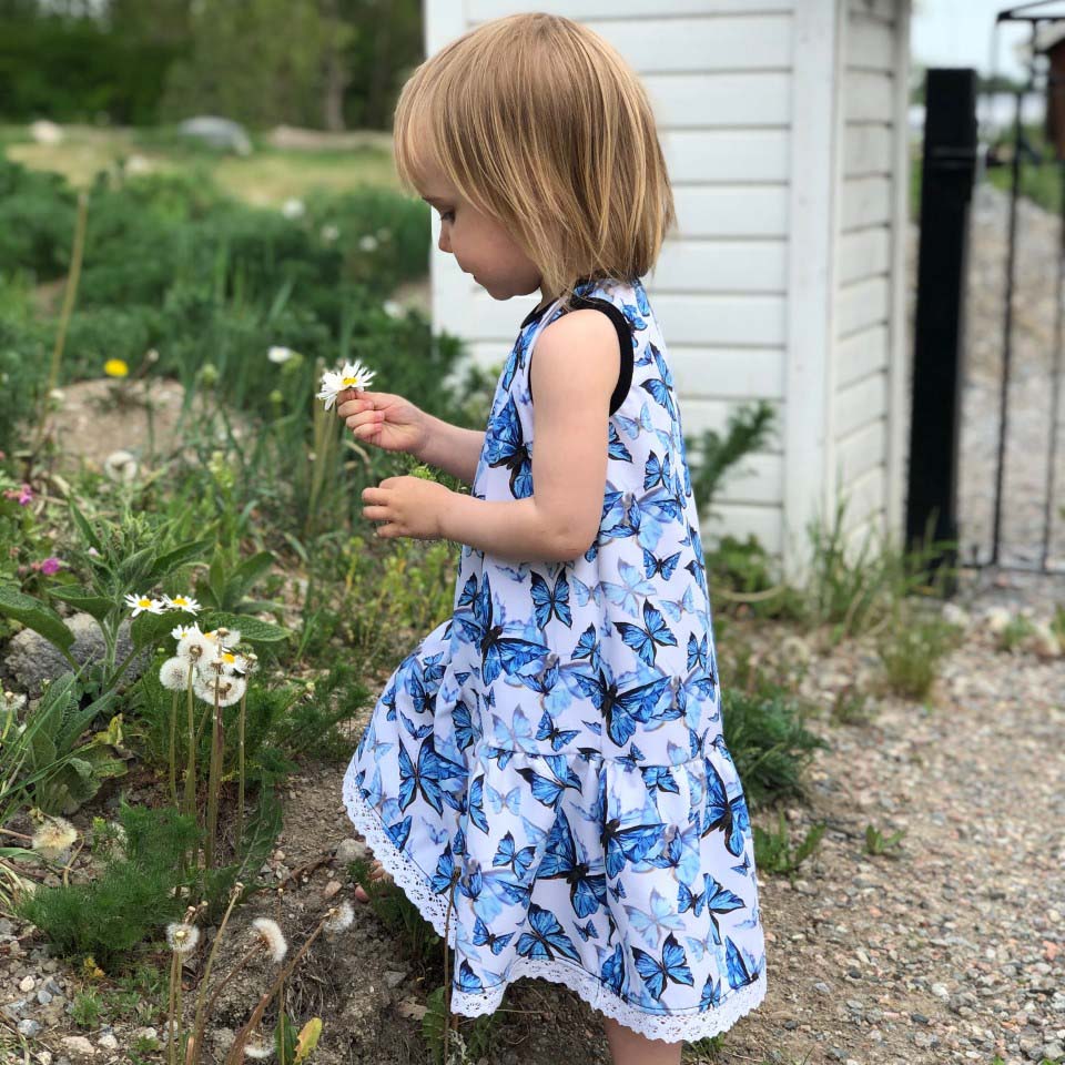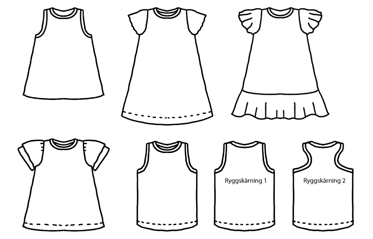 Material: Modellen är tänkt att sys i trikå med kantband av mudd eller interlock. Volangen och fjärilsärmen fungerar även i vävda tunnare tyger såsom viscose eller muslin.