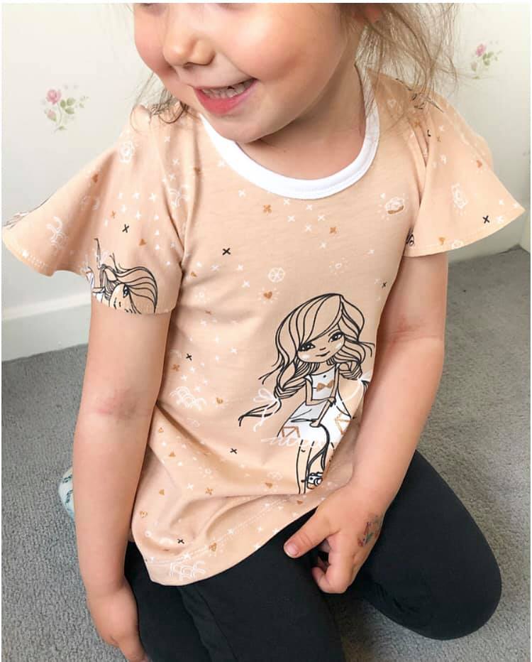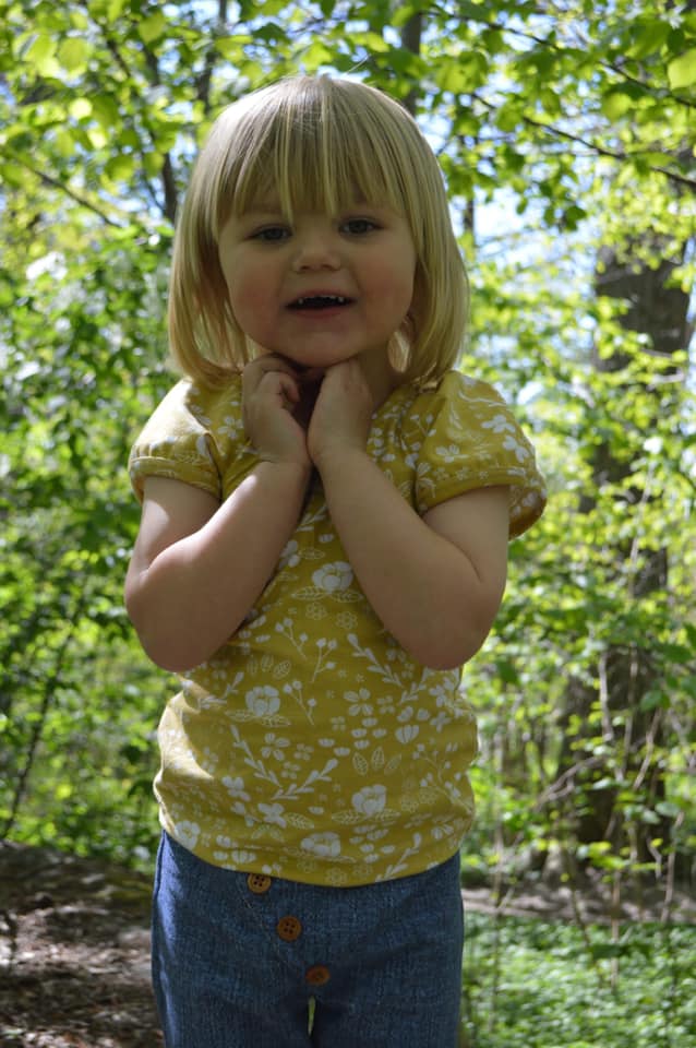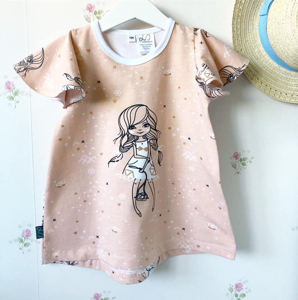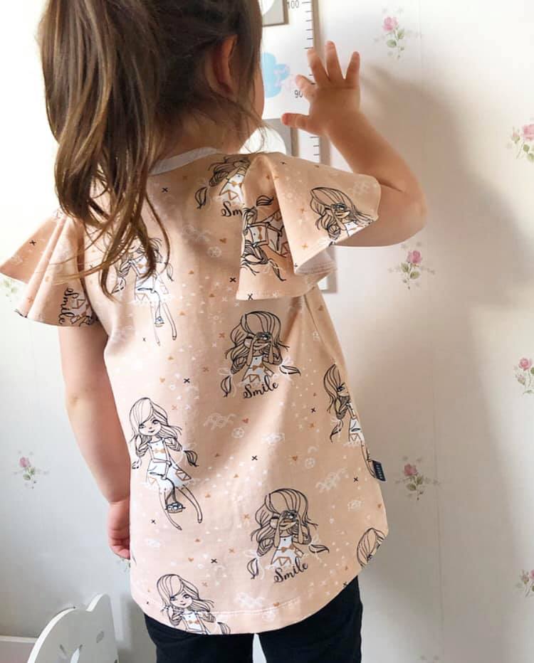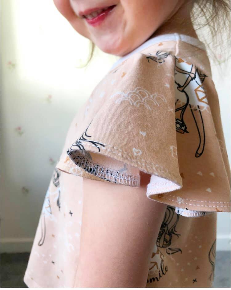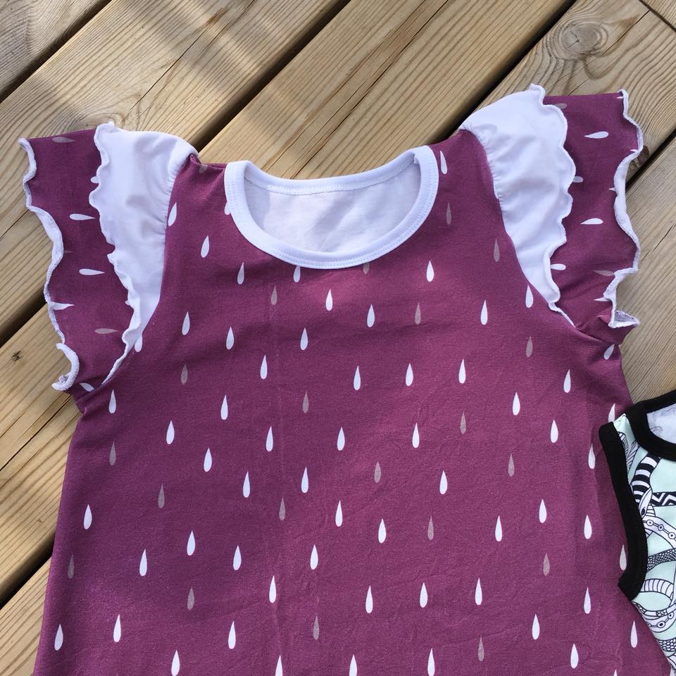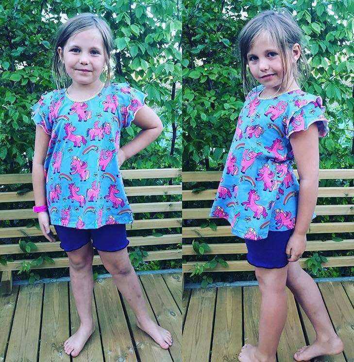 Material: Modellen är tänkt att sys i trikå med kantband av mudd eller interlock. Volangen och fjärilsärmen fungerar även i vävda tunnare tyger såsom viscose eller muslin.