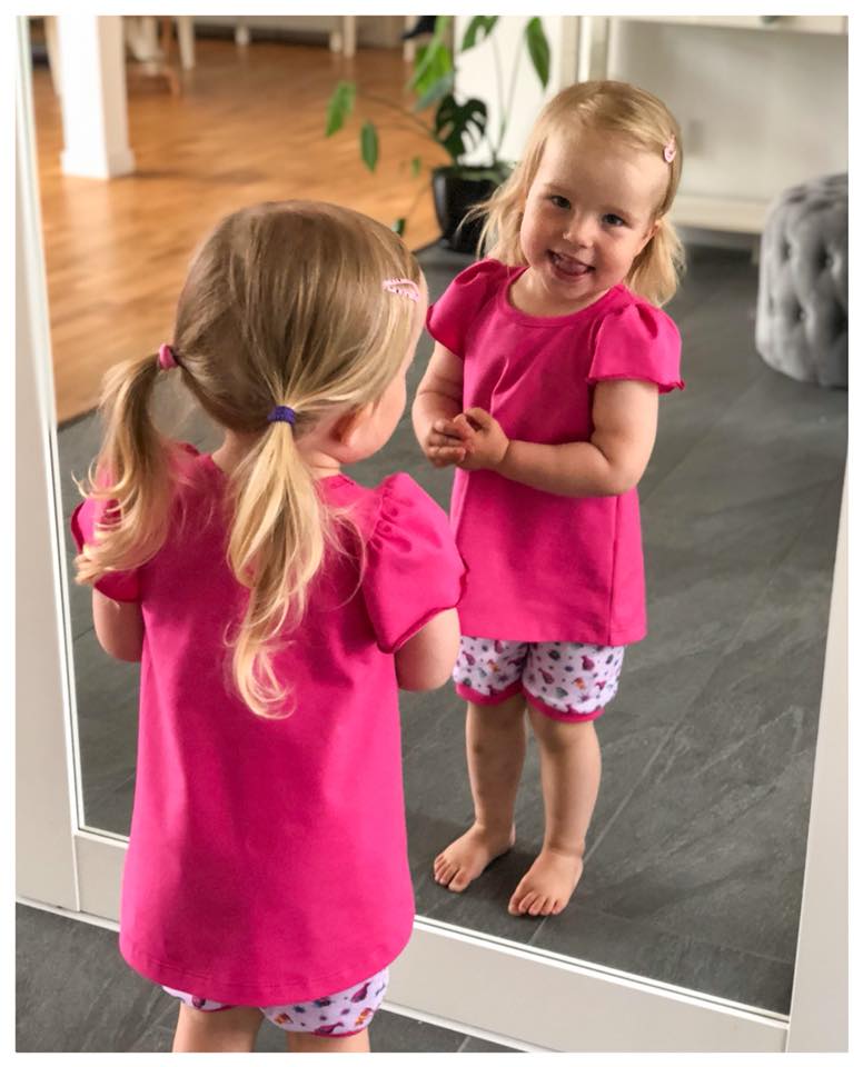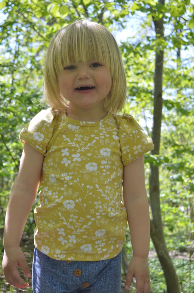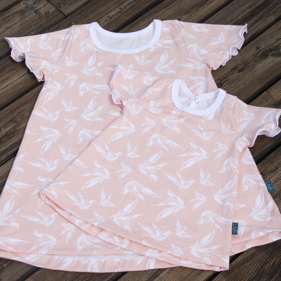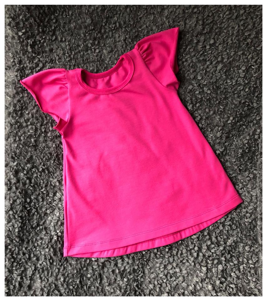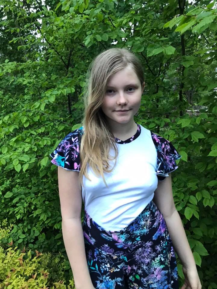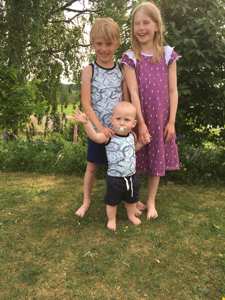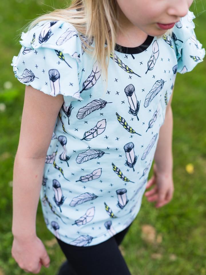 Material: Modellen är tänkt att sys i trikå med kantband av mudd eller interlock. Volangen och fjärilsärmen fungerar även i vävda tunnare tyger såsom viscose eller muslin.