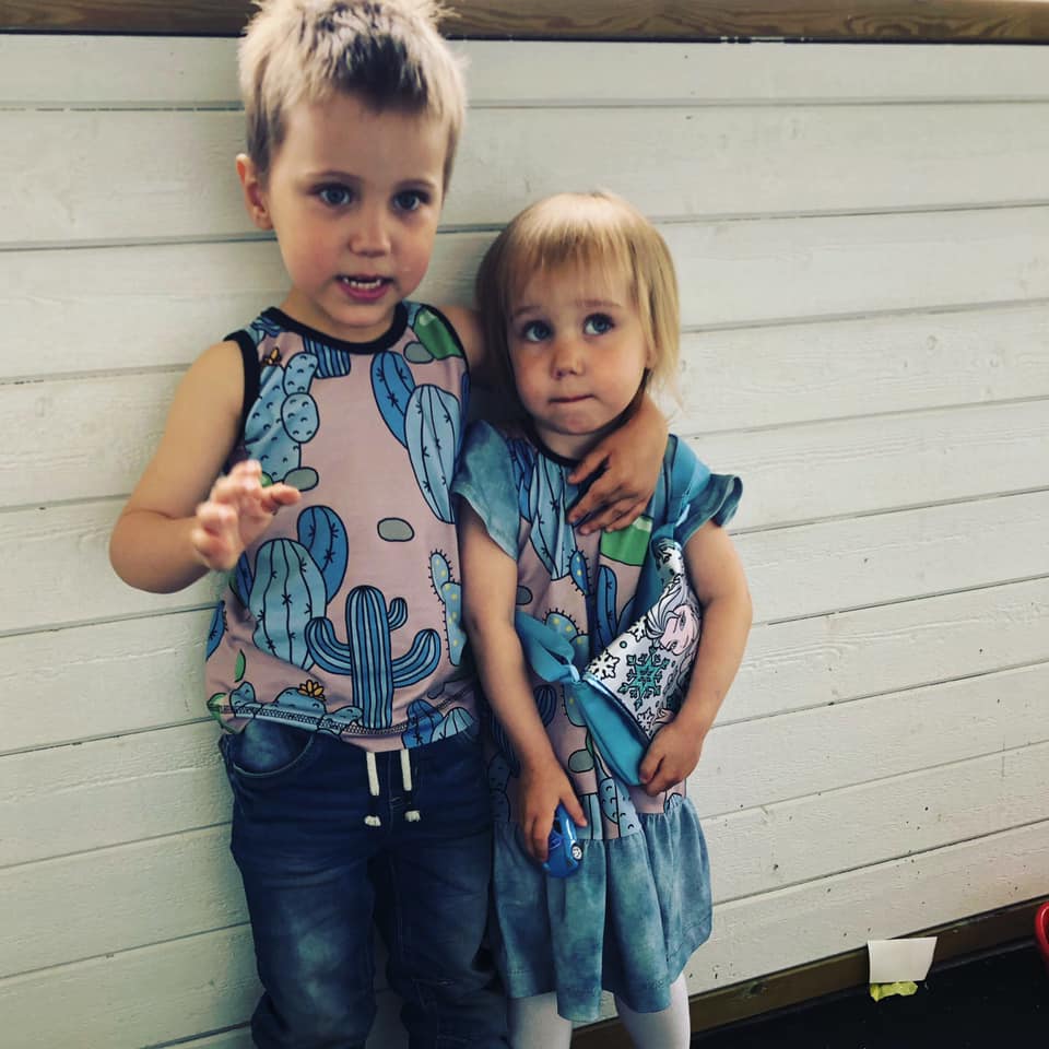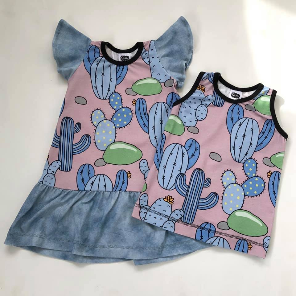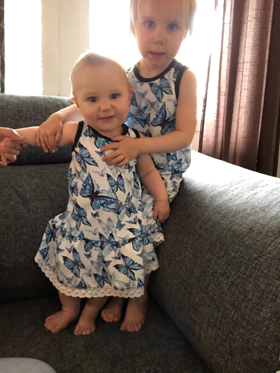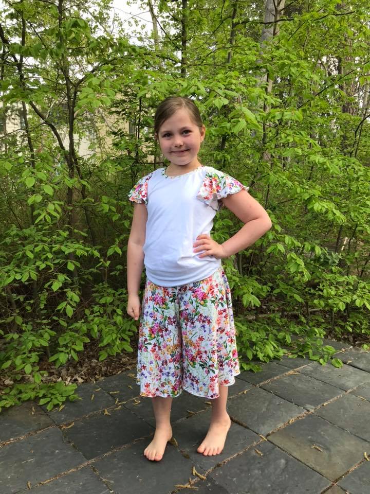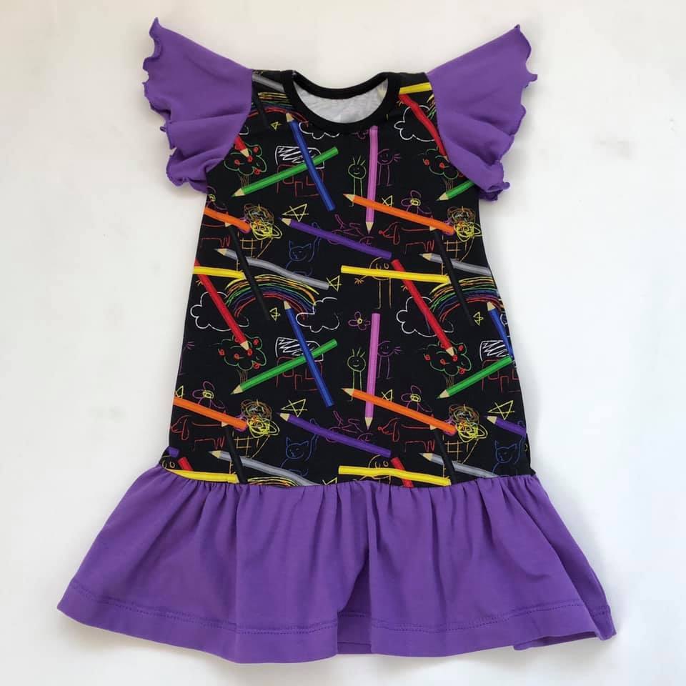 Material: Modellen är tänkt att sys i trikå med kantband av mudd eller interlock. Volangen och fjärilsärmen fungerar även i vävda tunnare tyger såsom viscose eller muslin.