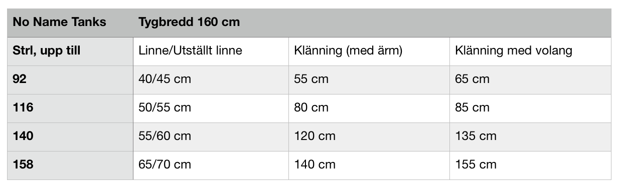 No Name Tanks är i grunden ett enkelt linnemönster med två olika ryggskärningar men som även kommer med mängder av variationer såsom tre olika ärmar; lös puffärm, fjärilsärm och dubbel volangärm, två olika vidder samt två olika klänningsvarianter; A-linjeklänning och klänning med brett volangavslut.