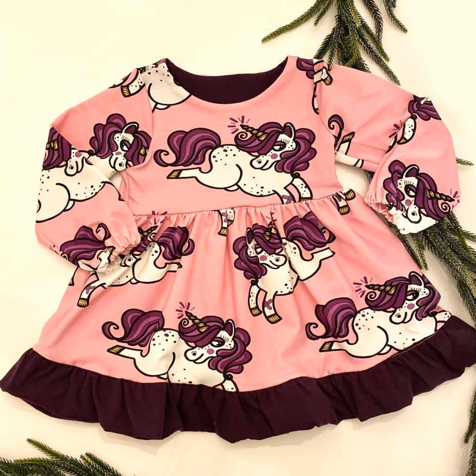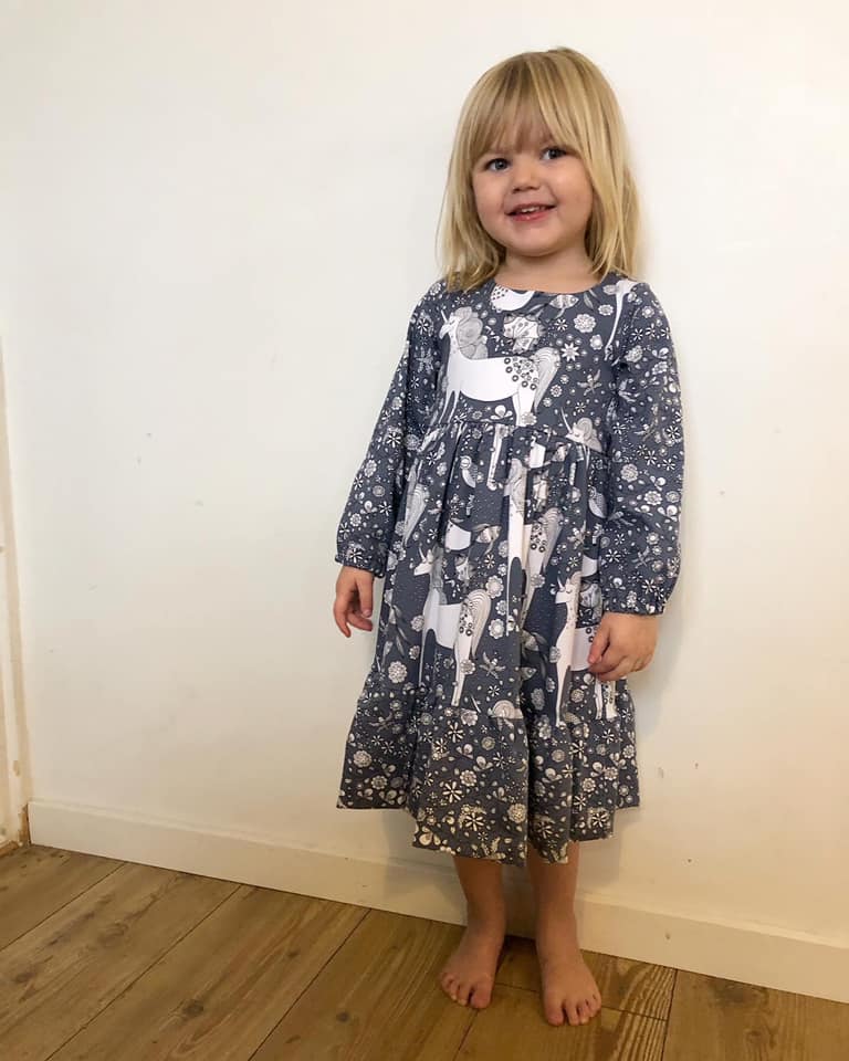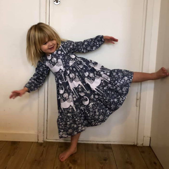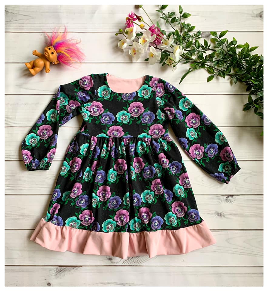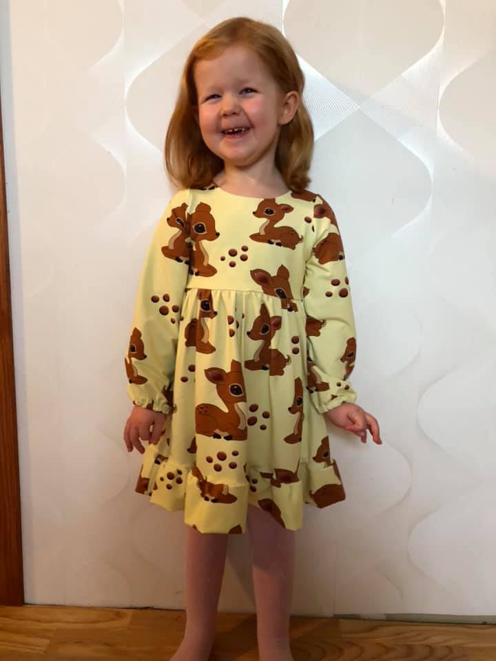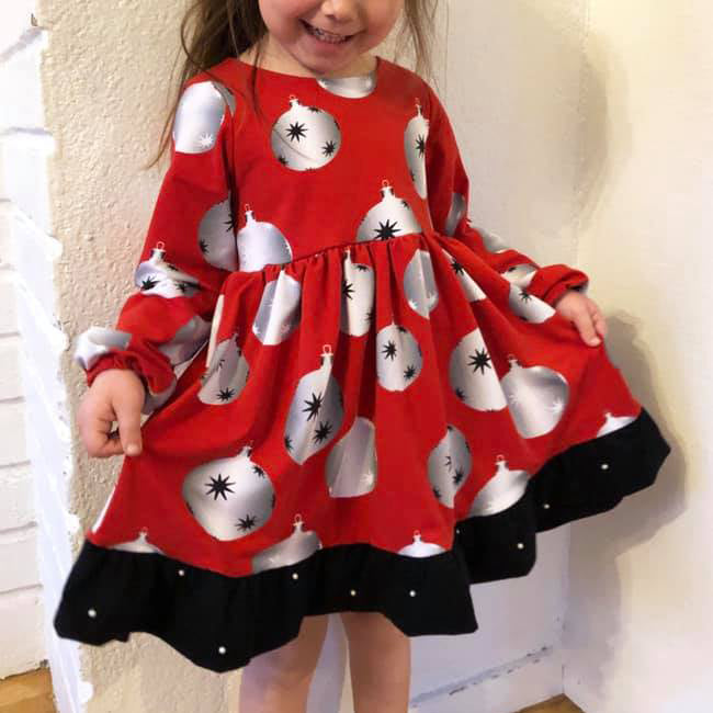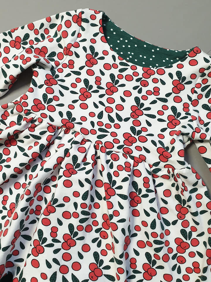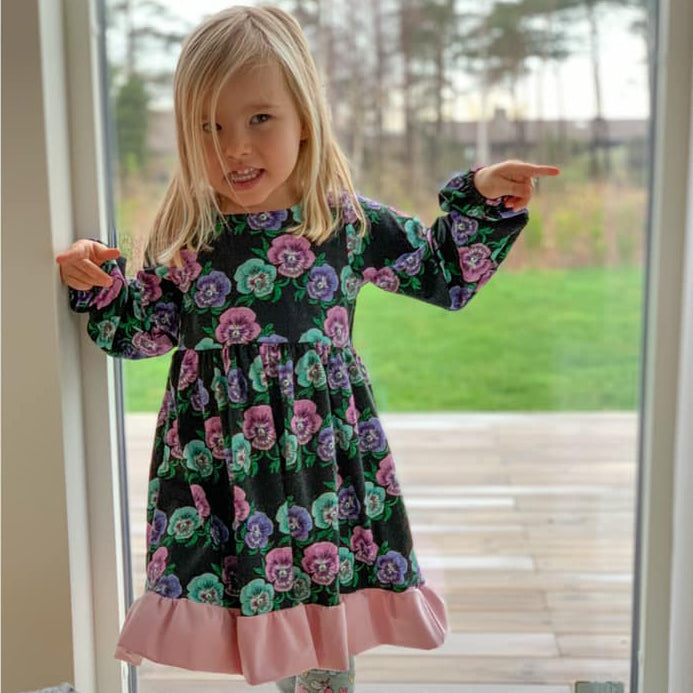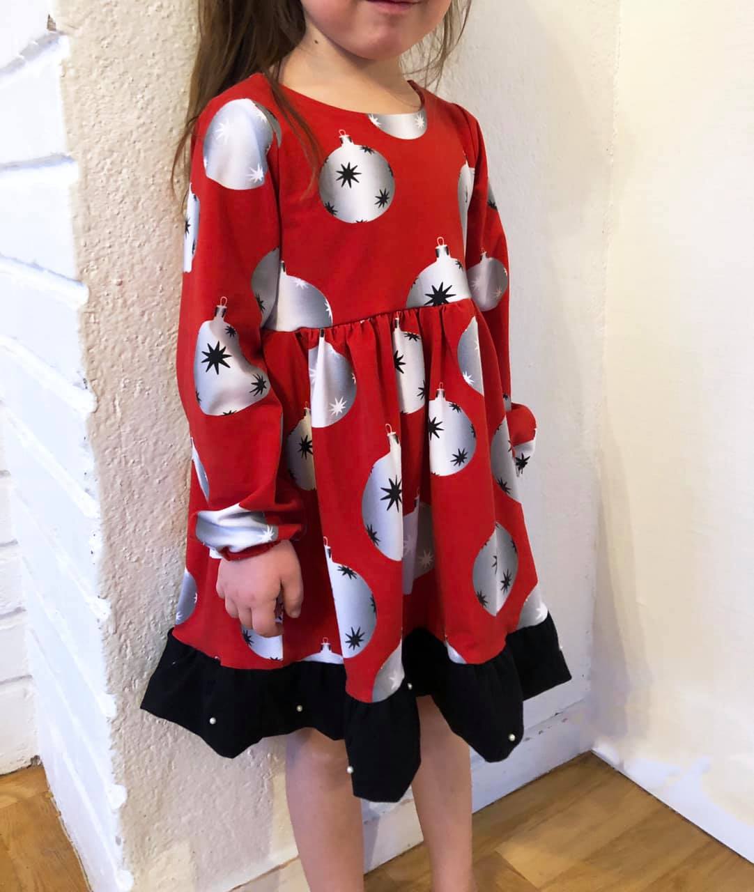 Oh Jolly är en söt klänning med lös passform som fungerar att sys både i trikå och vävda tyger med fint fall. Kan sys med knapplist i livets rygg eller med helt livbakstycke. Genom att volangkanten nedtill sys antingen dubbelvikt eller enkel med fåll kan man variera både utseende och längd buslätt.