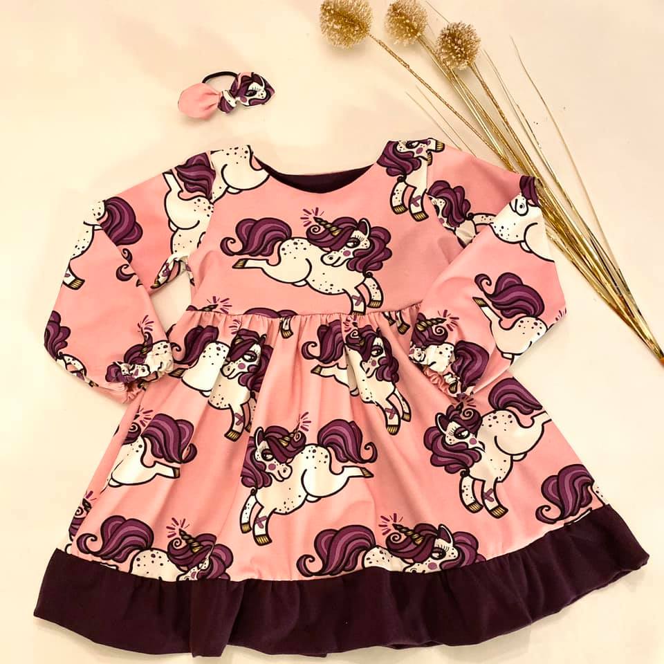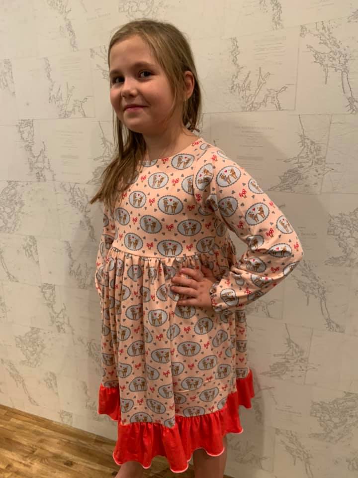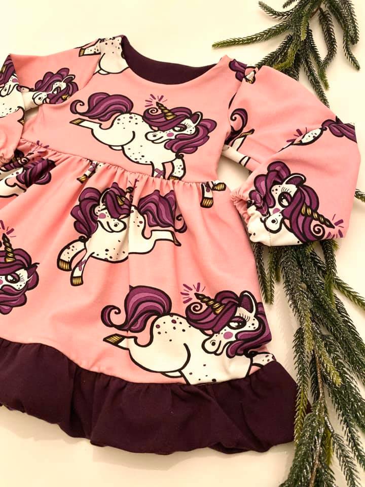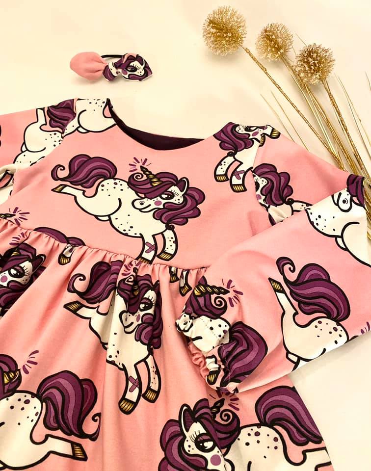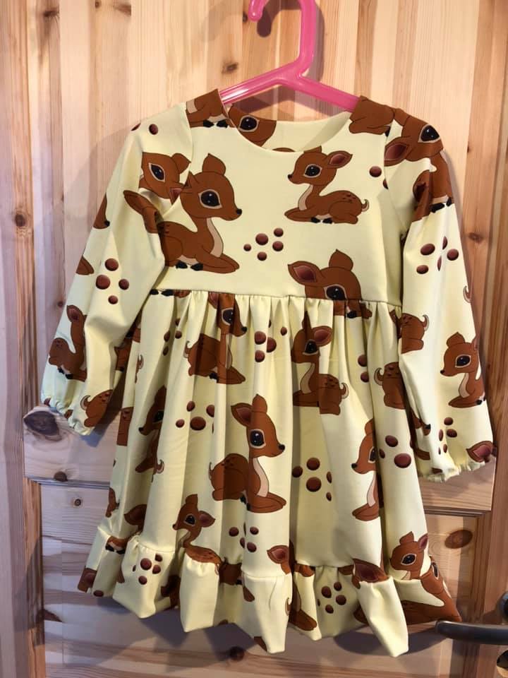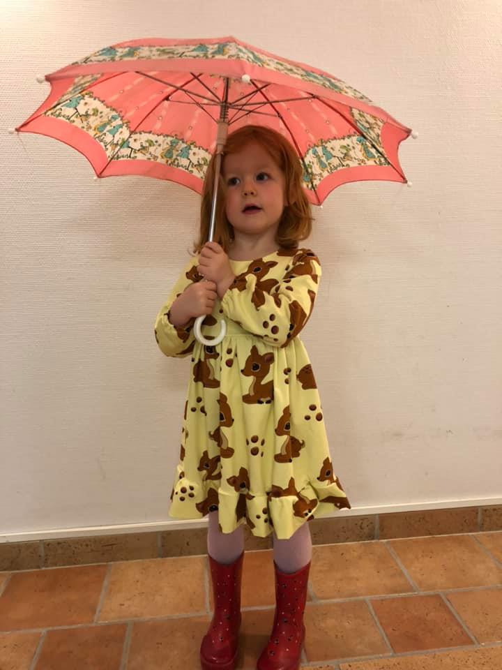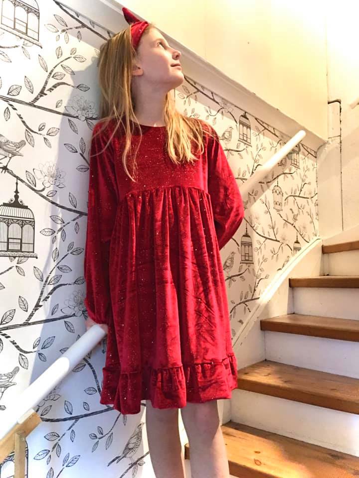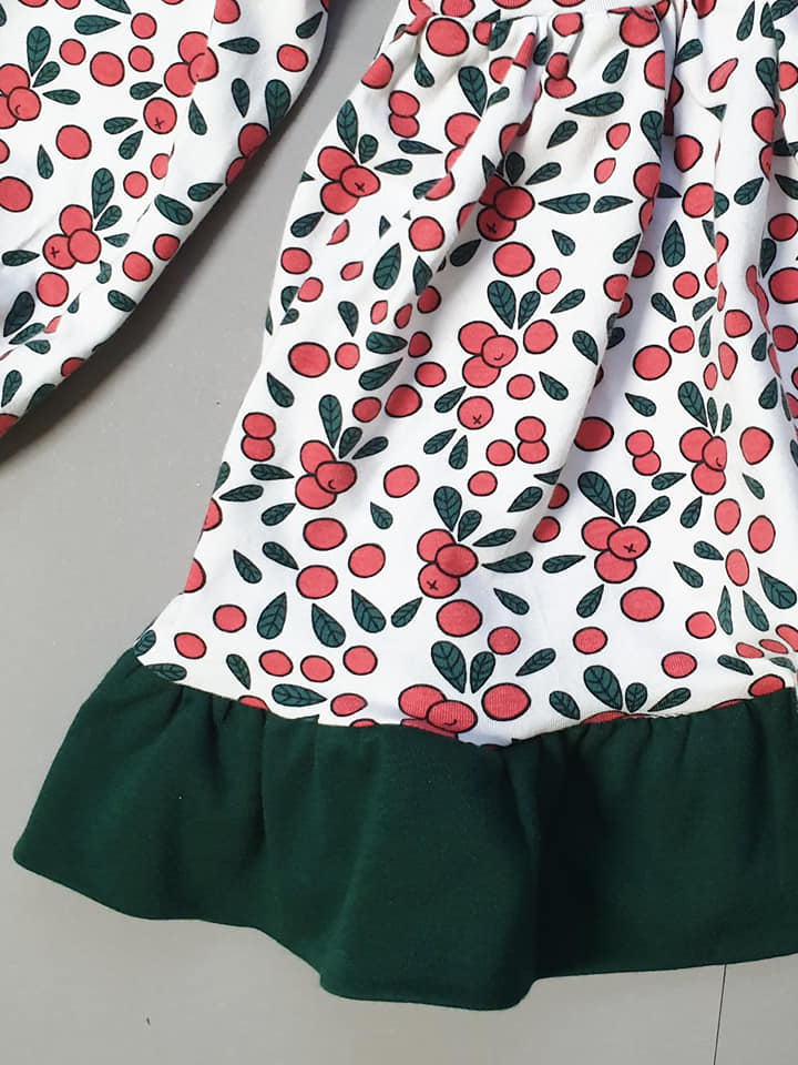 Oh Jolly är en söt klänning med lös passform som fungerar att sys både i trikå och vävda tyger med fint fall. Kan sys med knapplist i livets rygg eller med helt livbakstycke. Genom att volangkanten nedtill sys antingen dubbelvikt eller enkel med fåll kan man variera både utseende och längd buslätt.