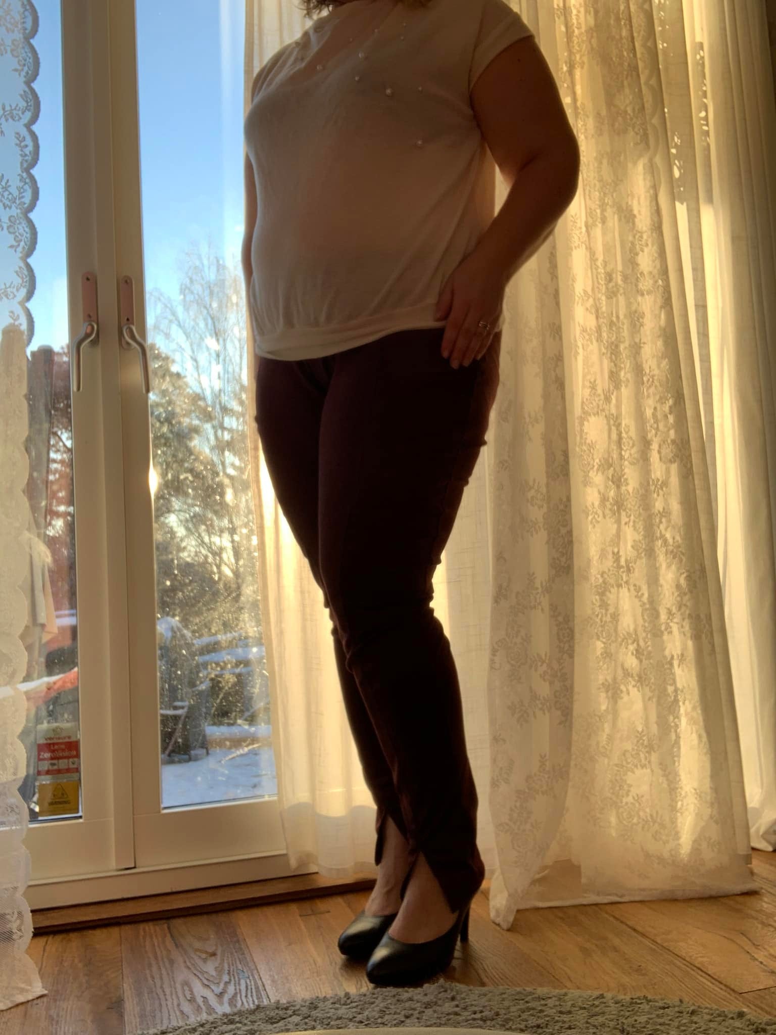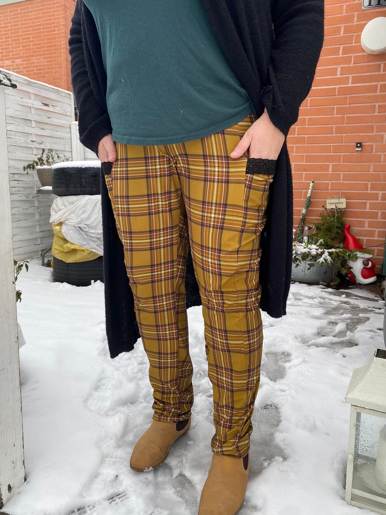 Material och tillklippning: Dessa byxor är tänkta att sys i trikå/jersey eller stretchig jogging/french terry, alternativt andra stretchiga modetyger med minst 40% elasticitet (vid mindre stretch kan man behöva gå upp i storlek på bredden). Var noga med att tyget även stretchar något på höjden. 3-4 cm bred resår tillkommer till kanalen i linningen.