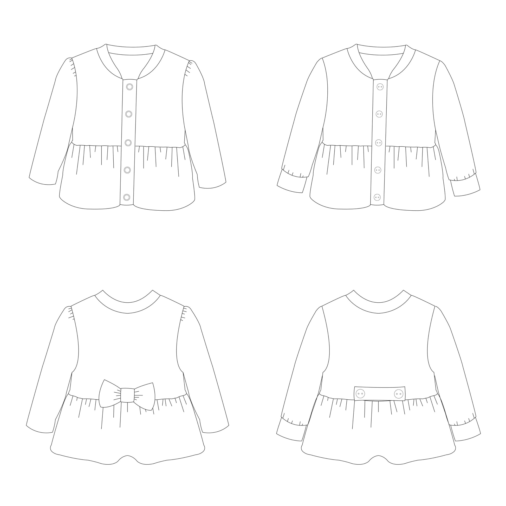 Denna kofta/jacka går att variera med vanliga ärmar med mudd eller puffärm med fållat ärmslut, tryckknappar eller vanliga knappar med knapphål samt rosett eller slejf på baksidan av plagget. Den kommer i en slim modell för att sy vanliga nättare koftor, eller om man i de mindre storlekarna vill sy i trikå för ett mjukare resultat, och i den vanliga modellen som passar bra när man vill sy mer av ett ytterplagg i tjockare tyger, eller om man helt enkelt vill att koftan/kappan ska vara lite mer rymlig.
