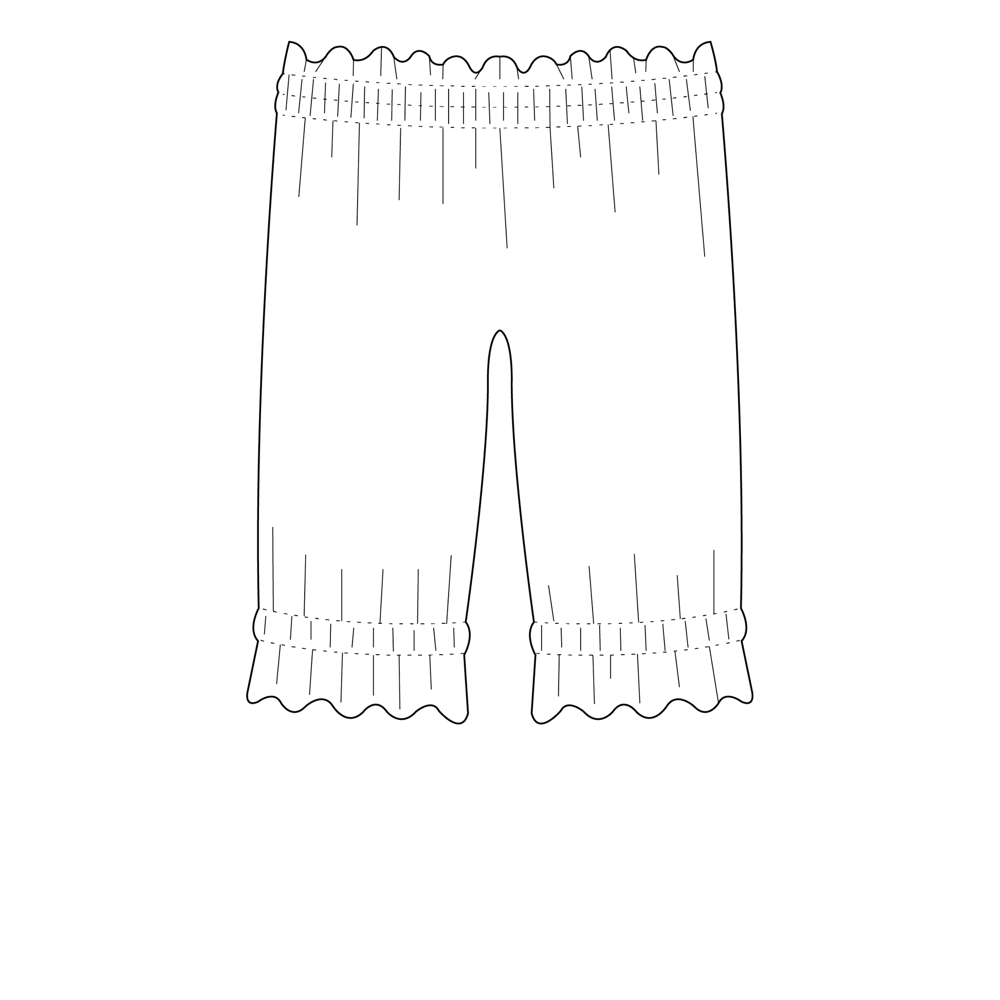 Ruffle Pants är en luftig byxa som kan sys hellång eller som knälånga shorts, med bred resår i midja och benslut eller med volangkanter med smala resårkanaler. Modellen kommer även med hällor och knytskärp.