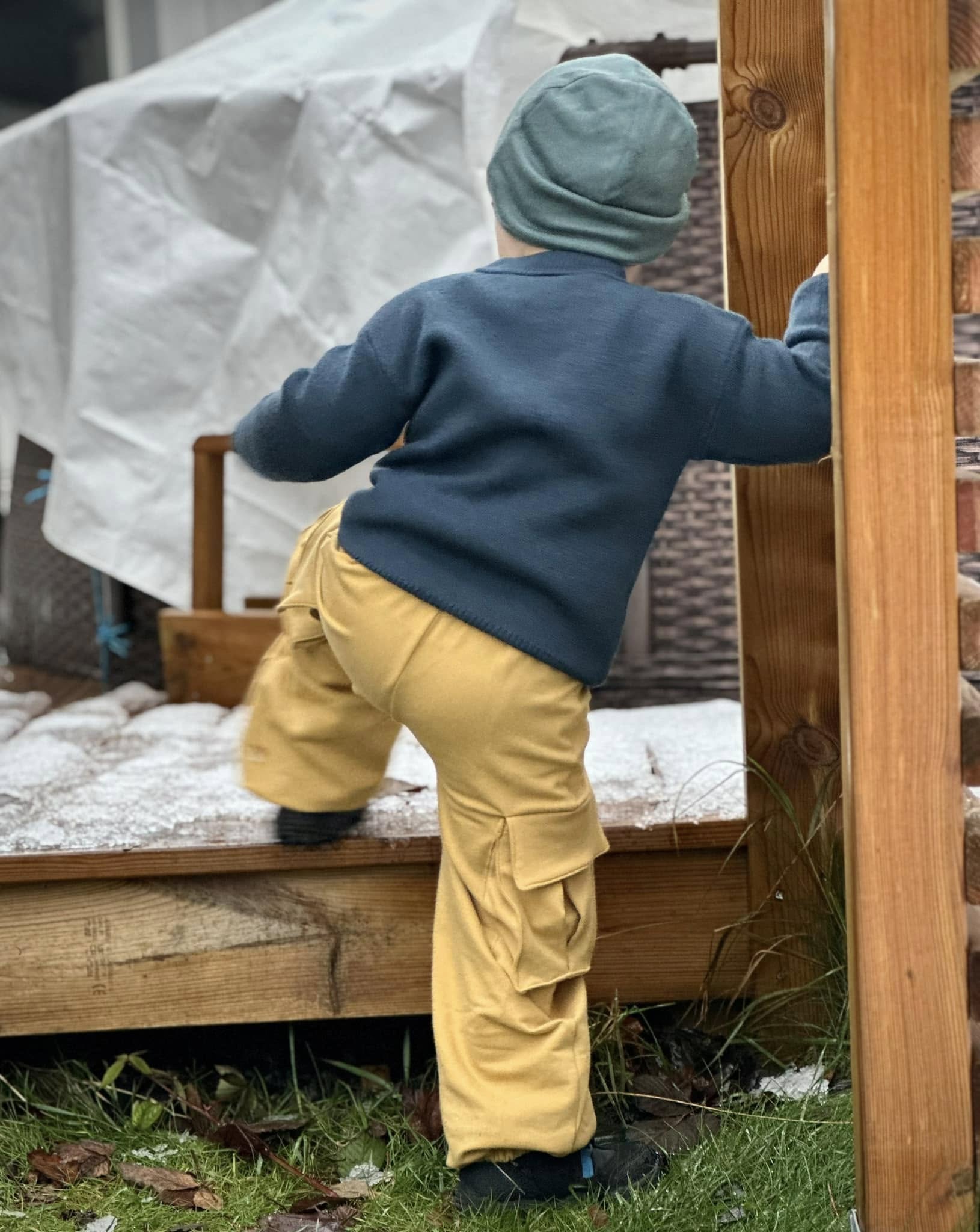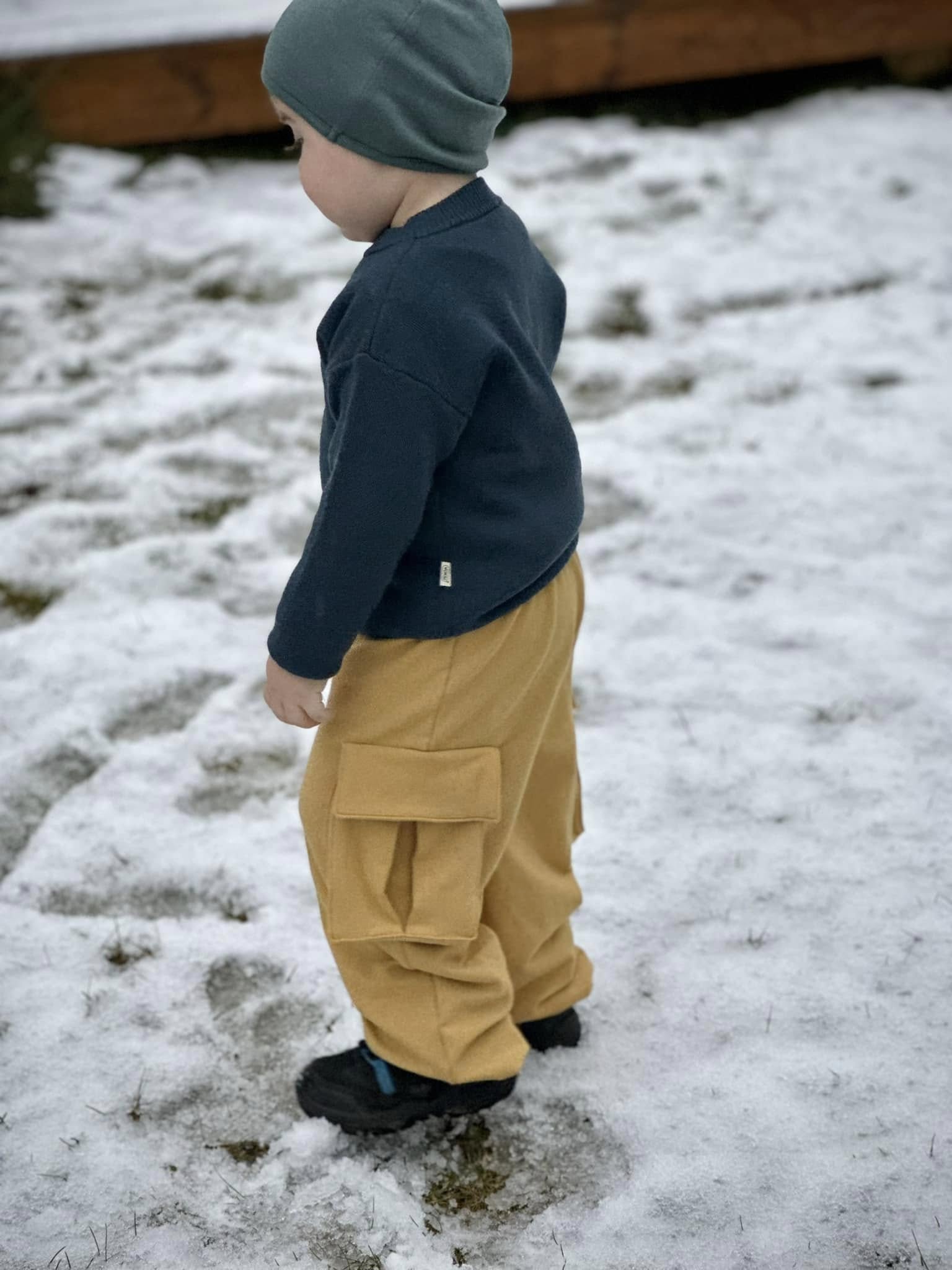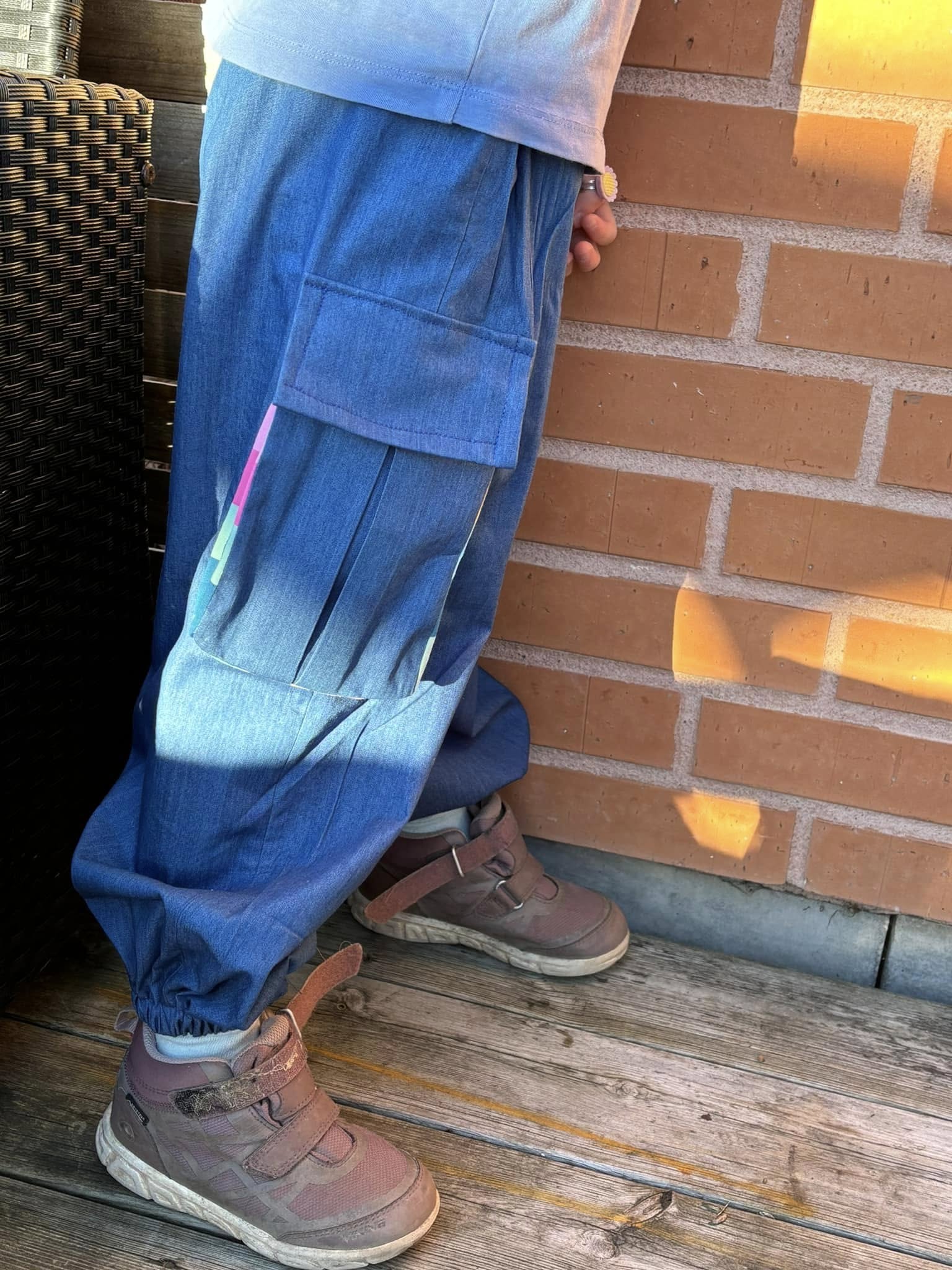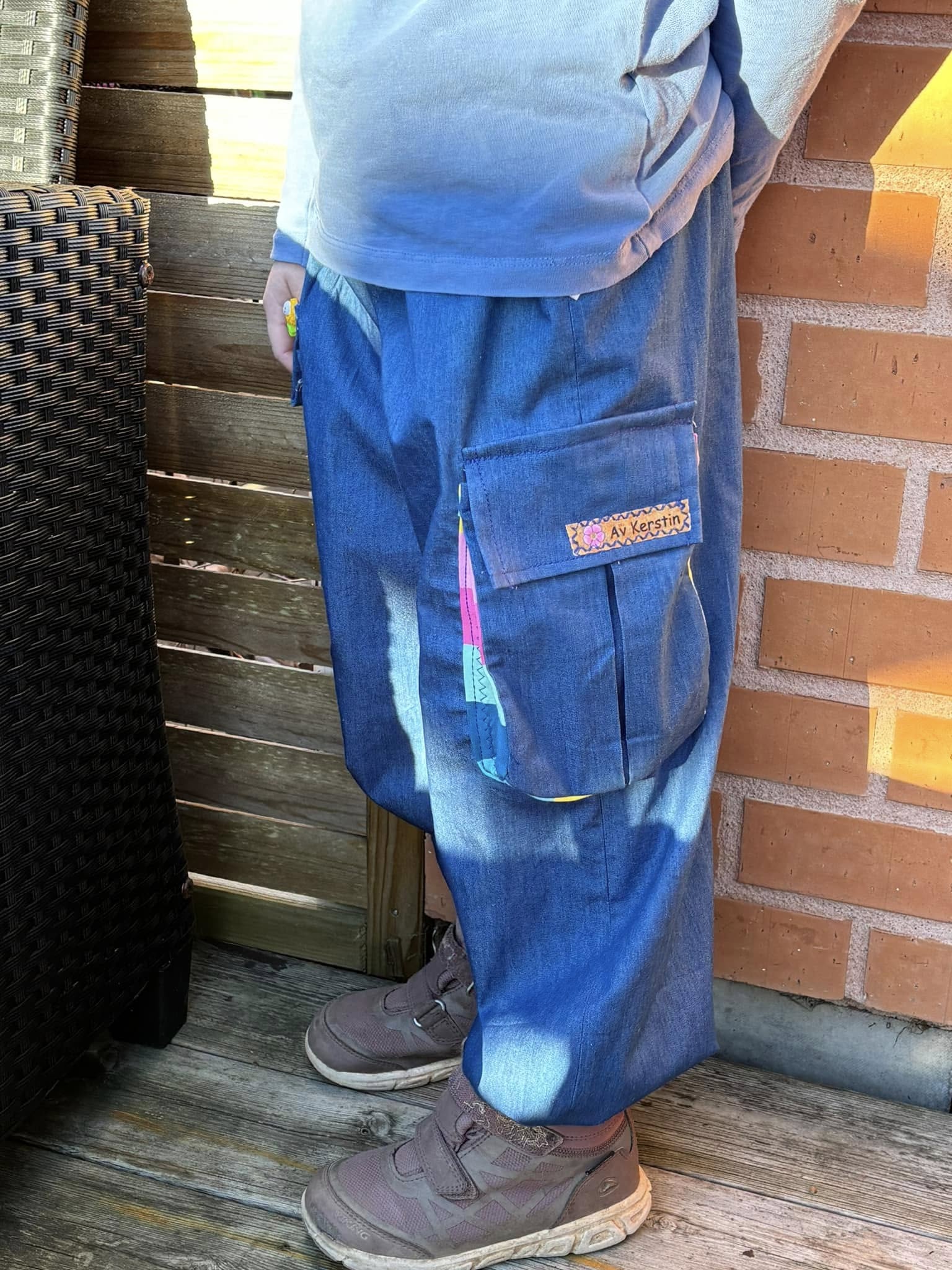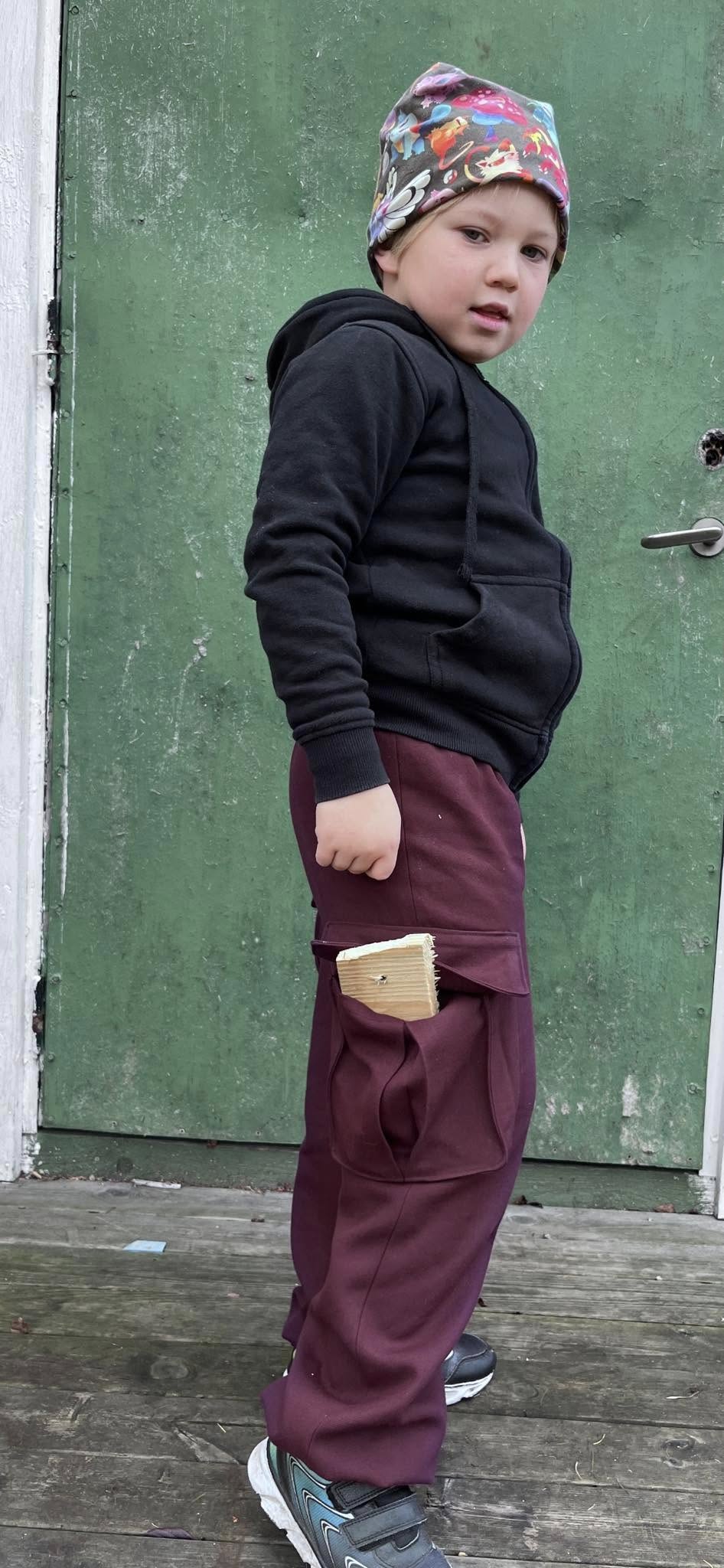 Material och tillklippning: Byxorna sys i vävda relativt följsamma tyger, exempelvis twill, bomullscanvas, linnetyg eller liknande, men kan också sys i college/french terry.
