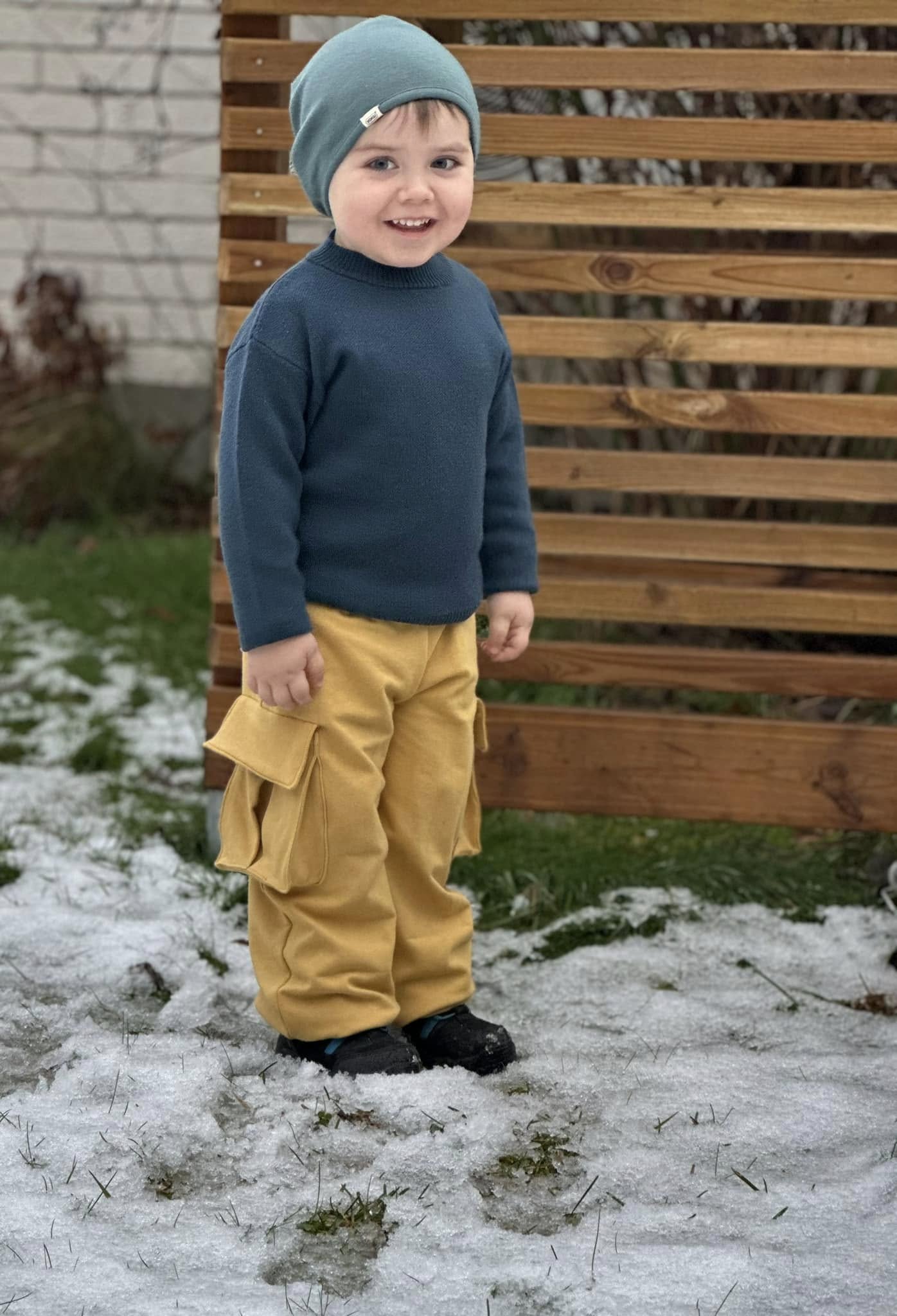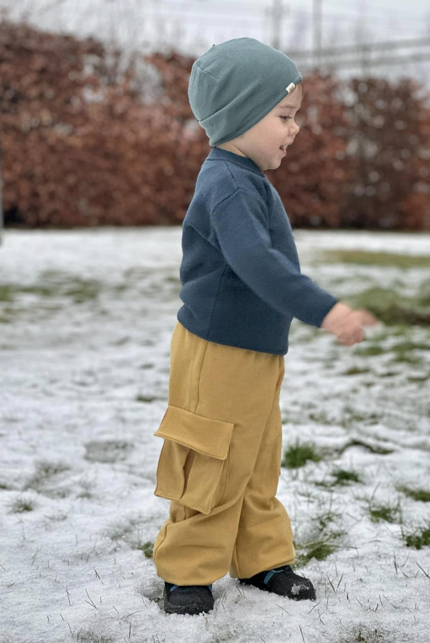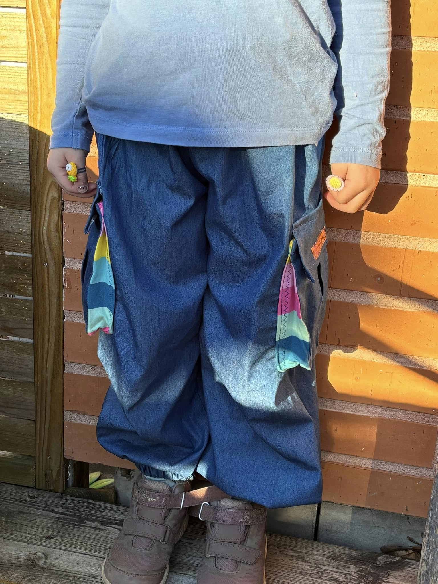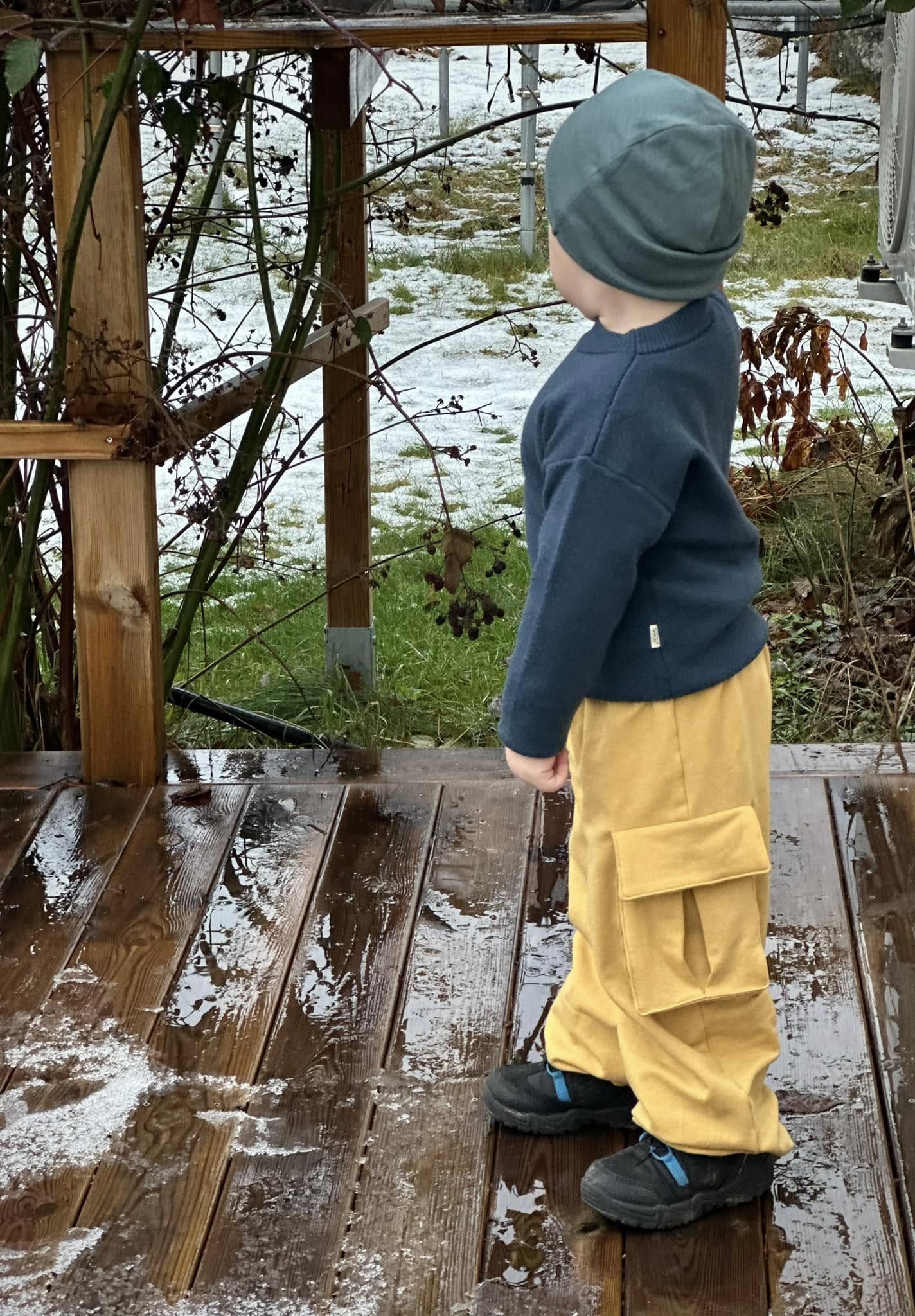 Material och tillklippning: Byxorna sys i vävda relativt följsamma tyger, exempelvis twill, bomullscanvas, linnetyg eller liknande, men kan också sys i college/french terry.